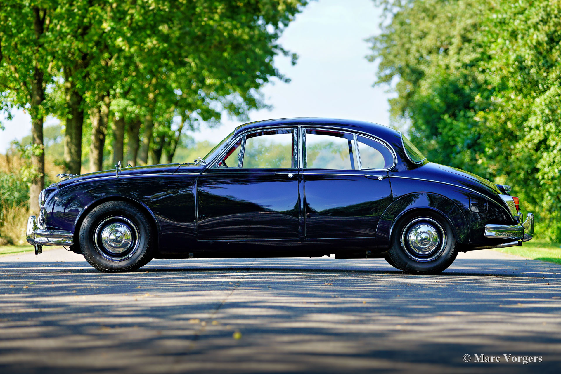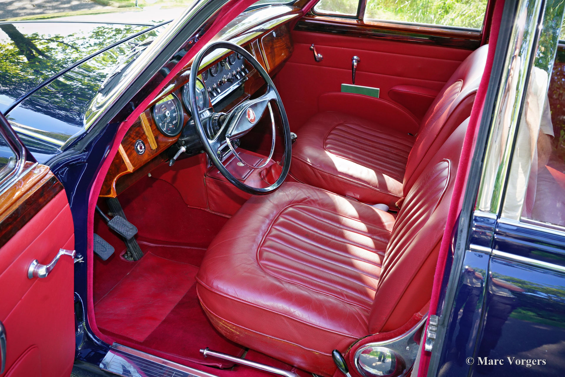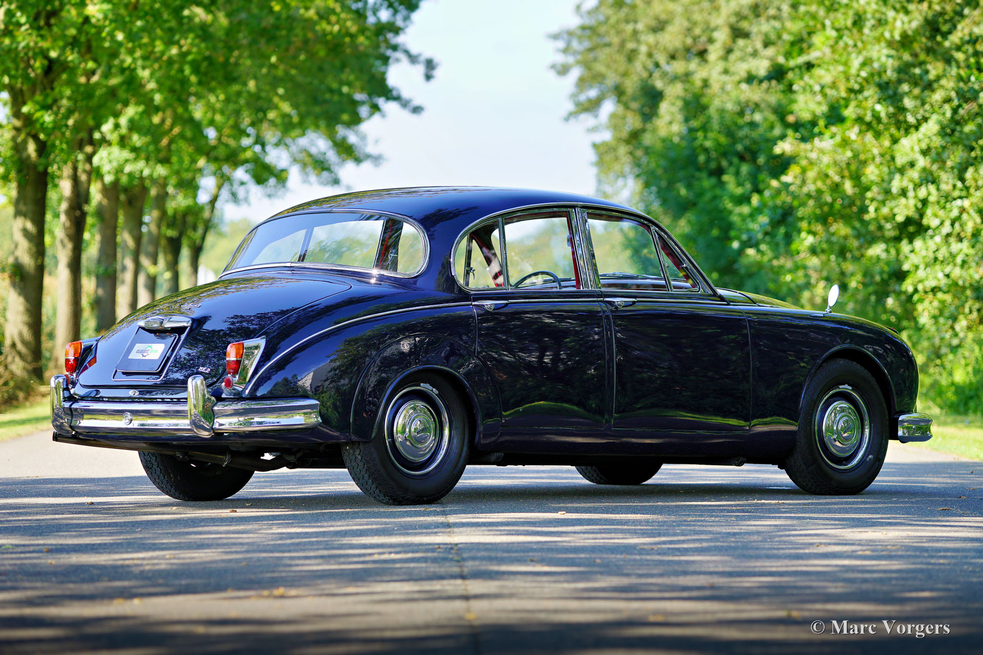 Jaguar Mk II 3.8 Liter, jaar 1962. Kleur donkerblauw gecombineerd met een roodlederen interieur en rood tapijt. Deze prachtige Jaguar Mk II is in het verleden uitgebreid gerestaureerd, de auto verkeert in een zeer goede staat en de auto rijdt uitstekend. De Jaguar Mk II was een groot succes en een van de meest gewilde Britse sedans van begin jaren 60. Dit topmodel is uitgerust met Jaguars grootste motor van die tijd; de 3.8 liter XK-zescilinder, en de handgeschakelde 4-versnellingsbak met overdrive! De 3781cc zescilinder produceerde 220 pk en een 3.8 met de handgeschakelde versnellingsbak was een echte 200 km/u machine, waarbij de meeste sportwagens in de jaren 60 verbleekten. Vanwege zijn potentieel was de auto erg populair bij de politie... en ook bij het dievengilde. Deze prachtige Jaguar Mk II toont alle originele details, waaronder de stalen wielen met chromen wieldoppen en de ‘spats’ over de achterwielen. Het luxe interieur ademt de sfeer van een high-end Britse gentlemen's club, met wollen tapijt, dure lederen bekleding en walnotenhout rondom. Het sportieve karakter van de Mk II komt tot uiting door het krachtige geluid van de 'twin-cam' zescilindermotor en het prachtige dashboard vol met meters en schakelaars. Deze Jaguar is voorzien van een roestvrijstalen uitlaat en de auto wordt compleet geleverd met de originele gereedschap set die is opgeborgen in het reservewiel. Deze geweldige Jaguar is klaar om zijn volle potentieel te tonen aan een trotse nieuwe eigenaar!