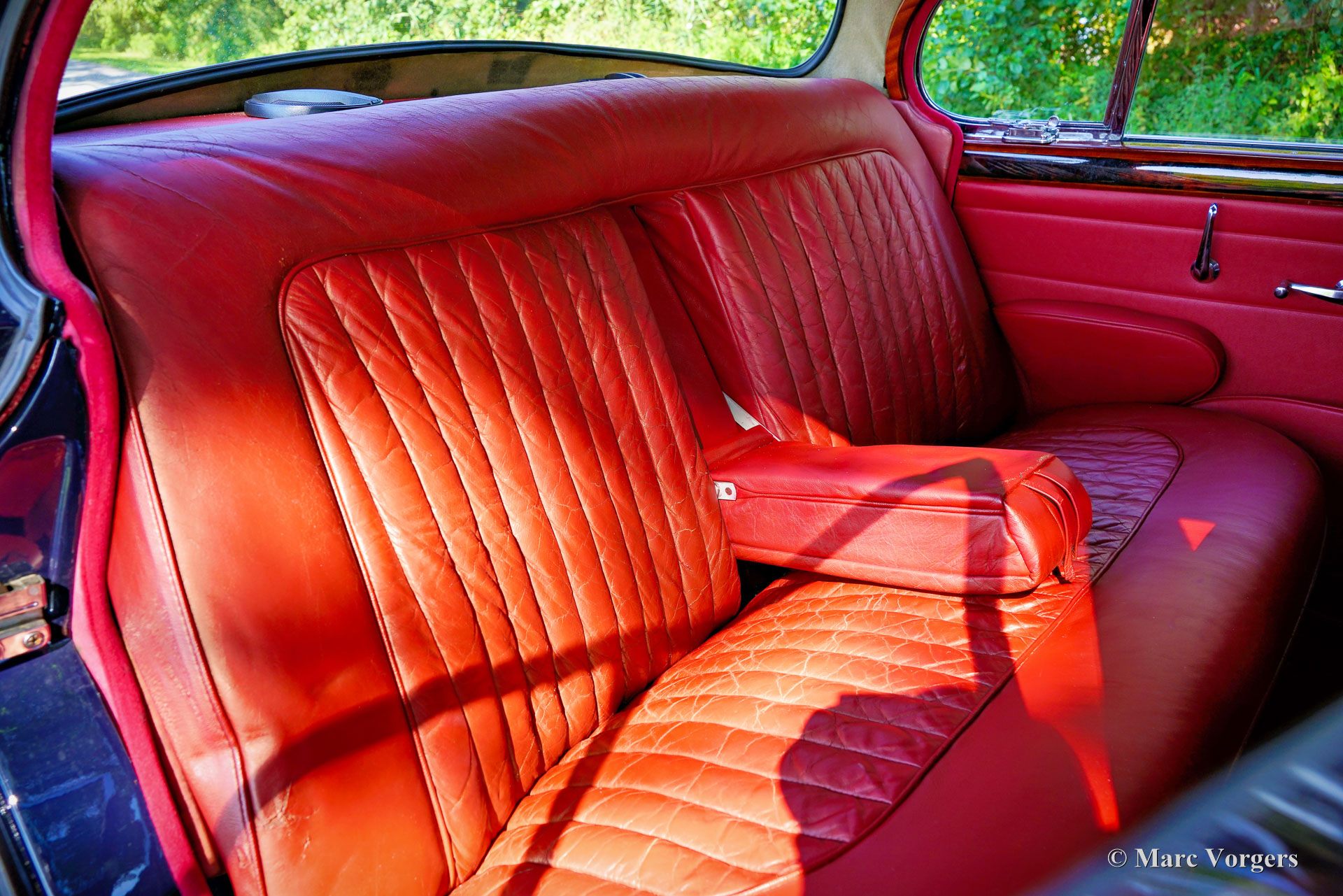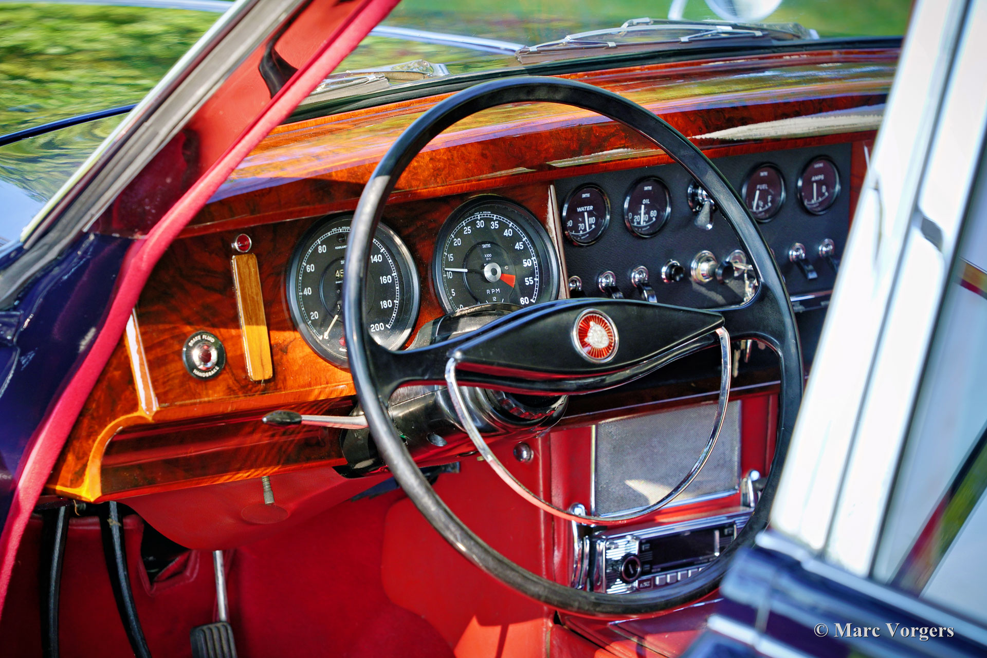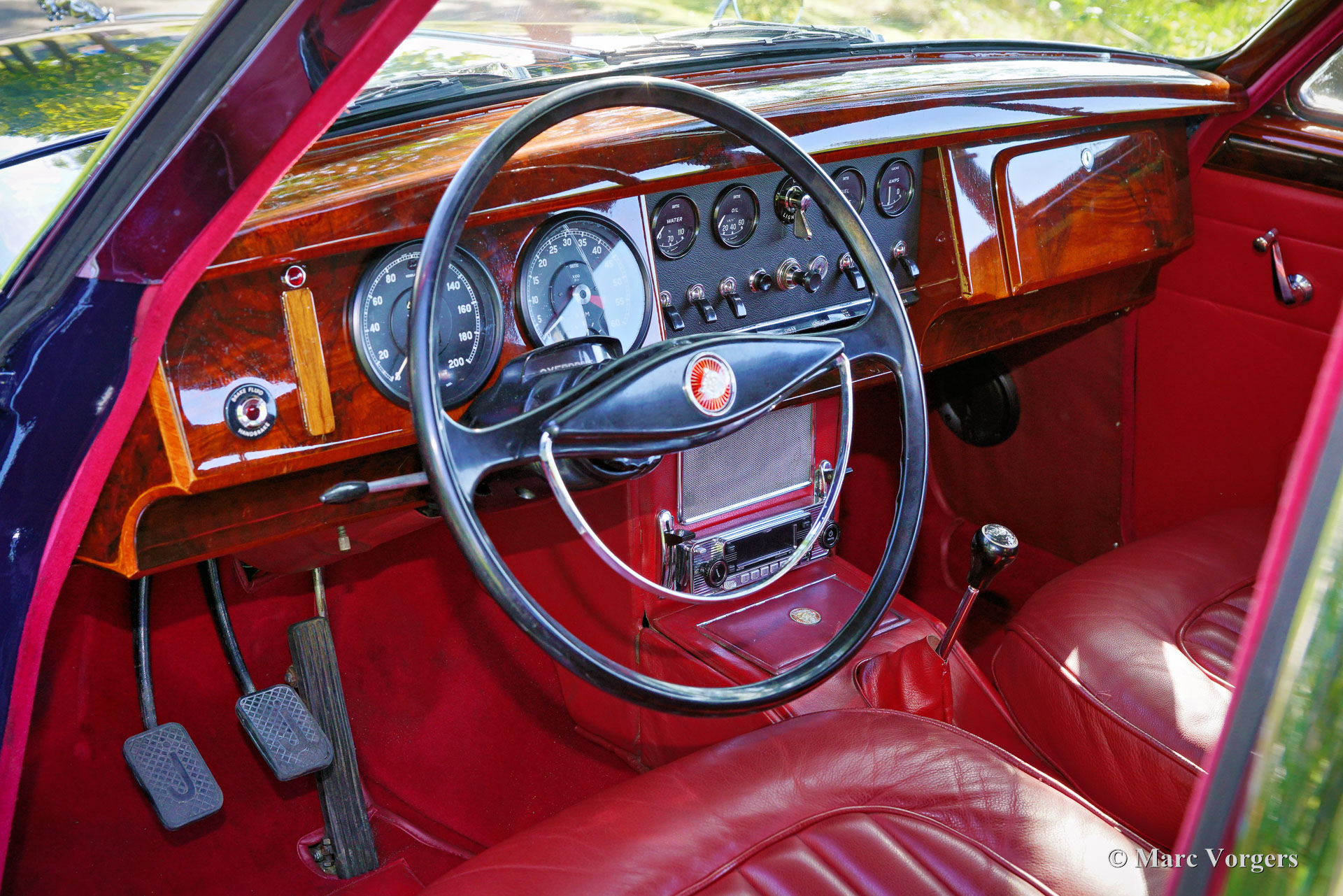 Jaguar Mk II 3.8 Liter, jaar 1962. Kleur donkerblauw gecombineerd met een roodlederen interieur en rood tapijt. Deze prachtige Jaguar Mk II is in het verleden uitgebreid gerestaureerd, de auto verkeert in een zeer goede staat en de auto rijdt uitstekend. De Jaguar Mk II was een groot succes en een van de meest gewilde Britse sedans van begin jaren 60. Dit topmodel is uitgerust met Jaguars grootste motor van die tijd; de 3.8 liter XK-zescilinder, en de handgeschakelde 4-versnellingsbak met overdrive! De 3781cc zescilinder produceerde 220 pk en een 3.8 met de handgeschakelde versnellingsbak was een echte 200 km/u machine, waarbij de meeste sportwagens in de jaren 60 verbleekten. Vanwege zijn potentieel was de auto erg populair bij de politie... en ook bij het dievengilde. Deze prachtige Jaguar Mk II toont alle originele details, waaronder de stalen wielen met chromen wieldoppen en de ‘spats’ over de achterwielen. Het luxe interieur ademt de sfeer van een high-end Britse gentlemen's club, met wollen tapijt, dure lederen bekleding en walnotenhout rondom. Het sportieve karakter van de Mk II komt tot uiting door het krachtige geluid van de 'twin-cam' zescilindermotor en het prachtige dashboard vol met meters en schakelaars. Deze Jaguar is voorzien van een roestvrijstalen uitlaat en de auto wordt compleet geleverd met de originele gereedschap set die is opgeborgen in het reservewiel. Deze geweldige Jaguar is klaar om zijn volle potentieel te tonen aan een trotse nieuwe eigenaar!