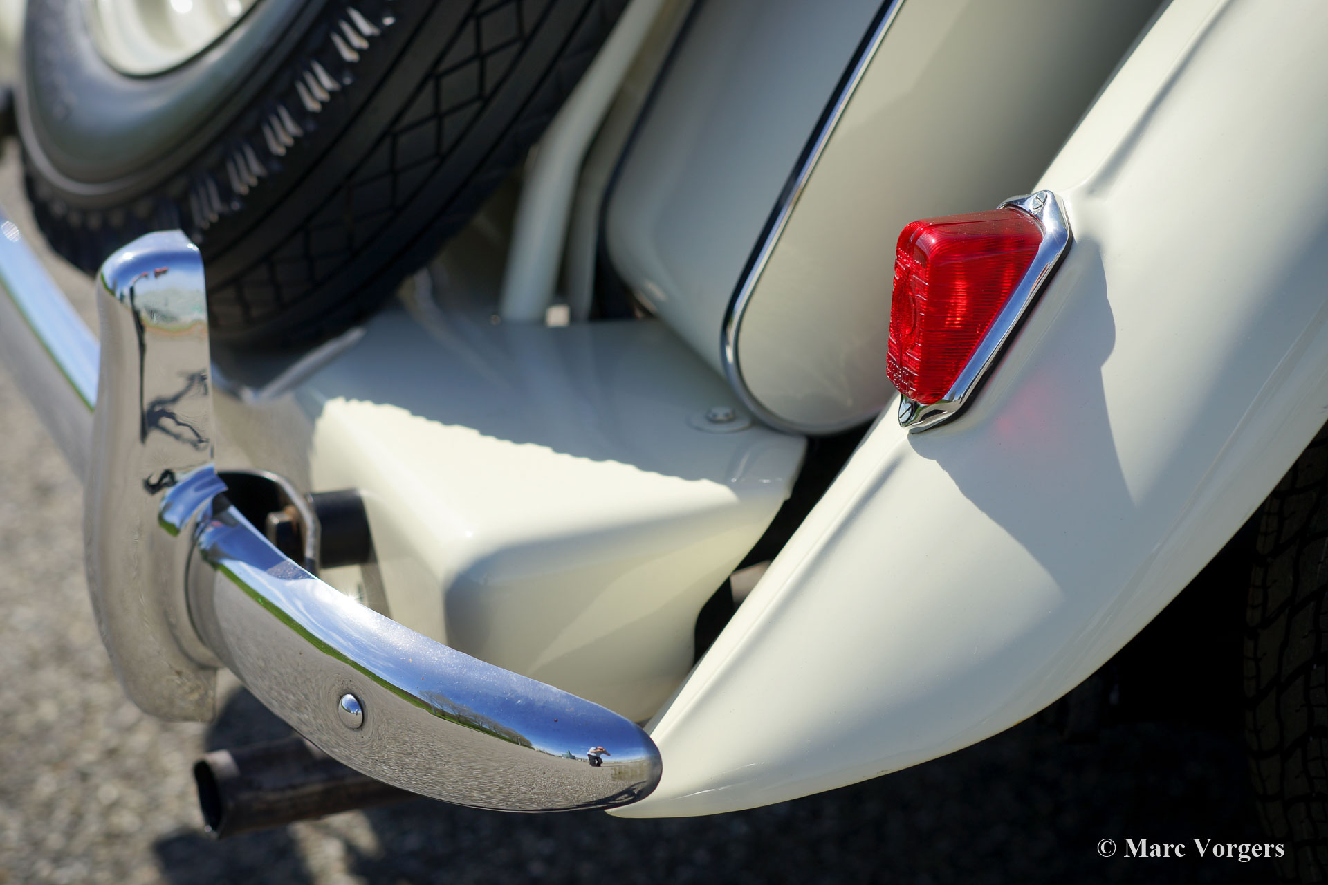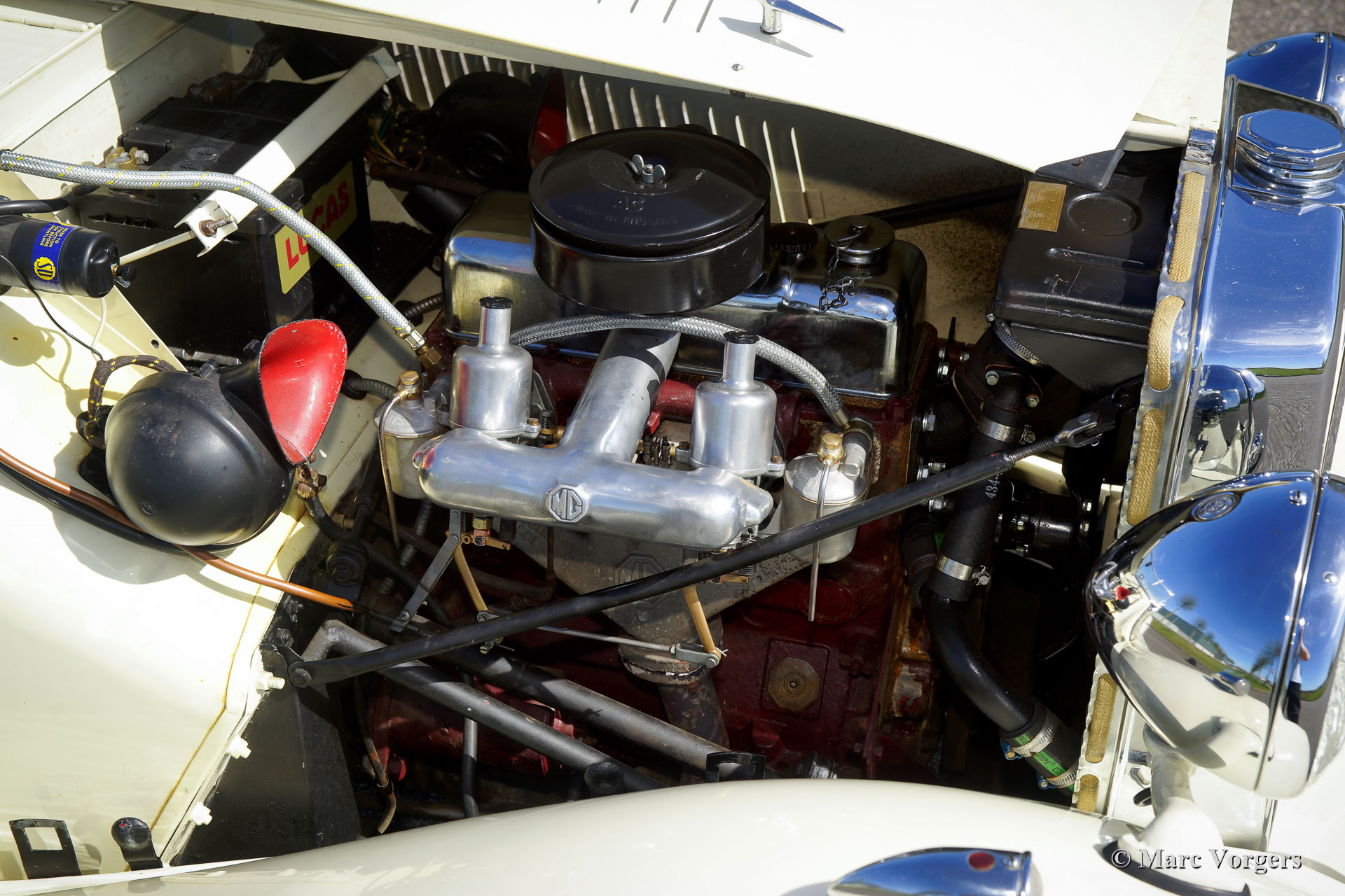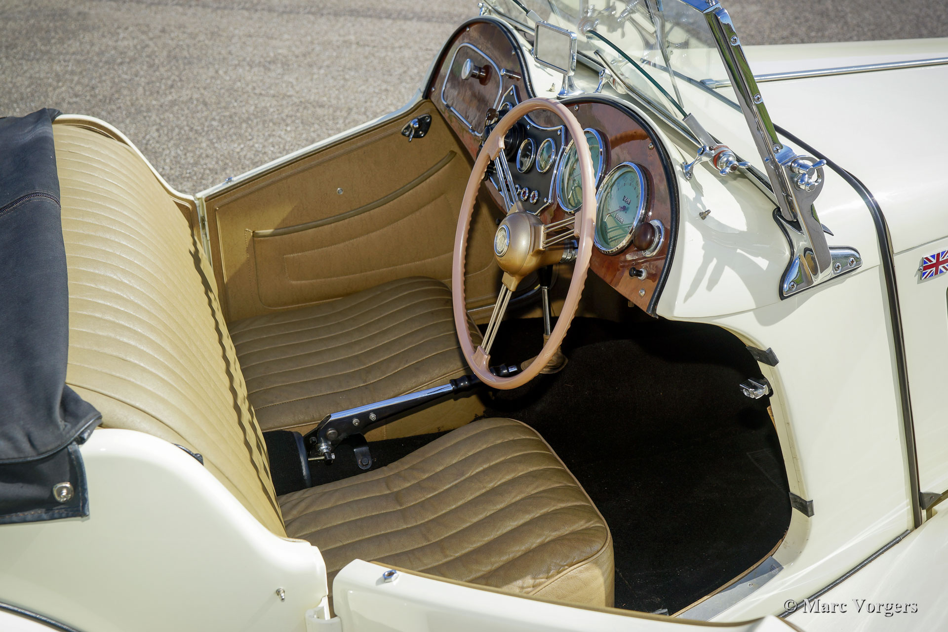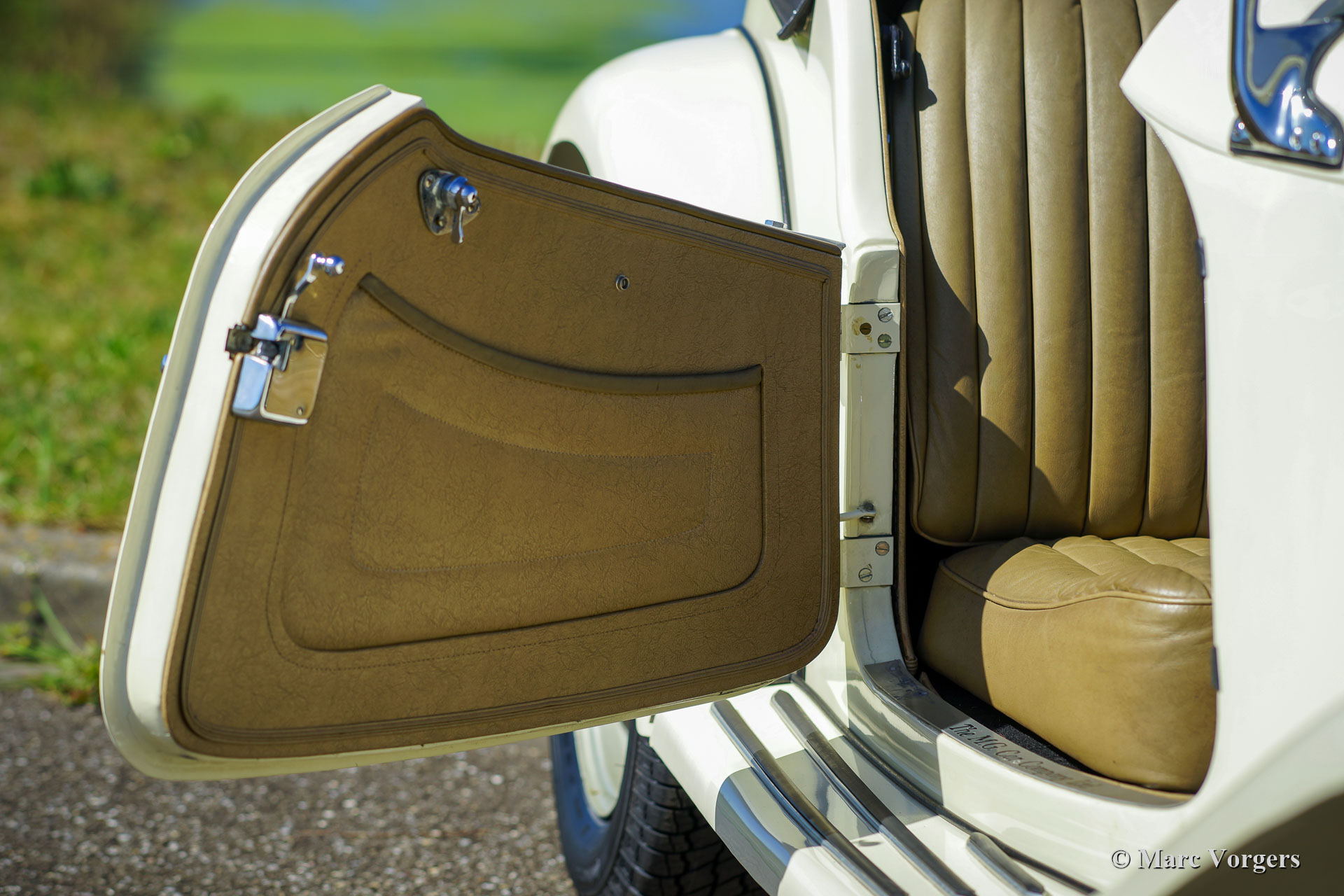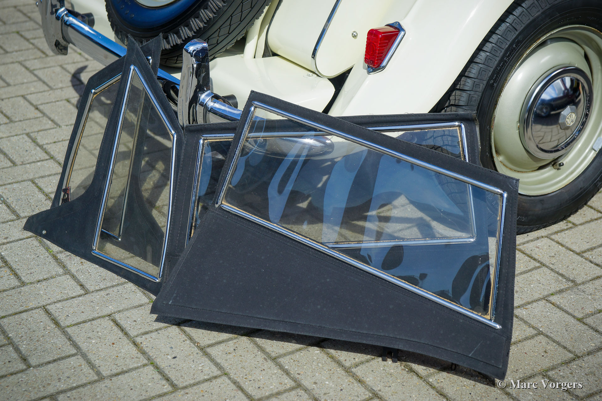 MG TD, jaar 1950. Kleur Old English White gecombineerd met een beige lederen interieur en zwart tapijt. Zwarte kap, tonneau-cover en zijruitframes. Deze vroege MG TD is direct te herkennen aan de dichte schijfwielen die alleen op de vroegste exemplaren te zien waren. Deze prachtige MG TD werd in 1954 in Nederland geïmporteerd. De laatste eigenaar koestert deze schoonheid al sinds 1995! Deze MG TD verkeert in zeer goede tot excellente conditie en de auto rijdt voortreffelijk. Onlangs is de auto uitgebreid onderhouden na een lange periode van inactiviteit. Er zijn nieuwe banden gemonteerd, de remmen zijn gereviseerd/ vernieuwd, de rubberen bussen in de wielophanging zijn vernieuwd. Verder is er een nieuwe benzinepomp gemonteerd en zijn de carburateurs gereviseerd.