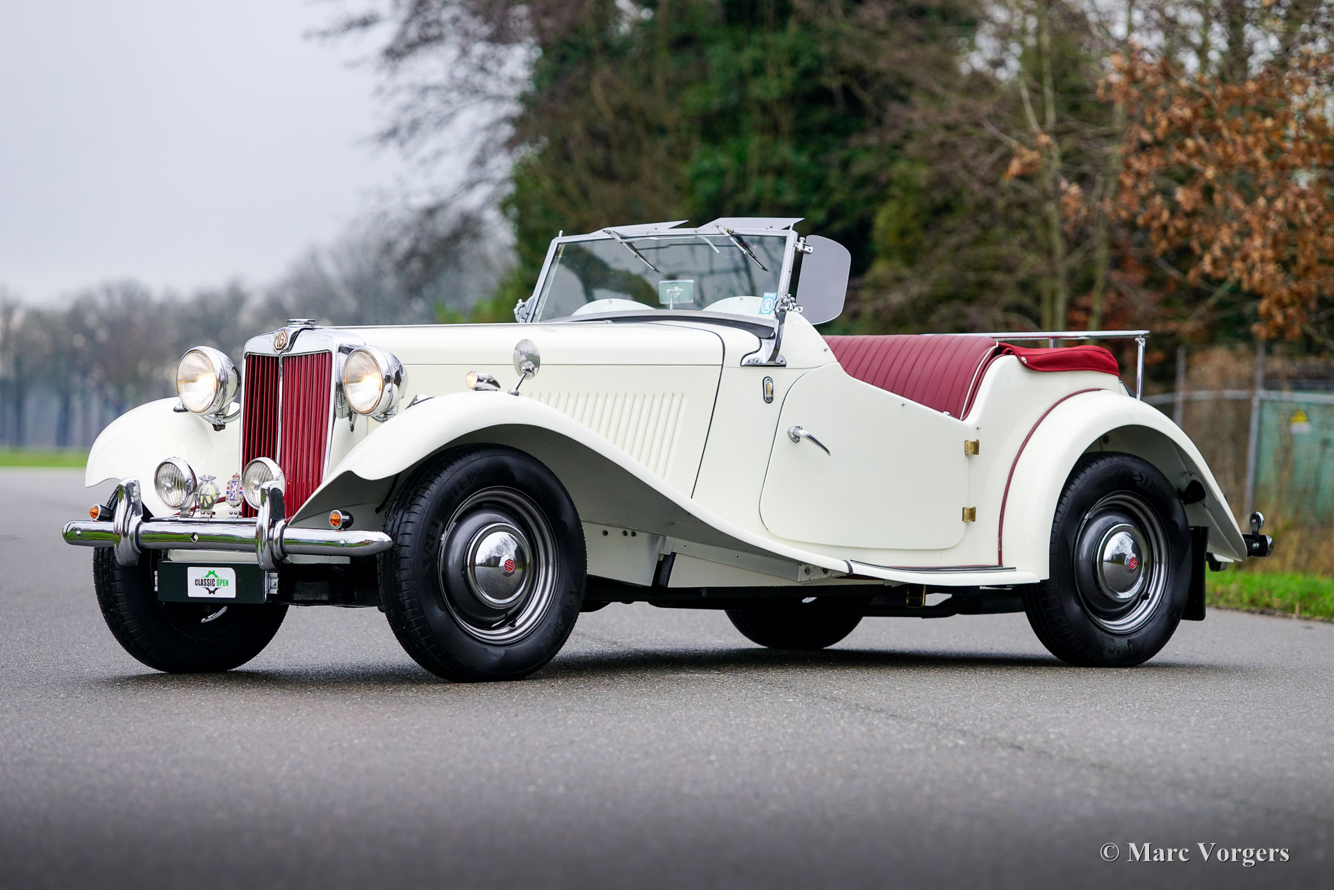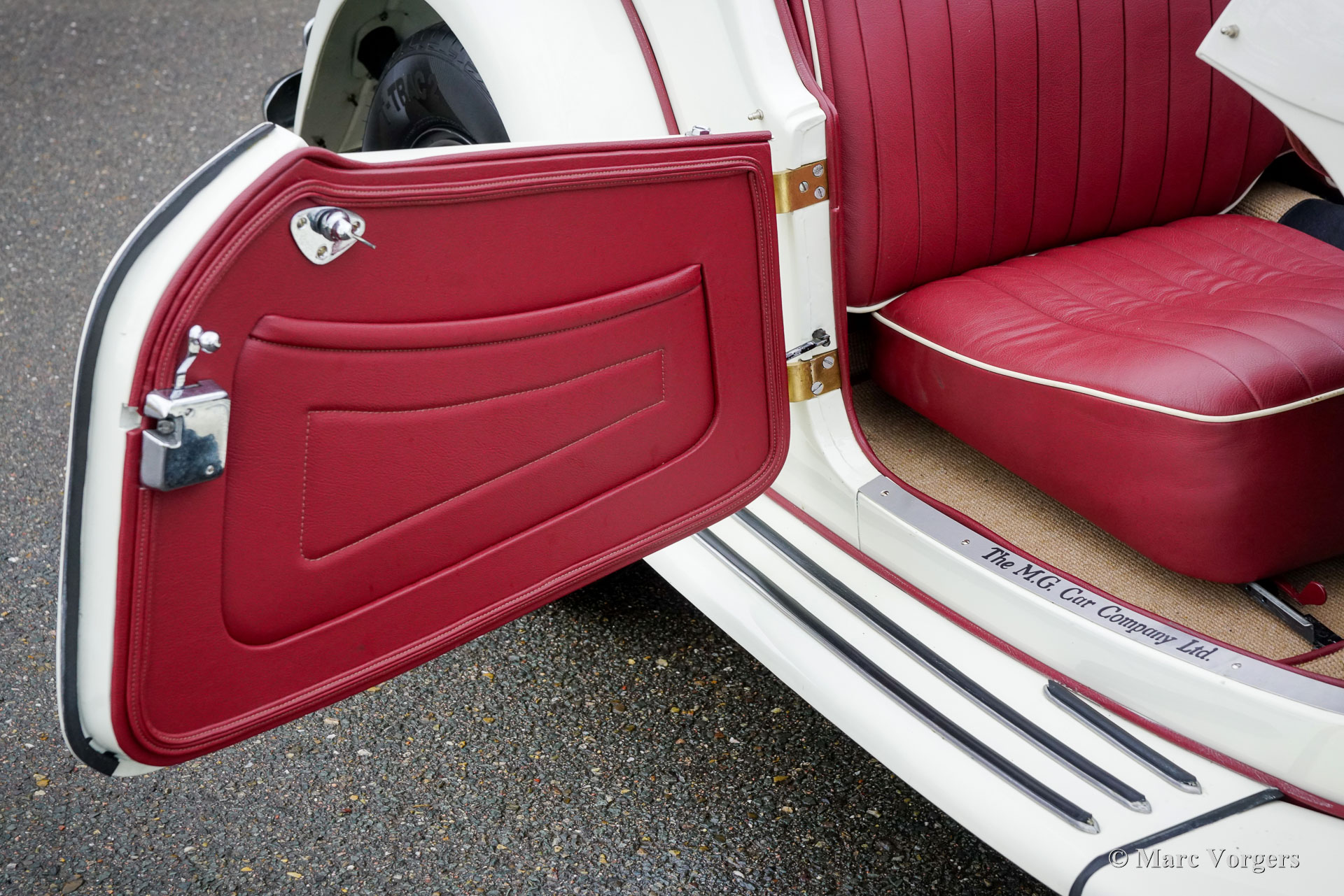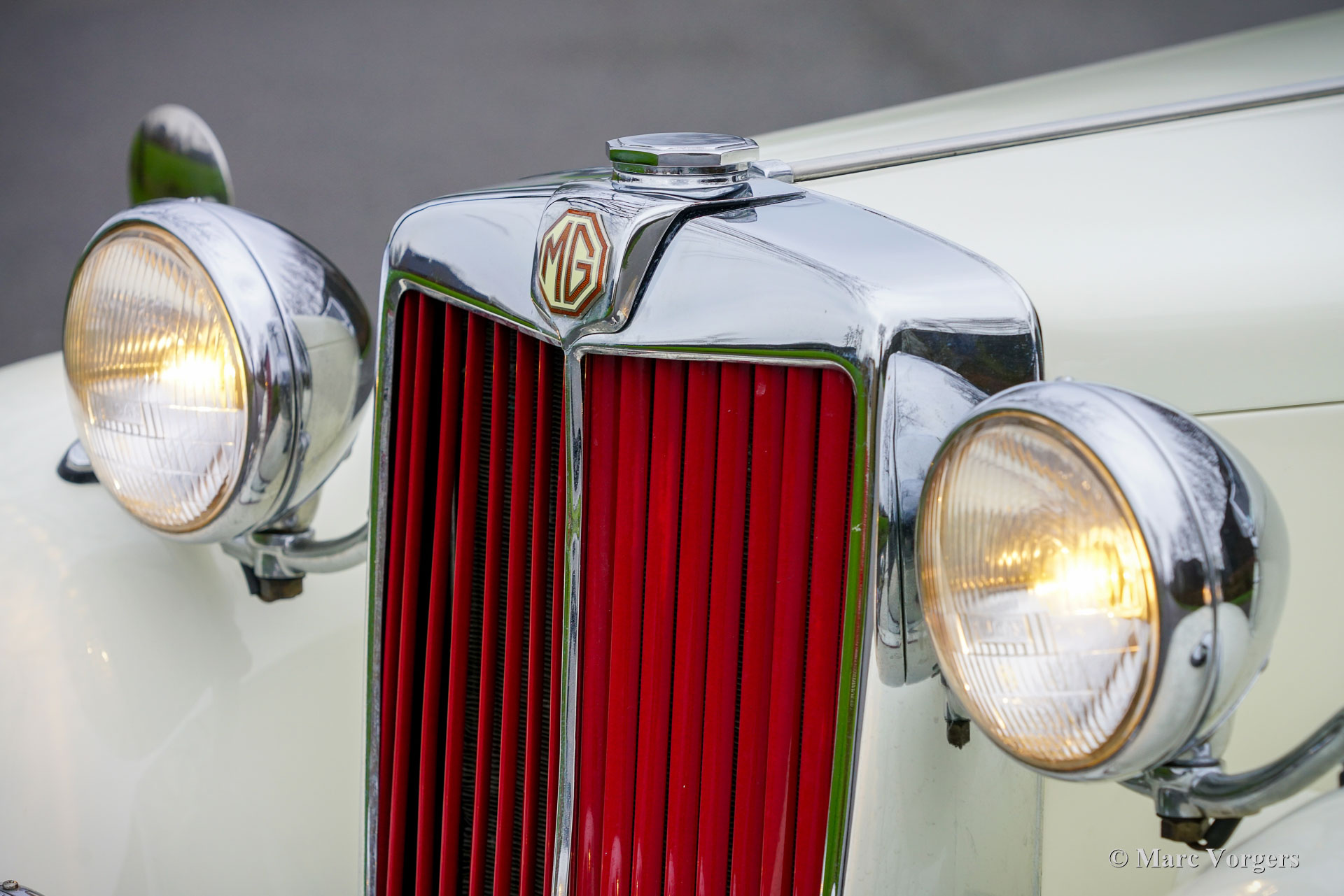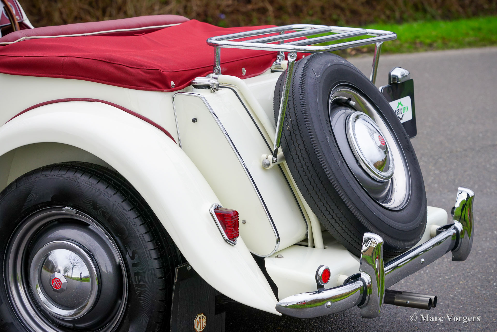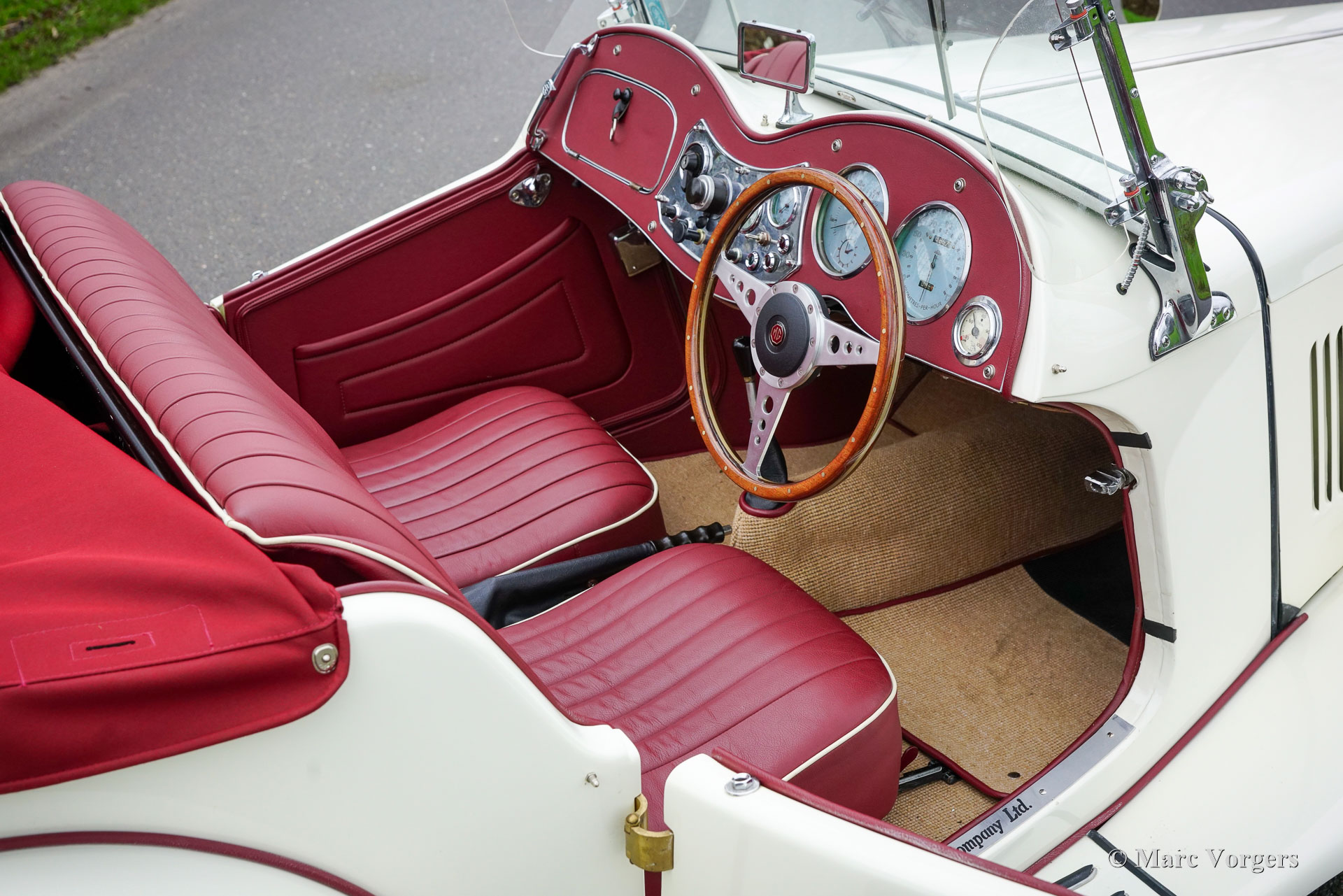 MG TD, jaar 1950. Kleur crème wit (Old English White) gecombineerd met een donkerrood lederen interieur afgewerkt met witte biezen en beige tapijt. Donkerrode mohair kap, zijschermen en tonneau cover. Deze prachtige MG TD met chassisnummer 2169 is nieuw verkocht in Nederland. In de periode 2015 – 2020 is deze prachtige MG TD zorgvuldig gerestaureerd naar oorspronkelijke glorie; de auto ziet eruit en rijdt alsof deze net de MG-fabriek heeft verlaten. Alles is gerestaureerd, opgeknapt en/of vernieuwd. De 1250cc XPAG-motor is gereviseerd wat zorgt voor een soepele en plezierige klassieke rijervaring. Het interieur is voorzien van nieuwe bekleding, een gerestaureerd dashboard en prachtige meters met chromen randen. Sinds de restauratie heeft de auto slechts 2000 kilometer gereden. Een restauratierapport met foto's en facturen is aanwezig. Met zijn prachtig gebogen spatborden, chromen grille en klassieke kleurencombinatie is deze MG TD een klassieke schoonheid. Deze prachtig gerestaureerde MG TD is een geweldige vondst voor MG-verzamelaars en liefhebbers. Foto's van de onderkant zijn op aanvraag beschikbaar. Wij nodigen u uit om deze prachtige MG TD bij ons in de showroom te komen bewonderen en te ervaren tijdens een proefrit.