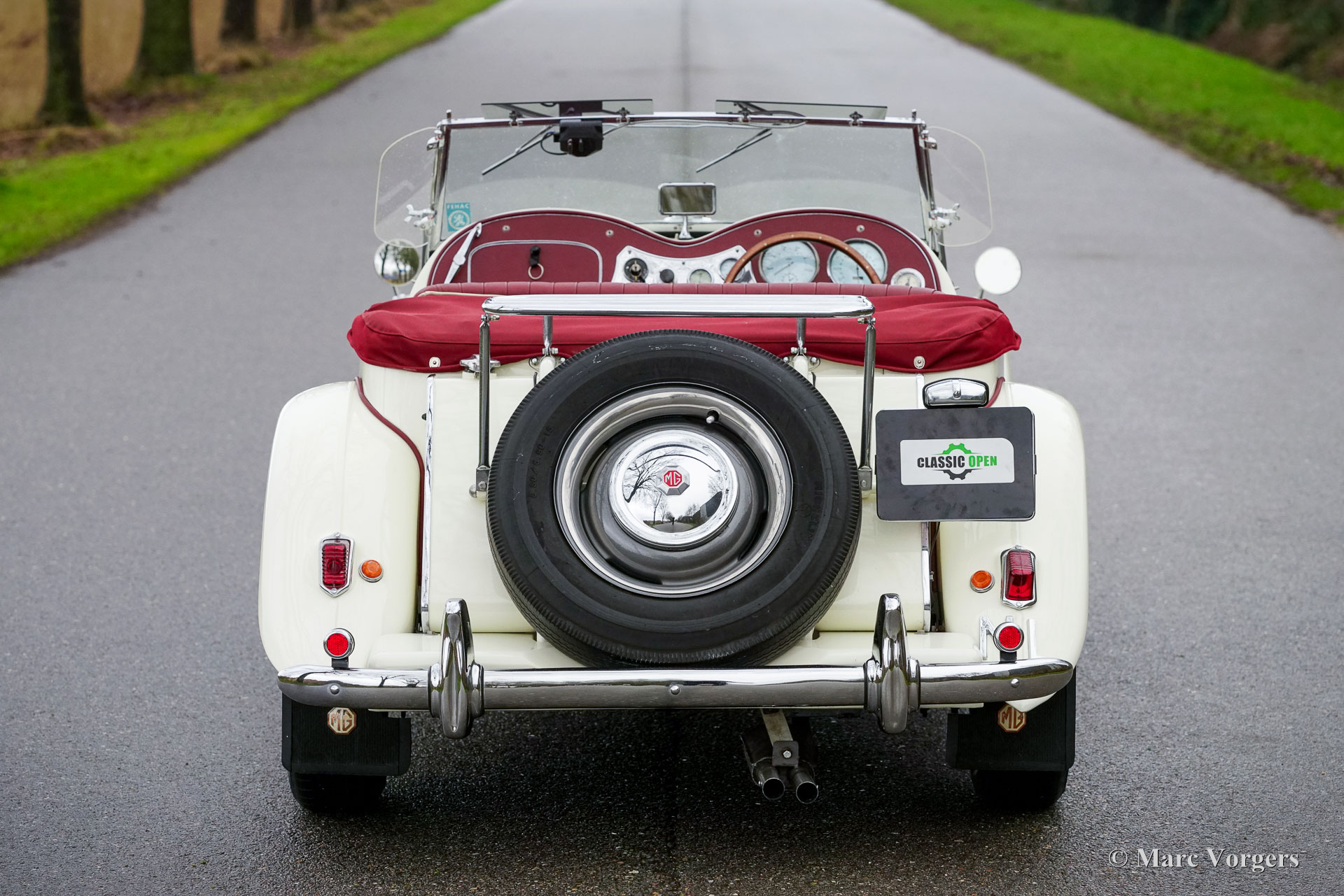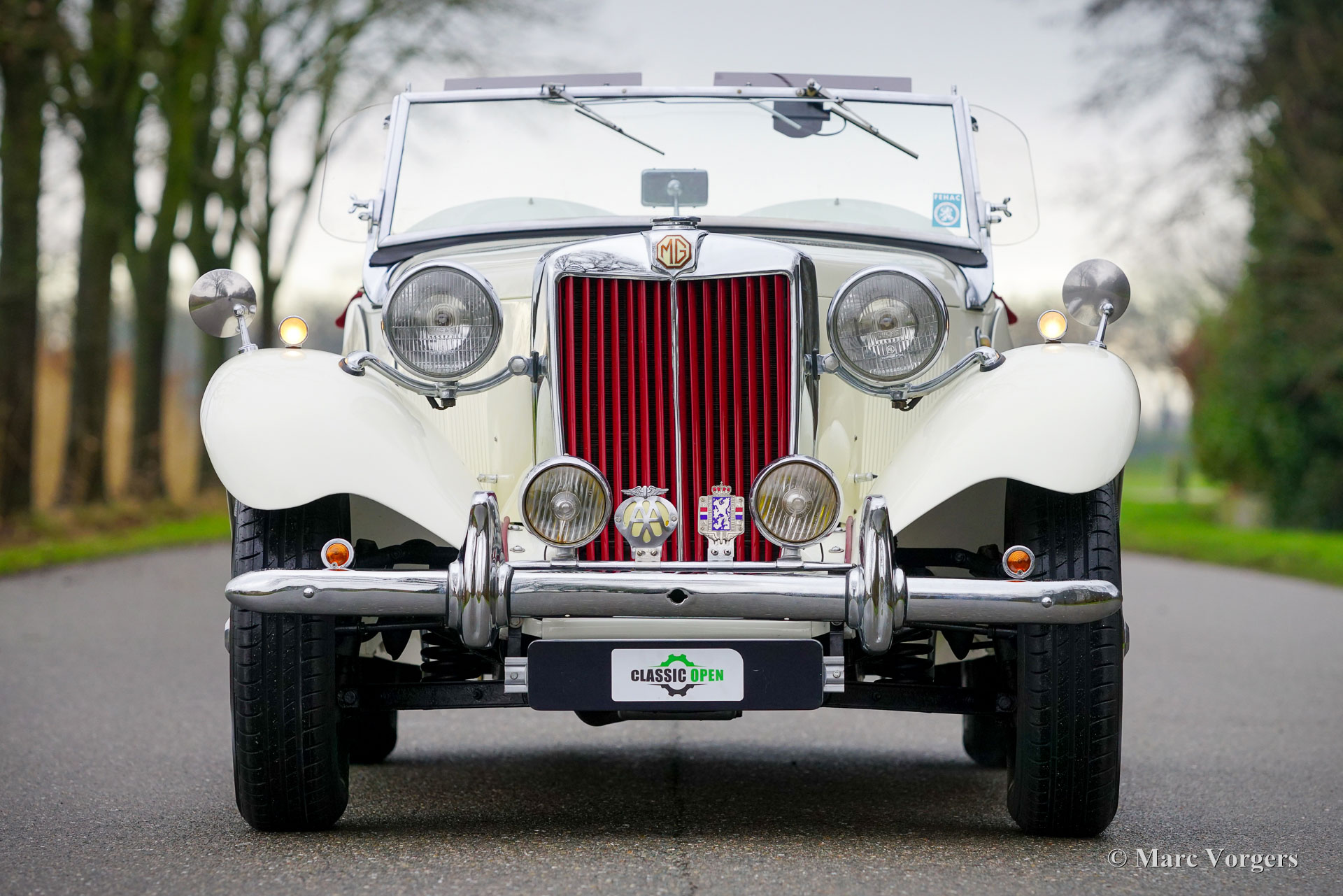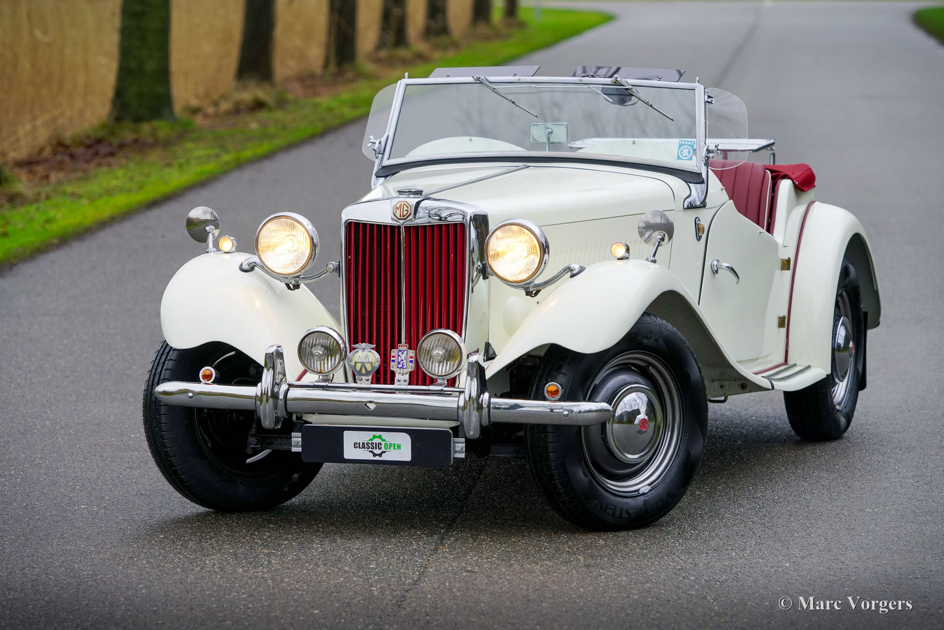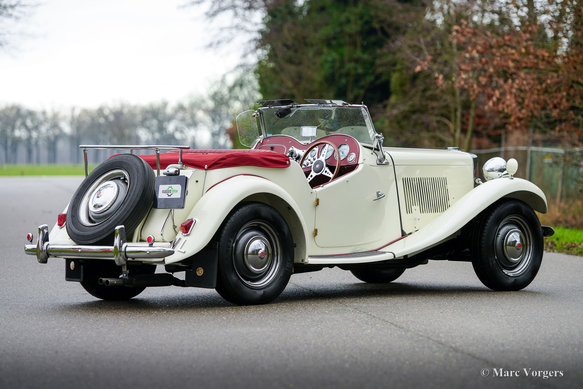 MG TD, jaar 1950. Kleur crème wit (Old English White) gecombineerd met een donkerrood lederen interieur afgewerkt met witte biezen en beige tapijt. Donkerrode mohair kap, zijschermen en tonneau cover. Deze prachtige MG TD met chassisnummer 2169 is nieuw verkocht in Nederland. In de periode 2015 – 2020 is deze prachtige MG TD zorgvuldig gerestaureerd naar oorspronkelijke glorie; de auto ziet eruit en rijdt alsof deze net de MG-fabriek heeft verlaten. Alles is gerestaureerd, opgeknapt en/of vernieuwd. De 1250cc XPAG-motor is gereviseerd wat zorgt voor een soepele en plezierige klassieke rijervaring. Het interieur is voorzien van nieuwe bekleding, een gerestaureerd dashboard en prachtige meters met chromen randen. Sinds de restauratie heeft de auto slechts 2000 kilometer gereden. Een restauratierapport met foto's en facturen is aanwezig. Met zijn prachtig gebogen spatborden, chromen grille en klassieke kleurencombinatie is deze MG TD een klassieke schoonheid. Deze prachtig gerestaureerde MG TD is een geweldige vondst voor MG-verzamelaars en liefhebbers. Foto's van de onderkant zijn op aanvraag beschikbaar. Wij nodigen u uit om deze prachtige MG TD bij ons in de showroom te komen bewonderen en te ervaren tijdens een proefrit.