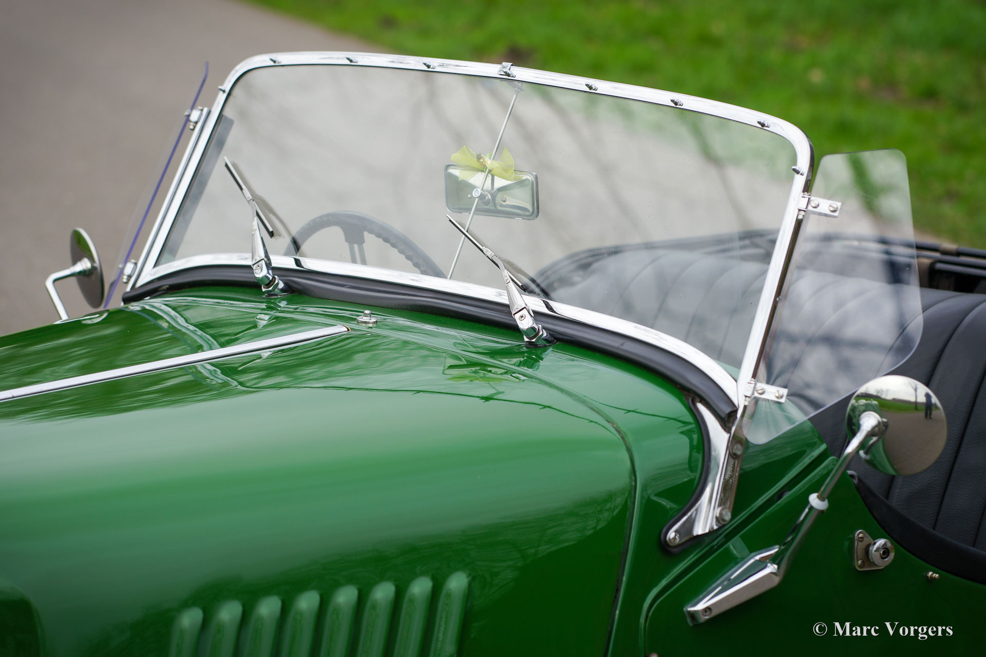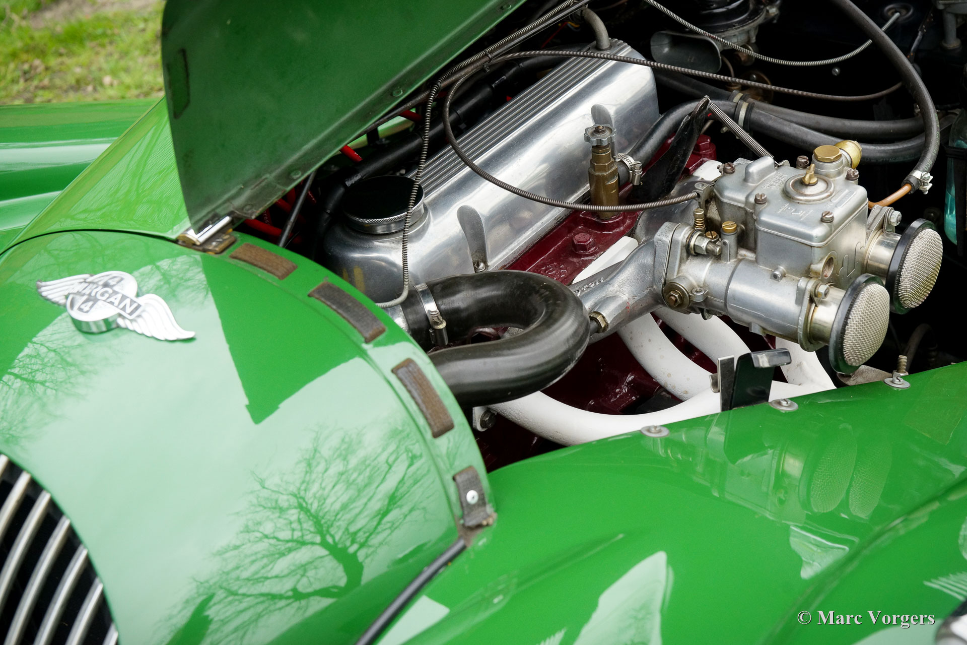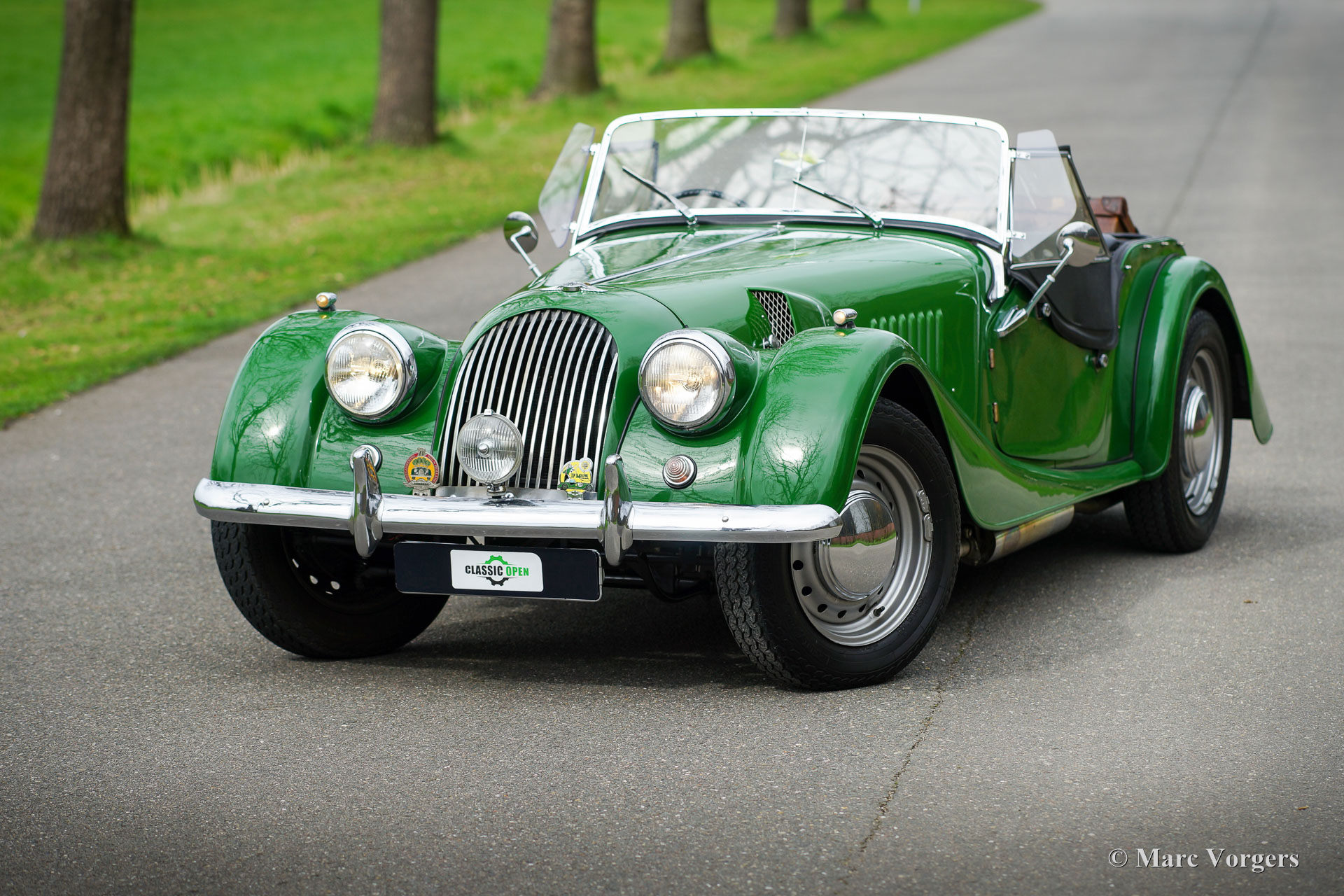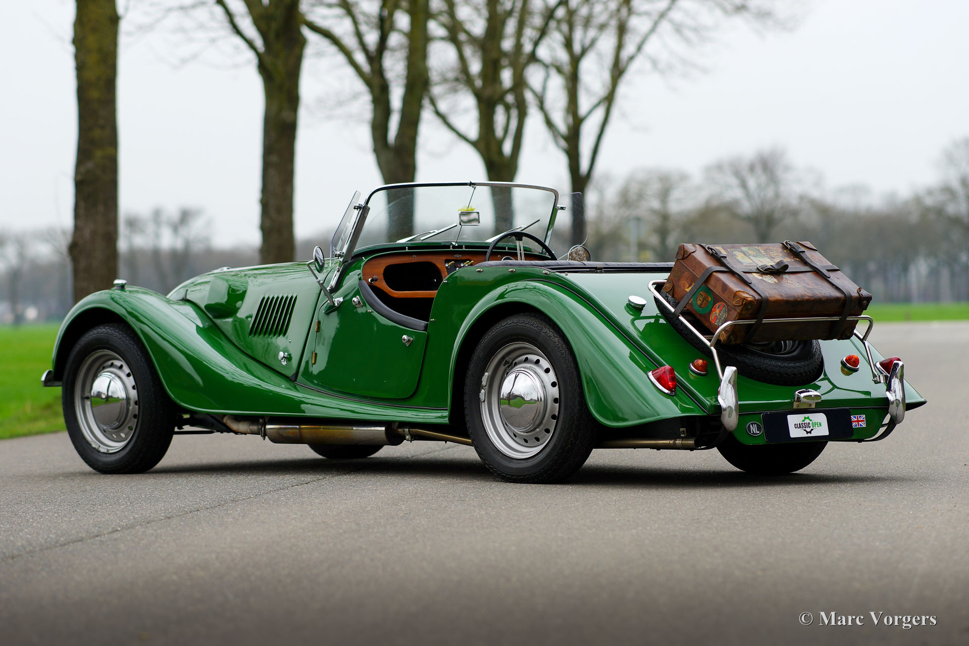 Morgan 4/4, jaar 1963. Kleur groen gecombineerd met een zwartlederen interieur, zwart tapijt, zwarte soft-top en een zwarte tonneau cover. Deze klassieke Morgan is voorzien van een prachtig gevormde bank die veel comfort biedt in deze pure Britse sportwagen. Deze prachtige Morgan 4/4 (serie IV) werd nieuw verkocht in Groot-Brittannië. Het is een zeldzaam model waarvan er slechts 209 met de hand zijn gebouwd. In 1975 is de auto naar Nederland geïmporteerd en opgeknapt. Oorspronkelijk was de auto voorzien van een 1340 cc Ford Consul viercilinder motor, de motor is vervangen door een 1500 cc motor van het type dat ook in de Morgan 4/4 serie V gebruikt wordt. Deze krachtige en betrouwbare motor is voorzien van een dubbele Weber carburateur en levert een gezonde 84 pk. Het vermogen wordt overgebracht op de achterwielen via een handgeschakelde vierversnellingsbak. In de jaren 2001-2004 is de auto uitvoerig en prachtig gerestaureerd naar topstaat. De auto (die origineel rood was) is daarbij gespoten in de huidige groene kleur. De restauratie is volledig gedocumenteerd met een fotoreportage en facturen. Het chassis is vernieuwd, evenals de kabelboom. Er werd een RVS uitlaat gemonteerd, een aluminium benzinetank en elektronische ontsteking. Ook werd er een toerenteller in het dashboard gemonteerd. De auto toont veel mooie originele details zoals de zeldzame 15 inch stalen velgen met chromen wieldoppen! Verder is aan de voorzijde een Lucas SFT mistlamp gemonteerd en aan de achterzijde een kofferrek. Deze rechtsgestuurde Morgan 4/4 is een schoonheid, en de auto rijdt en stuurt perfect! Een zeer begerenswaardig exemplaar!
