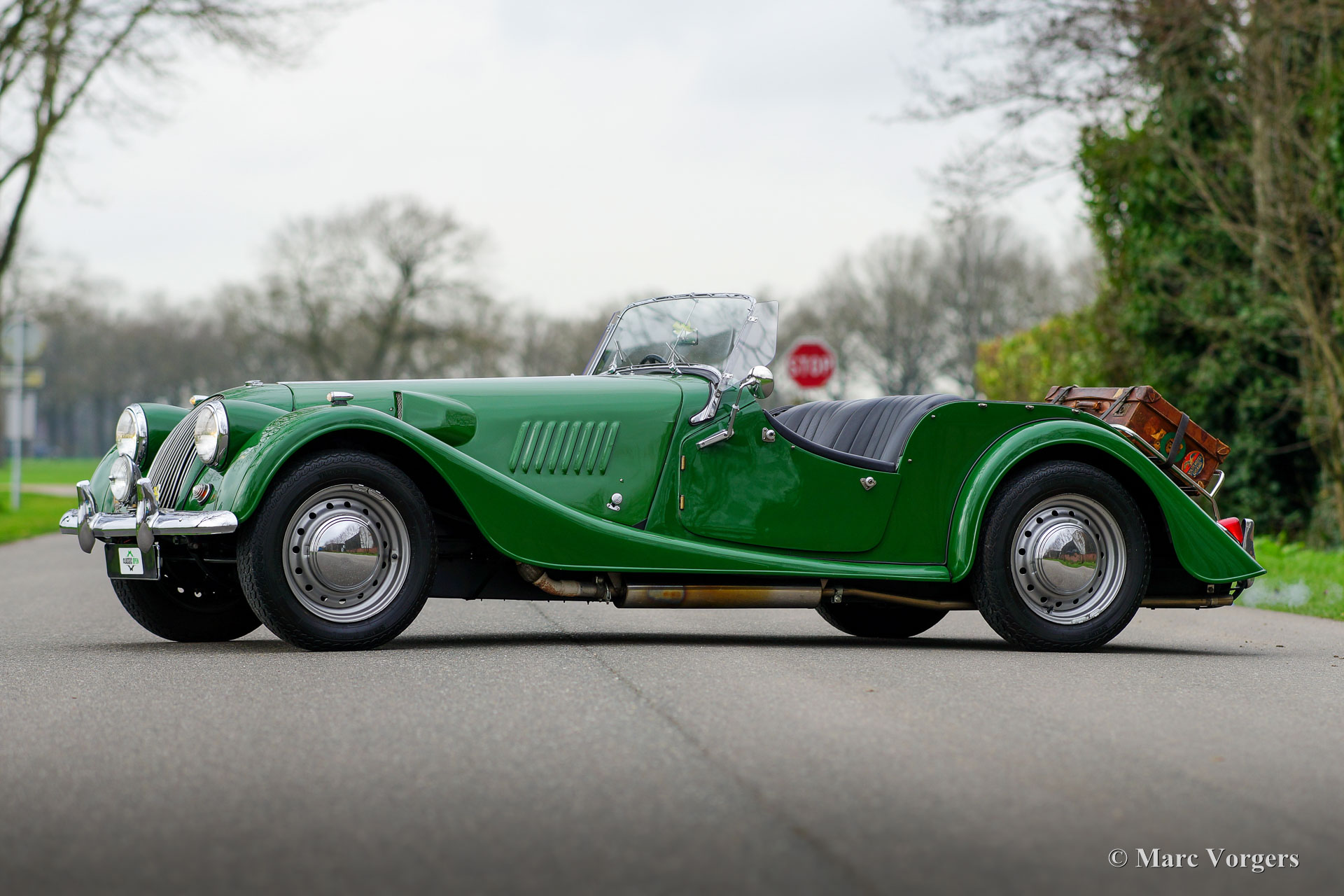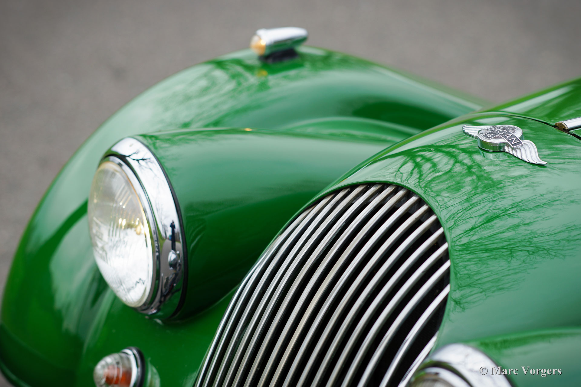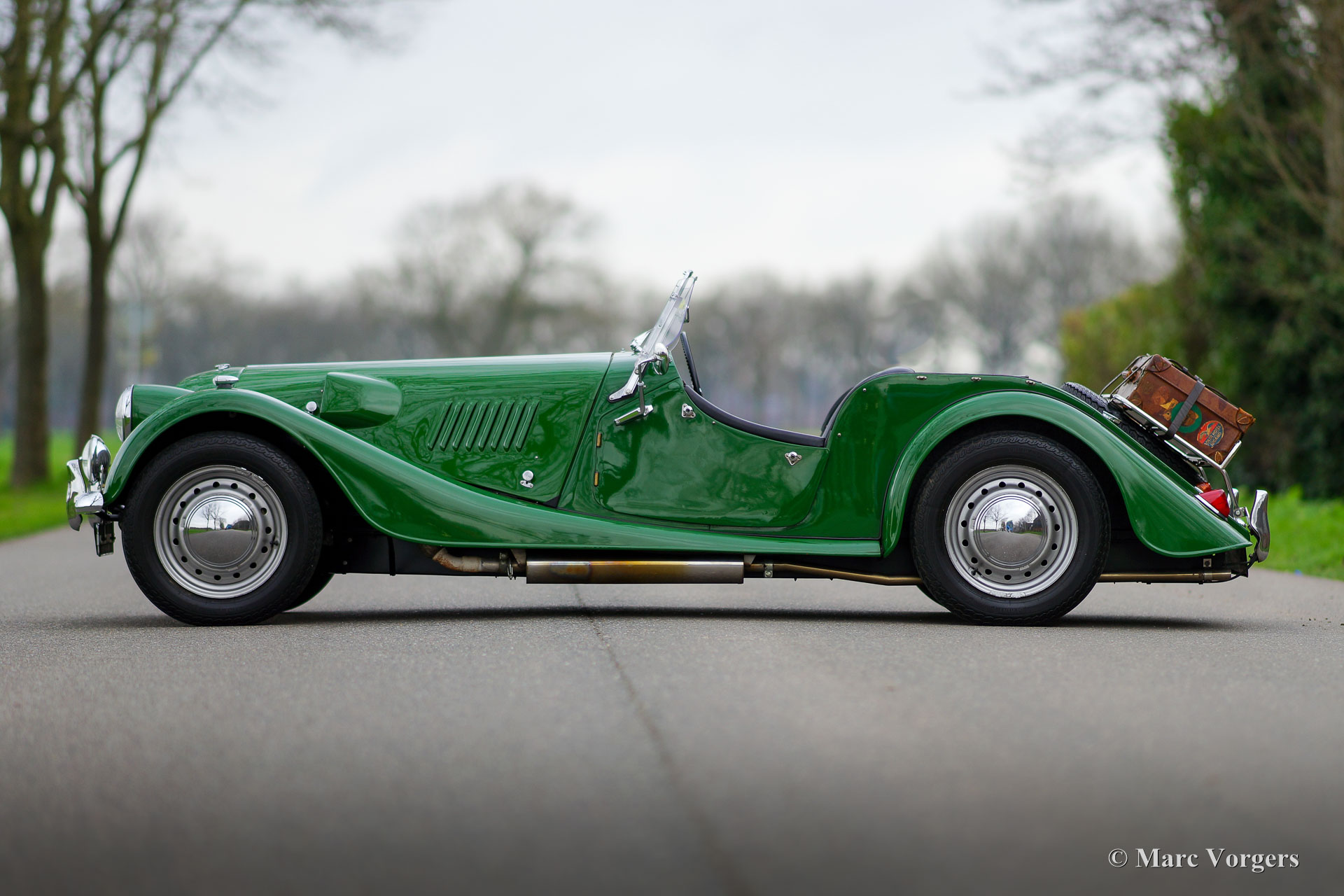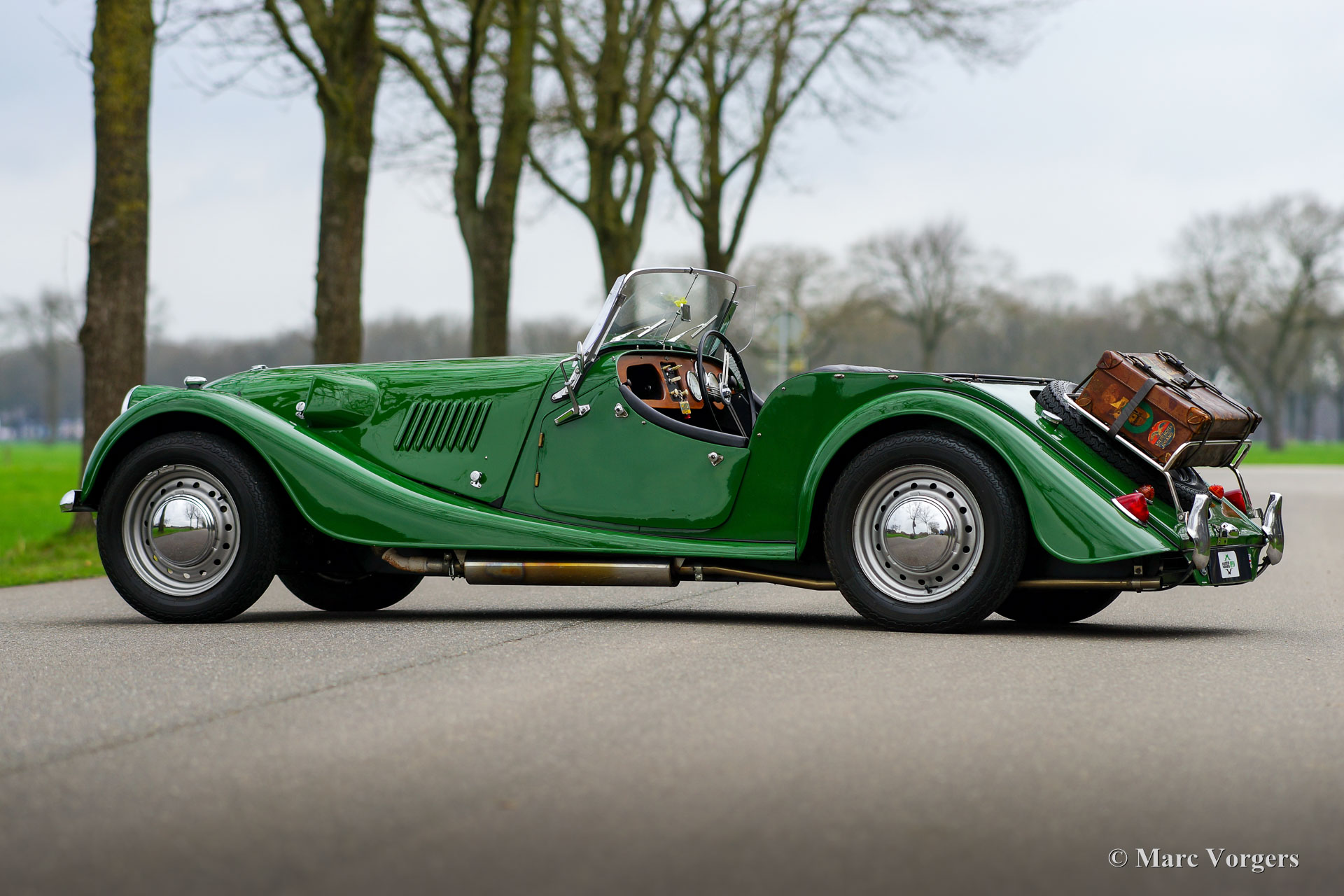 Morgan 4/4, jaar 1963. Kleur groen gecombineerd met een zwartlederen interieur, zwart tapijt, zwarte soft-top en een zwarte tonneau cover. Deze klassieke Morgan is voorzien van een prachtig gevormde bank die veel comfort biedt in deze pure Britse sportwagen. Deze prachtige Morgan 4/4 (serie IV) werd nieuw verkocht in Groot-Brittannië. Het is een zeldzaam model waarvan er slechts 209 met de hand zijn gebouwd. In 1975 is de auto naar Nederland geïmporteerd en opgeknapt. Oorspronkelijk was de auto voorzien van een 1340 cc Ford Consul viercilinder motor, de motor is vervangen door een 1500 cc motor van het type dat ook in de Morgan 4/4 serie V gebruikt wordt. Deze krachtige en betrouwbare motor is voorzien van een dubbele Weber carburateur en levert een gezonde 84 pk. Het vermogen wordt overgebracht op de achterwielen via een handgeschakelde vierversnellingsbak. In de jaren 2001-2004 is de auto uitvoerig en prachtig gerestaureerd naar topstaat. De auto (die origineel rood was) is daarbij gespoten in de huidige groene kleur. De restauratie is volledig gedocumenteerd met een fotoreportage en facturen. Het chassis is vernieuwd, evenals de kabelboom. Er werd een RVS uitlaat gemonteerd, een aluminium benzinetank en elektronische ontsteking. Ook werd er een toerenteller in het dashboard gemonteerd. De auto toont veel mooie originele details zoals de zeldzame 15 inch stalen velgen met chromen wieldoppen! Verder is aan de voorzijde een Lucas SFT mistlamp gemonteerd en aan de achterzijde een kofferrek. Deze rechtsgestuurde Morgan 4/4 is een schoonheid, en de auto rijdt en stuurt perfect! Een zeer begerenswaardig exemplaar!