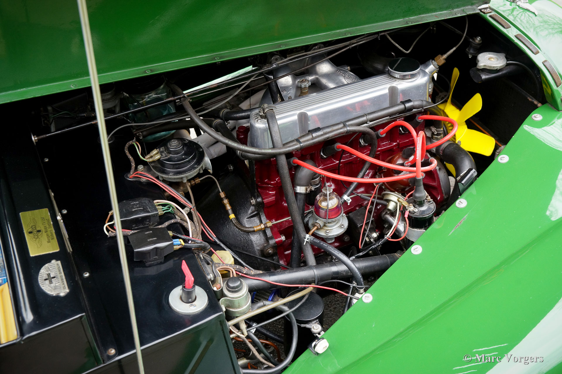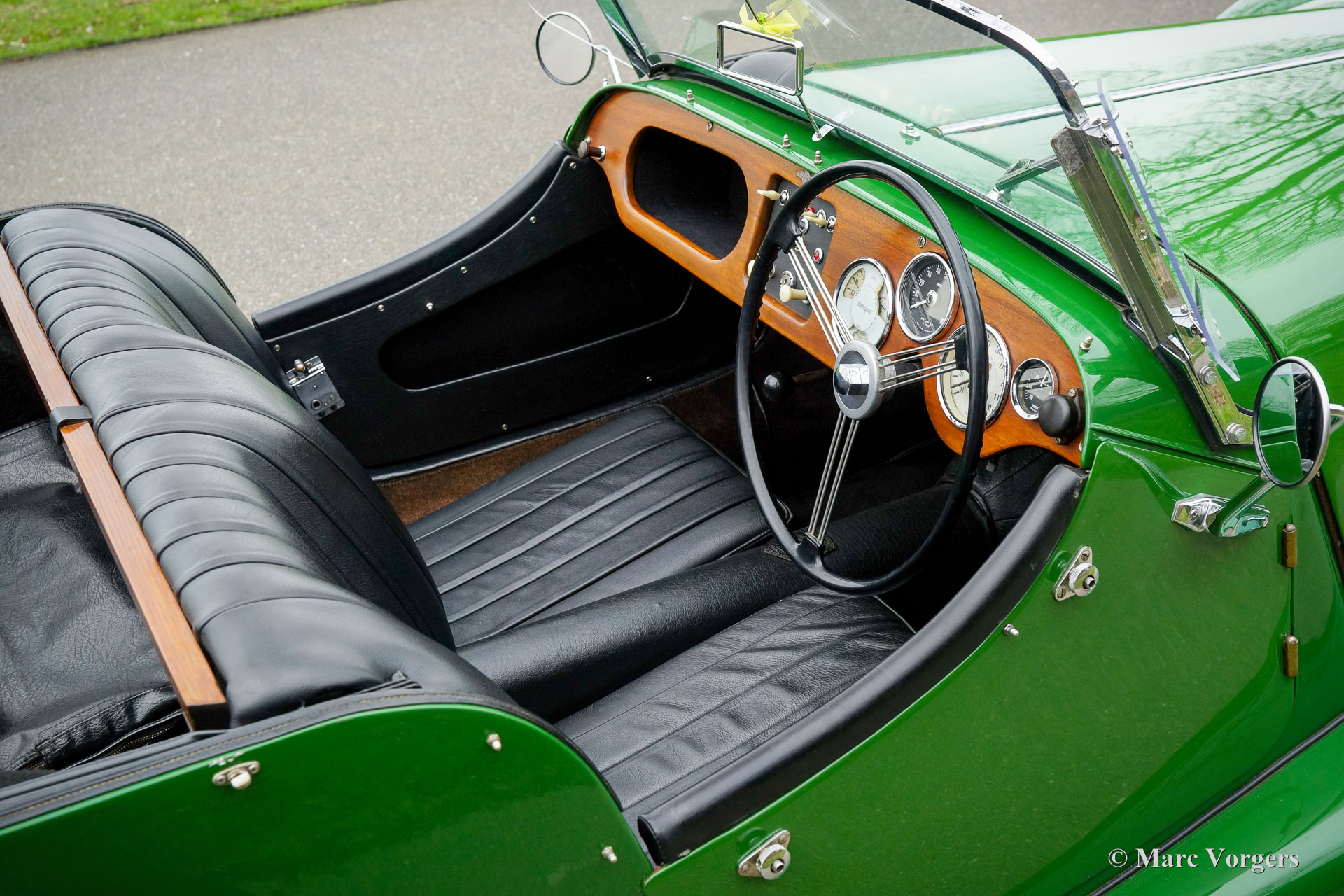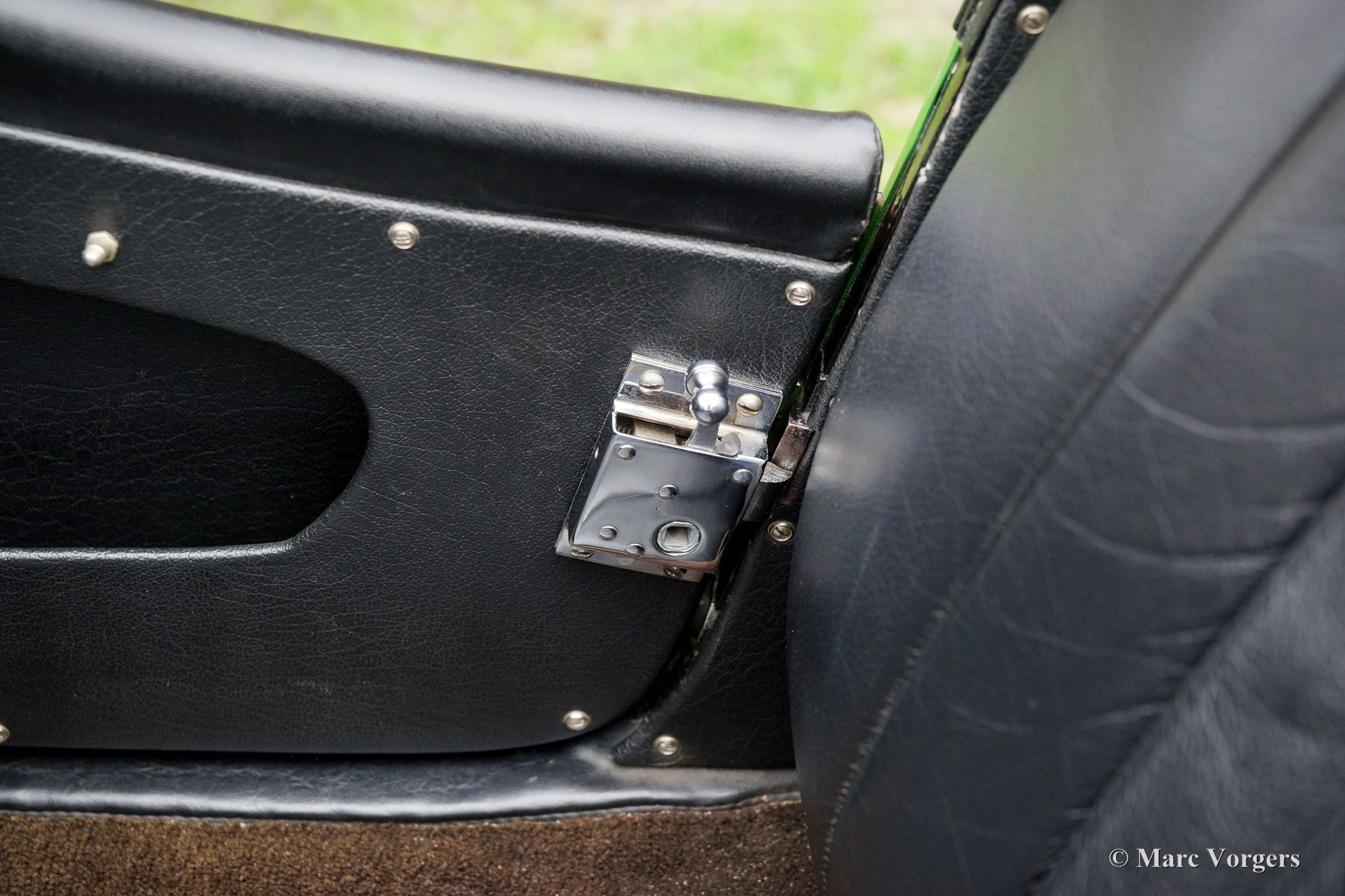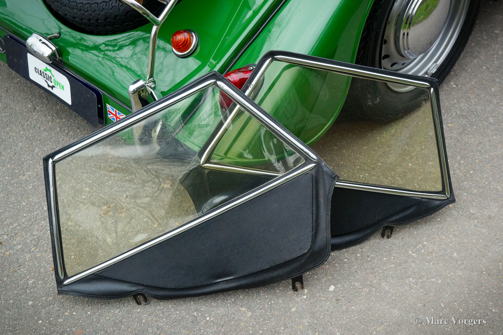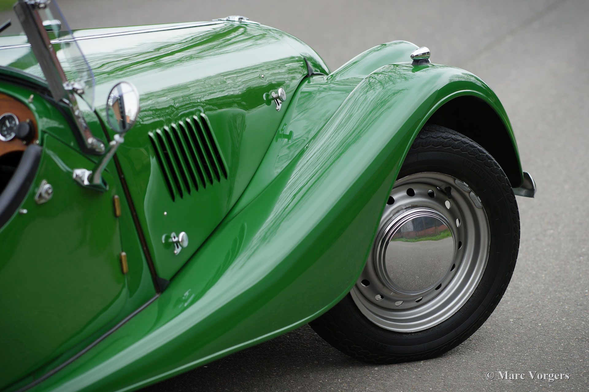 Morgan 4/4, jaar 1963. Kleur groen gecombineerd met een zwartlederen interieur, zwart tapijt, zwarte soft-top en een zwarte tonneau cover. Deze klassieke Morgan is voorzien van een prachtig gevormde bank die veel comfort biedt in deze pure Britse sportwagen. Deze prachtige Morgan 4/4 (serie IV) werd nieuw verkocht in Groot-Brittannië. Het is een zeldzaam model waarvan er slechts 209 met de hand zijn gebouwd. In 1975 is de auto naar Nederland geïmporteerd en opgeknapt. Oorspronkelijk was de auto voorzien van een 1340 cc Ford Consul viercilinder motor, de motor is vervangen door een 1500 cc motor van het type dat ook in de Morgan 4/4 serie V gebruikt wordt. Deze krachtige en betrouwbare motor is voorzien van een dubbele Weber carburateur en levert een gezonde 84 pk. Het vermogen wordt overgebracht op de achterwielen via een handgeschakelde vierversnellingsbak. In de jaren 2001-2004 is de auto uitvoerig en prachtig gerestaureerd naar topstaat. De auto (die origineel rood was) is daarbij gespoten in de huidige groene kleur. De restauratie is volledig gedocumenteerd met een fotoreportage en facturen. Het chassis is vernieuwd, evenals de kabelboom. Er werd een RVS uitlaat gemonteerd, een aluminium benzinetank en elektronische ontsteking. Ook werd er een toerenteller in het dashboard gemonteerd. De auto toont veel mooie originele details zoals de zeldzame 15 inch stalen velgen met chromen wieldoppen! Verder is aan de voorzijde een Lucas SFT mistlamp gemonteerd en aan de achterzijde een kofferrek. Deze rechtsgestuurde Morgan 4/4 is een schoonheid, en de auto rijdt en stuurt perfect! Een zeer begerenswaardig exemplaar!