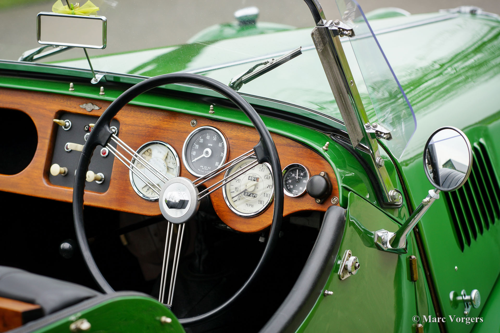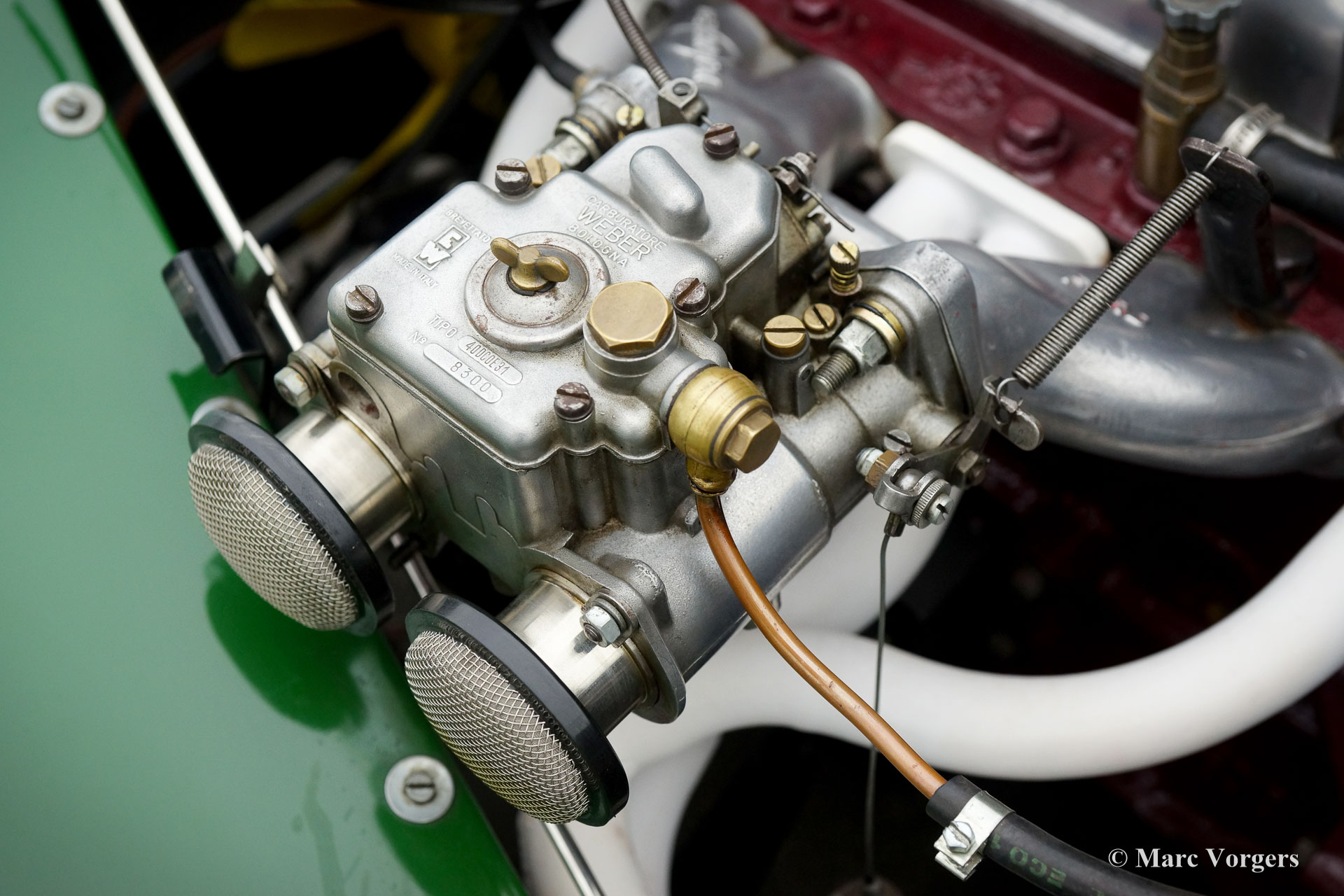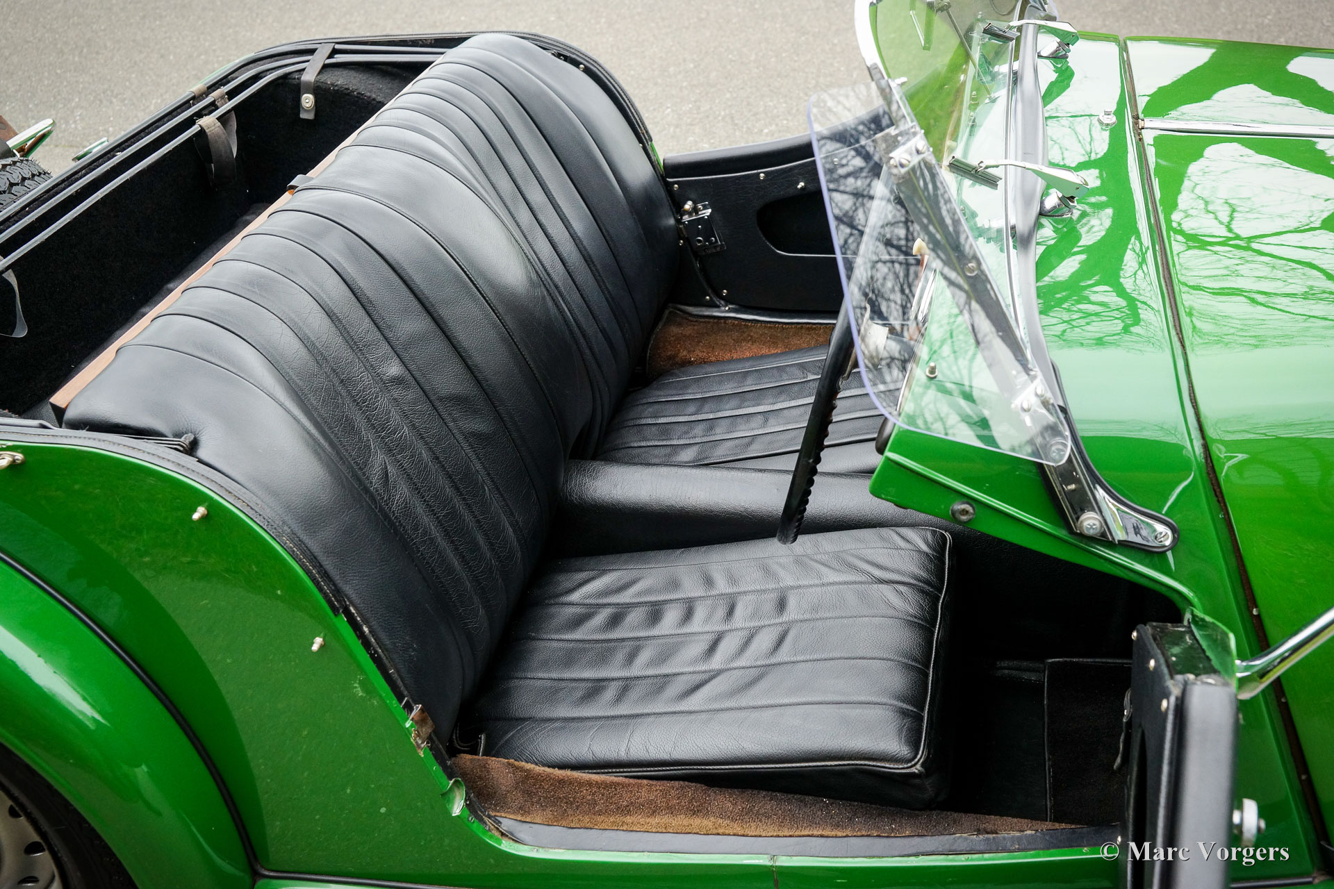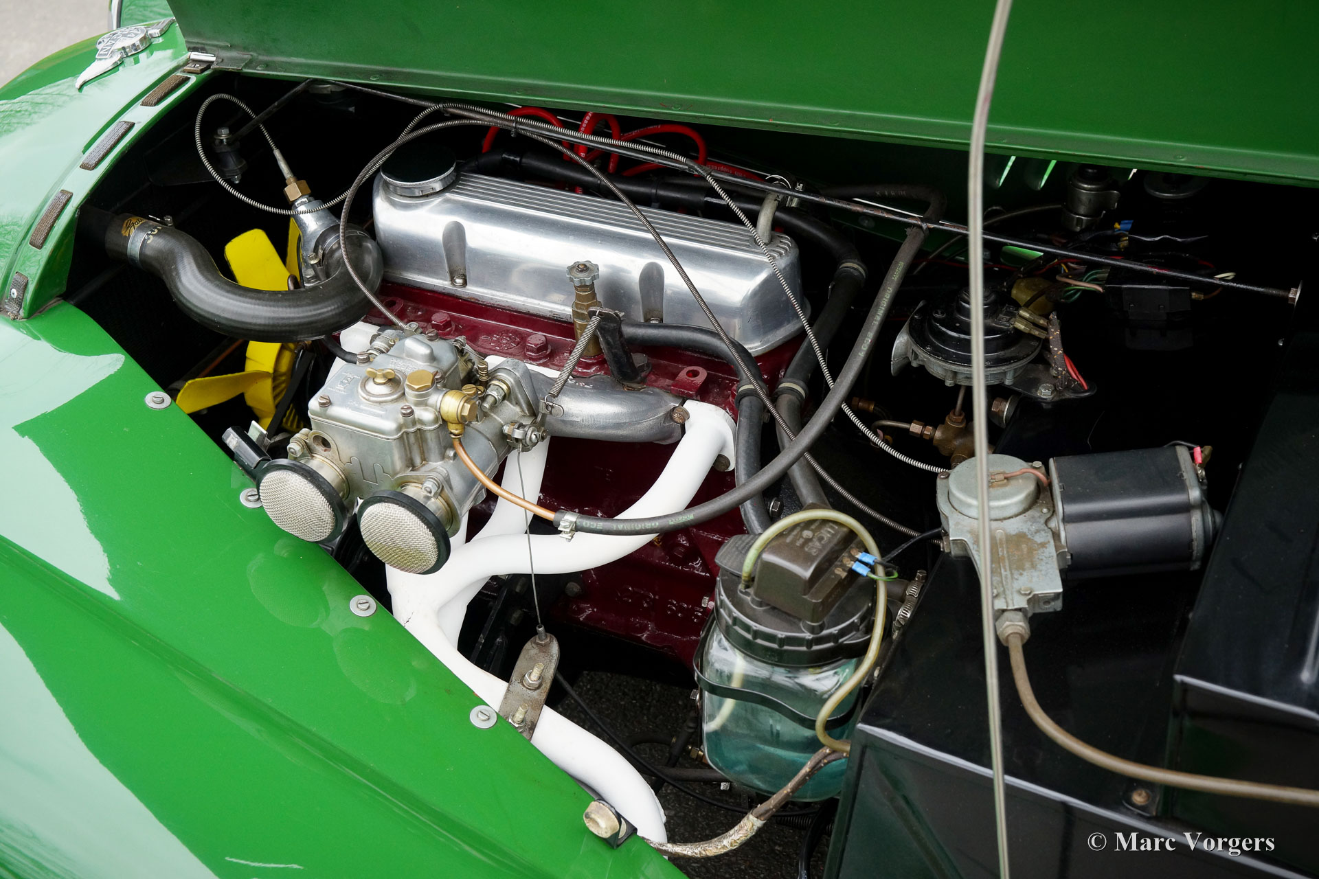 Morgan 4/4, jaar 1963. Kleur groen gecombineerd met een zwartlederen interieur, zwart tapijt, zwarte soft-top en een zwarte tonneau cover. Deze klassieke Morgan is voorzien van een prachtig gevormde bank die veel comfort biedt in deze pure Britse sportwagen. Deze prachtige Morgan 4/4 (serie IV) werd nieuw verkocht in Groot-Brittannië. Het is een zeldzaam model waarvan er slechts 209 met de hand zijn gebouwd. In 1975 is de auto naar Nederland geïmporteerd en opgeknapt. Oorspronkelijk was de auto voorzien van een 1340 cc Ford Consul viercilinder motor, de motor is vervangen door een 1500 cc motor van het type dat ook in de Morgan 4/4 serie V gebruikt wordt. Deze krachtige en betrouwbare motor is voorzien van een dubbele Weber carburateur en levert een gezonde 84 pk. Het vermogen wordt overgebracht op de achterwielen via een handgeschakelde vierversnellingsbak. In de jaren 2001-2004 is de auto uitvoerig en prachtig gerestaureerd naar topstaat. De auto (die origineel rood was) is daarbij gespoten in de huidige groene kleur. De restauratie is volledig gedocumenteerd met een fotoreportage en facturen. Het chassis is vernieuwd, evenals de kabelboom. Er werd een RVS uitlaat gemonteerd, een aluminium benzinetank en elektronische ontsteking. Ook werd er een toerenteller in het dashboard gemonteerd. De auto toont veel mooie originele details zoals de zeldzame 15 inch stalen velgen met chromen wieldoppen! Verder is aan de voorzijde een Lucas SFT mistlamp gemonteerd en aan de achterzijde een kofferrek. Deze rechtsgestuurde Morgan 4/4 is een schoonheid, en de auto rijdt en stuurt perfect! Een zeer begerenswaardig exemplaar!
