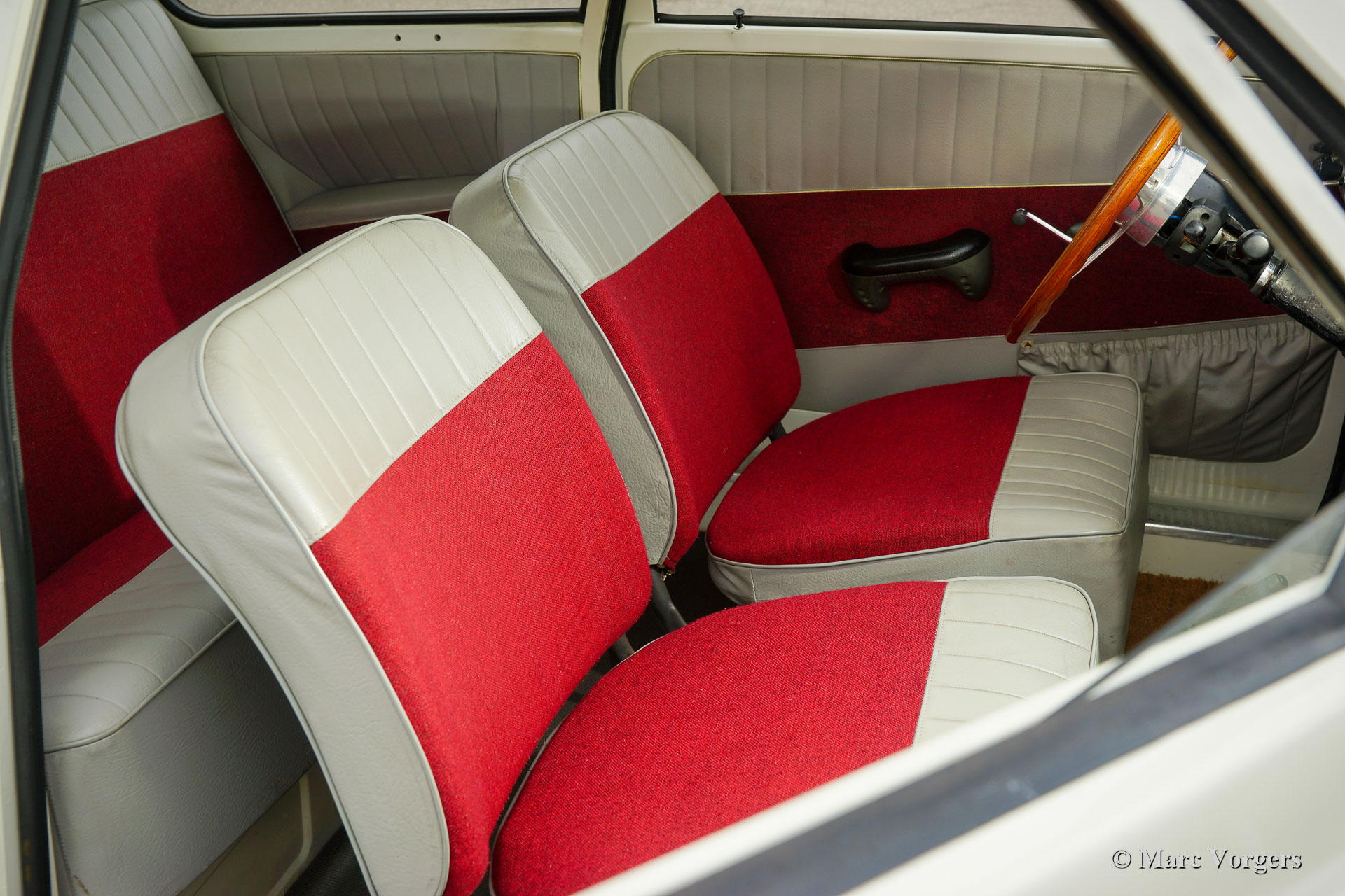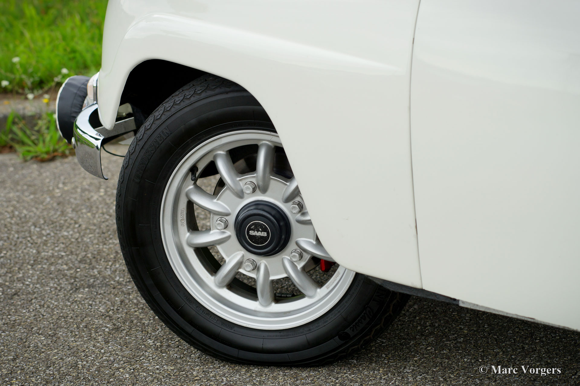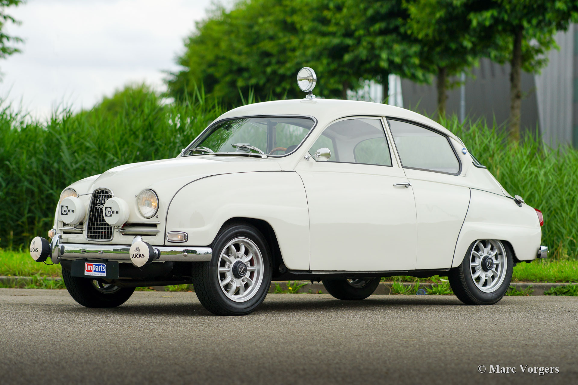 Saab 96 'tweetakt', jaar 1964. Kleur wit gecombineerd met een rood interieur. Deze fantastische Saab 96 is uitvoerig gerestaureerd en gereviseerd. De motor is gereviseerd met de juiste kwaliteitsonderdelen en deze loopt en klinkt perfect. De motor is de bekende 3-cilinder 850 cc tweetaktmotor die is gekoppeld aan een handgeschakelde vierversnellingsbak. Deze fijne Saab is uitgerust met prachtige ‘Minilite’ lichtmetalen velgen, schijfremmen aan de voorwielen, extra koplampen aan de voorkant, een rallyzoeklicht op het dak en een speciale sportuitlaat! Deze Saab heeft het dashboard met de ronde meters. Dit is een prachtige en sportieve Saab 96 in excellente conditie!