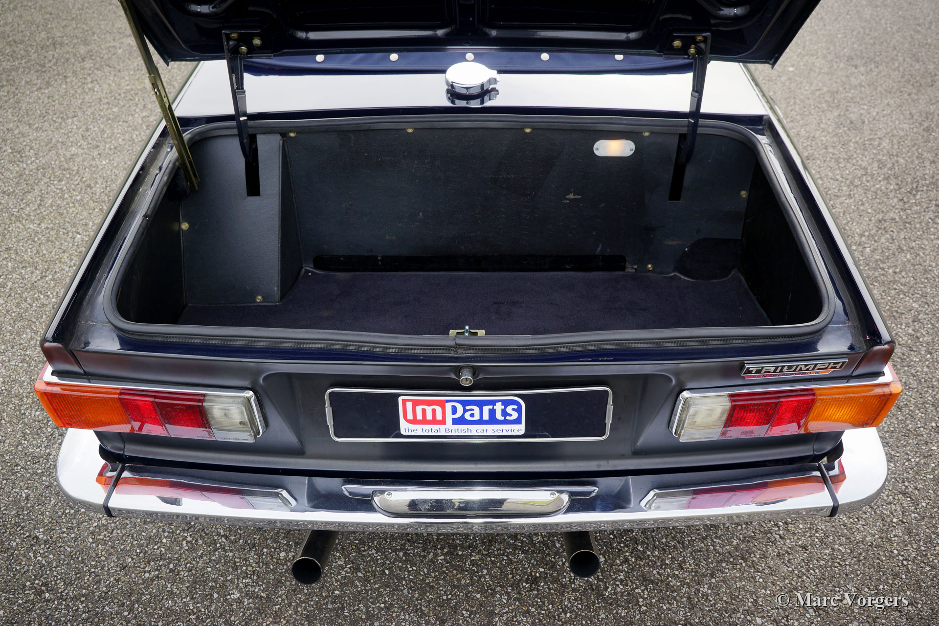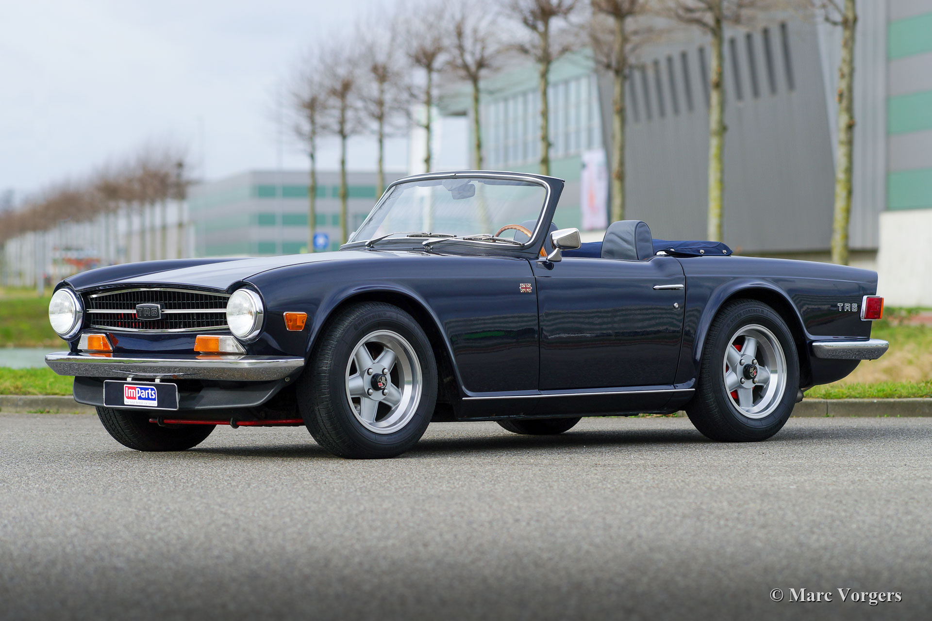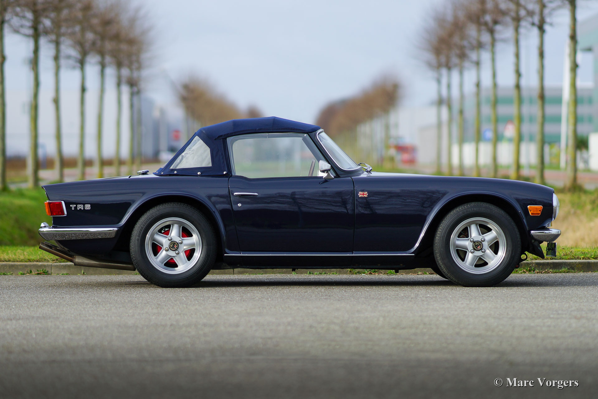 Triumph TR6 PI, jaar 1972. Kleur donkerblauw gecombineerd met een grijs lederen interieur. Blauwe mohair soft-top en hood-cover. Deze fantastische Triumph TR6 komt uit de eerste (CP) TR6 serie die is uitgerust met mechanische Lucas-injectie. De 2500 cc-zescilinder lijnmotor produceert 150 SAE pk en de het motor-/ uitlaatgeluid is verslavend! Deze TR6 PI is uitgerust met overdrive. De auto heeft enkele aanpassingen gekregen. De rijhoogte werd met 15 mm verlaagd en de auto werd uitgerust met: Een elektrische koelventilator, elektronische ontsteking, een roestvrijstalen uitlaat, ‘Revolution’ lichtmetalen wielen met 205/ 65-15 banden, lederen bekleding en een prachtig optioneel TR-sportstuur met een houten rand. Deze prachtige TR6 PI verkeert in excellente conditie en de auto rijdt fantastisch! Deze Triumph TR6 nodigt je elke dag uit voor een stevige rit over open wegen waarbij de adrenaline rijkelijk stroomt en waardoor de brede grijns op je gezicht blijvend is. Waarschuwing: Deze sportieve TR6 PI kan verslavend zijn!