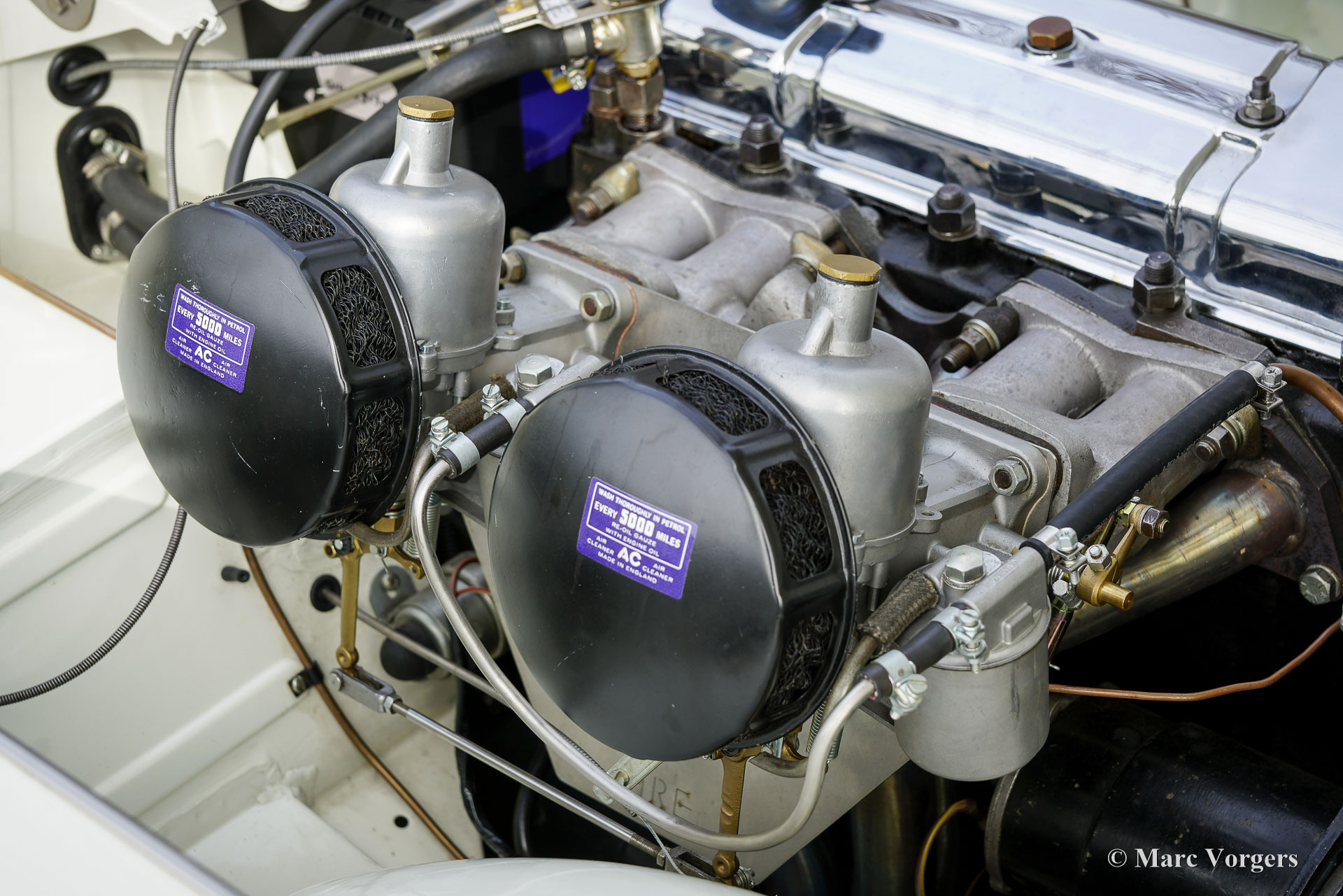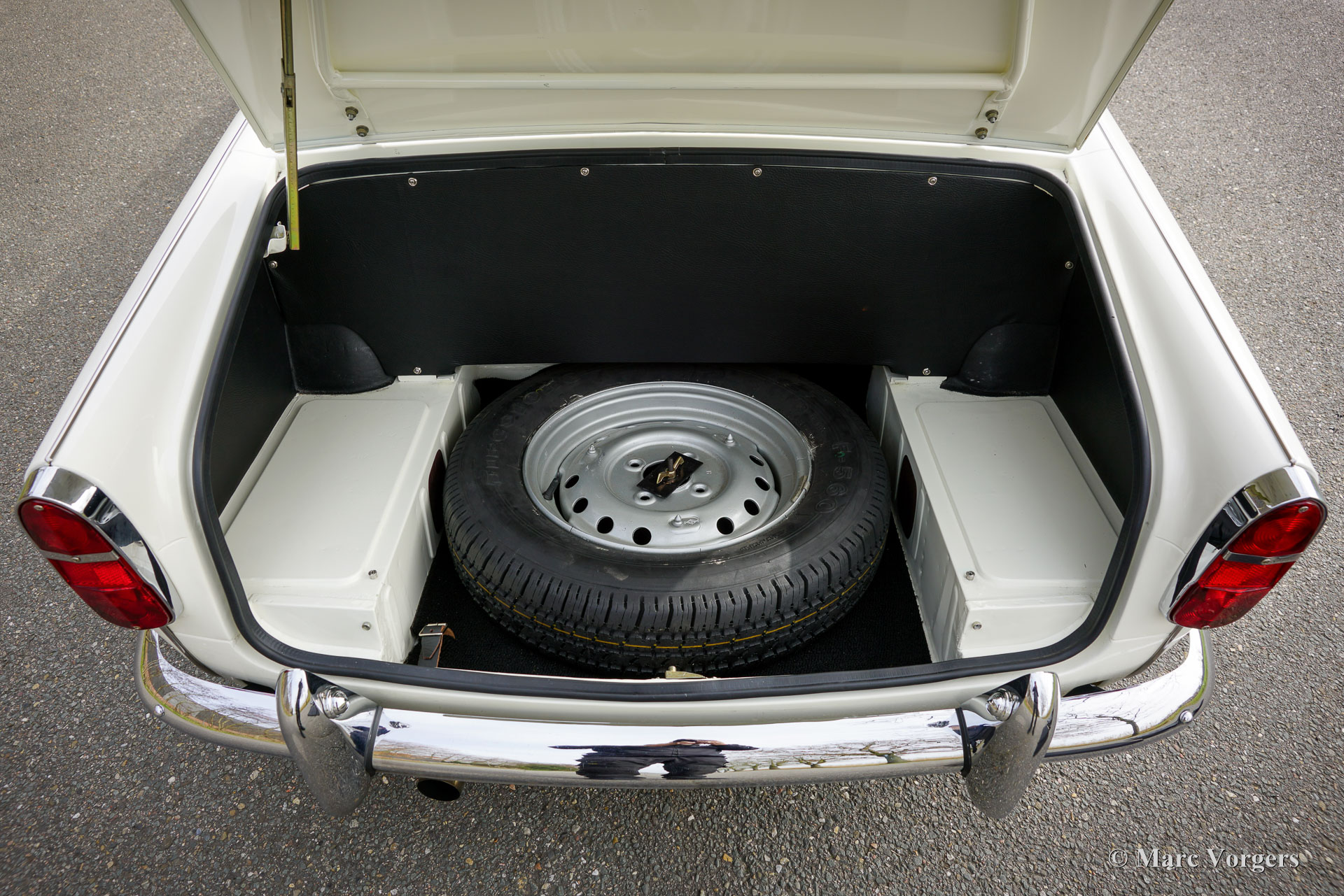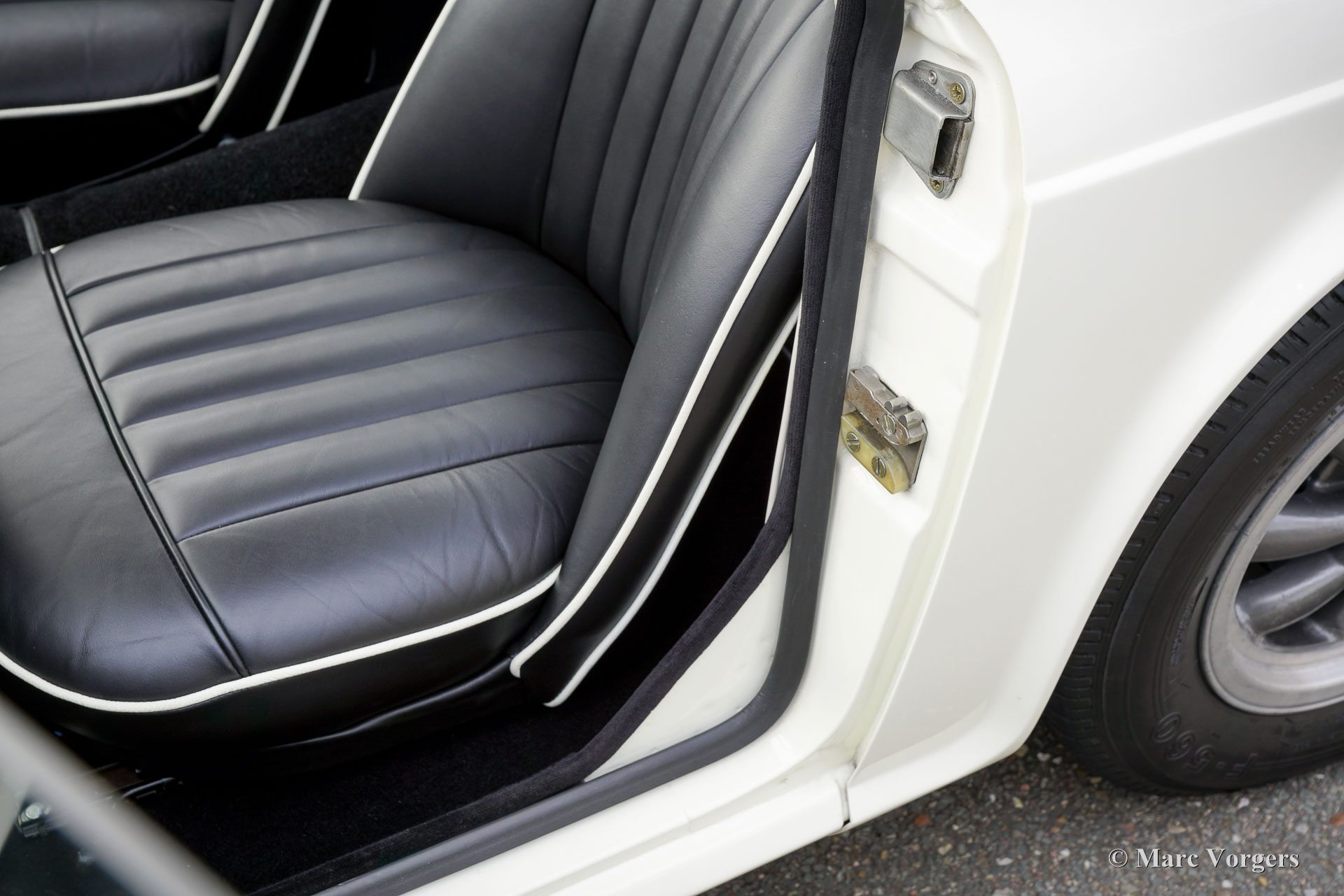 Triumph TR4, jaar 1963. Chassisnummer CT15447. Carrosserie uitgevoerd in wit (Spa White). Zwart interieur met zwarte lederen stoelen afgewerkt met witte biezen en zwarte vloerbedekking. Deze prachtige Triumph TR4 is de afgelopen jaren volledig en perfect gerestaureerd en gereviseerd. Sindsdien heeft de auto minder dan 1.000 kilometer gereden. Deze TR4 is voorzien van de originele motor, versnellingsbak, overdrive en overige aandrijfcomponenten; het is een ‘matching numbers’ auto. Dit fantastische exemplaar verkeert in een betere dan nieuwstaat. De carrosserie vertoont een perfecte passing van de panelen, het lakwerk is subliem, het chroom is vernieuwd en vlekkeloos, en het interieur is zorgvuldig gerestaureerd. Veel foto's van de restauratie en bijbehorende facturen zijn aanwezig in het historiedossier. Deze schitterende Triumph TR4 toont prachtige originele details, zoals het vroege gespoten dashboard en de originele luchtfilters op de SU-carburateurs. Het originele stuurwiel ligt in de kofferbak, momenteel vervangen door een Moto-Lita sportstuur met lederen rand. De upgrades omvatten een aluminium radiator met hoge capaciteit en een roestvrijstalen uitlaatsysteem. Deze TR4 is voorzien van twee zeer gewilde opties uit die tijd. Ten eerste een ‘Surrey Top’ compleet met het gemonteerde harde dakpaneel, dat kan worden vervangen door de opvouwbare vinyl soft-top die in de kofferbak is opgeborgen. De ‘Surrey Top’ inspireerde Porsche tot de creatie van de 911/912 Targa. Het voordeel is dat de ‘Surrey top’ volledig kan worden verwijderd, waardoor er in plaats daarvan een soft-top kan worden gemonteerd. Ten tweede is de auto uitgerust met schitterende lichtmetalen American Racing velgen met Firestone F560 165 R15 banden. American Racing velgen waren vooral te zien op TR4's die succesvol deelnamen aan de Amerikaanse SCCA E-Productie klasse, bestuurd door privécoureurs. De TR4 was nooit een door de fabriek ondersteunde auto in de VS, maar versloeg desondanks consequent auto's met meer fabriekssteun, waaronder de Porsche 356, Alfa Romeo Giulietta/Giulia, MGB en Sunbeam Alpine. Deze sportieve Triumph TR4, met zijn 2,2-liter viercilindermotor die meer dan 100 pk levert, brengt u direct terug naar de gouden tijd van het autorijden!