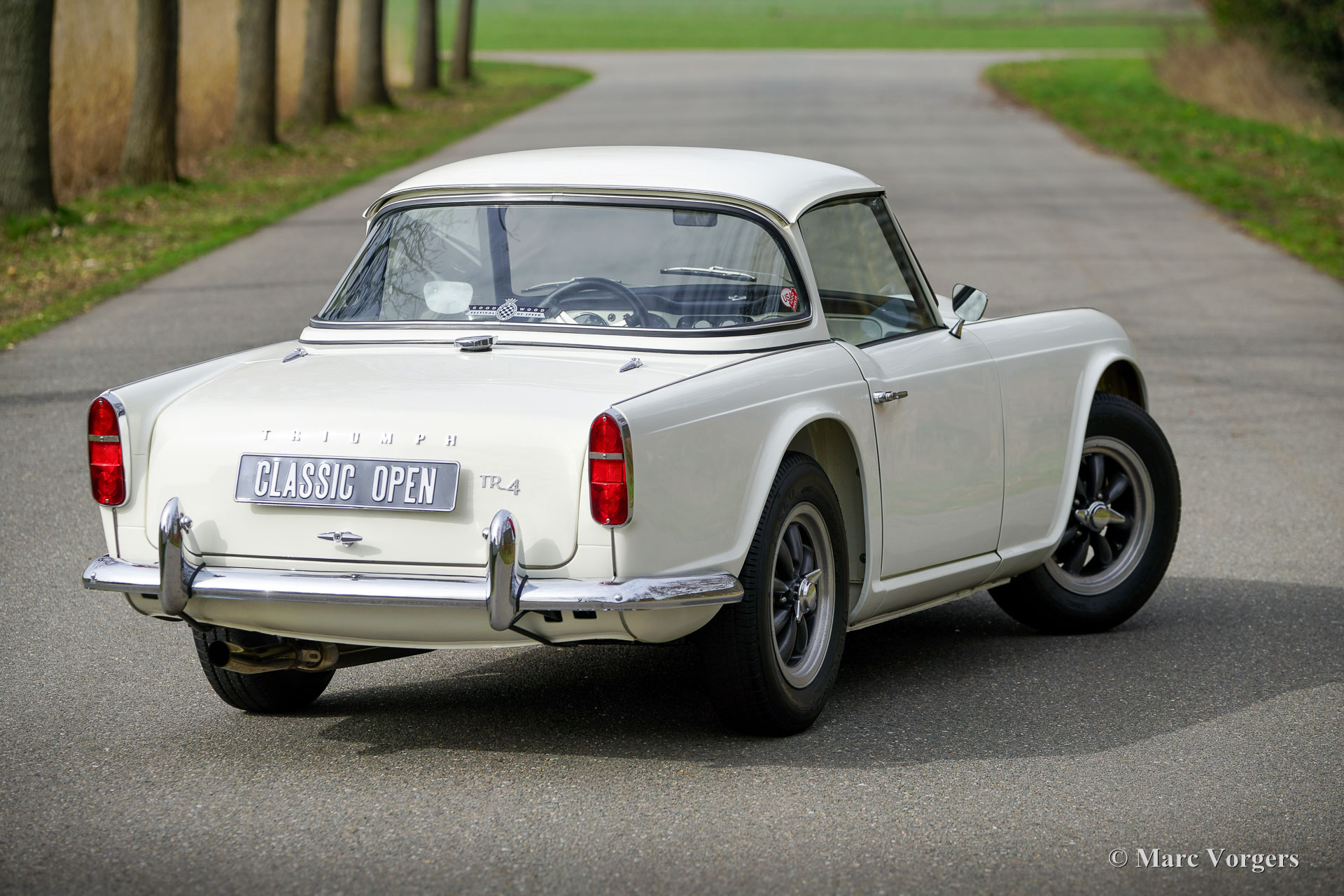 De Triumph TR 4 is de opvolger van de Triumph TR 3. Deze door Michelotti vormgegeven Triumph kwam in 1961 op de markt. De Triumph TR 4is een rasechte roadster zoals deze allen in Engeland gemaakt konden worden, recht door zee, puur en zeer sportief! De TR 4 beschikt over een stevig chassis, onafhankelijke voorwielophanging en een starre as achter. (De IRS versies beschikken over onafhankelijke wielophanging achter). Op de voorwielen zijn schijfremmen gemonteerd en op de achterwielen trommelremmen. Op de motorkap is een fraaie "powerbulge" te zien die plaats biedt aan de twee carburateurs. De TR 4 beschikt over een zeer fraai en overzichtelijk houten dashboard met grote, duidelijk afleesbare klokken dat klassieke sportiviteit ademt. Als accessoire is voor de TR 4 de zeer fraaie "Surrey-top" verkrijgbaar. Deze "Surrey-top" inspireerde Porsche tot het bouwen van haar "Targa" uitvoeringen.