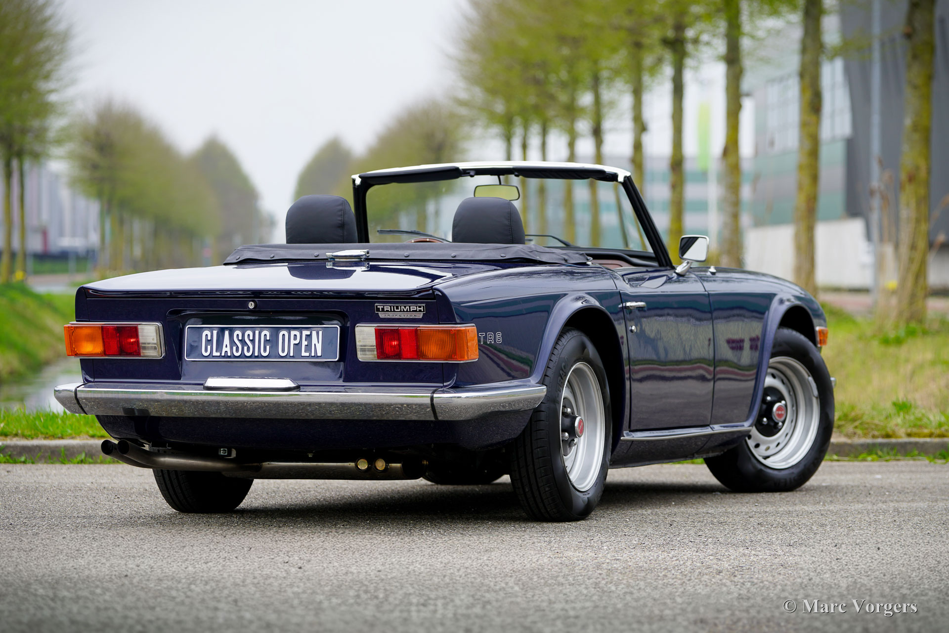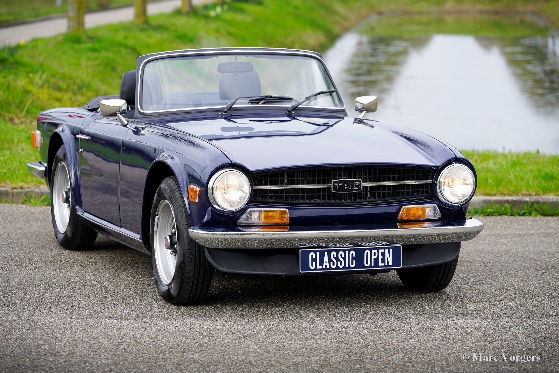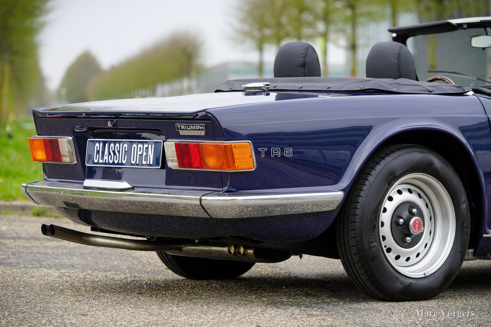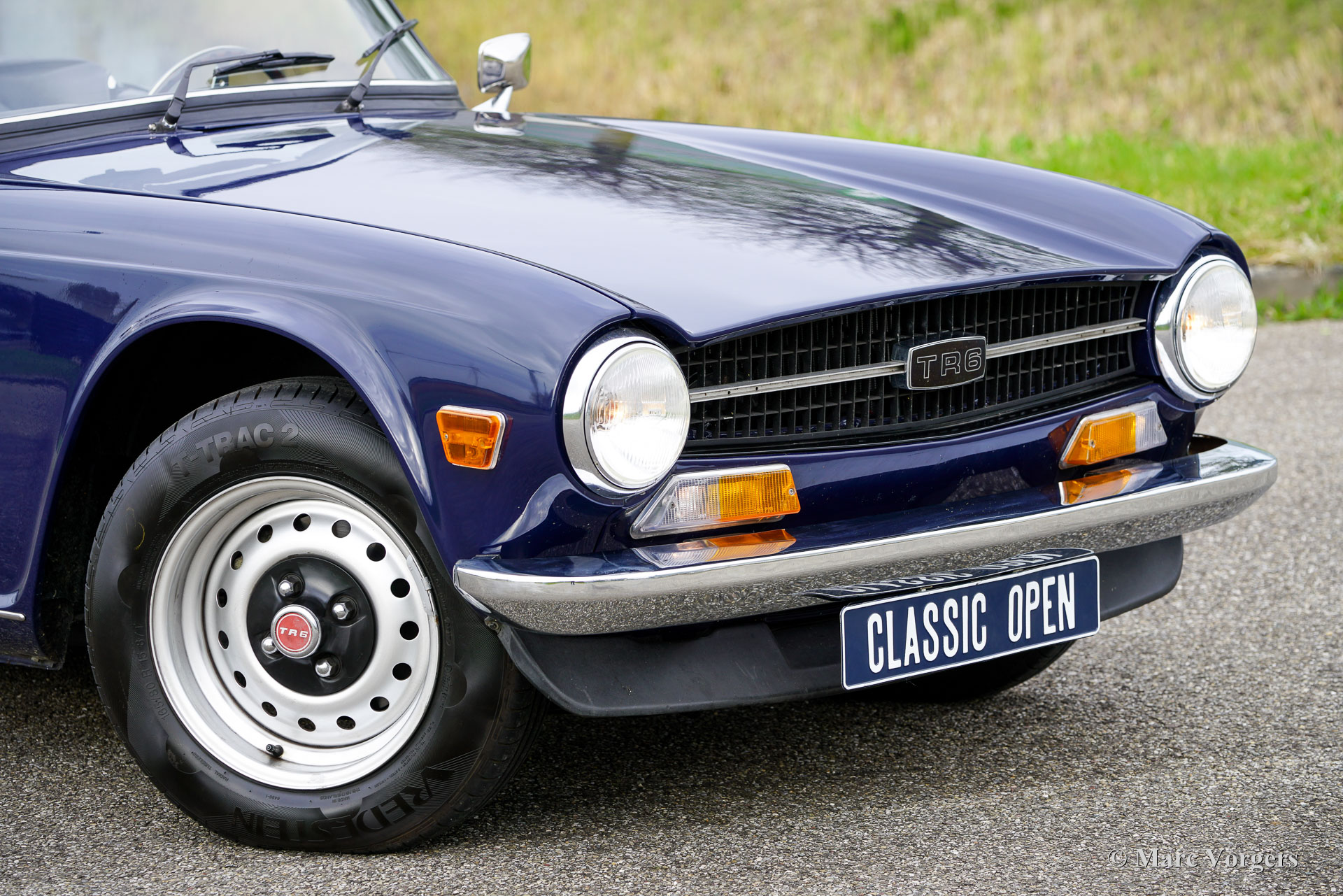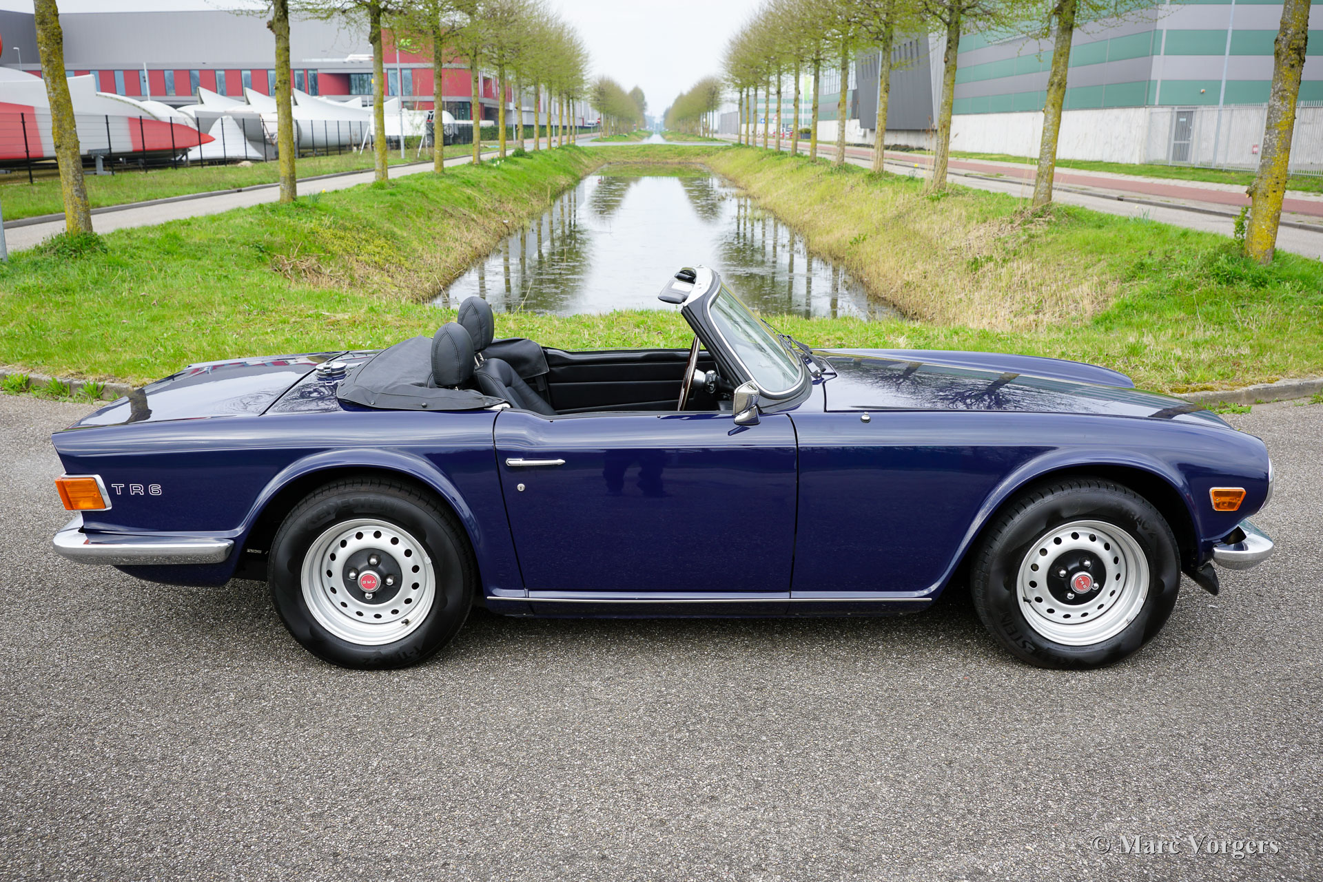 Triumph TR6 PI, jaar 1972. Chassisnummer 1CP53295LP. Exterieur uitgevoerd in donkerblauw, gecombineerd met een zwart interieur met zwarte lederen stoelen en zwarte vloerbedekking. Voorzien van een blauwe mohair soft-top en een zwarte vinyl afdekhoes. Dit is een zeldzame en gewilde Triumph TR6 PI met Europese specificaties, uitgerust met het mechanische Lucas benzine-injectiesysteem. Er werden slechts 5.333 exemplaren met het stuur links van dit type gebouwd, samen met 8.370 exemplaren met het stuur rechts voor de Britse markt. De TR6 PI en de eerdere TR5 - beide met dezelfde 2,5-liter motor en technische basis - zijn de meest opwindende modellen in het Triumph roadster-gamma. De 150 pk sterke zescilindermotor geeft de TR6 PI een uitgesproken sportief karakter, vergezeld van een geweldig uitlaatgeluid. Dit fraaie exemplaar is in het verleden gerestaureerd. De carrosserie is zowel vanbinnen als vanbuiten opnieuw gespoten en het interieur is opnieuw bekleed. De auto heeft aantrekkelijke originele details behouden, zoals de originele stalen velgen met zwarte wieldoppen en de interieurverlichting tussen de stoelen. De auto is voorzien van de volgende opties: overdrive, EZ elektrische stuurbekrachtiging, lederen comfortstoelen met hogere rugleuningen en hoofdsteunen, een dashboard van walnotenhout, twee verchroomde buitenspiegels, een Moto-Lita stuurwiel met houten rand, een aluminium radiator met hoge capaciteit, elektronische ontsteking en een roestvrijstalen uitlaatsysteem. De Triumph TR6 is het populairste model in de TR-reeks, waarbij de PI-versie het meest gewild is. Het is de laatste van de echt stoere Britse roadsters, met een zescilinder-lijnmotor onder een lange motorkap en een lage zitpositie vlak voor de achteras, waardoor de bestuurder een cockpitachtig, bijna gevechtspilootgevoel ervaart. Dit is een prachtige TR6 PI, aangeboden voor de prijs van een carburateurmodel... Deze is moeilijk te weerstaan!