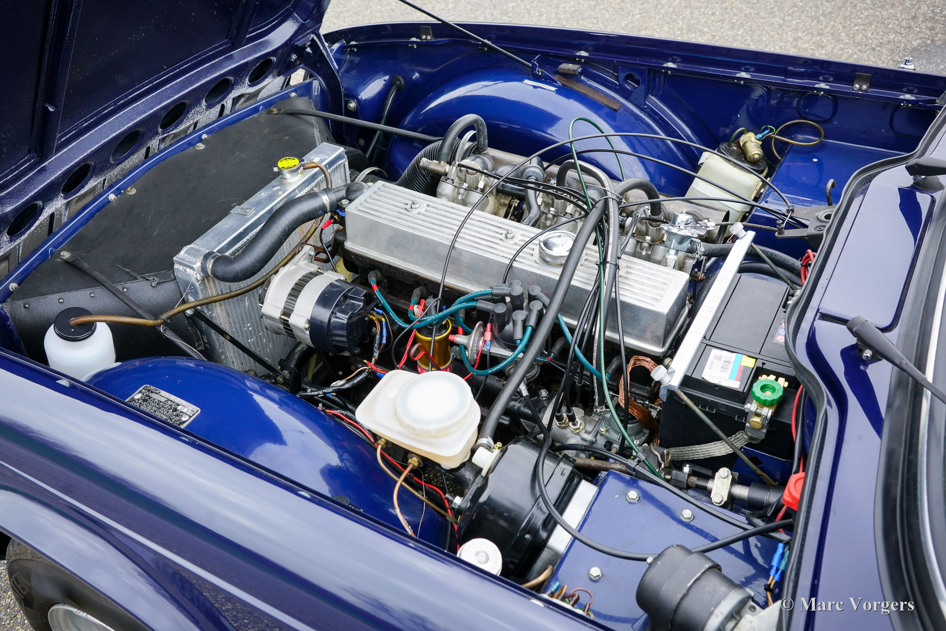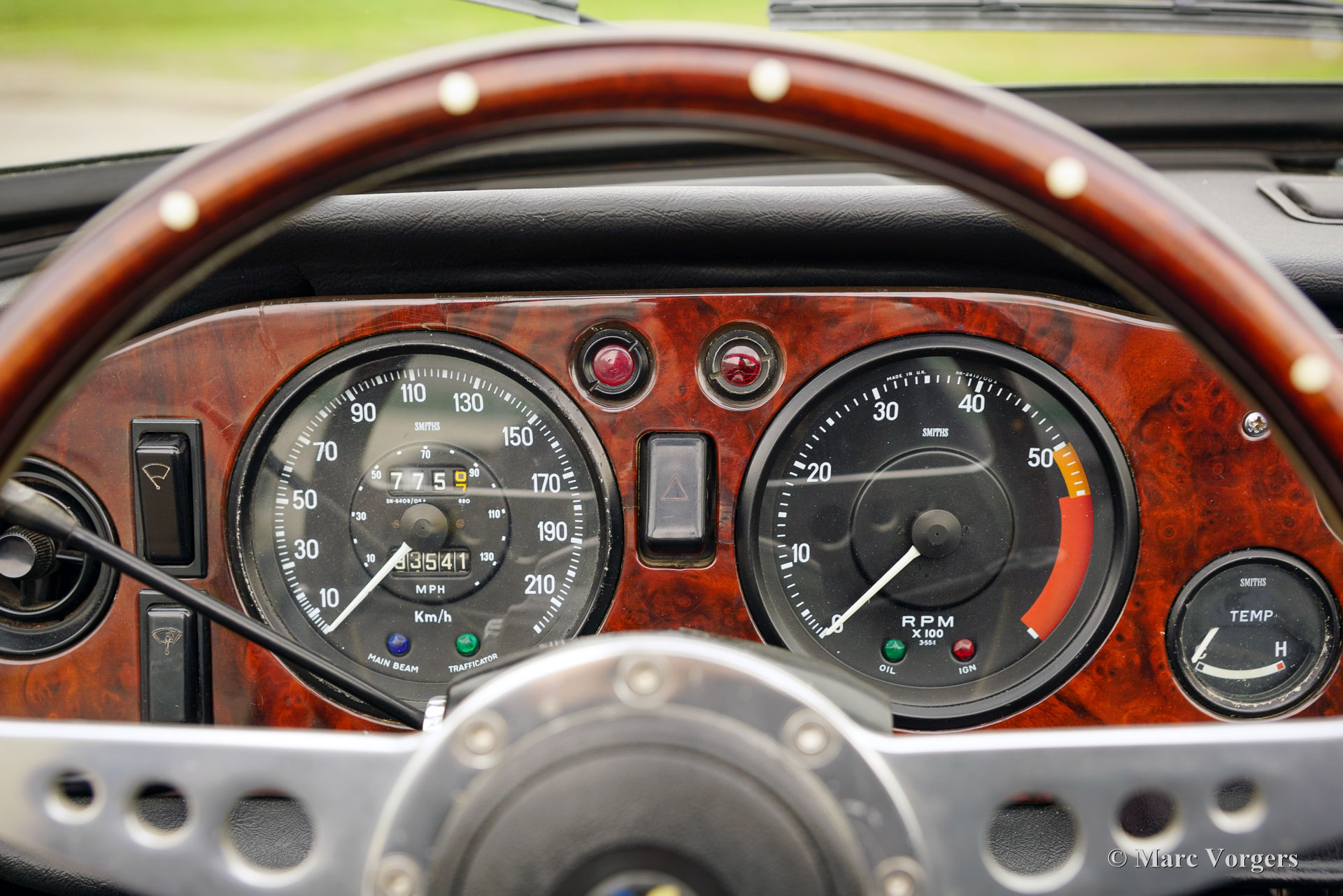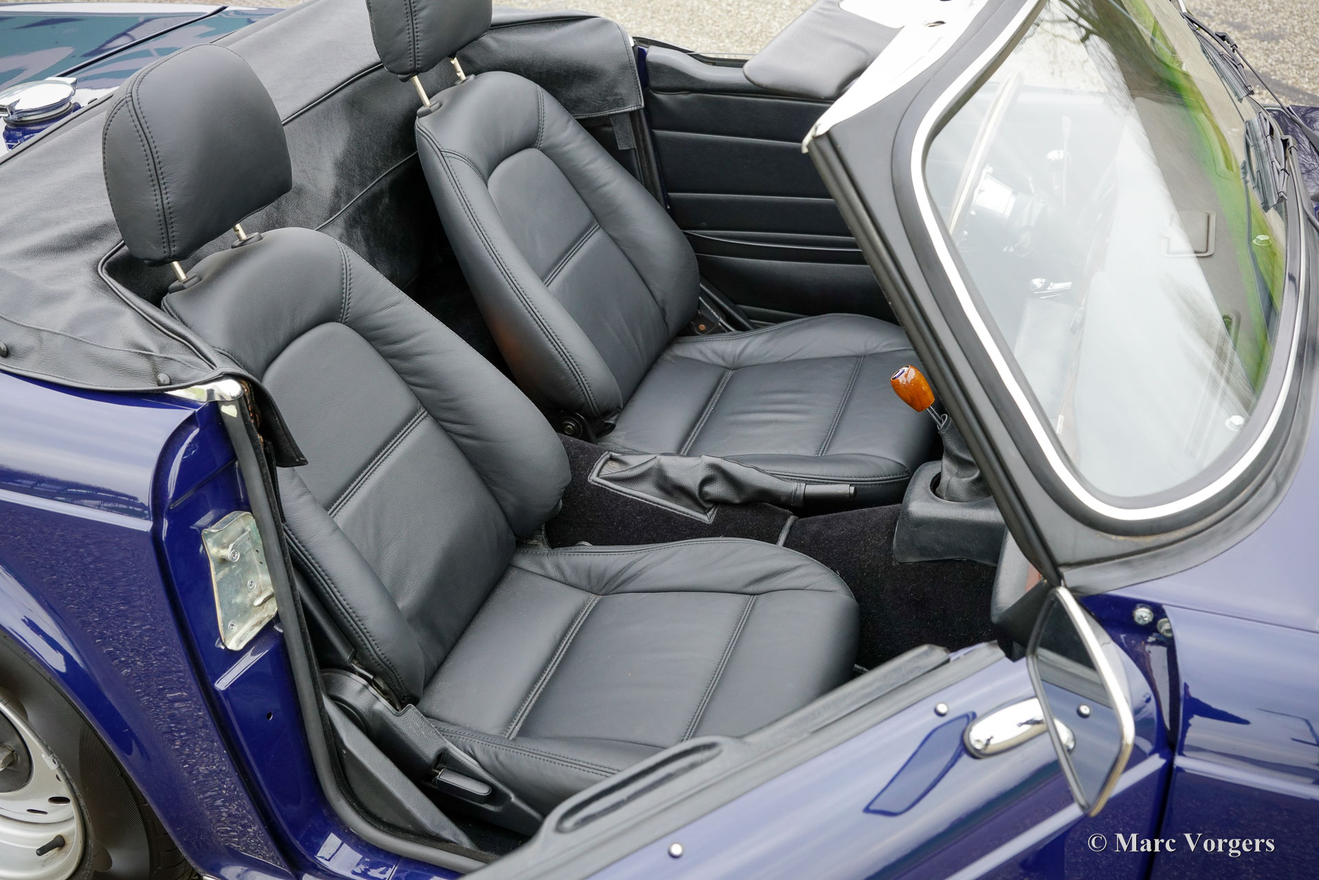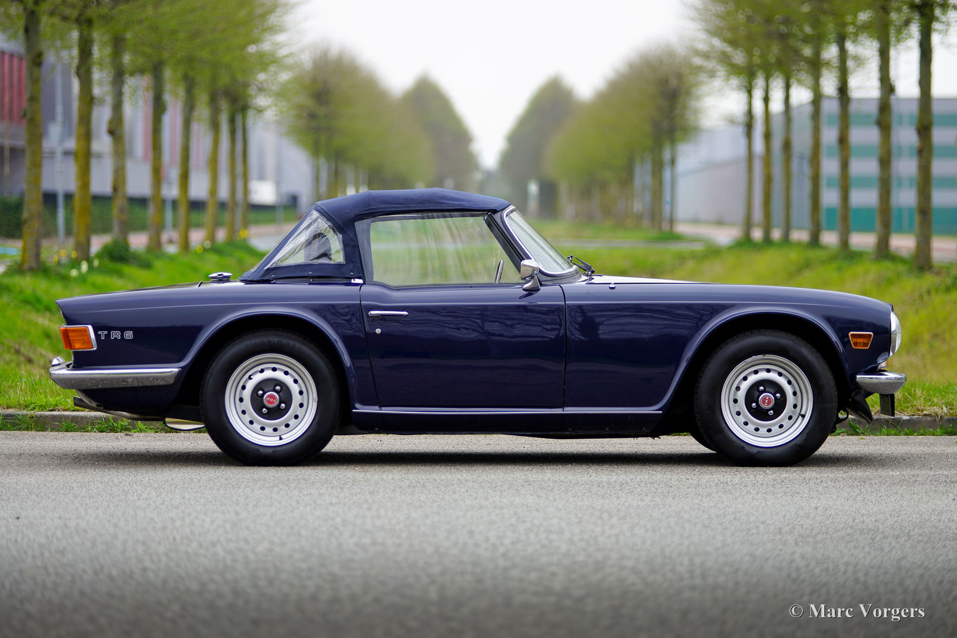 Triumph TR6 PI, jaar 1972. Chassisnummer 1CP53295LP. Exterieur uitgevoerd in donkerblauw, gecombineerd met een zwart interieur met zwarte lederen stoelen en zwarte vloerbedekking. Voorzien van een blauwe mohair soft-top en een zwarte vinyl afdekhoes. Dit is een zeldzame en gewilde Triumph TR6 PI met Europese specificaties, uitgerust met het mechanische Lucas benzine-injectiesysteem. Er werden slechts 5.333 exemplaren met het stuur links van dit type gebouwd, samen met 8.370 exemplaren met het stuur rechts voor de Britse markt. De TR6 PI en de eerdere TR5 - beide met dezelfde 2,5-liter motor en technische basis - zijn de meest opwindende modellen in het Triumph roadster-gamma. De 150 pk sterke zescilindermotor geeft de TR6 PI een uitgesproken sportief karakter, vergezeld van een geweldig uitlaatgeluid. Dit fraaie exemplaar is in het verleden gerestaureerd. De carrosserie is zowel vanbinnen als vanbuiten opnieuw gespoten en het interieur is opnieuw bekleed. De auto heeft aantrekkelijke originele details behouden, zoals de originele stalen velgen met zwarte wieldoppen en de interieurverlichting tussen de stoelen. De auto is voorzien van de volgende opties: overdrive, EZ elektrische stuurbekrachtiging, lederen comfortstoelen met hogere rugleuningen en hoofdsteunen, een dashboard van walnotenhout, twee verchroomde buitenspiegels, een Moto-Lita stuurwiel met houten rand, een aluminium radiator met hoge capaciteit, elektronische ontsteking en een roestvrijstalen uitlaatsysteem. De Triumph TR6 is het populairste model in de TR-reeks, waarbij de PI-versie het meest gewild is. Het is de laatste van de echt stoere Britse roadsters, met een zescilinder-lijnmotor onder een lange motorkap en een lage zitpositie vlak voor de achteras, waardoor de bestuurder een cockpitachtig, bijna gevechtspilootgevoel ervaart. Dit is een prachtige TR6 PI, aangeboden voor de prijs van een carburateurmodel... Deze is moeilijk te weerstaan!