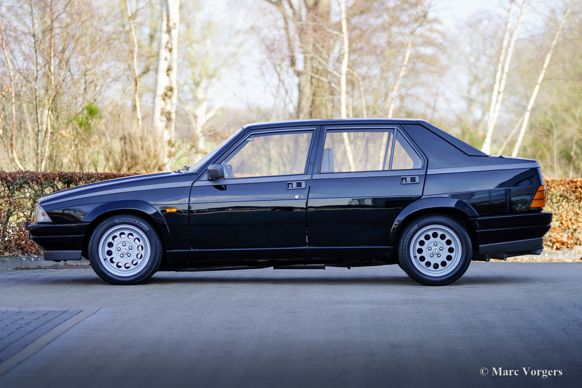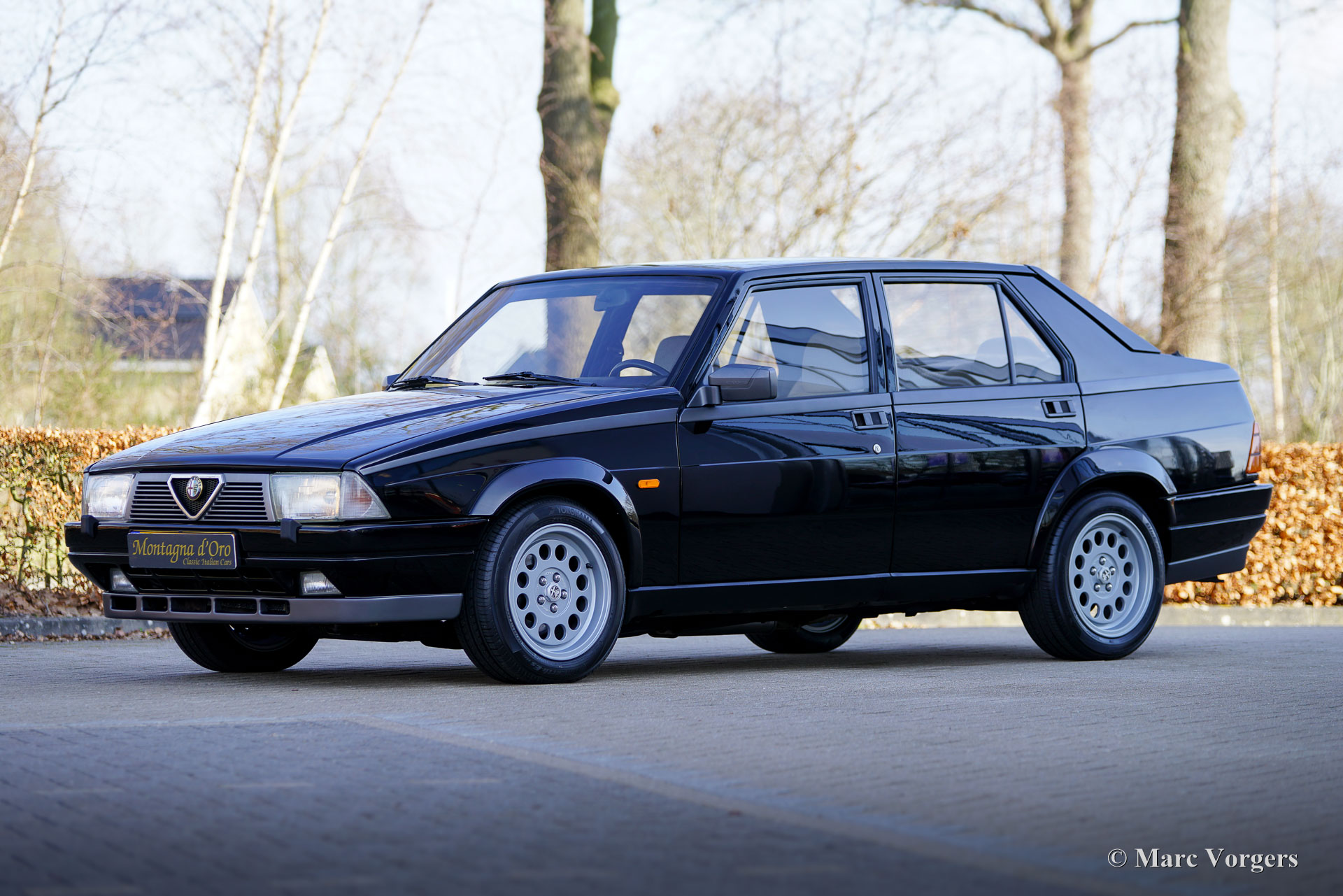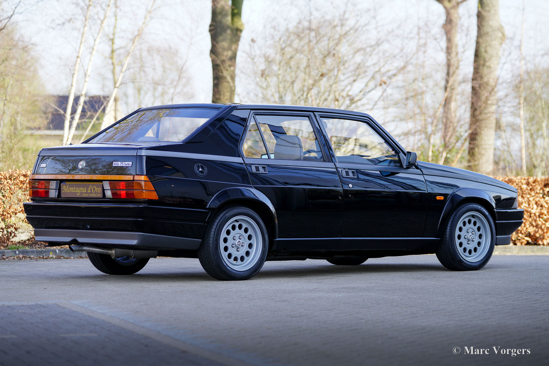 Alfa Romeo 75 1.8 Turbo, jaar 1986 (eerste registratie 1 januari 1986). Chassisnummer ZAR162B1000050918. Exterieur uitgevoerd in zwart (Nero AR 913) gecombineerd met een interieur in zwart, donkergrijs en lichtgrijs. De zo goed als nieuwe stoelen zijn bekleed met geruite stof (zeer lichtgrijs en donkergrijs) met donkergrijze lederen accenten op de zijsteunen van de voorstoelen. Deze schitterende Alfa Romeo 75 Turbo werd nieuw verkocht in Italië. Een zeer bijzondere optie is de af fabriek gemonteerde airconditioning! Enkele jaren geleden werd deze prachtige auto gerestaureerd en gereviseerd door het gerenommeerde Museo Fratelli Cozzi in Legnano, een voorstad van Milaan. Zij hebben de motor en de versnellingsbak gereviseerd en een prachtig nieuw interieur gemonteerd! In 2024 werd de auto geïmporteerd naar Nederland. Recentelijk is de lak geperfectioneerd en voorzien van een Labocosmetica glascoating, en zijn er nieuwe originele Ronal lichtmetalen velgen gemonteerd. Onderhoudsfacturen zijn aanwezig. Om deze zeldzame 75 Turbo verder te perfectioneren, hebben we originele nieuwe achterlichten en een reflectorbalk aangeschaft, die binnenkort gemonteerd zullen worden. Deze fantastische Alfa Romeo 75 1.8 Turbo heeft vanaf nieuw slechts 101.511 kilometer gereden. De auto verkeert in een verbluffende, bijna perfecte staat en rijdt als een nieuwe auto! Het zal moeilijk zijn om een ander exemplaar in deze onberispelijke conditie te vinden! De exacte productiecijfers van de Alfa Romeo 75 1.8 Turbo zijn niet bekend, maar Alfa Romeo moest minstens 5000 auto's bouwen om te voldoen aan de FIA-homologatie voor Groep A-toerwagens. Onder de motorkap bevindt zich de 1800 cc viercilinder-lijnmotor, met een Garrett T3-turbocompressor en intercooler, die 155 pk en 226 Nm koppel levert. De turbo gaf de 75 destijds vlotte prestaties, waaronder een topsnelheid van 210 km/u en een acceleratie van 0-100 km/u in 7,6 seconden (en dat is nog steeds heel rap met de zachte fluit van de Turbo in je oren!). Deze cijfers plaatsten de 75 Turbo stevig in de top van de compacte executive auto's van zijn tijd. Dit is uw kans om een Alfa Romeo 75 1.8 Turbo in bijna perfecte staat te bemachtigen, afkomstig van het gerenommeerde Museo Fratelli Cozzi!