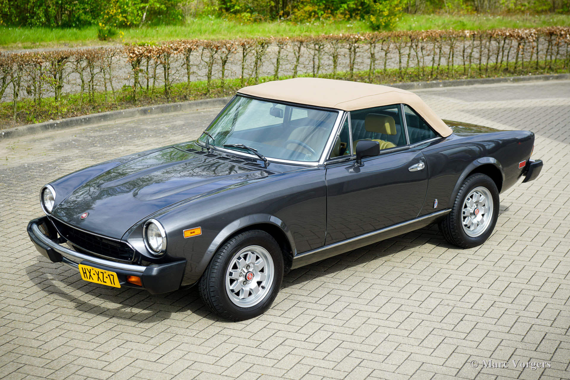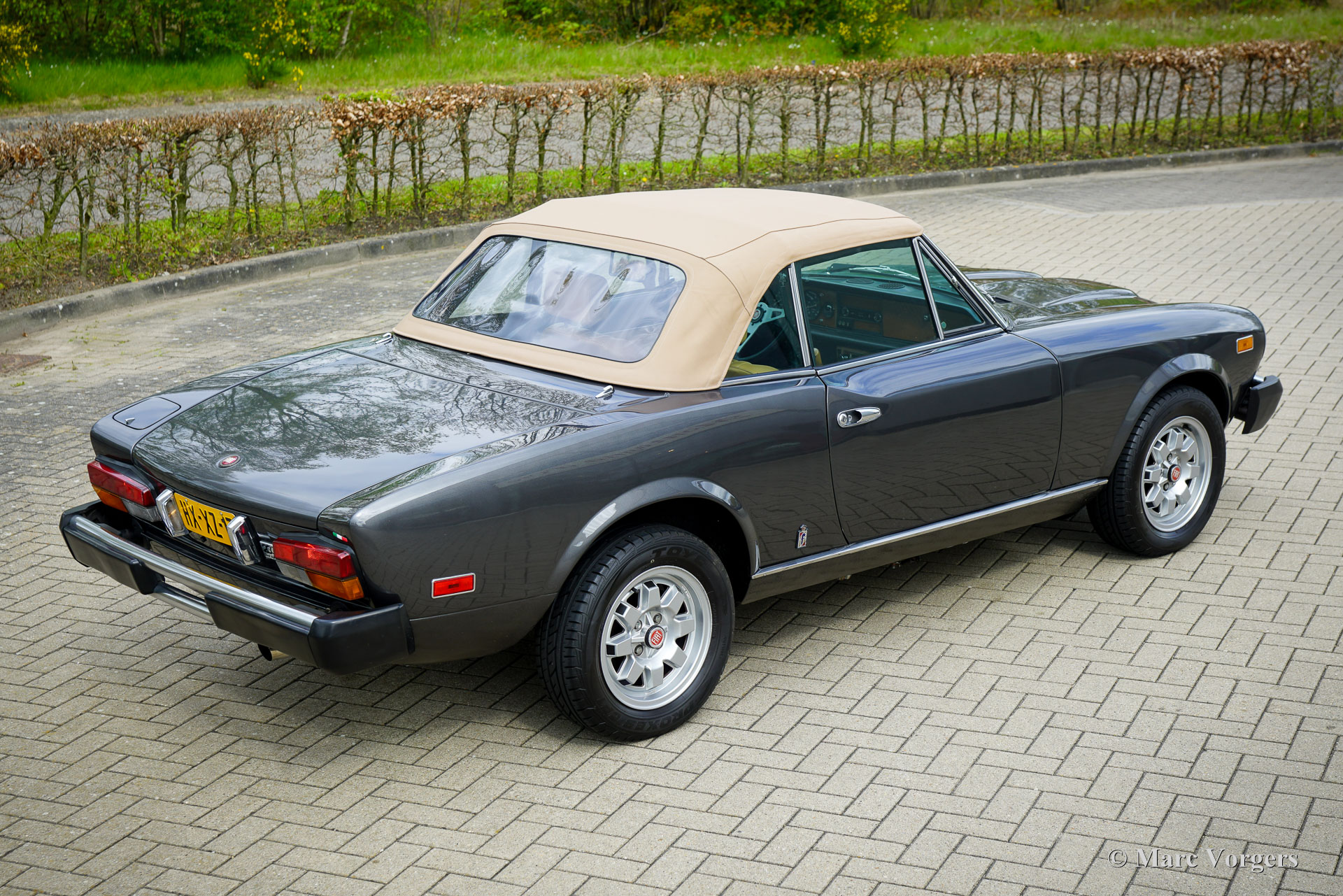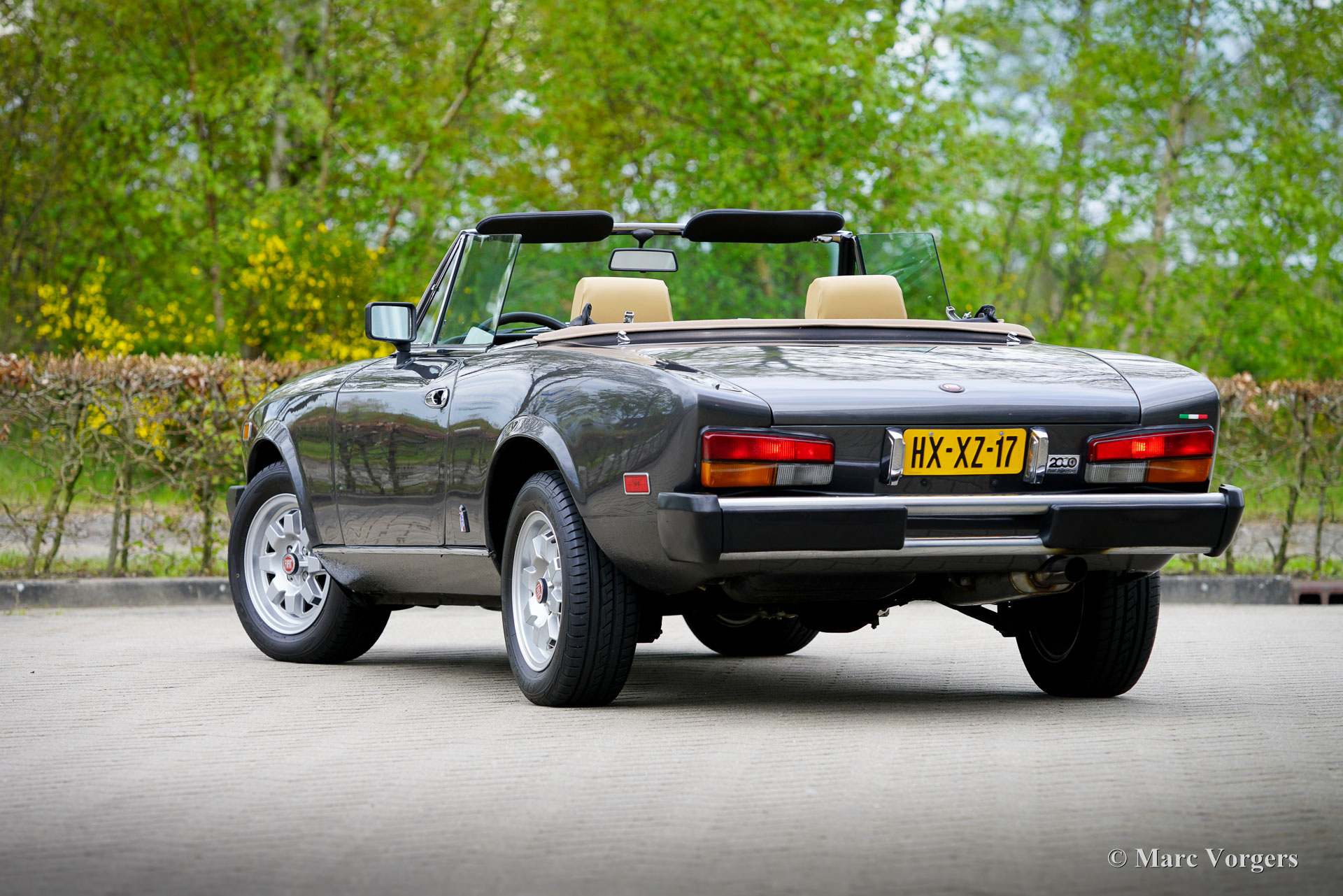 Fiat 124 Spider Turbo, jaar 1982 (eerste registratie 30 juni 1982). Chassisnummer ZFA124CS0*05003232, motornummer 124CS 4371507. Kleur donkergrijs metallic gecombineerd met een beige lederen interieur en zwart tapijt. In Nederland geregistreerd als Fiat 124 Spider 2000 USA, luidt de officiële Amerikaanse benaming Fiat Spider Turbo. De Fiat Spider Turbo was een speciaal model voor de Amerikaanse markt en werd in 1981 gepresenteerd. Volgens de ‘Hagerty Buyers Guide’ zijn er ongeveer 1200 exemplaren gebouwd door Fiat en aangepast door Legend Industries uit New York in 1981 en 1982. De Fiat Spider Turbo werd op de markt gebracht met hulp van de Formule 1-wereldkampioen van 1979 Jody Checkter. Hij prees de auto met de woorden: De Fiat Spider Turbo is de enige cabriolet sportwagen met turbo, een auto die zijn gelijke niet kent. Dit prachtige exemplaar werd in 1994 geïmporteerd uit de USA en wordt sinds 2006 gekoesterd door de huidige eigenaar. De auto werd uitvoerig gerestaureerd en gereviseerd. De carrosserie werd gerestaureerd en nieuw gespoten in de originele kleur, het interieur werd nieuw bekleed en de motor werd gereviseerd. De restauratie is zeer goed uitgevoerd en er is een logboek aanwezig met data en kilometerstanden. Vanaf nieuw heeft de auto 100.453 mijl gereden. Deze zeldzame en zeer begeerlijke Fiat Spider Turbo rijdt en stuurt perfect en is voorzien van, een speciale originele turboboostmeter in het dashboard, Cromodora lichtmetalen wielen en een Pianola AM radio. Een PDF van de officiële Amerikaanse verkoopbrochure is op aanvraag verkrijgbaar via e-mail. Dit betreft een zeer bijzondere Fiat 124 Spider Turbo in excellente conditie, een prachtige en zeldzame vondst voor de Fiat verzamelaar en liefhebber!
