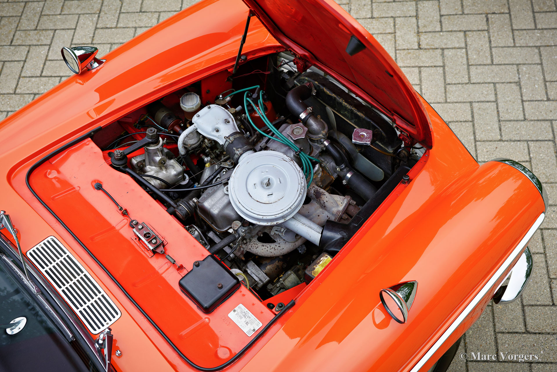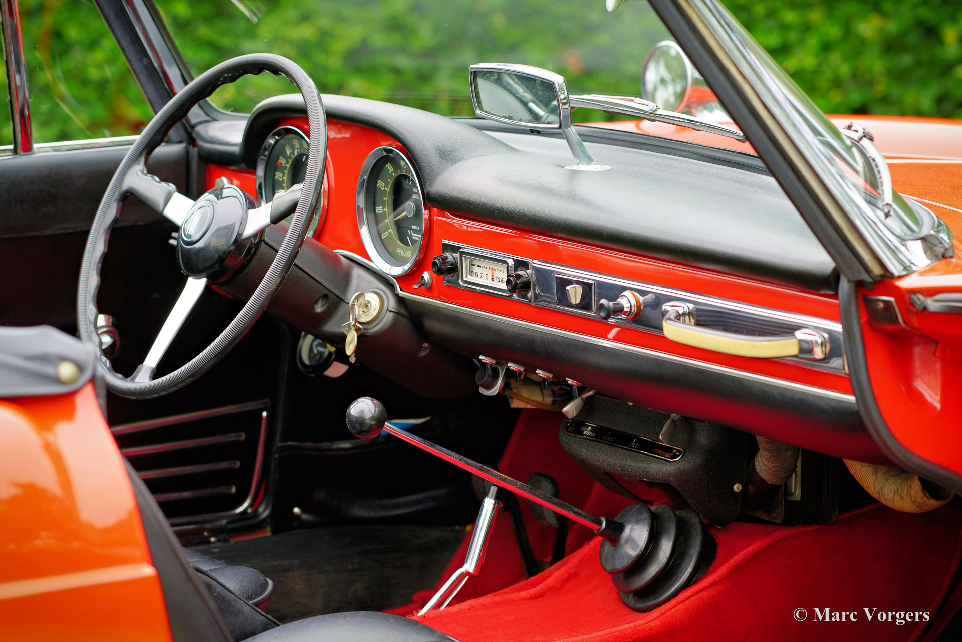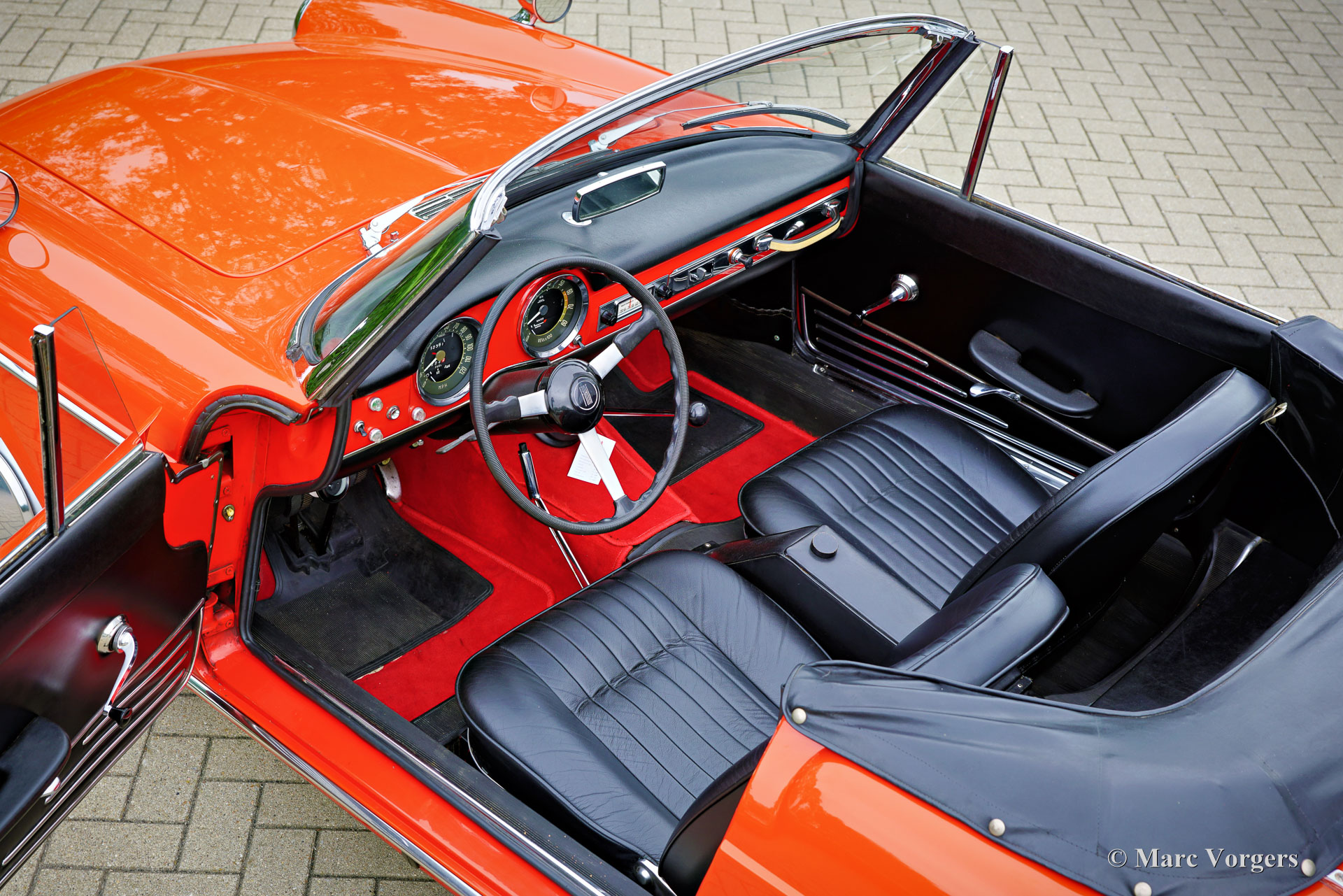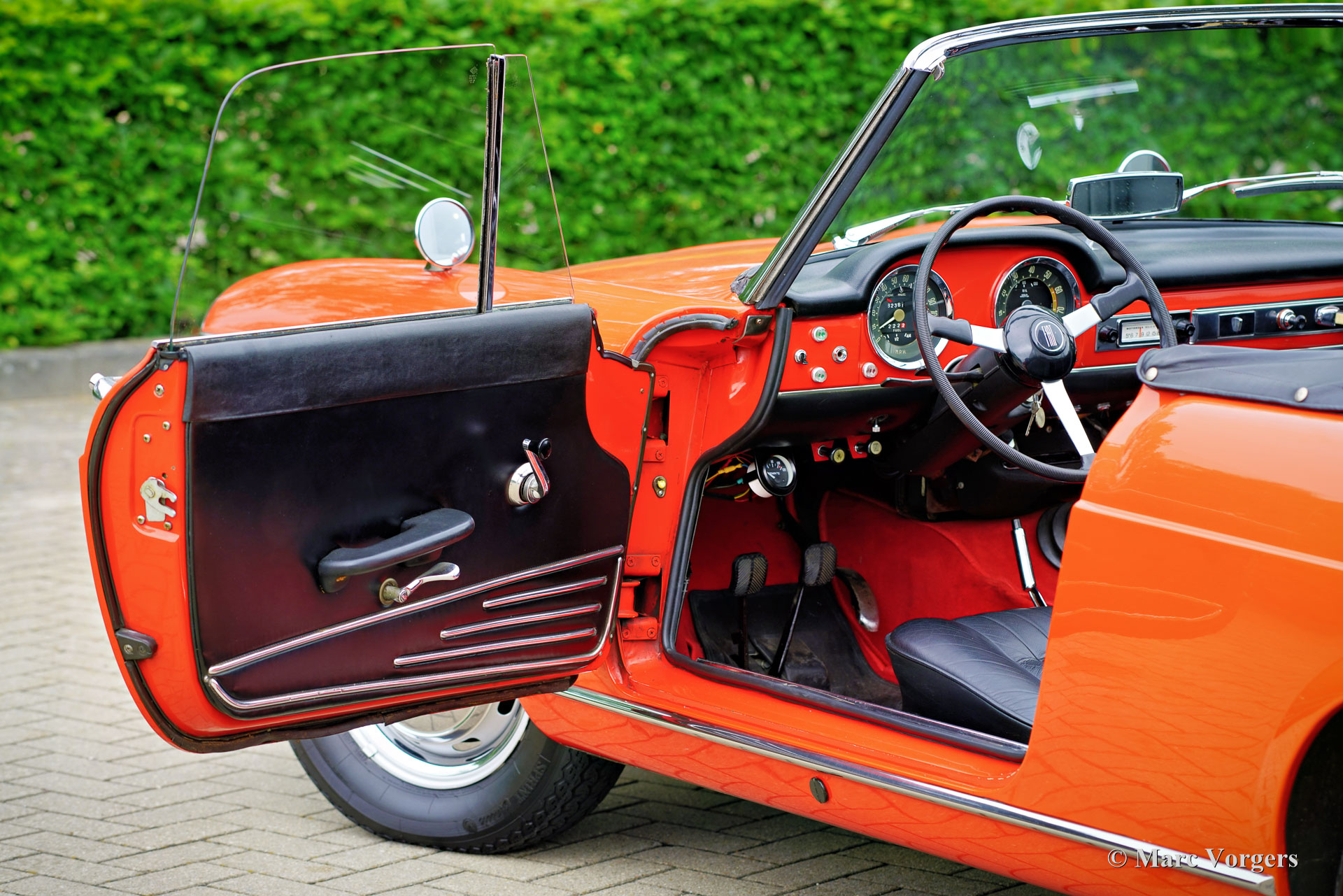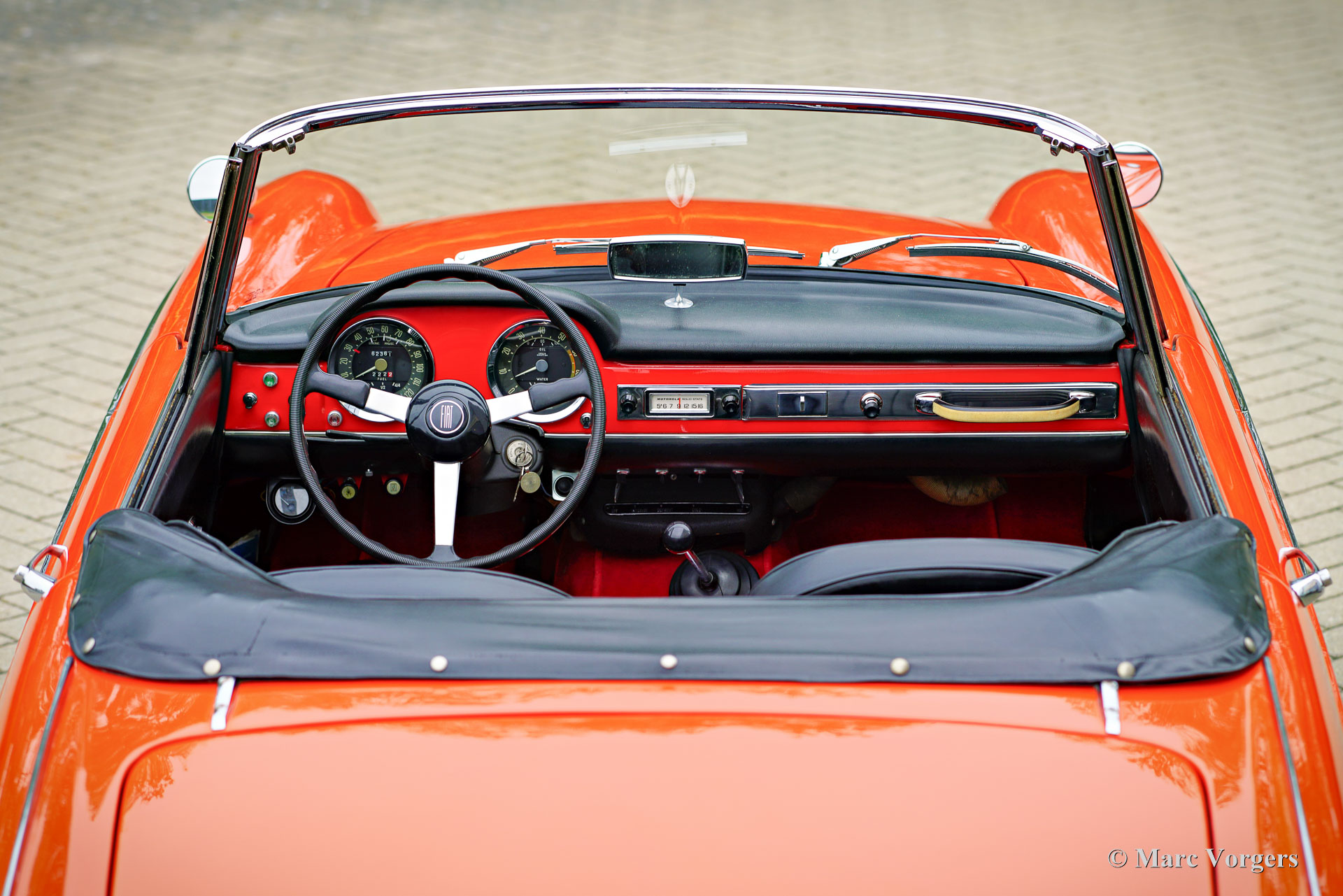 Fiat 1500 cabriolet, jaar 1966. Kleur oranjerood gecombineerd met een zwart interieur met zwartlederen stoelen en zwart tapijt. Zwarte soft-top, kapafdekking en een originele zwarte hard-top. De Fiat 1500 cabriolet is een prachtig ontwerp van Pininfarina, geïnspireerd op de lijnen van de Fiat OSCA 1500 GT uit 1958. De 1500 cabriolet is een zeer stijlvolle Italiaanse cabriolet die door alle voorbijgangers op straat wordt bewonderd. Dit zeer goede exemplaar toont alle originele details, de kilometerteller geeft 63.500 kilometer aan. Deze Fiat cabriolet is nieuw verkocht in de VS en in 2007 geïmporteerd in Nederland. Een originele Amerikaanse verkoopflyer is nog bij de auto, evenals een gebruikershandleiding en technische/onderhoudsboeken. Deze Fiat verkeert in een zeer goede en zeer originele staat. De auto is nooit gerestaureerd en in het verleden alleen opnieuw gespoten. Tijdens de taxatie werd de lakdikte rondom gemeten tussen de 150-200 mu. De Fiat 1500 is een heerlijke toercabriolet die voldoende comfort, snelheid en ruimte biedt voor twee personen tijdens een Europese vakantiereis over mooie wegen! De Fiat is voorzien van een vijfversnellingsbak, een Amerikaanse Motorola AM-radio en de auto wordt geleverd met de originele hard-top. Deze Fiat 1500 cabriolet is een begeerlijke rijdersauto om volop van te genieten!