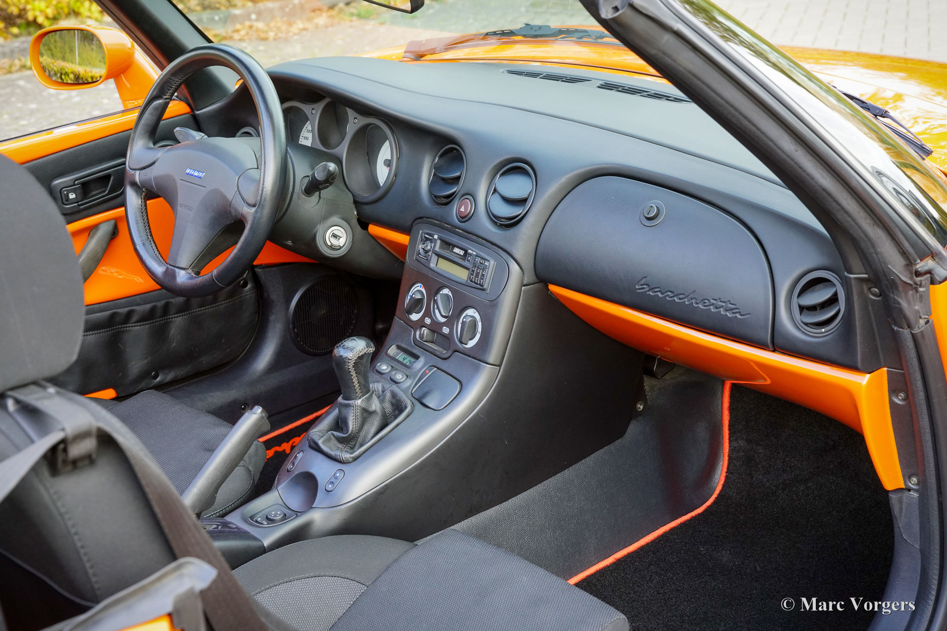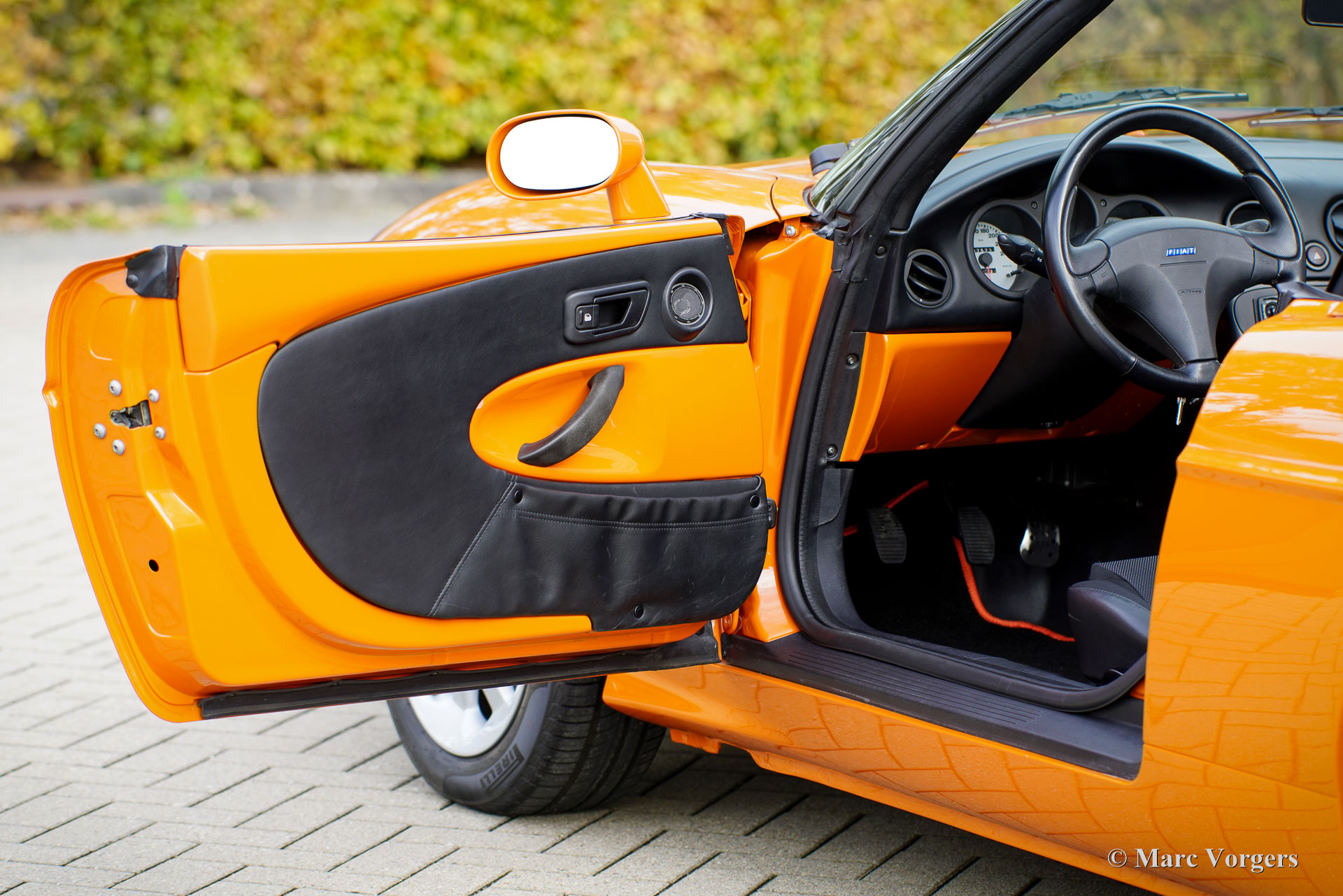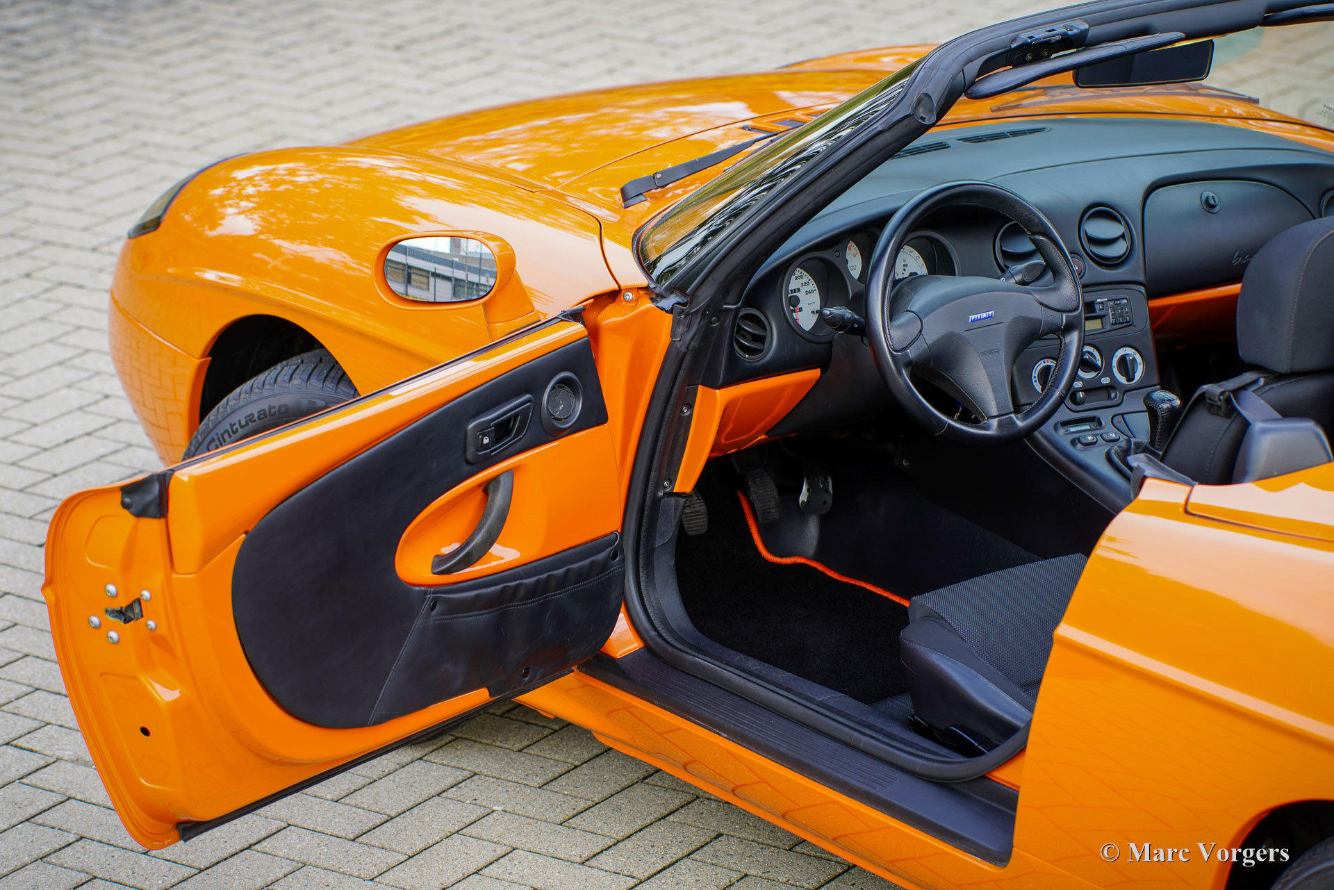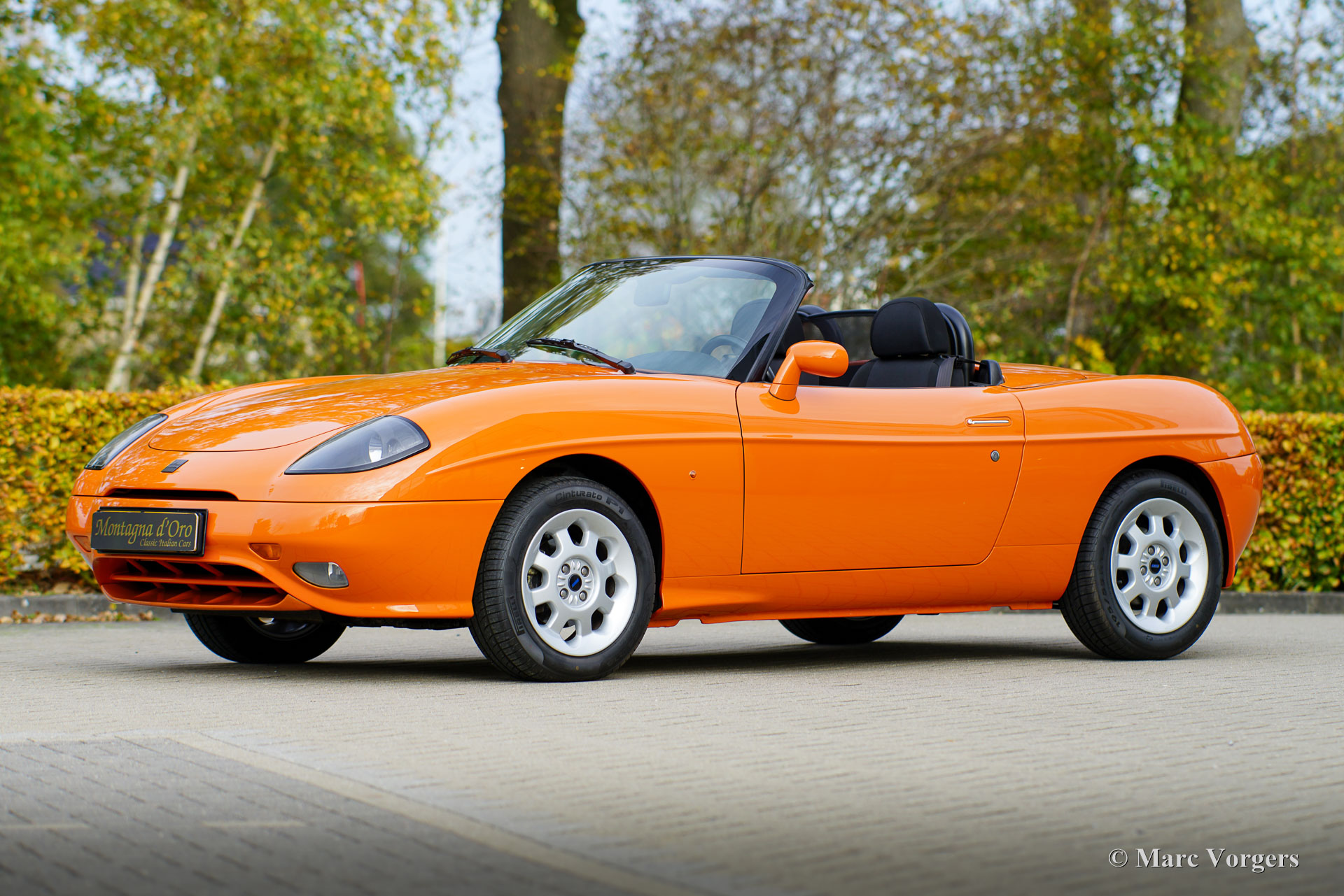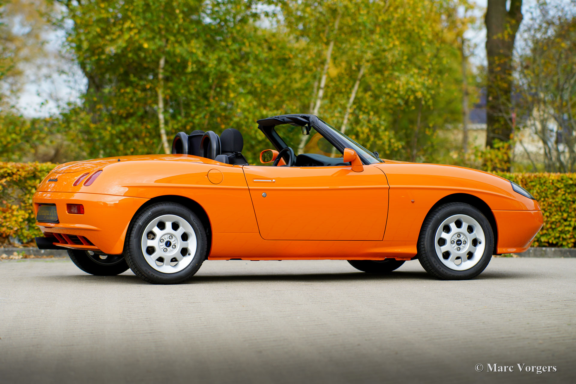 Fiat Barchetta ‘Black Edition’, bouwjaar 2000 (eerste registratie 20 mei 2000). Chassisnummer ZFA183000*00047225*, motornummer 60586932. Carrosseriekleur oranje (Arancio Victoria 570) gecombineerd met een zwart/antraciet stoffen/lederen interieur en zwart tapijt met oranje afwerking. Zwarte vinyl soft-top en een hard-top in carrosseriekleur. Deze prachtige Fiat Barchetta ‘Black Edition’ is nieuw in Nederland verkocht door Autohuis Ede van Wirdum. Vanaf dag één is de auto gekoesterd door drie opeenvolgende eigenaren en de auto heeft 87.574 kilometer gereden. Ontworpen door Andreas Zapatinas bij Fiat’s Centro Stile en geïntroduceerd in 1995, is de Fiat Barchetta een compacte sportieve Italiaanse roadster in de geest van de lichtgewicht Italiaanse sportwagens. De naam Barchetta betekent ‘kleine boot’. De auto is gebaseerd op het Fiat Punto-platform en is uitgerust met een 131 pk sterke 1800 cc viercilindermotor, gekoppeld aan een handgeschakelde vijfversnellingsbak die de voorwielen aandrijft. Deze ‘Black Edition’ auto is voorzien van een speciaal optiepakket bestaande uit contrasterende (zwarte) interieurbekleding op de portieren en matten, zwarte rolbeugels, een zwart frontlogo, lichtmetalen velgen en een geüpgraded Fiat audiosysteem met RDS en cd-speler. Dit prachtige exemplaar is in het verleden professioneel overgespoten; de auto ziet eruit en voelt werkelijk als nieuw! De onderhoudshistorie is volledig bekend en gedocumenteerd. Het onderhoudsboekje is tot aan de laatste onderhoudsbeurt bij 87.062 kilometer stipt ingevuld en afgestempeld. Dit schitterende exemplaar wordt compleet geleverd met een hard-top en een originele Fiat autohoes. Een zeer begeerlijke ‘modern classic’!