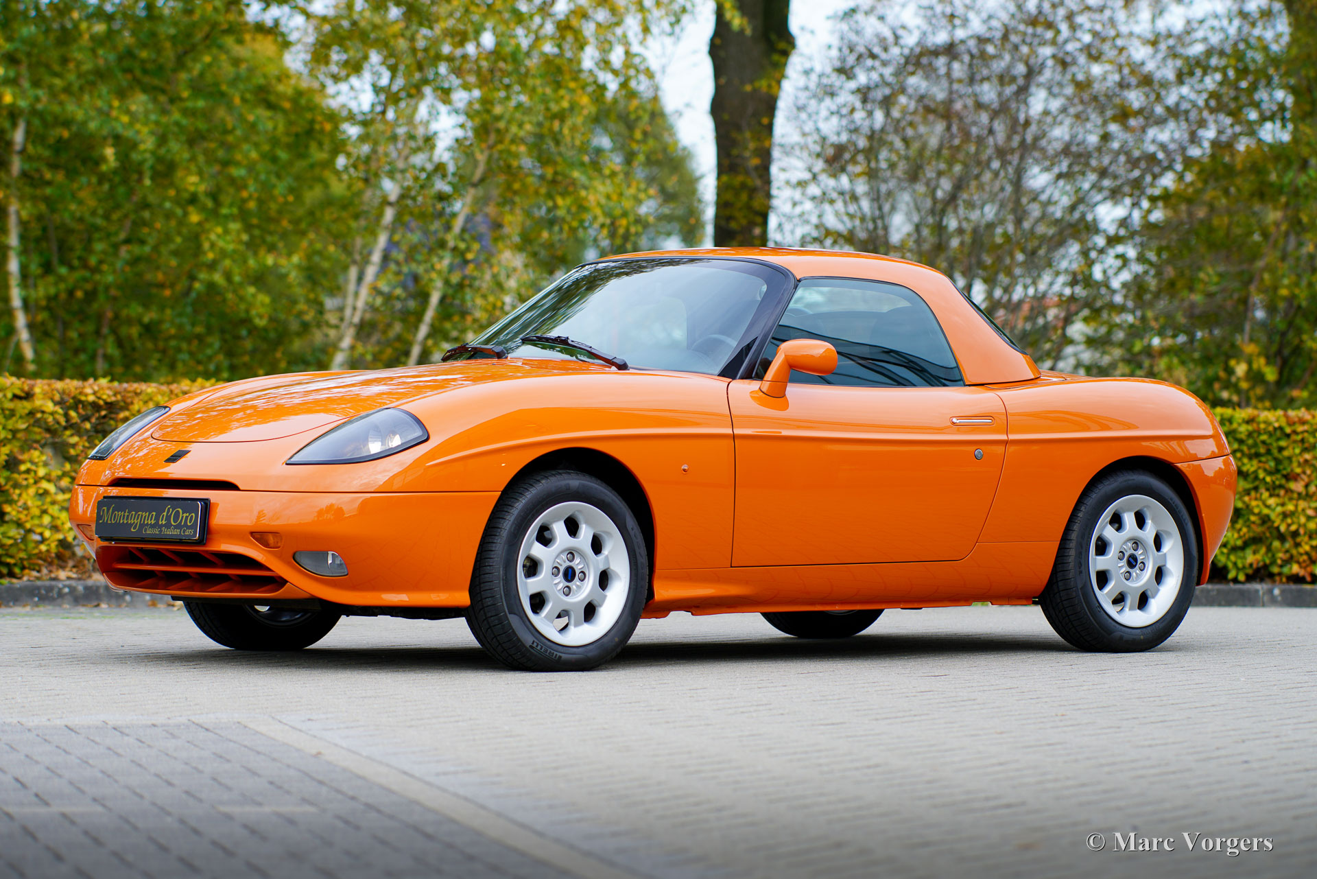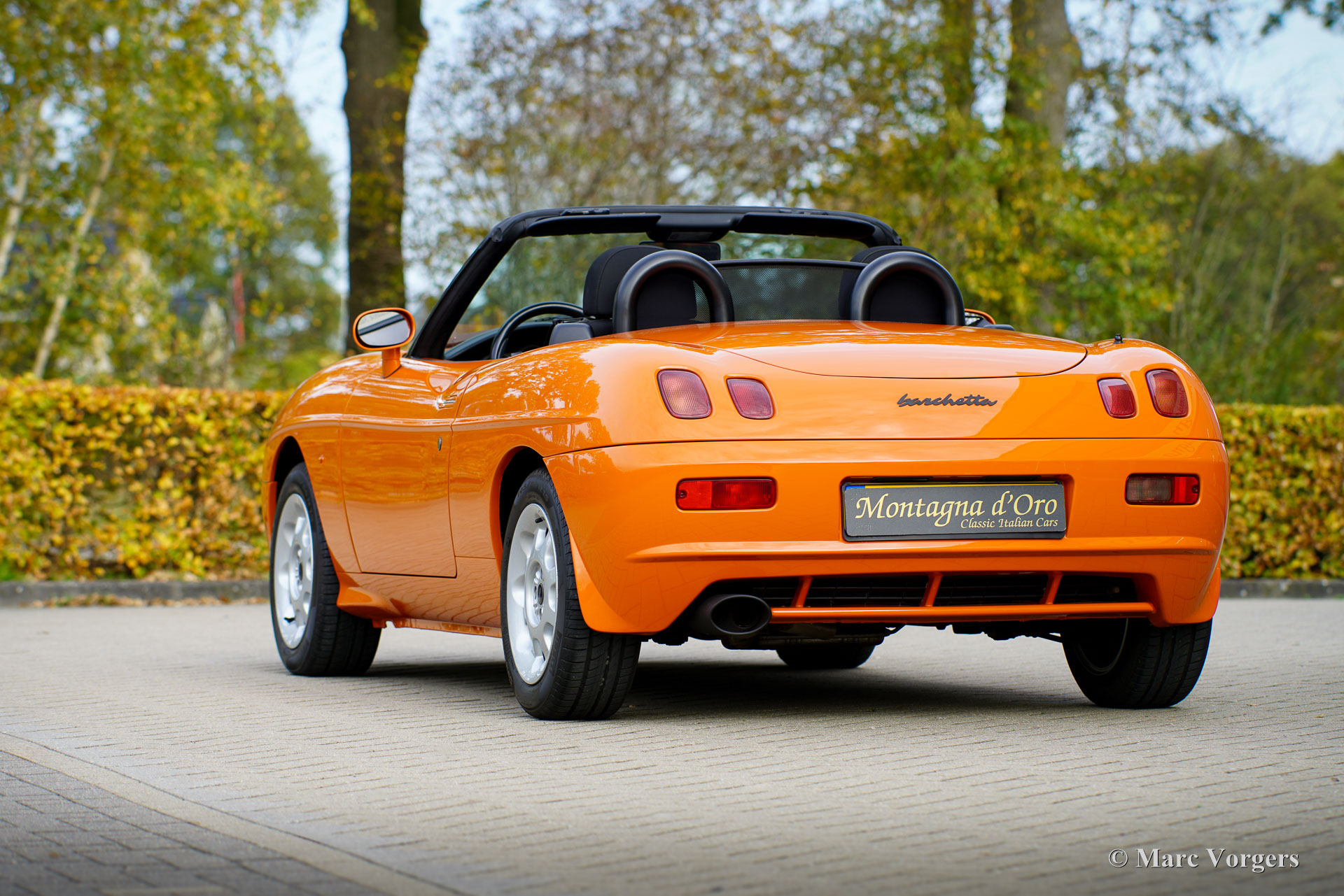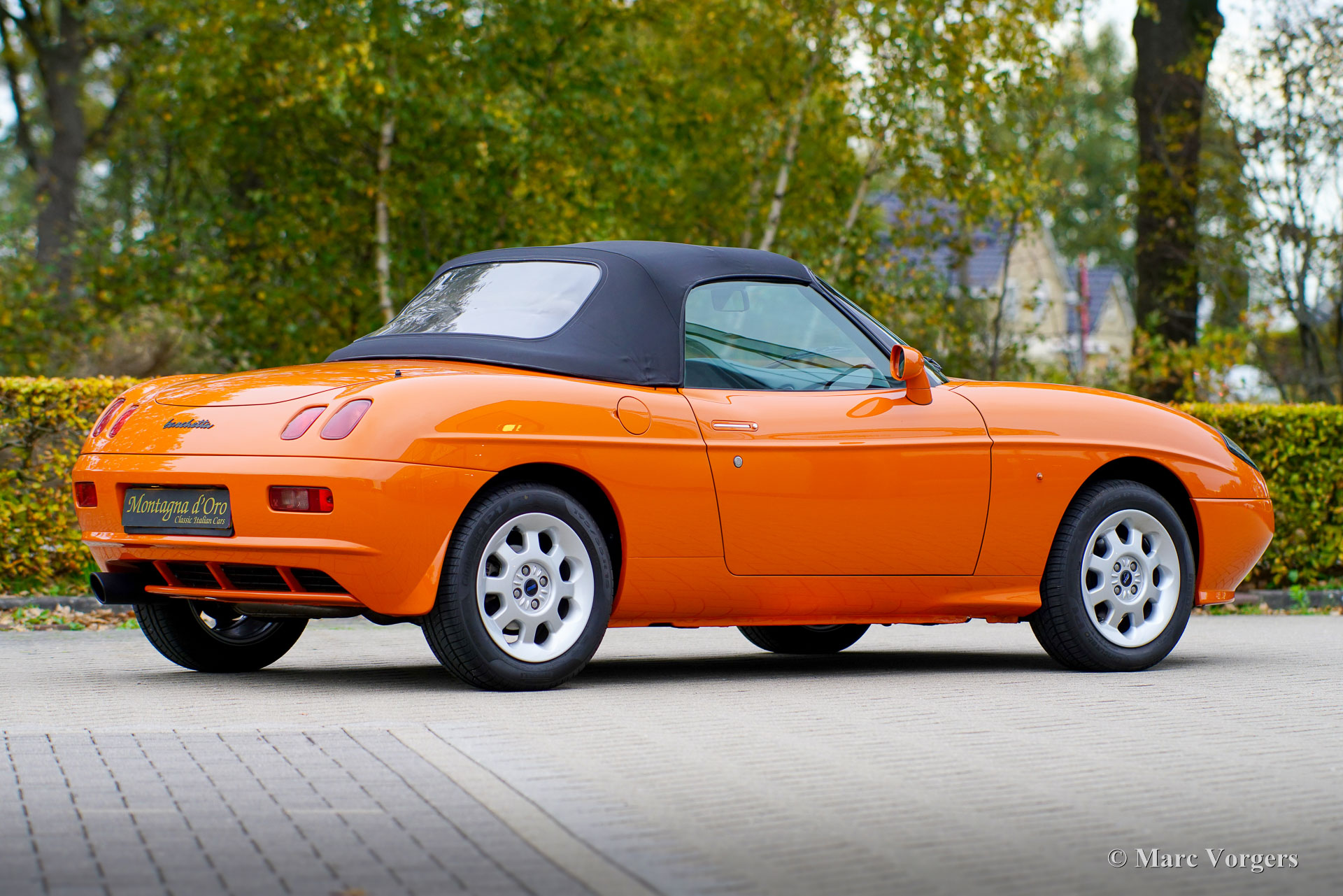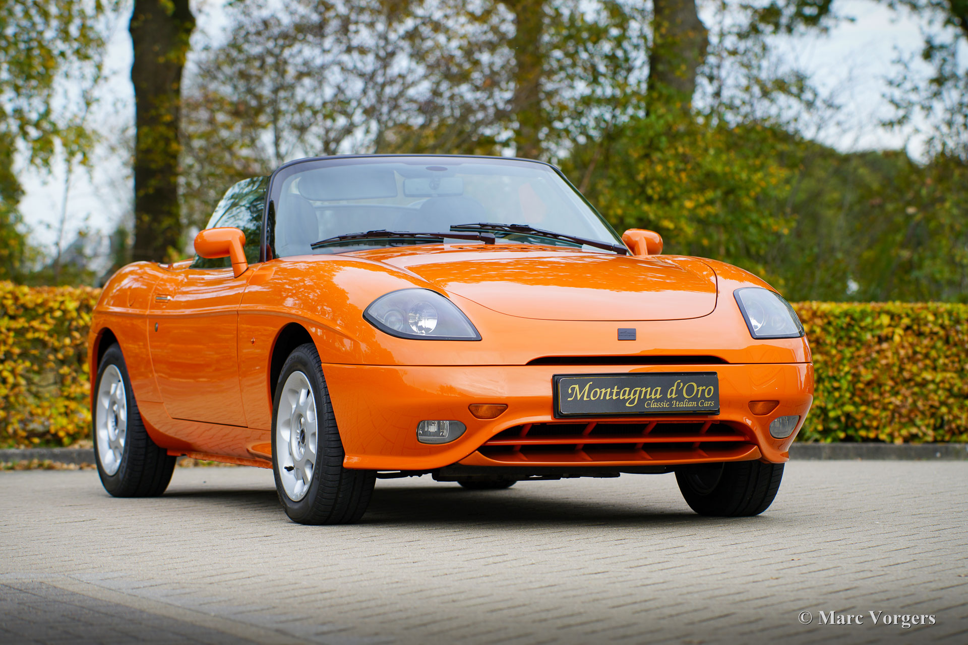 Fiat Barchetta ‘Black Edition’, bouwjaar 2000 (eerste registratie 20 mei 2000). Chassisnummer ZFA183000*00047225*, motornummer 60586932. Carrosseriekleur oranje (Arancio Victoria 570) gecombineerd met een zwart/antraciet stoffen/lederen interieur en zwart tapijt met oranje afwerking. Zwarte vinyl soft-top en een hard-top in carrosseriekleur. Deze prachtige Fiat Barchetta ‘Black Edition’ is nieuw in Nederland verkocht door Autohuis Ede van Wirdum. Vanaf dag één is de auto gekoesterd door drie opeenvolgende eigenaren en de auto heeft 87.574 kilometer gereden. Ontworpen door Andreas Zapatinas bij Fiat’s Centro Stile en geïntroduceerd in 1995, is de Fiat Barchetta een compacte sportieve Italiaanse roadster in de geest van de lichtgewicht Italiaanse sportwagens. De naam Barchetta betekent ‘kleine boot’. De auto is gebaseerd op het Fiat Punto-platform en is uitgerust met een 131 pk sterke 1800 cc viercilindermotor, gekoppeld aan een handgeschakelde vijfversnellingsbak die de voorwielen aandrijft. Deze ‘Black Edition’ auto is voorzien van een speciaal optiepakket bestaande uit contrasterende (zwarte) interieurbekleding op de portieren en matten, zwarte rolbeugels, een zwart frontlogo, lichtmetalen velgen en een geüpgraded Fiat audiosysteem met RDS en cd-speler. Dit prachtige exemplaar is in het verleden professioneel overgespoten; de auto ziet eruit en voelt werkelijk als nieuw! De onderhoudshistorie is volledig bekend en gedocumenteerd. Het onderhoudsboekje is tot aan de laatste onderhoudsbeurt bij 87.062 kilometer stipt ingevuld en afgestempeld. Dit schitterende exemplaar wordt compleet geleverd met een hard-top en een originele Fiat autohoes. Een zeer begeerlijke ‘modern classic’!