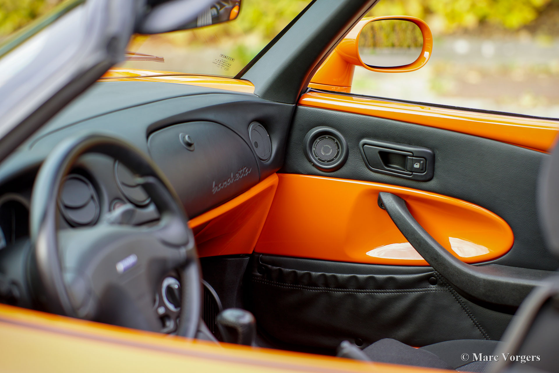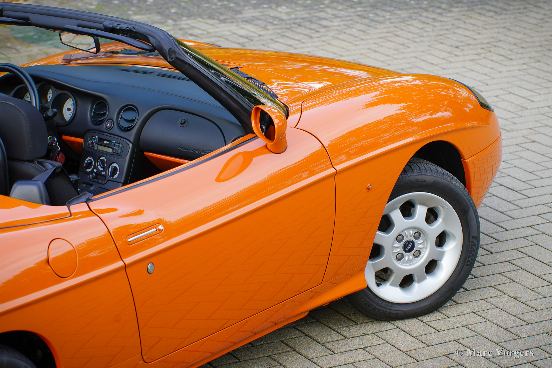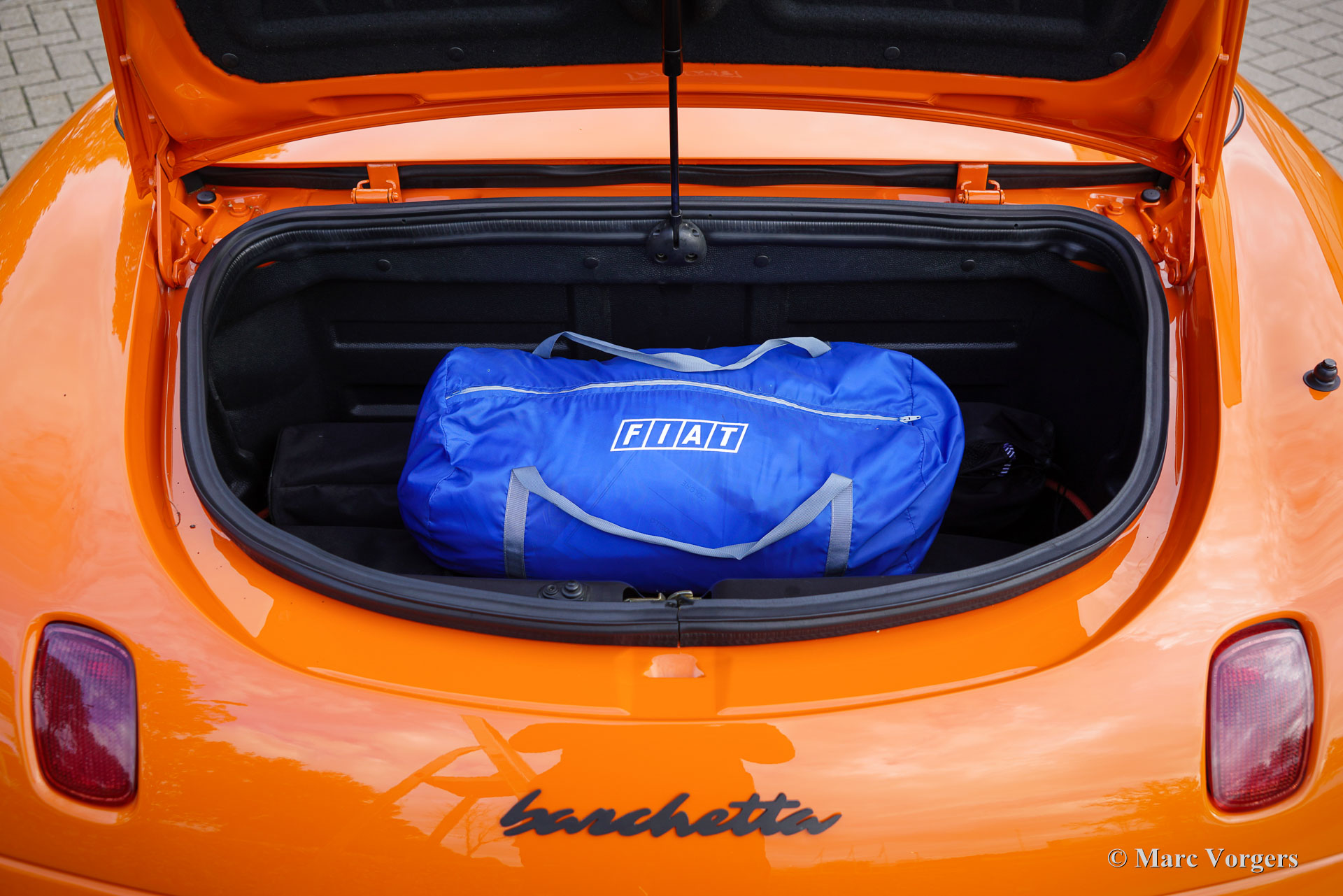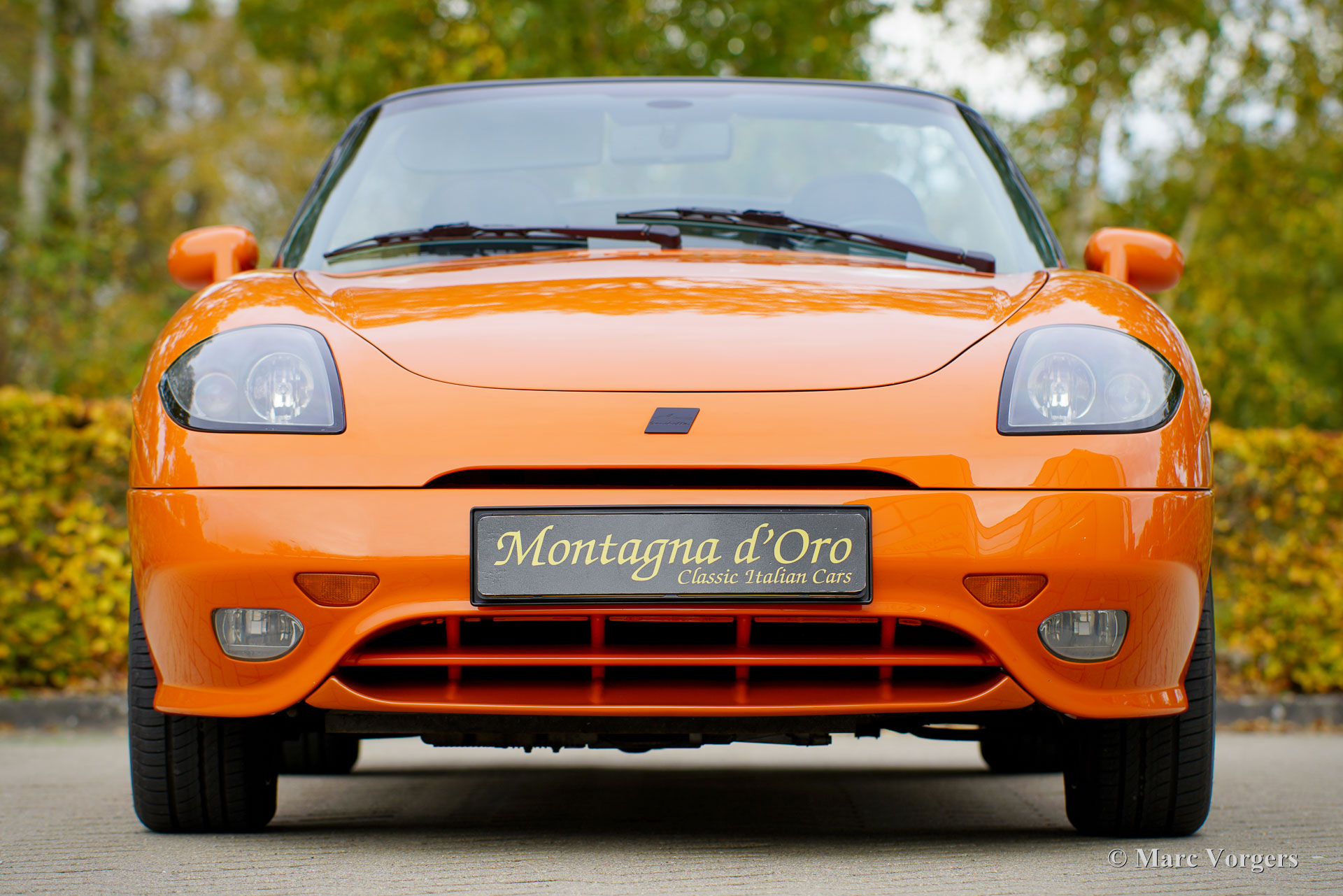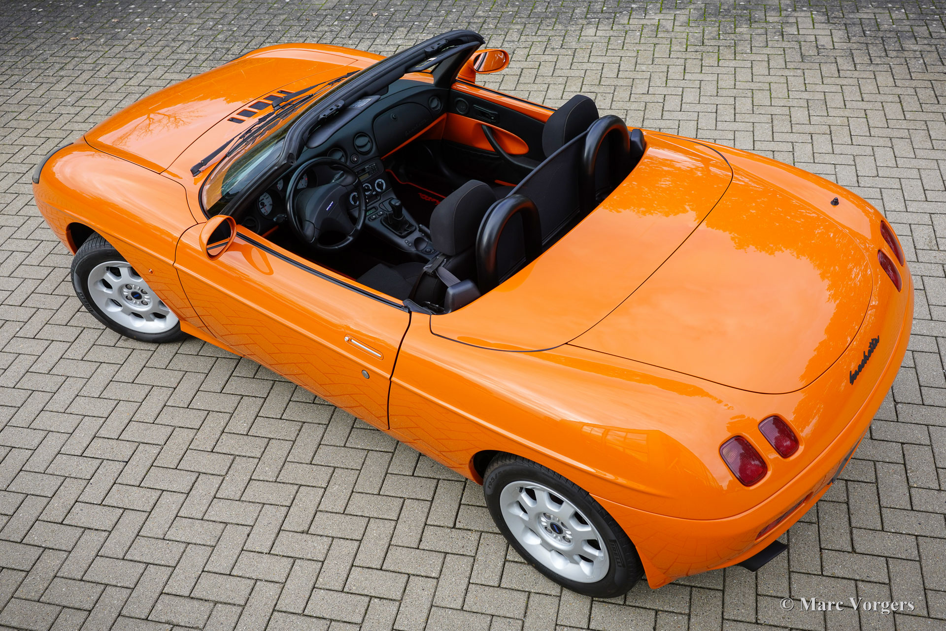 Fiat Barchetta ‘Black Edition’, bouwjaar 2000 (eerste registratie 20 mei 2000). Chassisnummer ZFA183000*00047225*, motornummer 60586932. Carrosseriekleur oranje (Arancio Victoria 570) gecombineerd met een zwart/antraciet stoffen/lederen interieur en zwart tapijt met oranje afwerking. Zwarte vinyl soft-top en een hard-top in carrosseriekleur. Deze prachtige Fiat Barchetta ‘Black Edition’ is nieuw in Nederland verkocht door Autohuis Ede van Wirdum. Vanaf dag één is de auto gekoesterd door drie opeenvolgende eigenaren en de auto heeft 87.574 kilometer gereden. Ontworpen door Andreas Zapatinas bij Fiat’s Centro Stile en geïntroduceerd in 1995, is de Fiat Barchetta een compacte sportieve Italiaanse roadster in de geest van de lichtgewicht Italiaanse sportwagens. De naam Barchetta betekent ‘kleine boot’. De auto is gebaseerd op het Fiat Punto-platform en is uitgerust met een 131 pk sterke 1800 cc viercilindermotor, gekoppeld aan een handgeschakelde vijfversnellingsbak die de voorwielen aandrijft. Deze ‘Black Edition’ auto is voorzien van een speciaal optiepakket bestaande uit contrasterende (zwarte) interieurbekleding op de portieren en matten, zwarte rolbeugels, een zwart frontlogo, lichtmetalen velgen en een geüpgraded Fiat audiosysteem met RDS en cd-speler. Dit prachtige exemplaar is in het verleden professioneel overgespoten; de auto ziet eruit en voelt werkelijk als nieuw! De onderhoudshistorie is volledig bekend en gedocumenteerd. Het onderhoudsboekje is tot aan de laatste onderhoudsbeurt bij 87.062 kilometer stipt ingevuld en afgestempeld. Dit schitterende exemplaar wordt compleet geleverd met een hard-top en een originele Fiat autohoes. Een zeer begeerlijke ‘modern classic’!