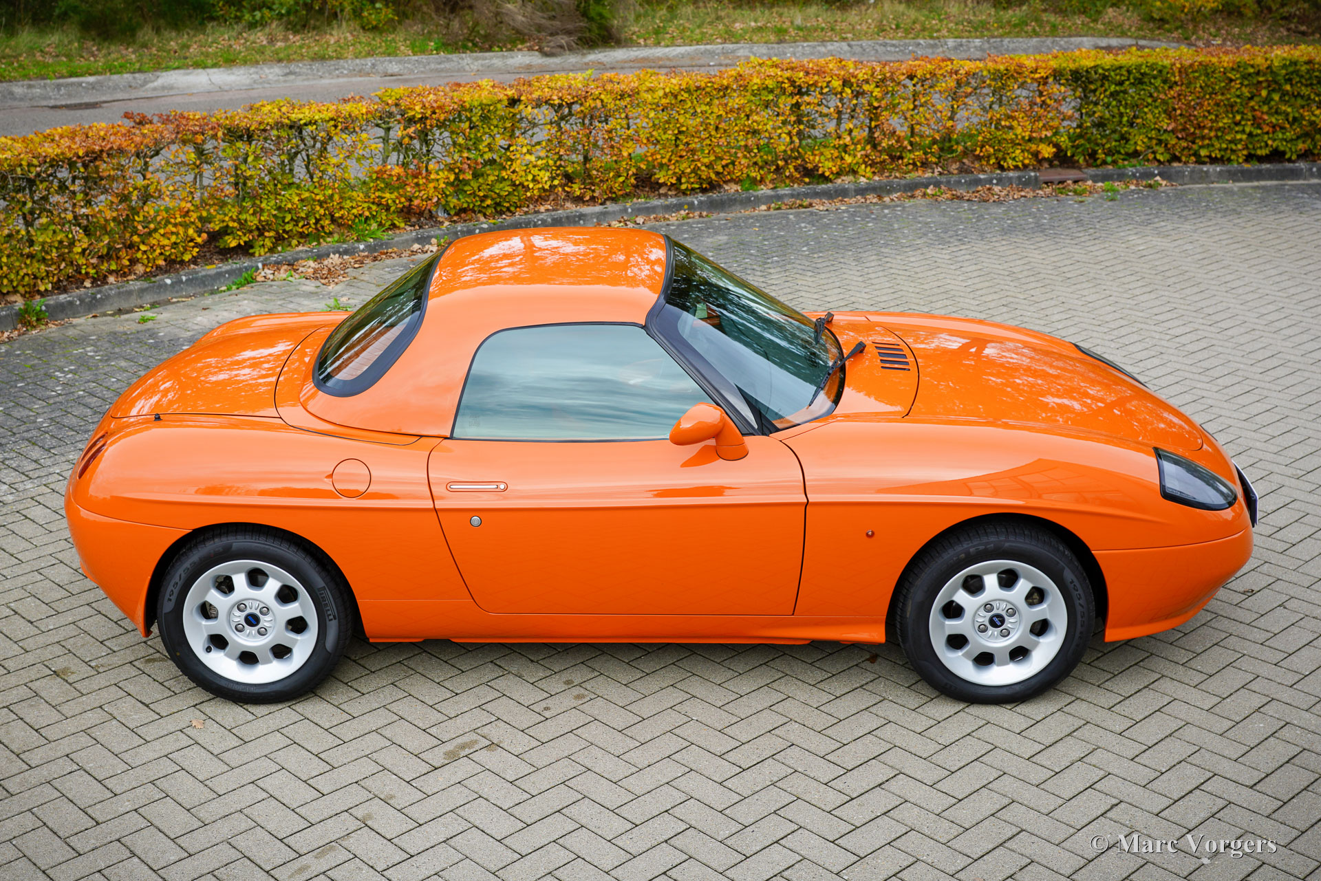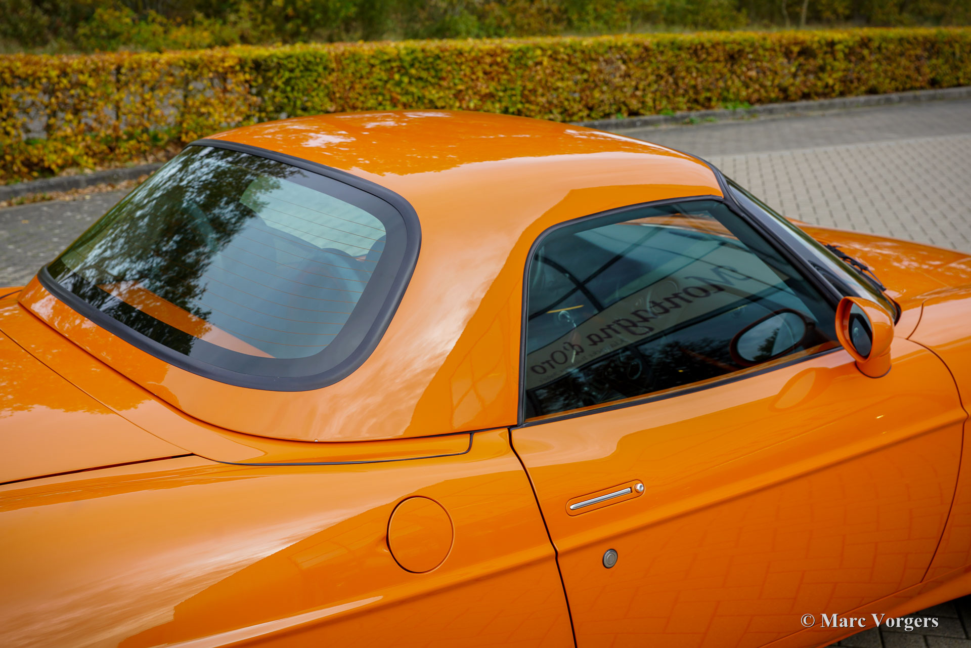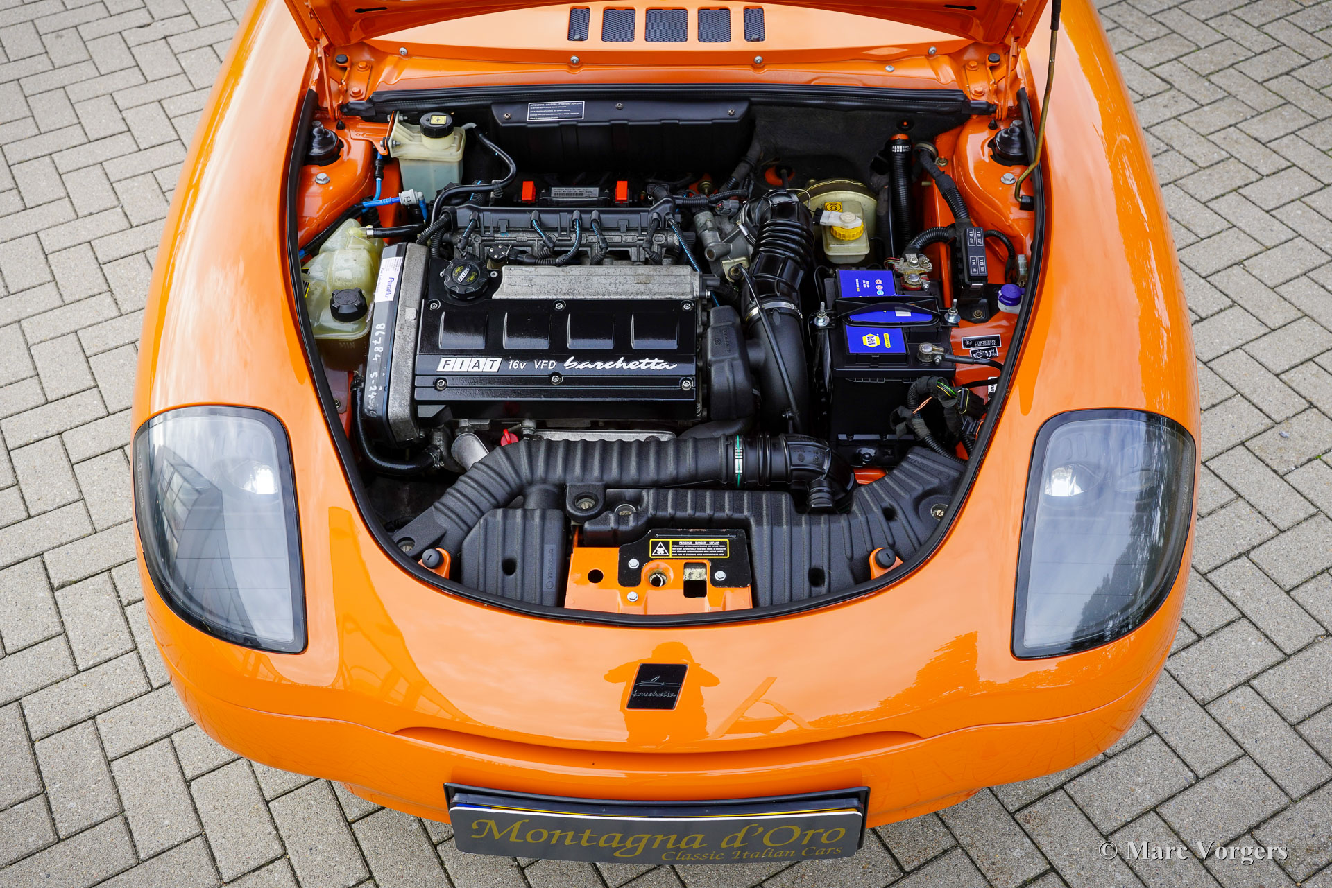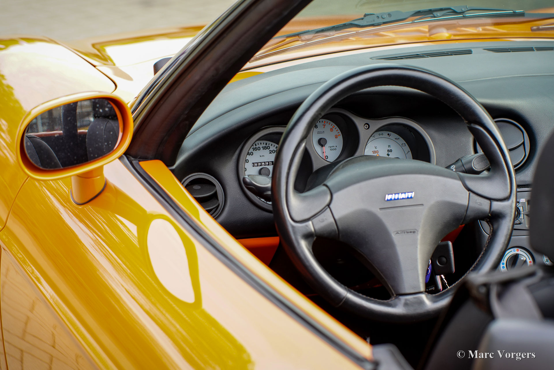 Fiat Barchetta ‘Black Edition’, bouwjaar 2000 (eerste registratie 20 mei 2000). Chassisnummer ZFA183000*00047225*, motornummer 60586932. Carrosseriekleur oranje (Arancio Victoria 570) gecombineerd met een zwart/antraciet stoffen/lederen interieur en zwart tapijt met oranje afwerking. Zwarte vinyl soft-top en een hard-top in carrosseriekleur. Deze prachtige Fiat Barchetta ‘Black Edition’ is nieuw in Nederland verkocht door Autohuis Ede van Wirdum. Vanaf dag één is de auto gekoesterd door drie opeenvolgende eigenaren en de auto heeft 87.574 kilometer gereden. Ontworpen door Andreas Zapatinas bij Fiat’s Centro Stile en geïntroduceerd in 1995, is de Fiat Barchetta een compacte sportieve Italiaanse roadster in de geest van de lichtgewicht Italiaanse sportwagens. De naam Barchetta betekent ‘kleine boot’. De auto is gebaseerd op het Fiat Punto-platform en is uitgerust met een 131 pk sterke 1800 cc viercilindermotor, gekoppeld aan een handgeschakelde vijfversnellingsbak die de voorwielen aandrijft. Deze ‘Black Edition’ auto is voorzien van een speciaal optiepakket bestaande uit contrasterende (zwarte) interieurbekleding op de portieren en matten, zwarte rolbeugels, een zwart frontlogo, lichtmetalen velgen en een geüpgraded Fiat audiosysteem met RDS en cd-speler. Dit prachtige exemplaar is in het verleden professioneel overgespoten; de auto ziet eruit en voelt werkelijk als nieuw! De onderhoudshistorie is volledig bekend en gedocumenteerd. Het onderhoudsboekje is tot aan de laatste onderhoudsbeurt bij 87.062 kilometer stipt ingevuld en afgestempeld. Dit schitterende exemplaar wordt compleet geleverd met een hard-top en een originele Fiat autohoes. Een zeer begeerlijke ‘modern classic’!
