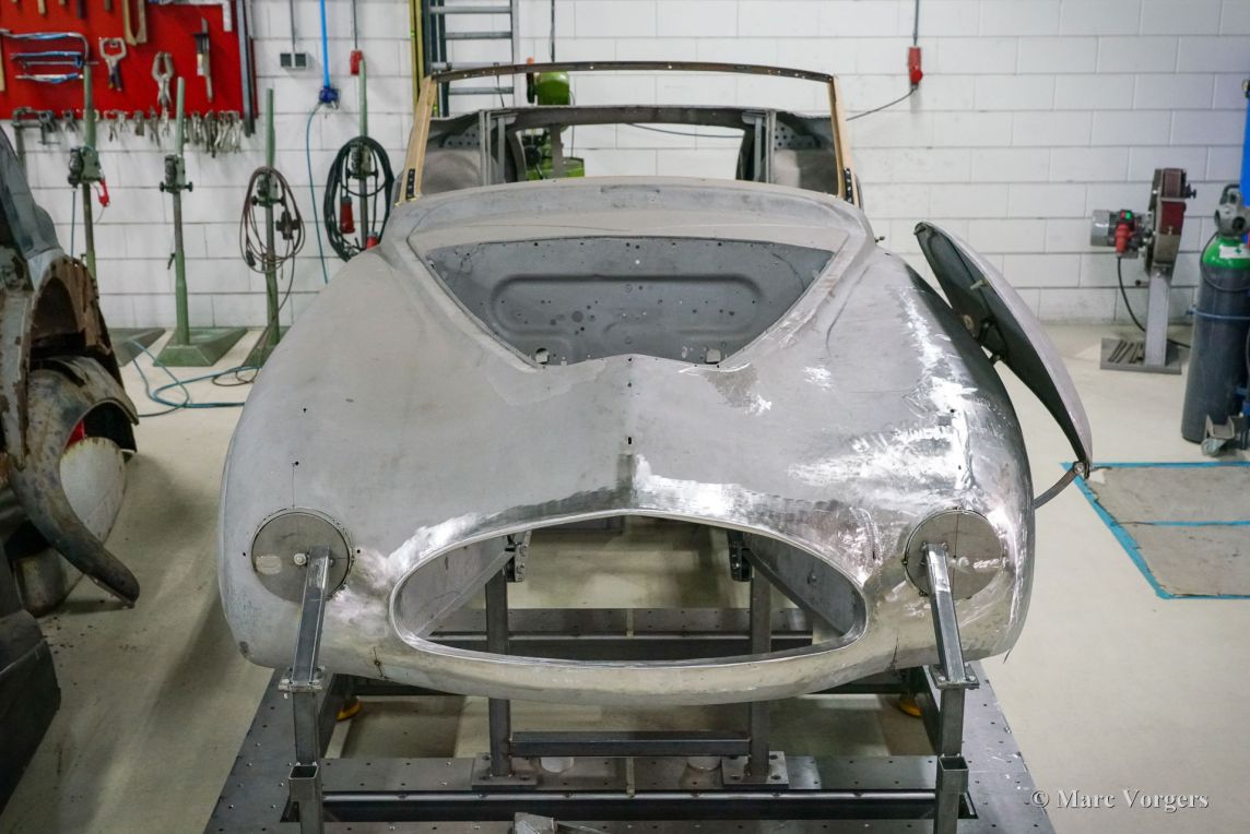 van de Nash Healey Pininfarina Roadster uit 1953 geactualiseerd, dat wordt opgebouwd met alle fraai gerestaureerde onderdelen.