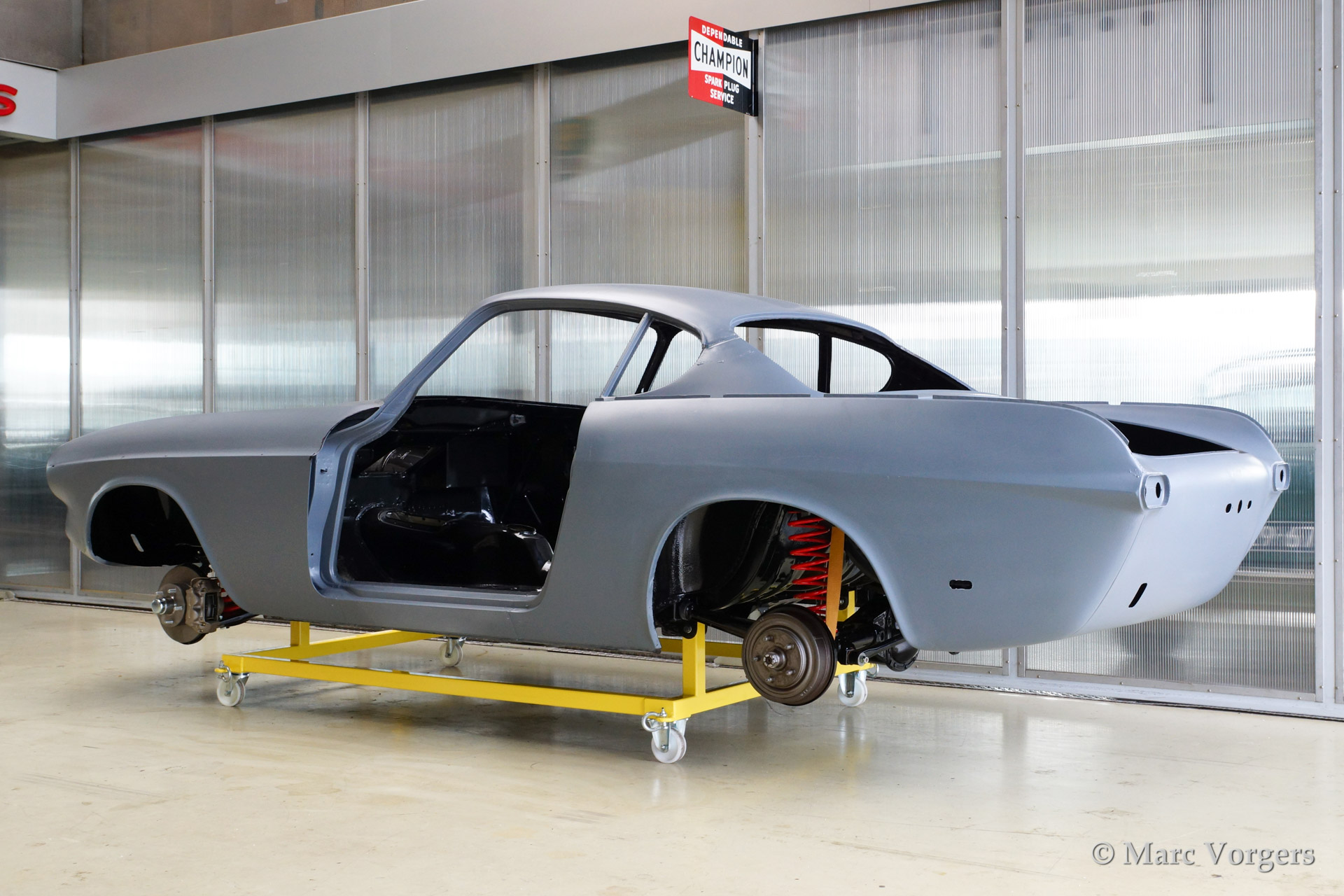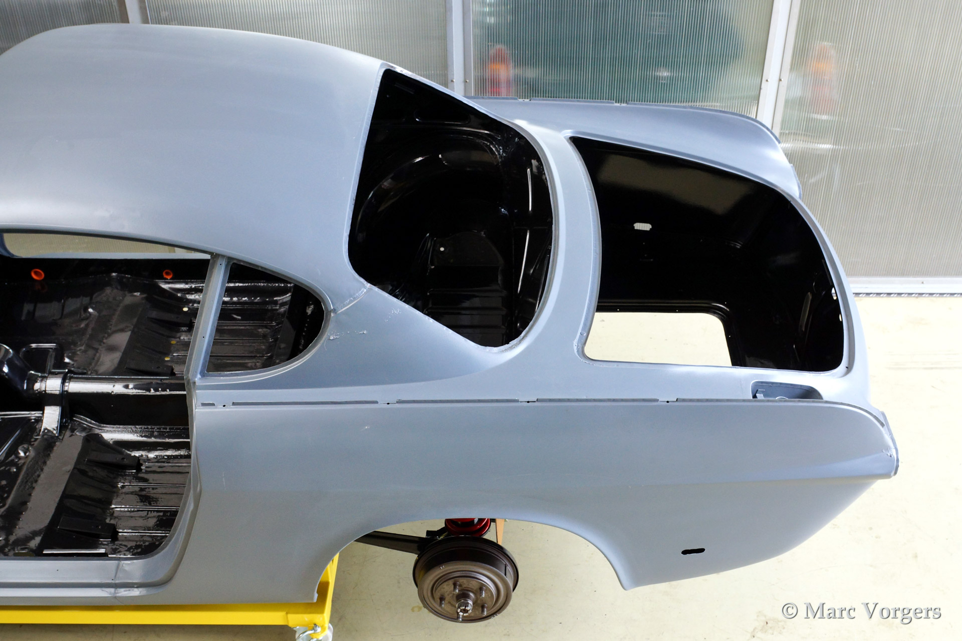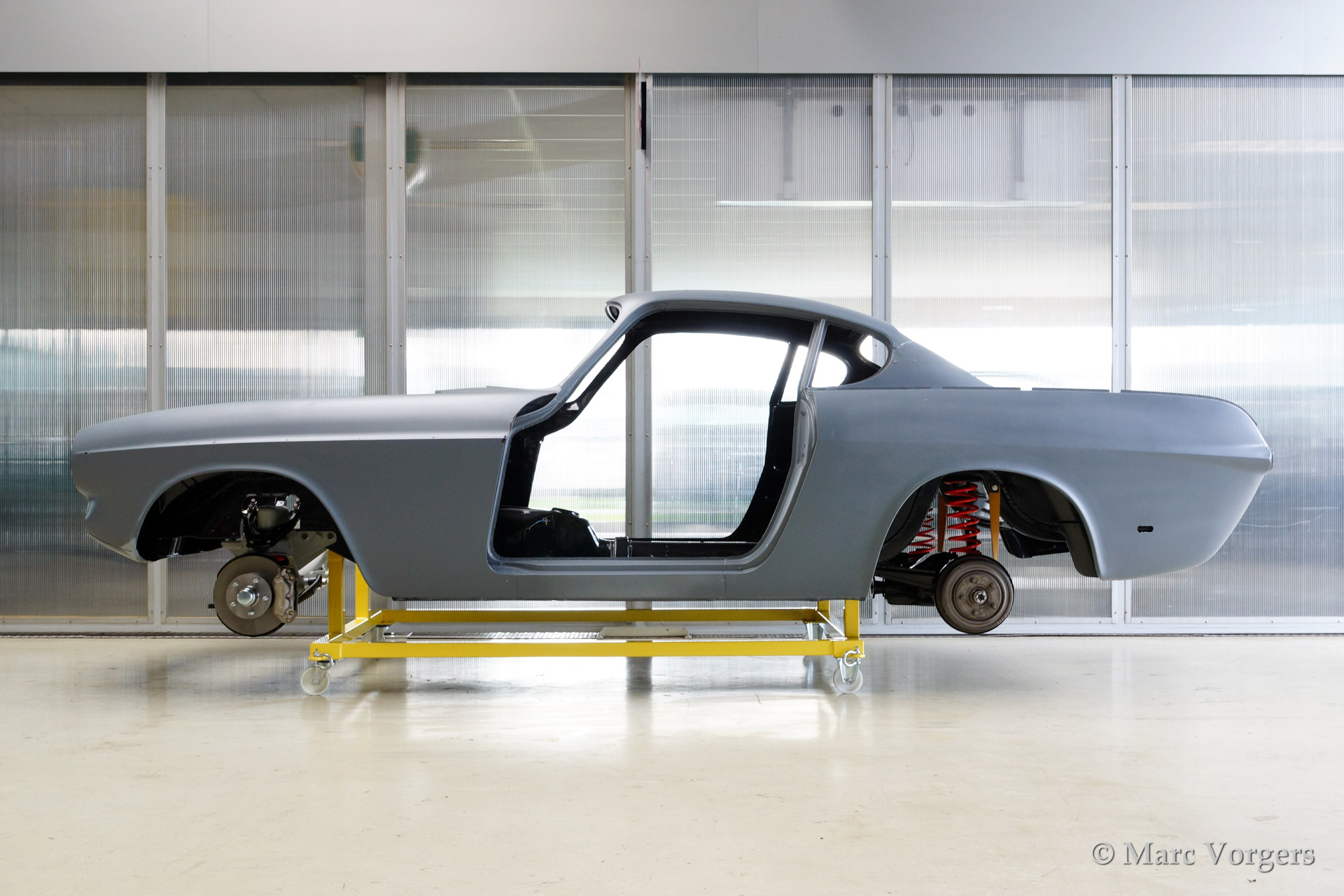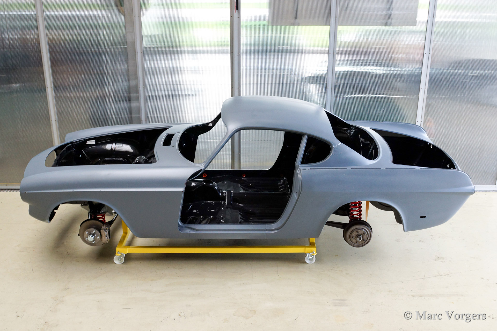 Volvo P1800 S volledige restauratie. De volvo werd volledig gestript en ontlakt. Daarna werd er een epoxycoating op het blanke metaal aangebracht. Het plaatwerk werd uitvoerig gerestaureerd. Daarna werd de carrosserie geschuurd en met Epoxy gegrond. De zeer strakke body werd verder gladgemaakt en gegrond. De binnenkant is gespoten in de kleur antraciet metallic.