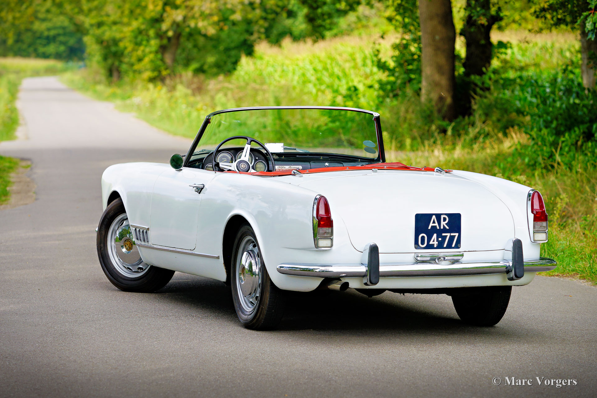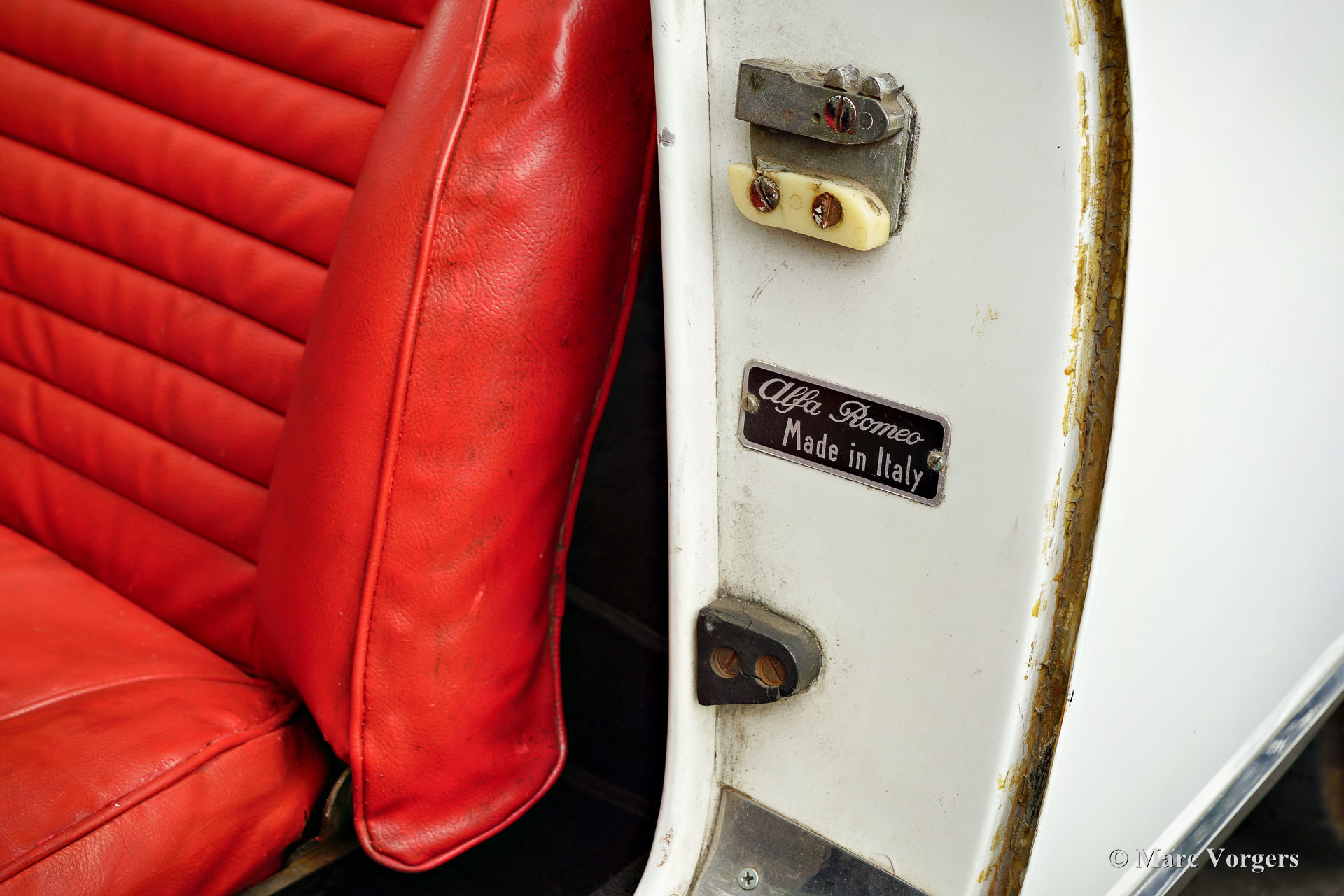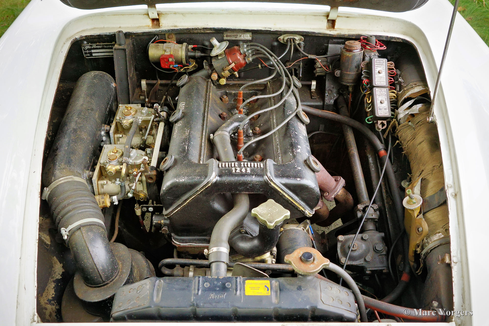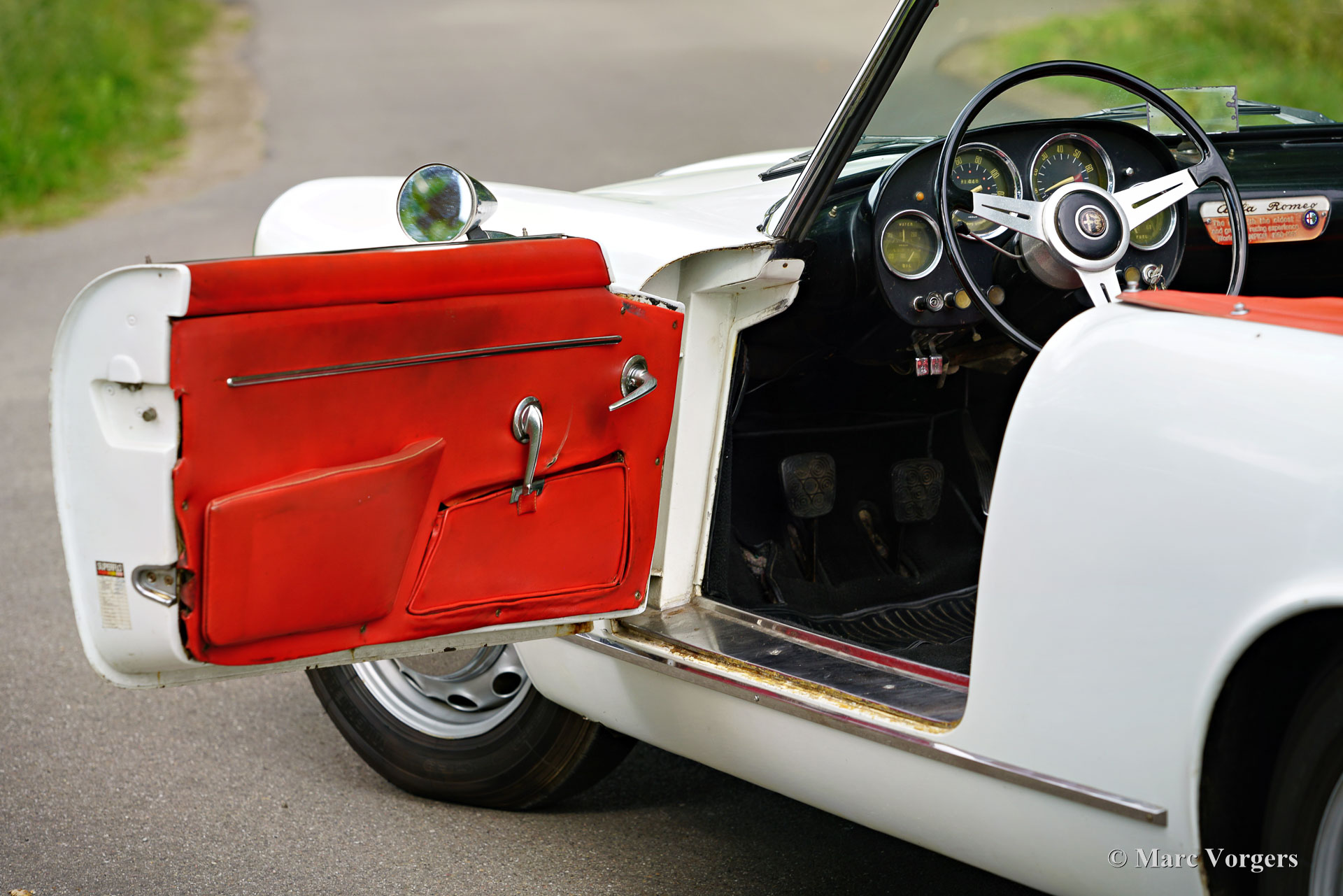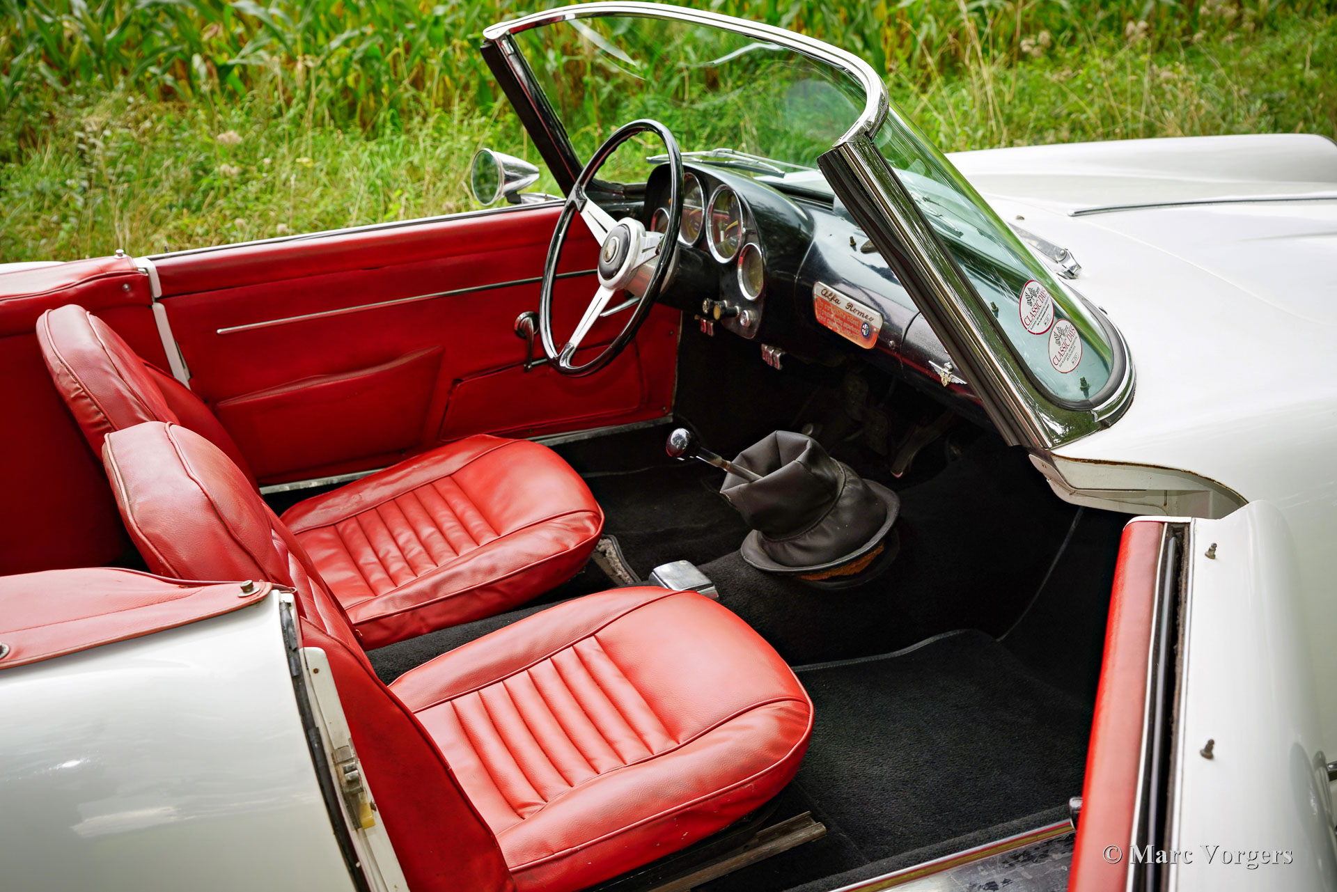 Alfa Romeo 2000 Touring Spider, jaar 1959. (Eerste registratie 28 februari 1959.) Kleur wit gecombineerd met een rood kunstlederen interieur en zwart tapijt. Deze stijlvolle Alfa Romeo 2000 Touring Spider werd nieuw verkocht in de VS aan een Italiaan die in Florida woonde. Deze eigenaar nam de Alfa Romeo op een gegeven moment mee naar Italië. De Italiaan had de auto vijftig jaar in zijn bezit voordat de Alfa Romeo in 2009 werd verkocht aan de huidige Nederlandse eigenaar. De auto werd naar Nederland gehaald en in 2010 geregistreerd voor gebruik op de weg. De Alfa Romeo Spider stond opgesteld in een Alfa Romeo collectie en werd in de periode 2012-2019 jaarlijks naar de Schloss Dyck Classic Days gereden (Bedburdyck, in Noordrijn-Westfalen, Duitsland). Deze Alfa Romeo 2000 Touring Spider is een echte ‘survivor’. De auto is zeer origineel en er is in de loop van de jaren niet veel aan gedaan. De auto is lang geleden een keer overgespoten en in Nederland is de originele motor vervangen door een andere motor van hetzelfde type. De originele motor is inmiddels geheel gereviseerd en kan los bij de auto gekocht worden (vraagprijs € 10.000, -). Deze Alfa Romeo Touring 2000 Spider verkeert in een redelijke conditie, het is een rijdende projectauto. De auto rijdt en is legaal voor gebruik op de openbare weg in Nederland (50+ geen APK-plicht). Onlangs zijn er wat scheuren in de stoelen gerepareerd (de stoelen hebben nieuw schuim nodig), is de auto weer rijdend gemaakt en zijn de remmen gangbaar gemaakt (na vijf jaar stilstand). Deze Alfa Romeo Touring 2000 Spider kan bescheiden worden opgeknapt/gereviseerd en als ‘survivor’ worden gereden, of de auto kan gedeeltelijk/volledig worden gerestaureerd. De keuze is aan een nieuwe eigenaar en Alfa Romeo liefhebber!