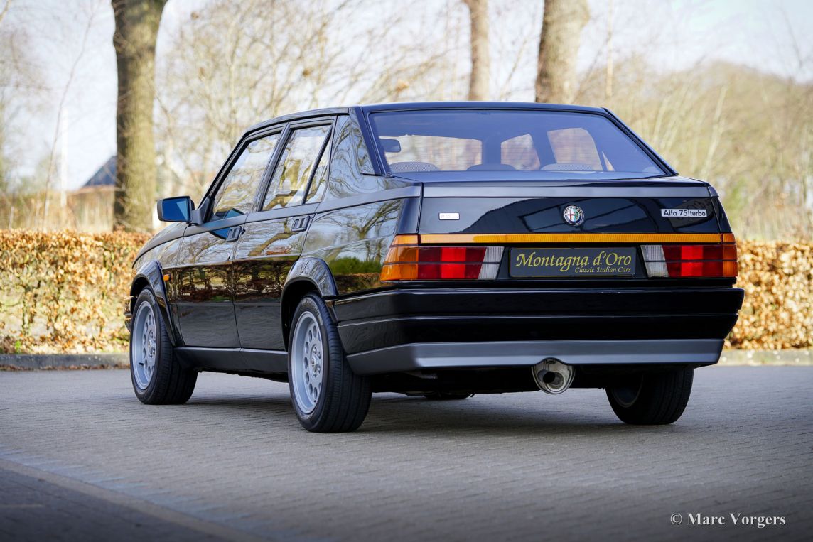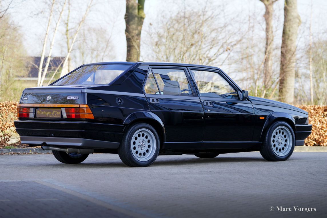 De Alfa Romeo 75 verscheen in 1985 ter ere van Alfa’s 75‑jarig bestaan en werd al snel het laatste echte ‘klassieke’ Alfa‑model vóór de overname door Fiat. De auto behield het traditionele transaxle‑concept met de versnellingsbak en koppeling achterin, wat zorgde voor een bijna perfecte gewichtsverdeling en een uitgesproken sportief rijgedrag. Het ontwerp, hoekig en typisch jaren tachtig, gaf de 75 een herkenbare en karaktervolle uitstraling. De motoren varieerden van de bekende Twin Spark‑viercilinders tot de krachtige V6 Busso‑motoren, die de auto een unieke klank en levendigheid gaven. In 1987 volgde een facelift met subtiele technische en cosmetische verbeteringen. De 75 werd ook ingezet in de autosport, waar vooral de Turbo‑varianten indruk maakten. Onder de motorkap lag de 1,8-liter viercilinder-lijnmotor, met een Garrett T3-turbocompressor en intercooler, die 155 pk en 226 Nm koppel leverde. De turbo gaf de 75 voor die tijd vlotte prestaties, waaronder een topsnelheid van 210 km/u en een acceleratie van 0-100 km/u in 7,6 seconden. Deze cijfers plaatsten de 75 Turbo stevig in de top van de compacte executive auto's van zijn tijd. De 75 Turbo is een zeldzaam model in het 75 programma. Exacte productiegegevens zijn niet bekend maar er zijn er minimaal 5000 gebouwd om aan de FIA‑homologatie voor Groep A‑toerwagens te voldoen. Van de in gelimiteerde oplage gebouwde 75 Turbo ‘Evoluzione’ zijn de productie aantallen wel bekend: 500 stuks. De productie van de Alfa Romeo 75 liep tot 1992. De 75 werd opgevolgd door de voorwiel aangedreven 155 die onder het eigenaarschap van Fiat op het Tipo platform ontwikkeld werd. De Alfa Romeo 75 wordt vandaag de dag gewaardeerd als de laatste achterwiel aangedreven Alfa Romeo sedan van de oude stempel met een uitgesproken karakter en dito rijbeleving.