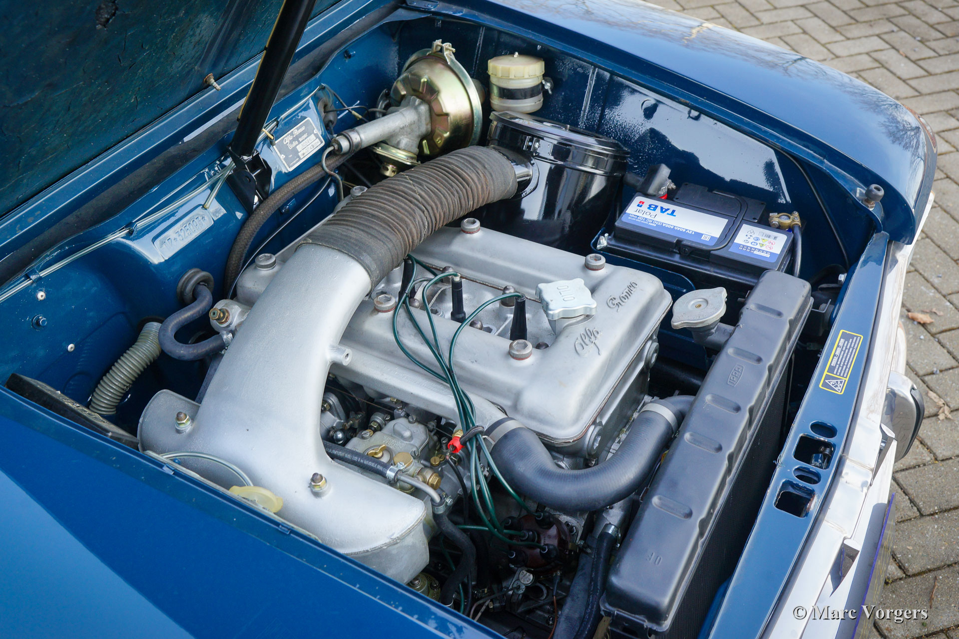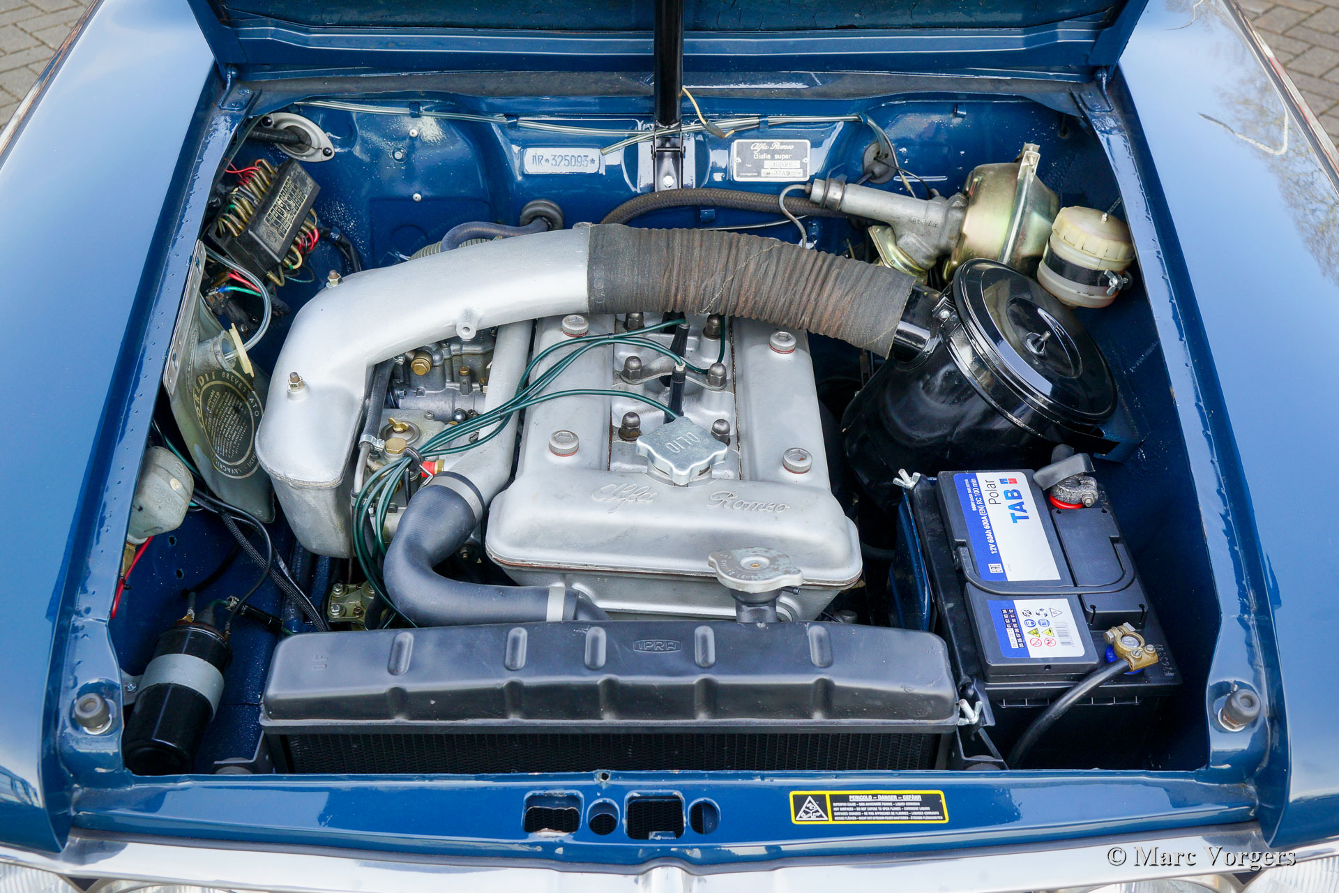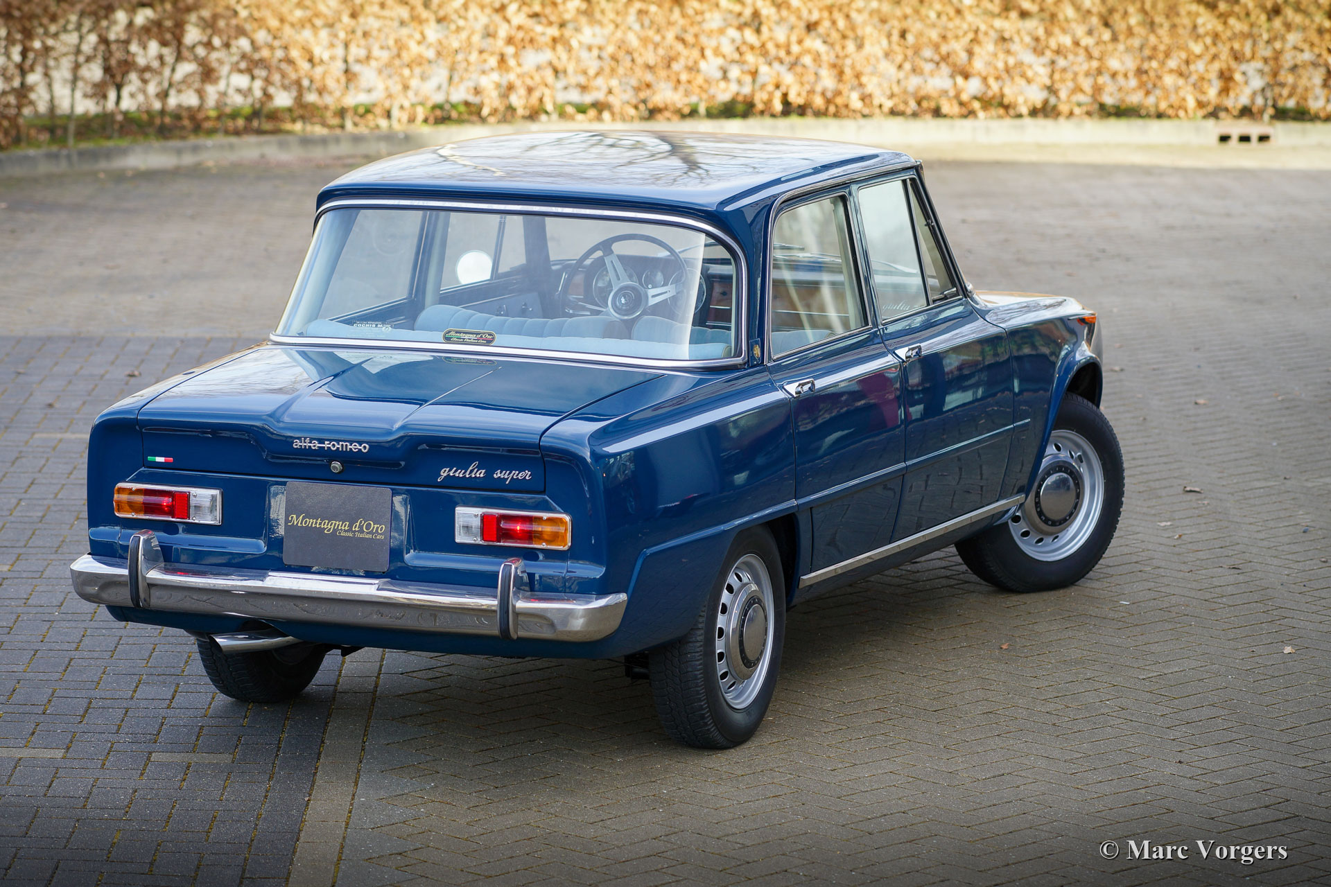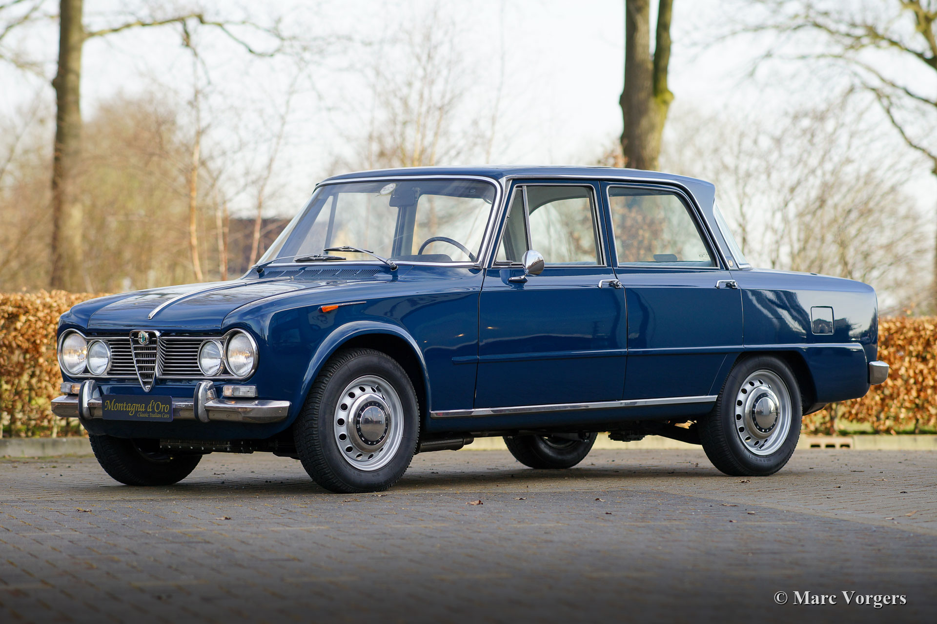 Alfa Romeo Giulia 1600 Super ‘Bollino Oro’, jaar 1966. Kleur blauw (Bluetta AR327). Interieur met lichtblauwe stof/ lichtgrijze vinyl stoelen en deurpanelen gecombineerd met donkerblauw tapijt. Deze prachtige Alfa Romeo Giulia Super ‘Bollino Oro’ werd nieuw verkocht in Italië, de eerste eigenaar was de heer Giorgio Villefranca. De Giulia 1600 Super met het 'Bollino Oro'-uitrustingspakket is het meest gewilde Giulia sedan-model. De auto is voorzien van een roestvrijstalen grille, roestvrijstalen dorpelafwerking en het 'Bollino Oro'-embleem op de' C-stijl '. Deze prachtige Giulia 1600 Super verkeert in een nooit gerestaureerde, zeer originele en excellente conditie, de auto toont alle originele details. Er ontbreekt enkel een stuk bekleding in de kofferbak. Het originele interieur vertoont minimale gebruikssporen wat na 55 jaar zeer bijzonder is! De lichtblauwe stoffen stoelbekleding en deurpanelen zien er bijna als nieuw uit. De carrosserie vertoont een prachtige passing van de plaatdelen en het lakwerk is uitstekend. De onderzijde en de motorruimte zijn schoon en mooi gedetailleerd. De auto is onlangs geïmporteerd uit Italië, de auto is nog voorzien van een Italiaans kenteken. De kilometerteller geeft slechts 74.482 kilometer aan, wat als origineel wordt beschouwd gezien de superieure originaliteit van de auto en de zeer lichte gebruikssporen in het interieur. Onlangs is de auto mechanisch uitgebreid gereviseerd, de gereviseerde motor moet nog ingereden worden! Verder is het onderstel volledig onder handen genomen met nieuwe schokbrekers, veren en andere onderdelen om het rijgedrag en de wegligging te optimaliseren. Ook is de benzinetank vernieuwd. Dit is een zeer gezochte Alfa Romeo Giulia 1600 Super ‘Bollino Oro’ in excellente conditie, een auto voor de echte Alfa Romeo liefhebber en / of verzamelaar.