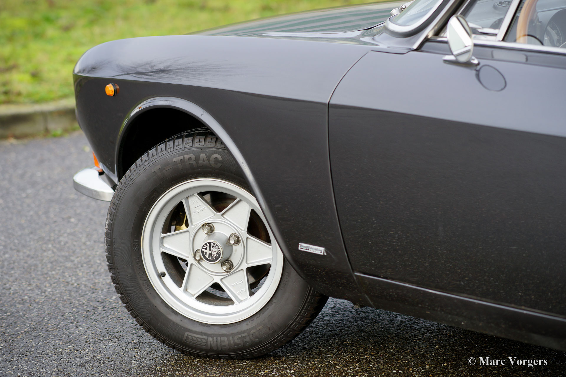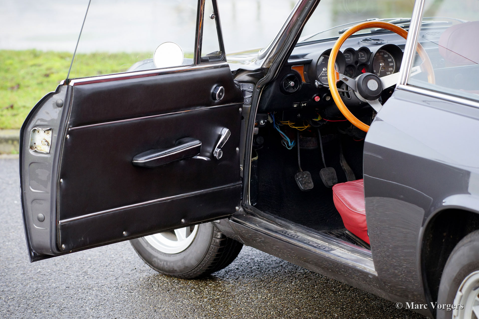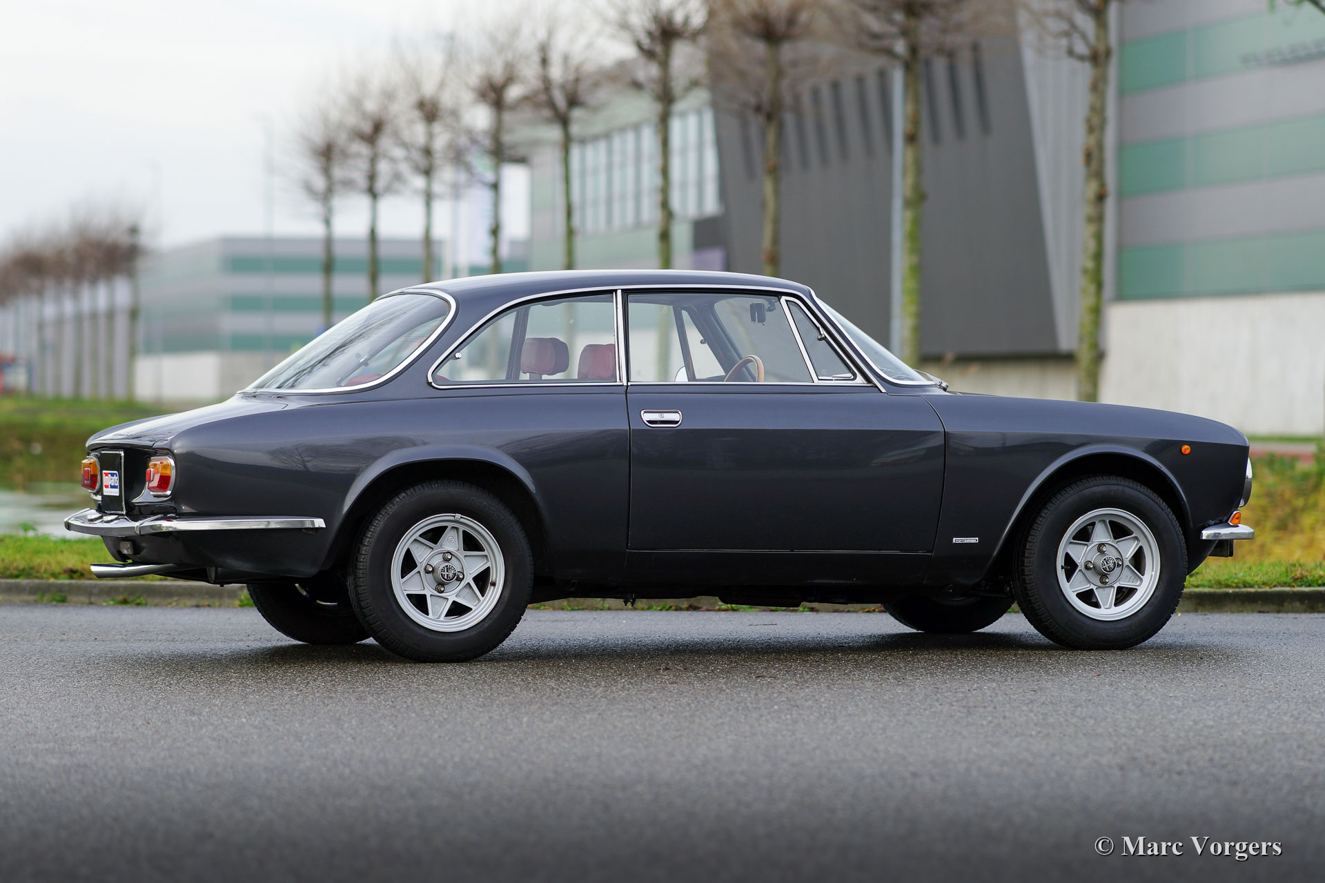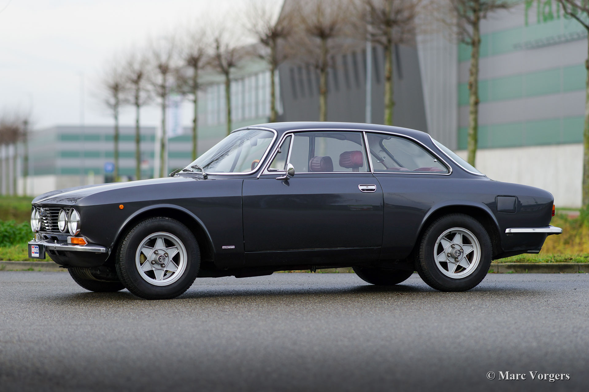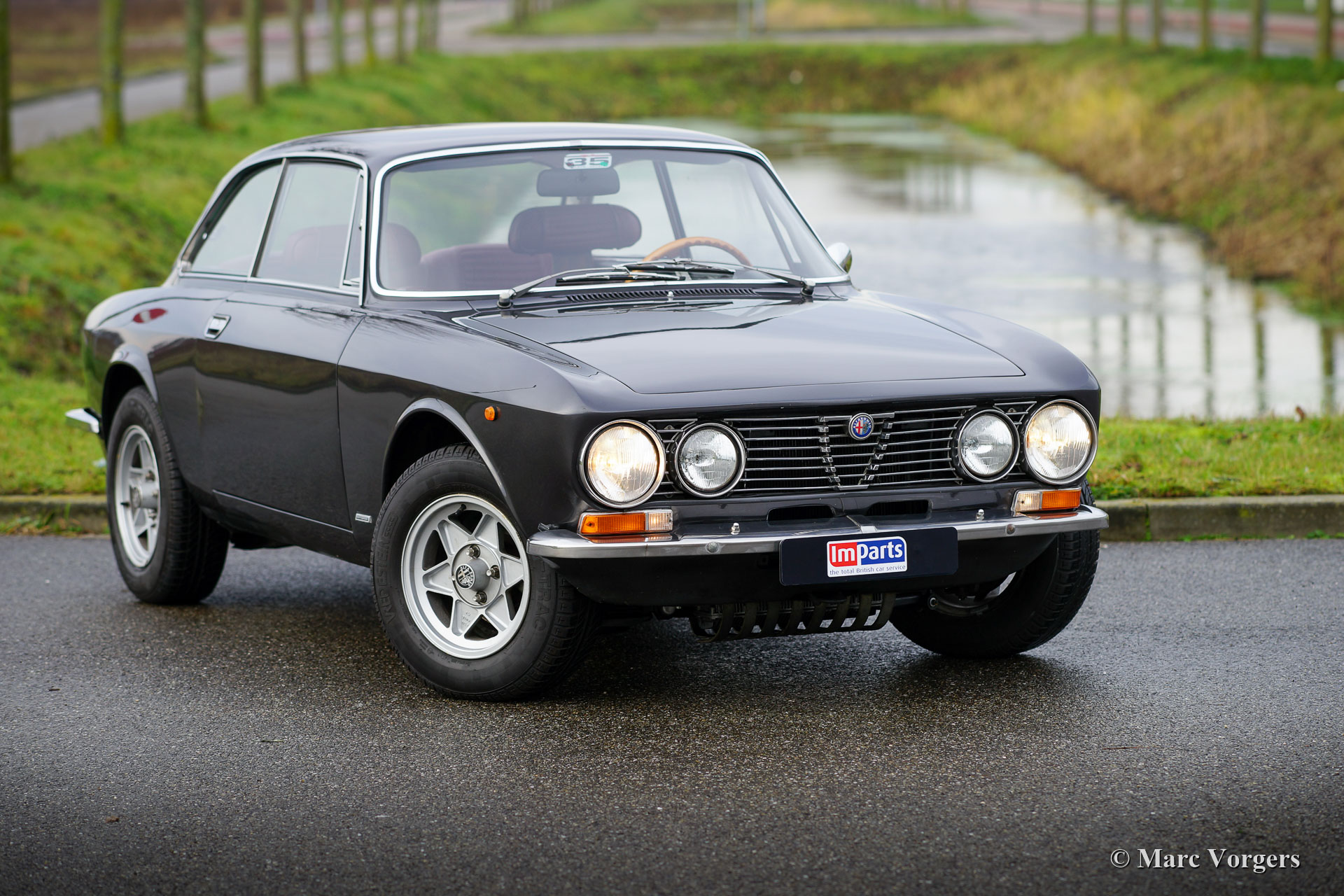 Alfa Romeo Giulia GT 1300 Junior ‘Lusso’, jaar 1975. Kleur donkergrijs metallic gecombineerd met een donkerrood leren interieur en zwart tapijt. Deze fraaie Alfa Romeo GT 1300 Junior is de ‘lusso’ (luxe) versie van de GT 1300. De auto beschikt over ontwerpdetails van de GTV 2000, zoals de chromen grille met viervoudige koplampen, het dashboard en de stoelen met hoofdsteunen. De auto verkeert in zeer goede conditie. Onlangs hebben we de auto mechanisch verbeterd. Het remsysteem werd gereviseerd en de koppeling is vernieuwd. De auto is klaar voor elk nieuw avontuur in handen van een nieuwe eigenaar. De Alfa Romeo Giulia was in de jaren 1960 en vroege jaren 1970 een geavanceerde auto, de Giulia GT is voorzien van een aluminium viercilindermotor met dubbele bovenliggende nokkenassen en een handgeschakelde vijfversnellingsbak. Deze auto is voorzien van prachtige, periode correcte, ATS-lichtmetalen wielen!