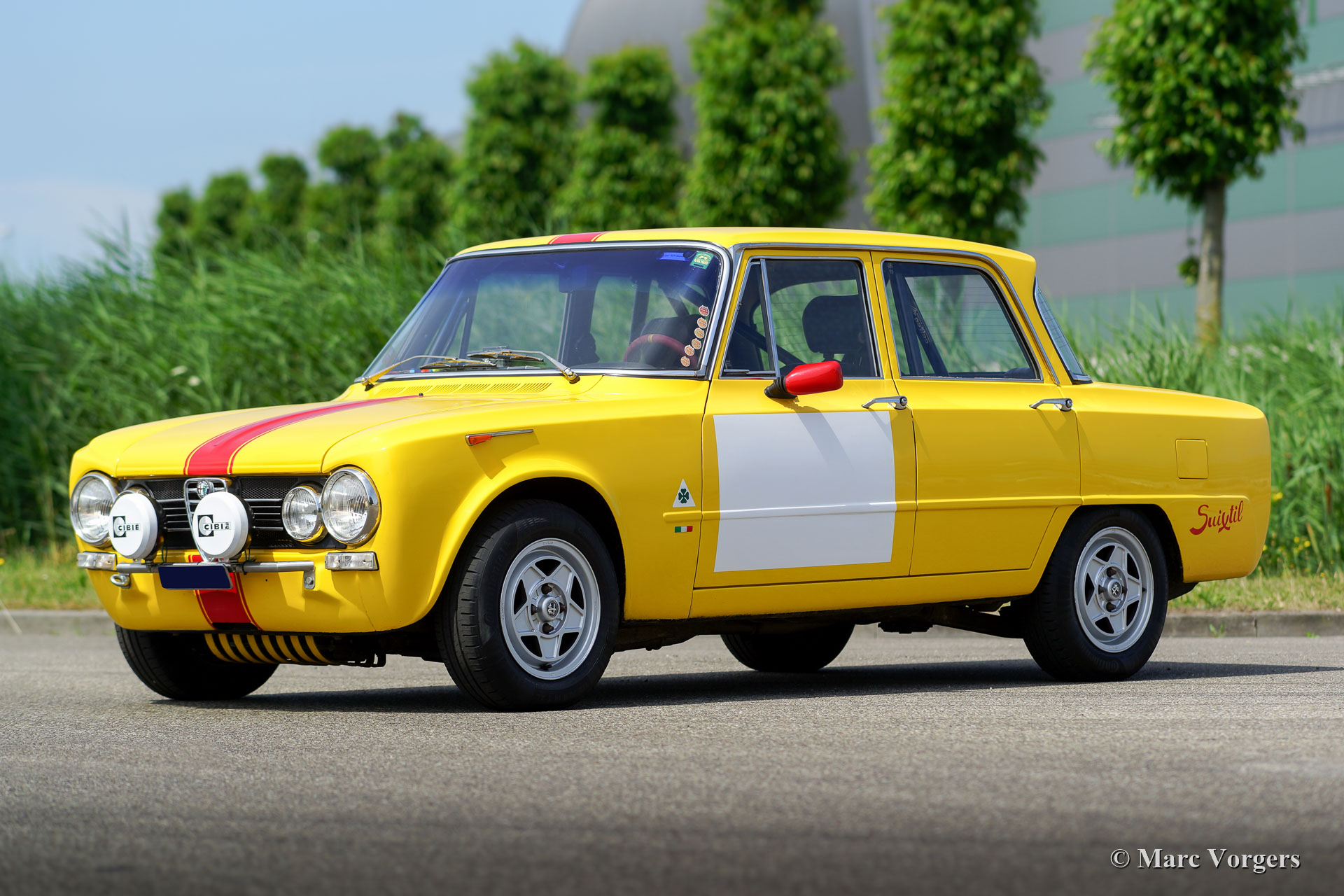 Alfa Romeo Giulia Super rally auto, jaar 1971. Kleur geel (Giallo Ginestra 258) met rode sportstrepen over de lengte van de carrosserie. Donkerblauw leren rallyinterieur (speciale sportstoelen met uitstekende zijdelingse steun en hoofdsteunen), donkerblauw tapijt en beschermende rubbermatten. Deze fantastische Alfa Romeo Giulia Super is perfect en professioneel opgebouwd als rally auto, deze Alfa Romeo verkeert in sublieme topstaat en de auto rijdt geweldig!