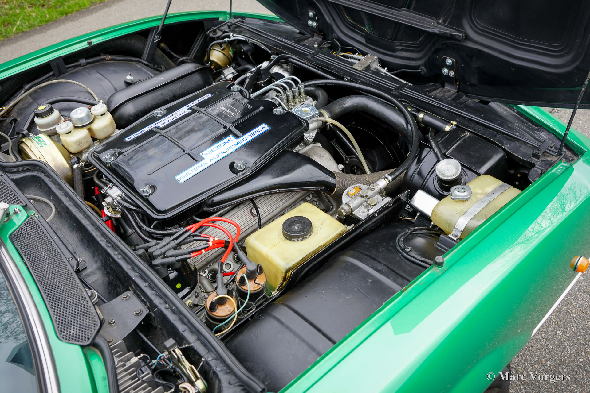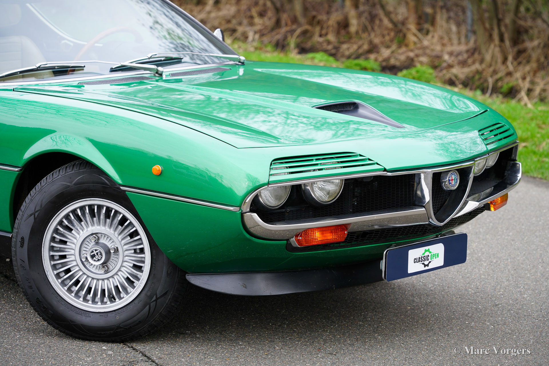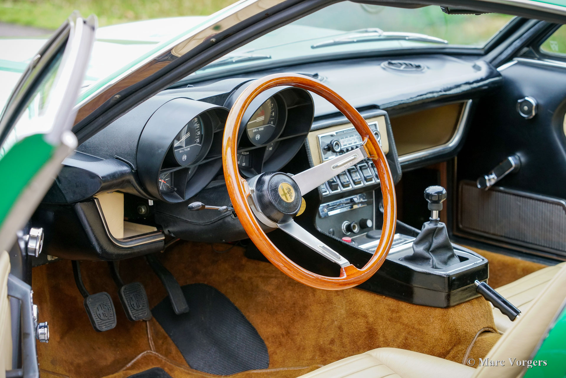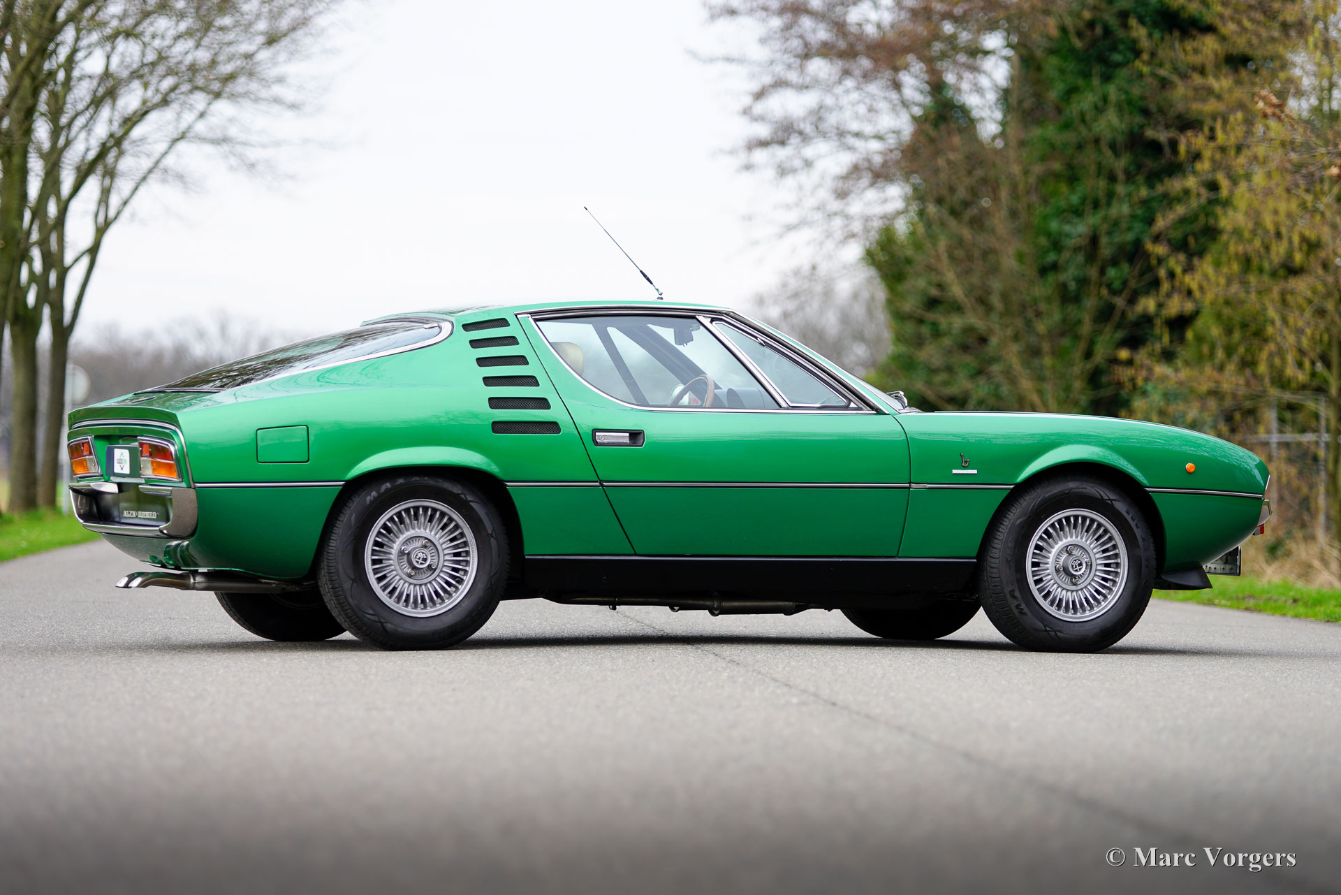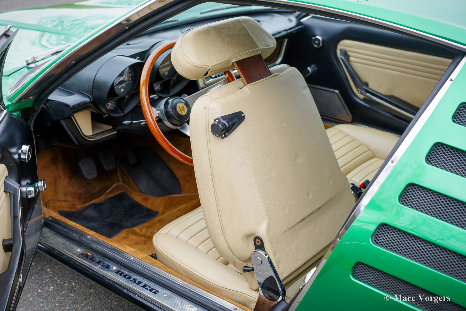 Alfa Romeo Montreal, jaar 1974. Kleur groen metallic (verde medio AR223) gecombineerd met een beige lederen interieur en cognacbruin tapijt. Deze prachtige Alfa Romeo Montreal is afkomstig van een veeleisende verzamelaar en de auto verkeert in een excellente conditie! In de periode 2017-2020 is de auto op hoog niveau gebracht. De motor is volledig gereviseerd en opnieuw opgebouwd, het SPICA-brandstofinjectiesysteem is gereviseerd door ‘s werelds beste specialist in de VS, en het onderstel is opgewaardeerd met een ‘Montreal-handlingkit’ ontwikkeld door voormalig Autodelta-coureur en ophangingsspecialist Harvey-Bailey. Verder zijn de aandrijflijn en de remmen gereviseerd, zijn de Bosch benzinepompen vervangen door Walbro pompen en is de uitlaat vernieuwd. De carrosserie is op een aantal plaatsen gerestaureerd en voorzien van prachtige nieuwe lak, de stoelen zijn opnieuw bekleed met beige leer en de dashboard instrumenten zijn gereviseerd. De kosten voor al deze verbeteringen tellen op tot ongeveer € 50.000. Het is niet moeilijk te begrijpen dat deze Alfa Romeo Montreal perfect rijdt en stuurt! De V8 klinkt indrukwekkend en de 5-versnellingsbak van ZF schakelt geweldig! De wegligging en de rijbeleving zijn een prachtige balans tussen sportiviteit en comfort. Oh, wat houden wij van deze auto's! De Montreal werd door Bertone ontworpen als conceptauto voor de toekomst (gebaseerd op de Alfa Romeo Tipo 33 racewagen) en tentoongesteld op de Canadese Wereldshow in Montreal in 1967. In 1970 materialiseerde het concept in de vorm van de Alfa Romeo Montreal met een 200 pk. versie van de Tipo 33-motor vooraan gemonteerd. De Alfa Romeo Montreal is een schitterende ‘Gran Turismo’ die in staat is lange afstanden af te leggen met hoge snelheden, met voldoende comfort voor de passagiers en voldoende ruimte voor hun bagage. De Montreal accelereert van 0-100 km/u in 7,1 seconden en haalt een topsnelheid van 220 km/u: superauto prestaties voor een GT in de jaren zeventig! De Alfa Romeo Montreal is een fantastische rijdersauto en goede exemplaren zijn tegenwoordig zeer gezocht. Een zeldzame auto waarvan slechts 3925 exemplaren zijn gebouwd. De gepresenteerde Montreal is een uitstekend exemplaar voor de serieuze Alfa Romeo-liefhebber.