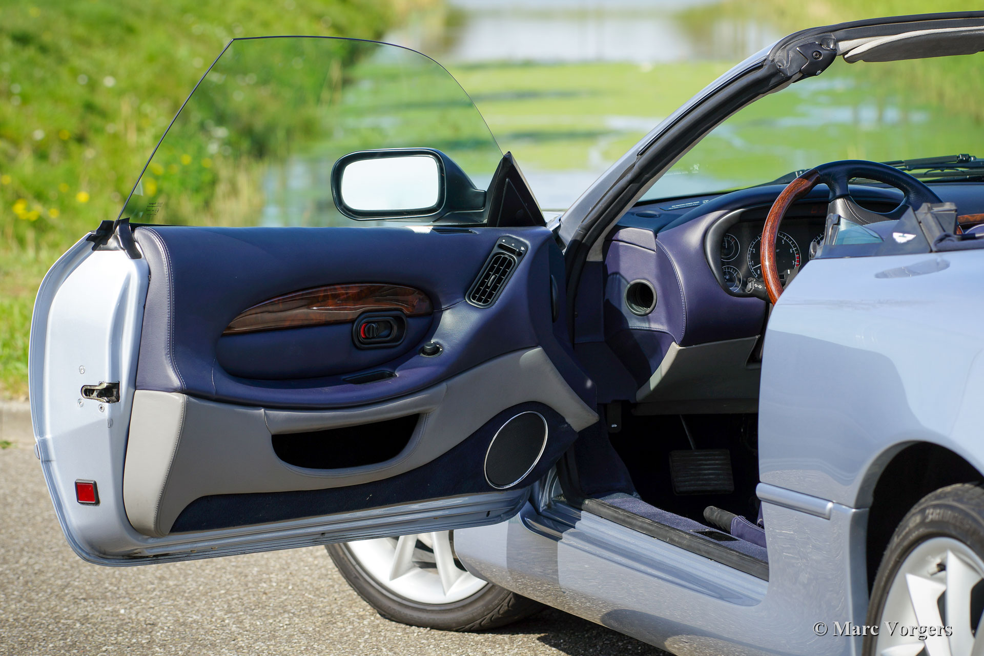 Aston Martin Vantage Volante, jaar 2000. Exterieurkleur ‘Islay Blue metallic’ gecombineerd met een tweekleurig grijs-blauw lederen interieur afgewerkt met blauw tapijt. Donkerblauwe mohair cabrioletkap en kapafdekking. Deze schitterende Aston Martin DB7 Vantage Volante is afkomstig van de 3e eigenaar en de auto verkeert in een uitstekende originele conditie! De auto heeft vanaf nieuw 73.000 kilometer gereden, de auto rijdt, stuurt en voelt nog altijd als een nieuwe auto. De 5,9 liter V12-motor is een zeer krachtige machine. Het vermogen wordt via een automatische versnellingsbak met 4 versnellingen op de achterwielen overgebracht. Deze krachtige sportwagen met achterwielaandrijving vraagt om een ervaren bestuurder. De DB7 Vantage is een fantastische en comfortabele cruiser en er is voldoende vermogen beschikbaar als u in de stemming bent om een beetje te spelen. Deze zeer exclusieve Aston Martin is voorzien van vele opties en de auto is uitgerust met zeer fraaie originele lichtmetalen wielen. De originele instructieboekjes zijn aanwezig. Deze schitterende Aston Martin DB7 Vantage Volante vertoont slechts minimale gebruikssporen, een prachtig exemplaar!