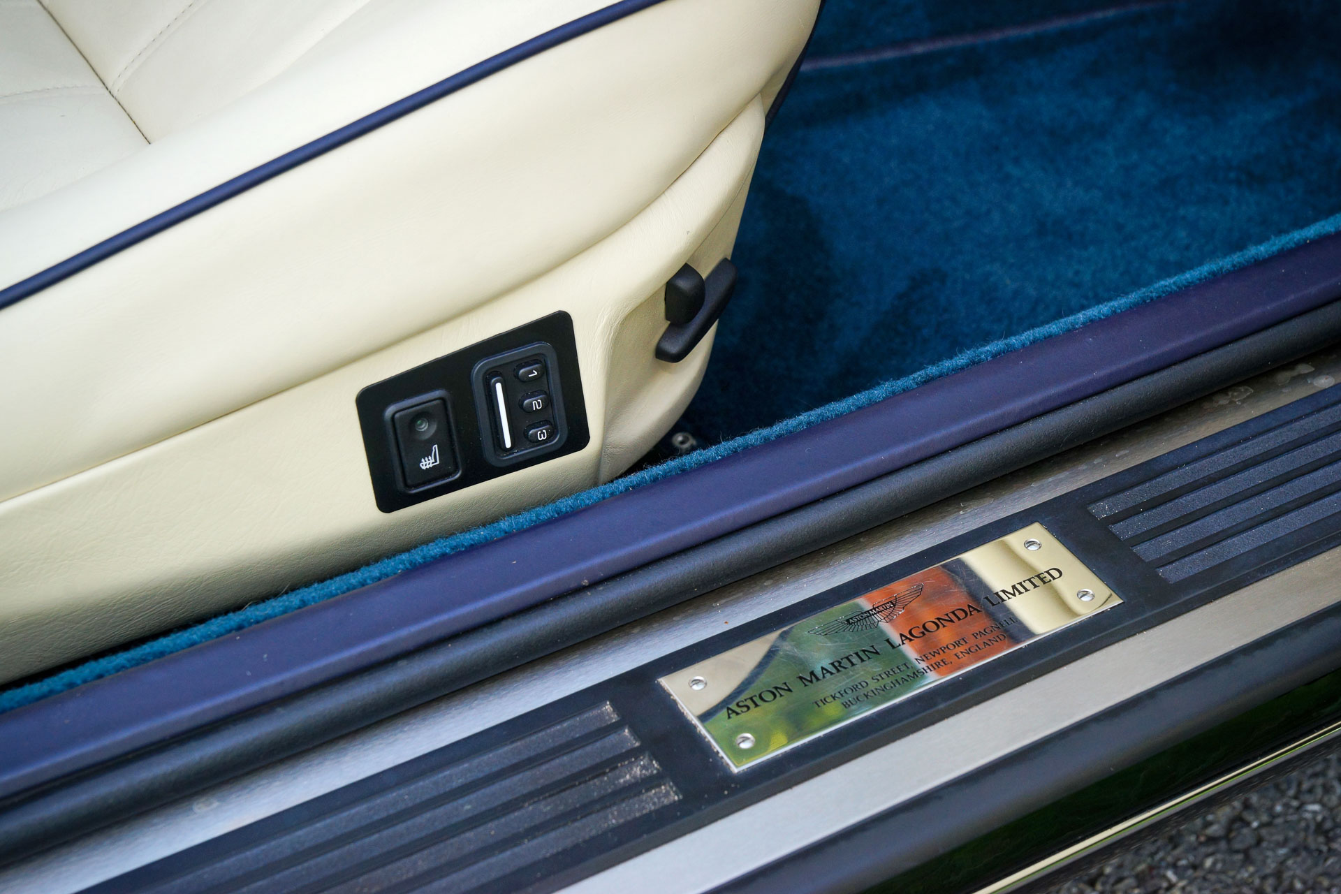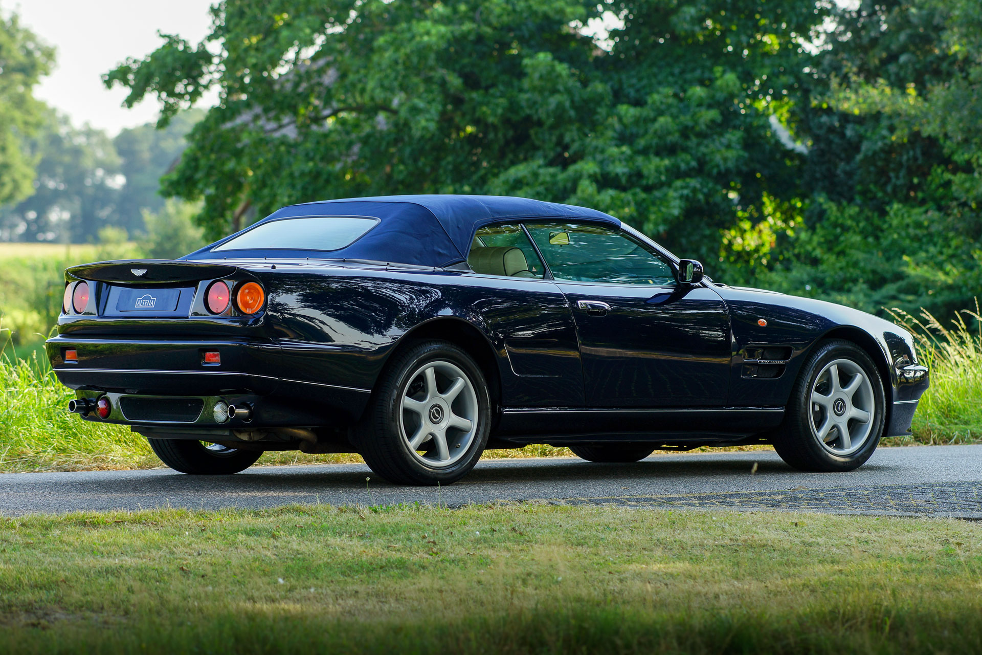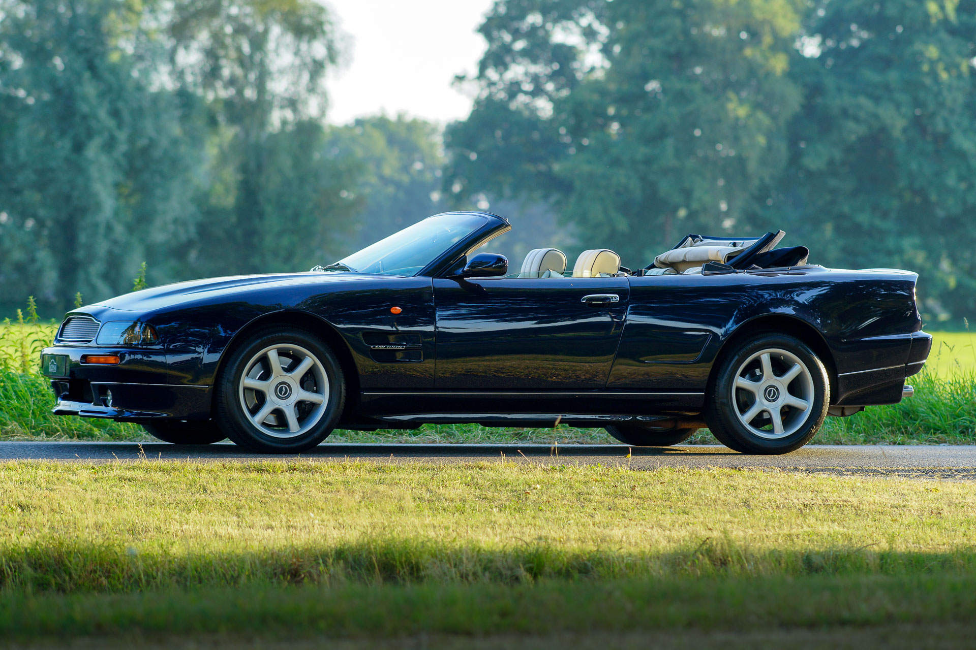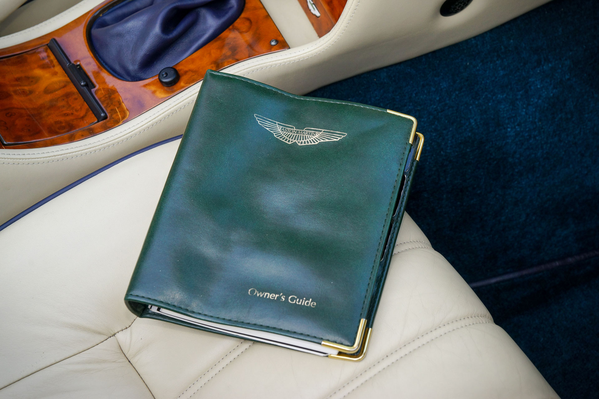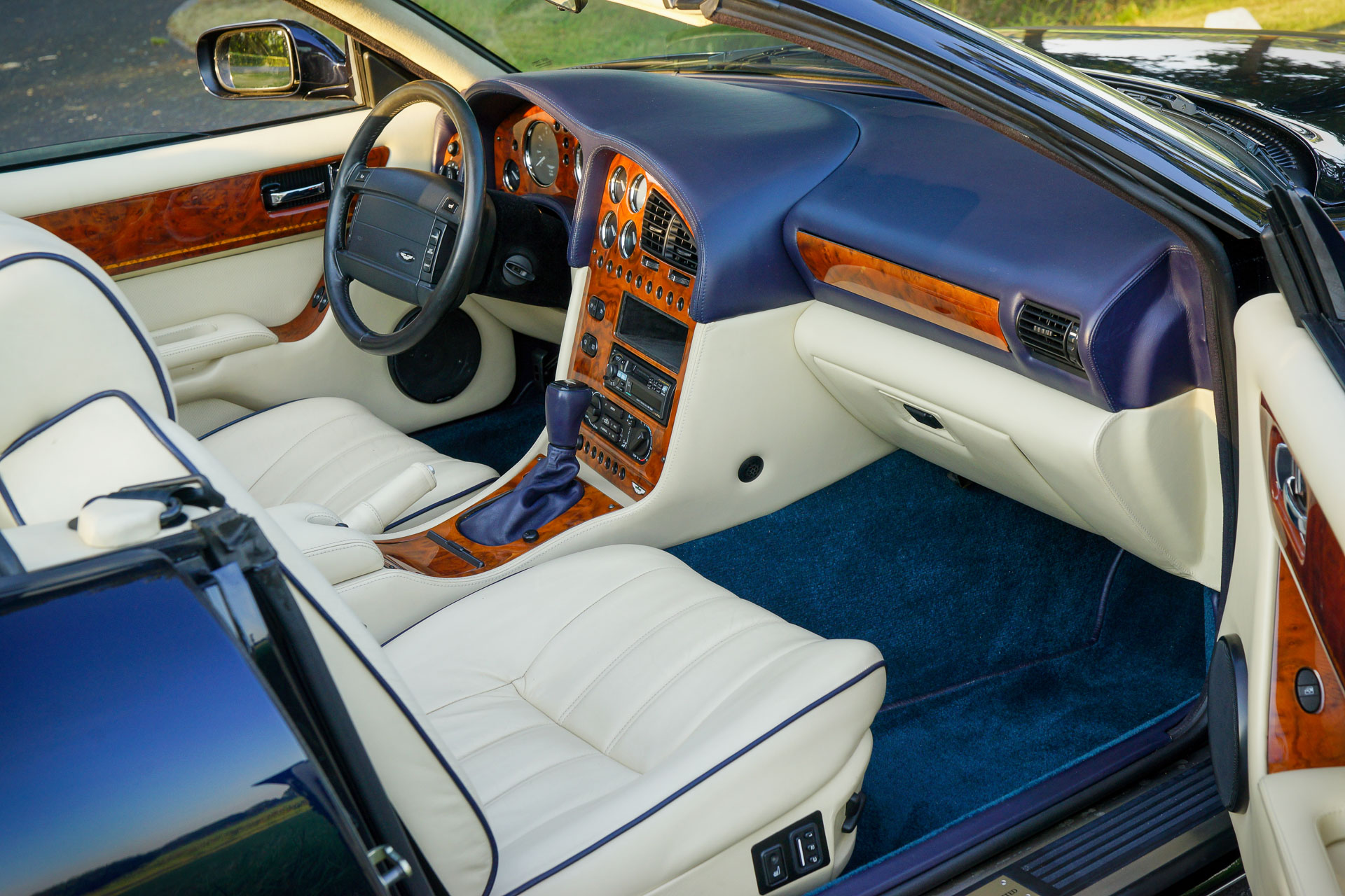 (lichtbeige) lederen interieur afgezet met donkerblauwe piping. Donkerblauw tapijt, donkerblauwe mohair softtop en een donkerblauwe leren kapafdekking. Dit is een zeldzame linksgestuurde Aston Martin V8 Volante. De automobiel heeft vanaf nieuw slechts 38.000 kilometer gereden en de auto verkeert in een sublieme originele topconditie! De auto is voorzien van opties als elektrisch bedienbare zijruiten, een elektrisch bedienbaar dak, stoelen met geheugenfunctie, stoelverwarming, een stereo-installatie en nog veel meer luxe. Deze prachtige Aston Martin rijdt perfect, de V8-motor heeft veel vermogen en klinkt indrukwekkend. De automatische versnellingsbak schakelt soepel, stil en nauwkeurig. De auto wordt compleet geleverd met de originele gebruikershandleiding en documentatie. Dit is een topexemplaar!