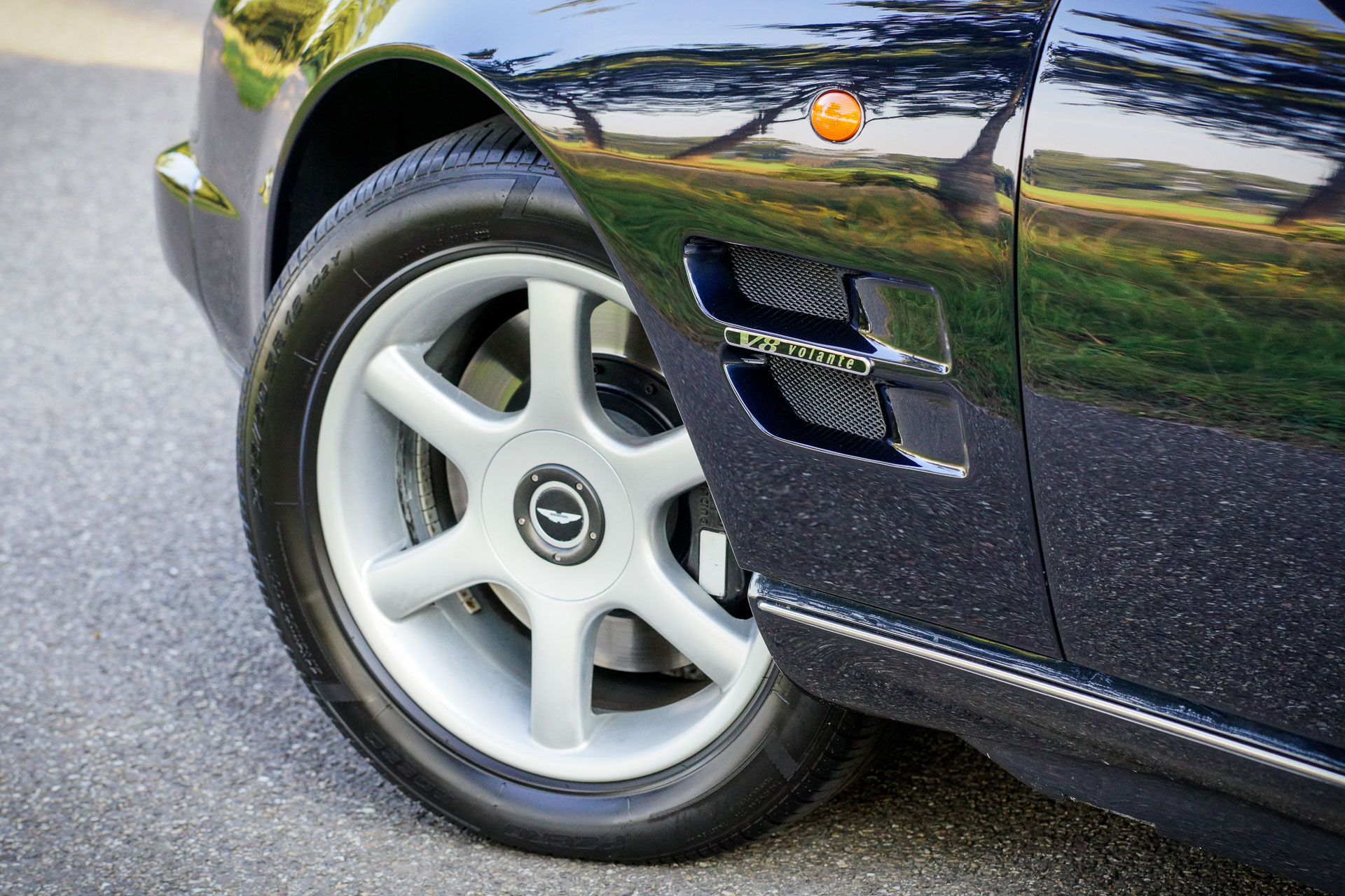 Aston Martin V8 Volante, jaar 1999. Kleur donkerblauw metallic gecombineerd met een Magnolia
