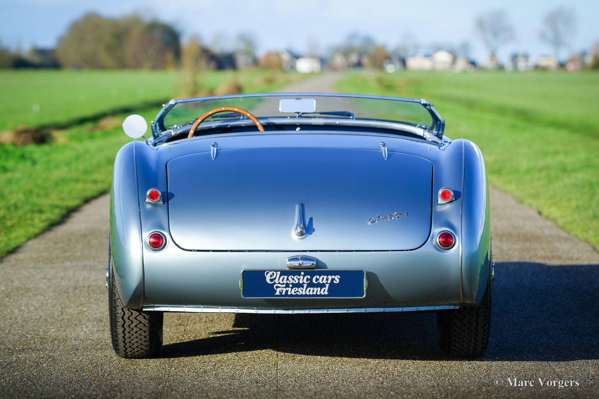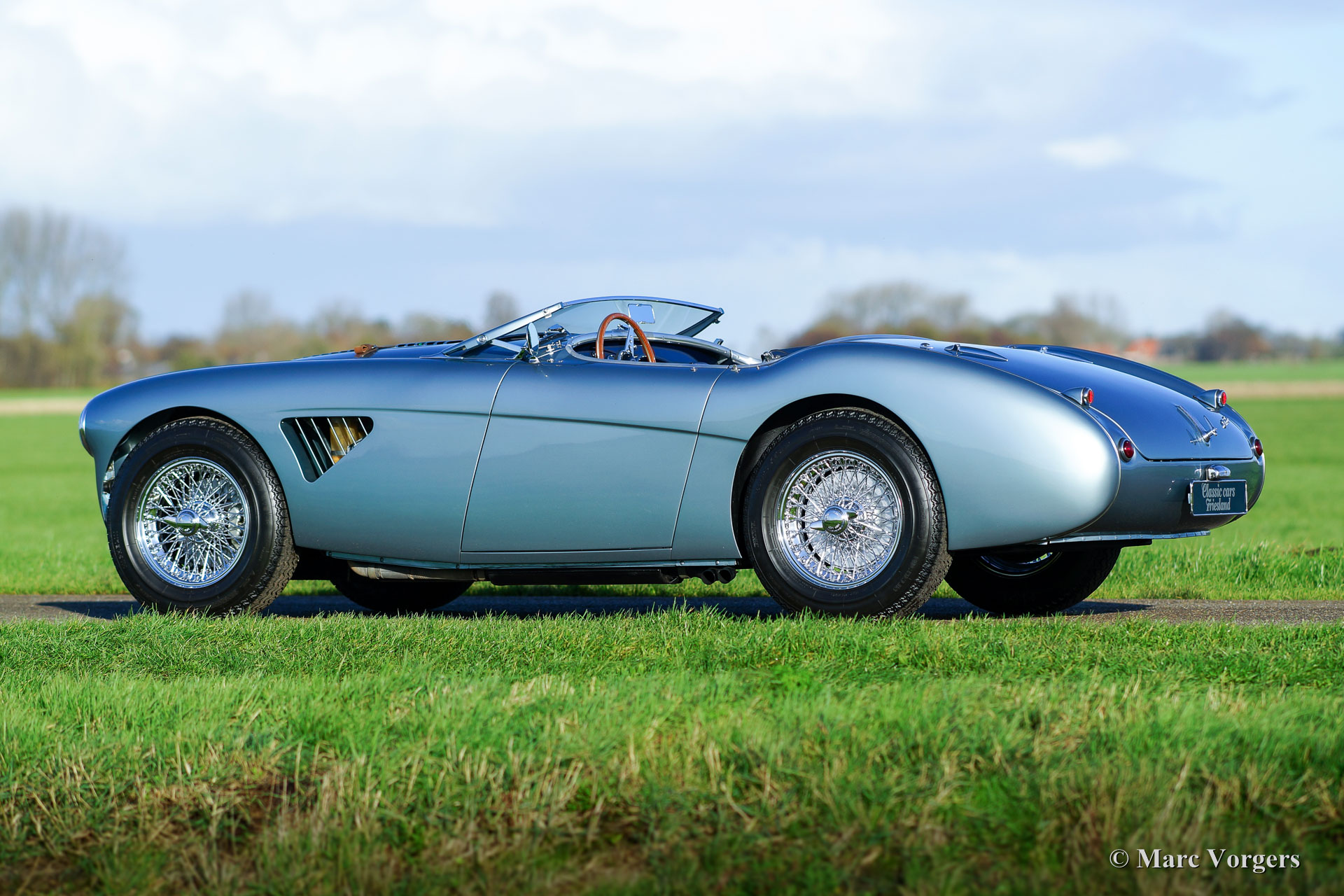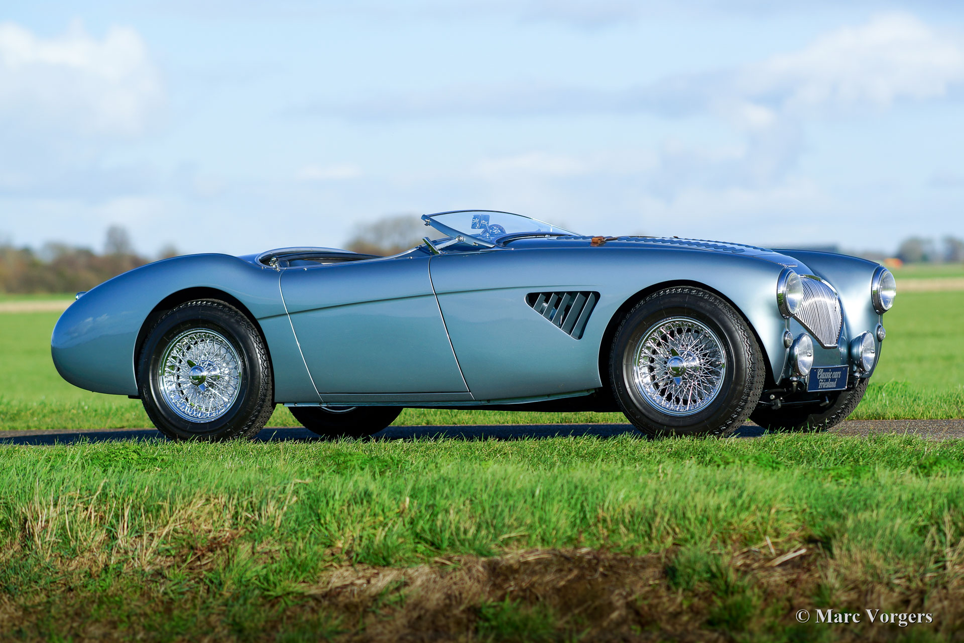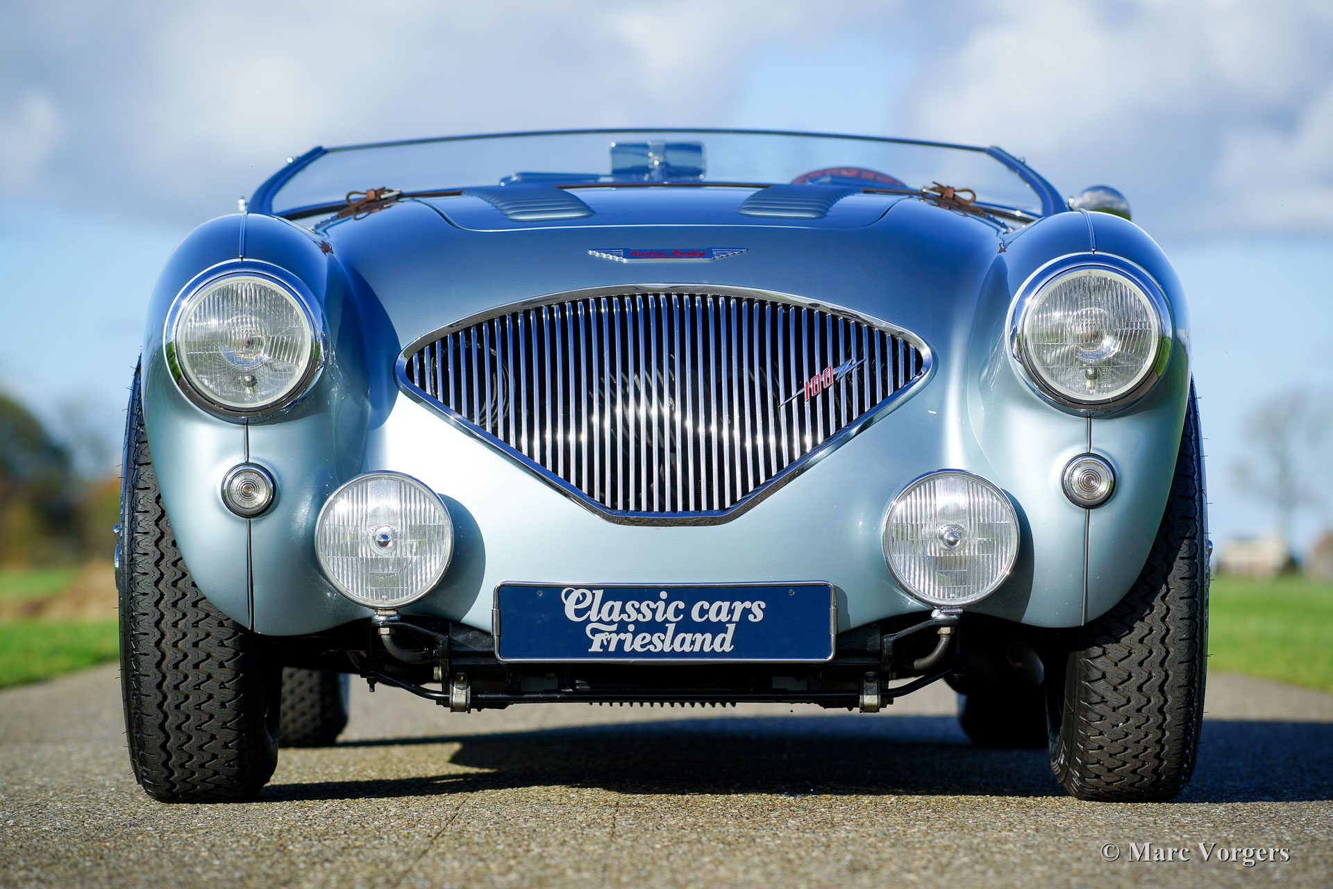 Austin Healey 100/4 ‘M’ - Le Mans’, jaar 1954. Kleur Ice-Blue metallic met een donkerblauw leren interieur en donkerblauw tapijt. Blauwe soft-top en een blauwe mohair tonneau-cover. Deze fantastische Austin Healey 100/4 ‘M’ heeft ‘matching numbers’ en ‘matching colours’ een Heritage certificaat met originele afleverspecificaties is aanwezig. De auto verkeert in sublieme topstaat; concours! Deze bijzonder fraaie 100/4 ‘M’ is in de jaren 2004-2007 uitvoerig en perfect gerestaureerd in Nederland. Er is een uitgebreid dossier aanwezig met vele rekeningen van de restauratie en revisie. Deze 100/4 is tijdens de restauratie uitgevoerd naar de Le Mans ‘M’ specificaties: De Healey is voorzien van een motorkap met louvres en een leren riem, ‘geflowde’ aluminium ‘M’ cilinderkop, een ‘M’ nokkenas, competitie koppakking en een ‘M’ uitlaatspruitstuk. Verder is de auto uitgerust met een ‘side-pipe’ uitlaat, elektrische benzinepomp, hoog-rendement radiator, elektrische Kenlow koelventilator, wisselstroom dynamo, 123 elektronische ontsteking, een aluminium carterpan, vierversnellingsbak met overdrive, een high-torque startmotor, schijfremmen aan de voorwielen, een gescheiden remsysteem, chroom spaakwielen en Michelin banden. De auto is verder compleet met nieuwe insteek-zijruiten en het originele boordgereedschap. Dit is een fantastisch rijdende Austin Healey 100 naar Le Mans ‘M’ specificaties in topstaat.