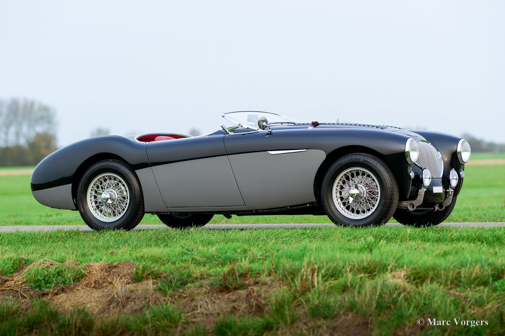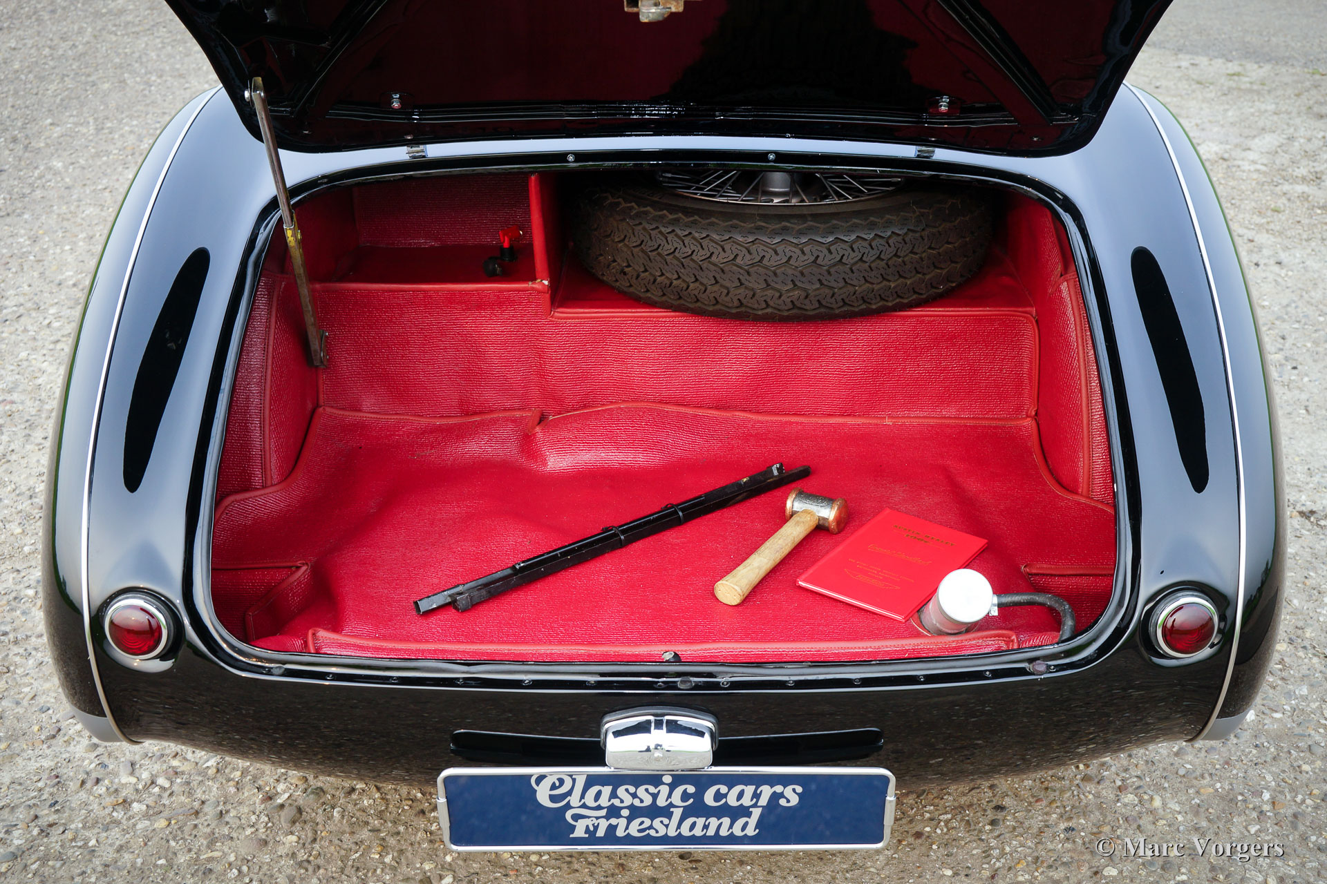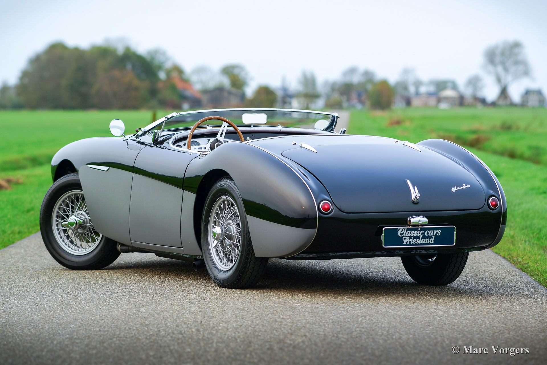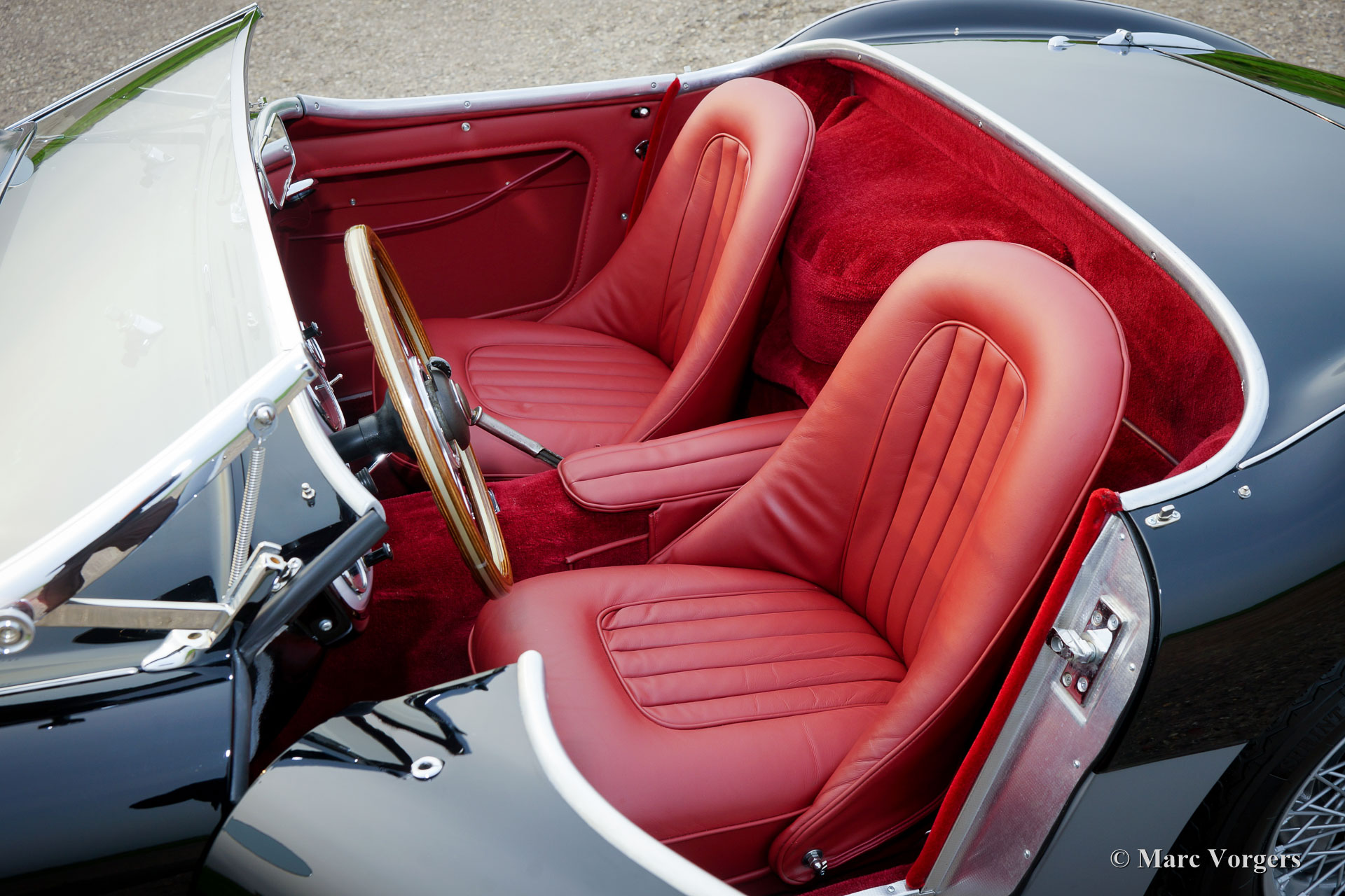 Austin Healey 100/4 ‘M -Le Mans’ BN2, jaar 1955. Kleur zwart met grijze flanken en een roodleren interieur met rood tapijt. Rode soft-top en een rode mohair tonneau-cover. Deze geweldige Austin Healey 100/4 ‘M’ is in de jaren 2014-2017 volledig gerestaureerd door een Healey 100 specialist in Nederland, deze ‘Big Healey’ verkeert in sublieme TOPSTAAT – beter dan nieuw met geweldige passingen van het plaatwerk! Een uitgebreide fotoreportage van de restauratie is aanwezig. Sinds de voltooiing van de restauratie heeft deze ‘Big Healey’ 5292 mijl gereden. Tijdens de restauratie is deze fraaie 100/4 gemodificeerd naar Le Mans ‘M’ specificaties. De auto is voorzien van louvres in de motorkap, een leren riem over de motorkap, een aluminium cilinderkop met grotere kleppen, twee SU H6 carburateurs met ‘M’ air-box en een speciale ‘M‘-nokkenas. De motor is volledig gereviseerd en verbeterd door de Engelse specialist Denis Welch. De auto is uitgerust met de volgende upgrades: schijfremmen aan de voorwielen, 123 elektronische ontsteking, High-Torque startmotor, aluminium benzinetank, radiateur met hogere capaciteit, wisselstroomdynamo, Lucas mistlampen, zilver gelakte spaakwielen en Vredestein Classic banden. Verder is de auto voorzien van een fraai MotoLita sportstuur met houten rand. De auto is compleet met nieuwe insteek-zijruiten en origineel boordgereedschap. Deze magnifieke Austin Healey 100/4 ‘M’ rijdt en klinkt indrukwekkend goed; een zeldzaam topexemplaar!
