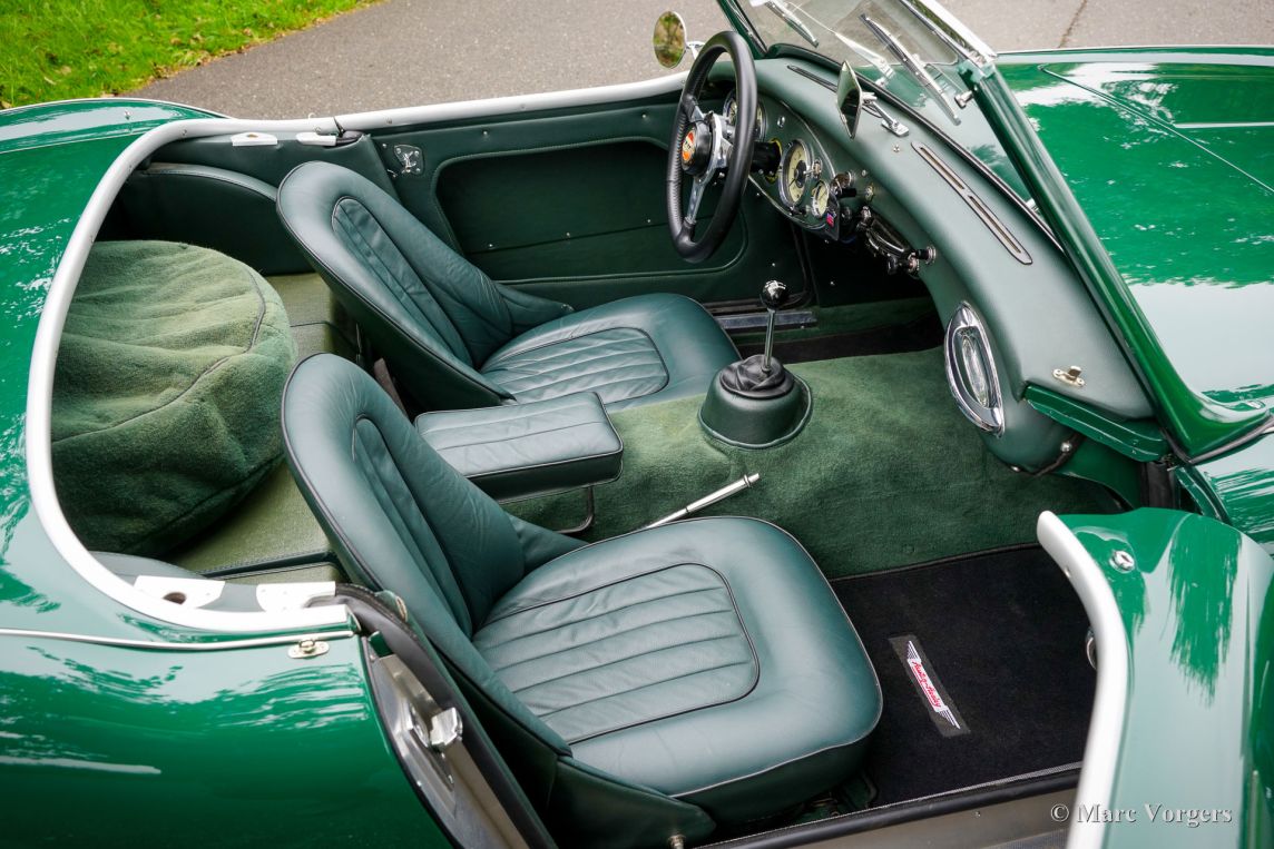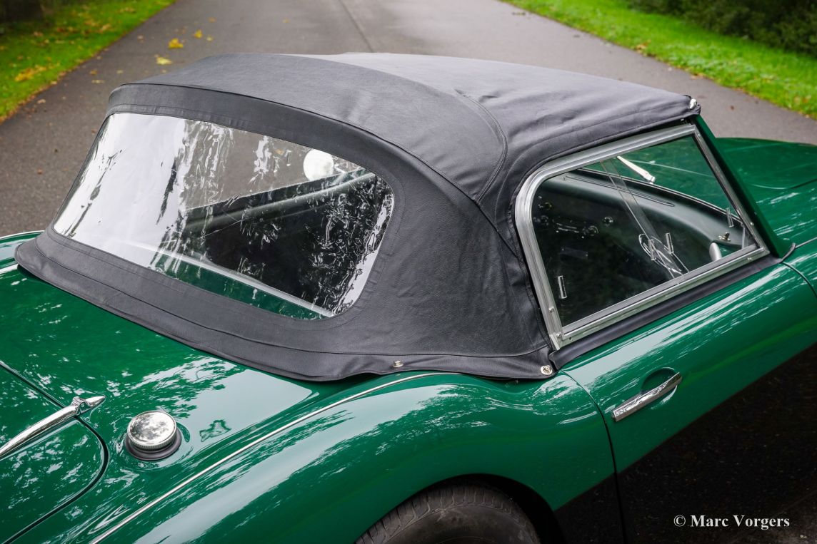 Austin Healey 100/6 (BN6) ‘tweezitter’, jaar 1958. Carrosseriekleur British Racing Green boven zwart gecombineerd met een donkergroen lederen interieur afgewerkt met zwarte biezen en licht groen tapijt. Zwarte vinyl soft-top en een zwarte mohair tonneaucover. Deze fantastische ‘Big Healey’ is in de periode 2020-2022 uitgebreid gerestaureerd en gereviseerd. Na voltooiing van de restauratie is er spaarzaam met de auto gereden. Deze fraaie Austin Healey 100 ‘SIX’ verkeert in een excellente conditie en de auto rijdt perfect! Geen matching numbers auto (de motor is in het verleden vervangen), maar een ‘Big Healey’ die aan alle wensen voldoet! Het betreft een tweezitter met de motor van een 3000 Mk III, voorzien van de grote SU-carburateurs en een ‘center-shift’ versnellingsbak met overdrive. De auto is ook voorzien van schijfremmen op de voorwielen, een wisselstroomdynamo en elektronische ontsteking. De 150 pk sterke motor draagt met zijn enorme koppel enorm bij aan de rijbeleving. Het exterieur oogt vastberaden in British Racing Green met zwart. De zwarte spaakwielen en de grote Lucas SFT700-lampen dragen bij aan het sportieve uiterlijk, net als het ontbreken van de standaard bumpers. Nu zijn er chromen ‘bumperettes’ aan de achterzijde gemonteerd. De Austin Healey is een van de... Nee, misschien wel de mooiste Britse roadster ooit gemaakt! Dit exemplaar is een geweldige aanwinst om te bezitten en in uw garage te koesteren, en een fantastische rijdersauto om volop van te genieten!