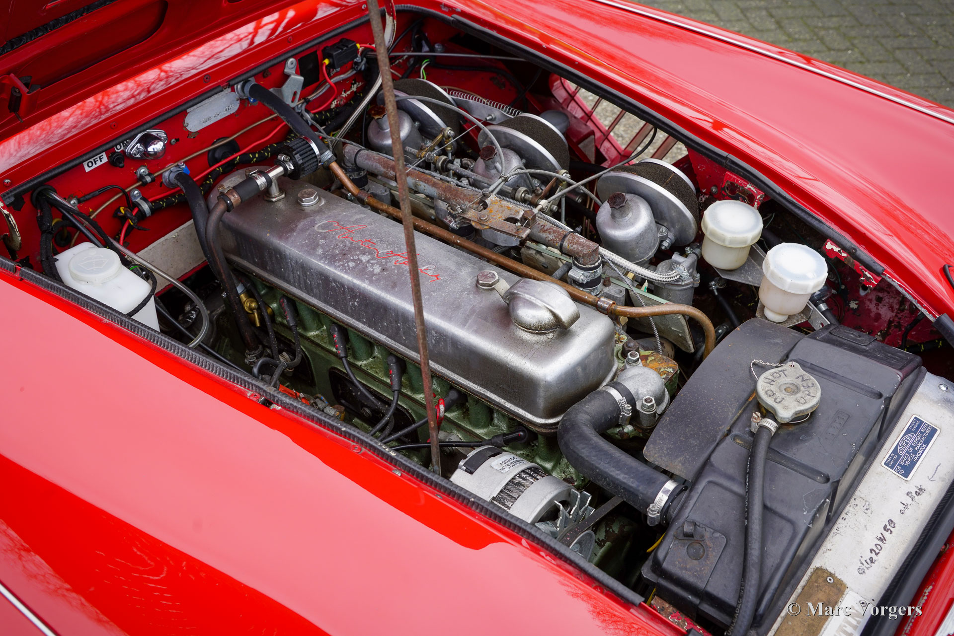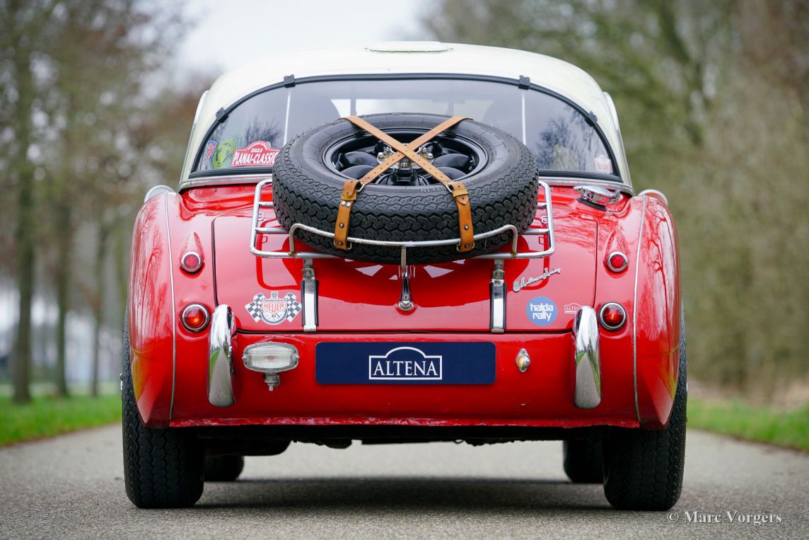 Austin Healey 100/6, bouwjaar 1958. Kleur rood met een crème witte hard-top en een zwart/antraciet rallyinterieur. Deze fantastische Austin Healey rallyauto is in het verleden volledig en prachtig rally geprepareerd door een specialist in Nederland. Kosten noch moeite zijn gespaard om een ideale rallyauto te creëren. De motor is intern verbeterd, er zijn drie carburateurs gemonteerd, het onderstel is verbeterd, het elektrische systeem is geüpgraded, er zijn navigatie-instrumenten gemonteerd, er zijn verstralers en mistlampen voor gemonteerd en een achteruitrijlamp aan de achterkant. Verder zijn er zwartgelakte Minilite wielen gemonteerd en Vredestein Sprint Classic banden. De Austin Healey is altijd een competitieve race- en rallyauto geweest. Dit schitterende exemplaar is zeer krachtig, klinkt voortreffelijk dankzij de speciale zijuitlaat en de auto rijdt indrukwekkend goed. De nieuwe eigenaar zal onder de indruk zijn van de sportieve kwaliteiten van deze ‘Big Healey’. De automobiel verkeert in een zeer goede staat en is klaar om door een enthousiaste (rally)rijder en navigator te worden bereden. Deze Austin Healey rallyauto kan worden ingezet in alle geschikte Europese historische rally/ ‘regularity’ evenementen.