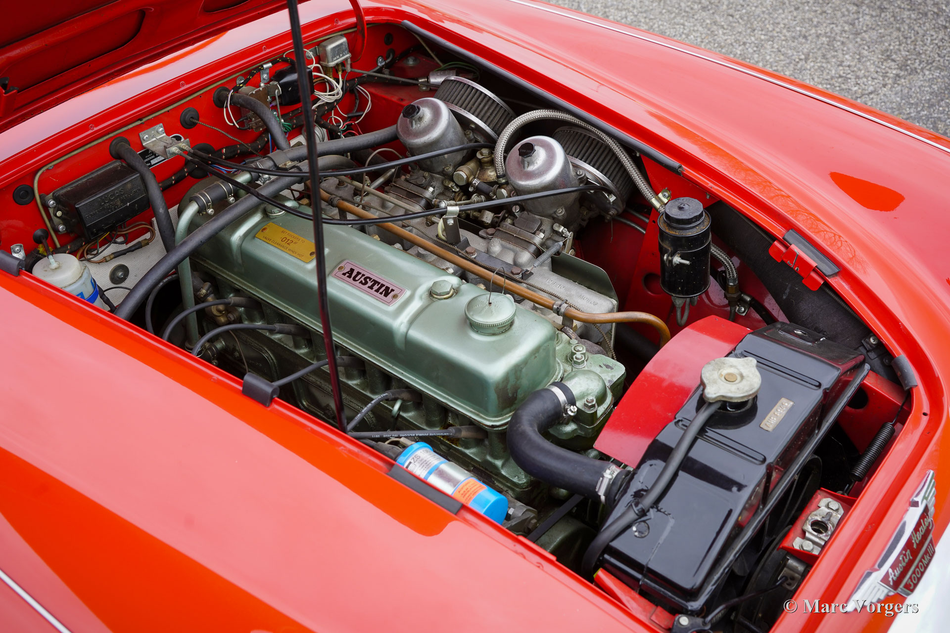 Austin-Healey 3000 Mk III fase 2, jaar 1968. Chassisnummer HBJ8-L/42999. Exterieur gelakt in Colorado rood, gecombineerd met een zwartlederen interieur met rode biezen en zwarte vloerbedekking. Voorzien van een zwarte soft-top en bijpassende afdekhoes. Deze magnifieke ‘Big Healey’ komt uit de laatste fase 2-serie en werd gebouwd in november 1967. Vervolgens werd de auto verscheept naar Philadelphia, VS, waar hij in februari 1968 voor het eerst werd geregistreerd. Na dit Mk III fase 2-exemplaar werden er nog slechts 27 auto's geproduceerd, waarvan de allerlaatste in maart 1968 de fabriek verliet. De auto werd later geïmporteerd naar Nederland, waar hij sinds 1995 slechts één eigenaar heeft gehad. Dit prachtige exemplaar onderging 25 jaar geleden een uitgebreide restauratie van topkwaliteit. De werkzaamheden werden uitgevoerd volgens de hoogste normen en de eigenaar heeft de auto sindsdien met uitzonderlijke zorg onderhouden; deze Healey verkeert nog steeds in sublieme staat. De Austin-Healey 3000 Mk III is het meest comfortabele en luxueuze model van de ‘Big Healey’-serie. Het model is voorzien van een gemakkelijk te bedienen cabriokap, handmatig bedienbare ramen en een verfijnd interieur met een dashboard van walnotenhout. De krachtige en betrouwbare 3000 cc zescilinder-lijnmotor, uitgerust met dubbele S.U.-carburateurs, loopt en klinkt prachtig, terwijl de versnellingsbak met overdrive soepel en nauwkeurig schakelt. Dit exemplaar heeft veel fraaie originele details behouden en is uitgerust met gewilde opties, waaronder chromen spaakwielen met Michelin XVS 185-15 banden, een Moto-Lita stuurwiel met houten rand, K&N sportluchtfilters, elektronische ontsteking, een elektrische koelventilator, een wisselstroomdynamo en een ANSA-uitlaatsysteem. Deze Austin-Healey uit de laatste Mk III fase 2-serie is een werkelijk uitzonderlijk exemplaar voor de veeleisende liefhebber.