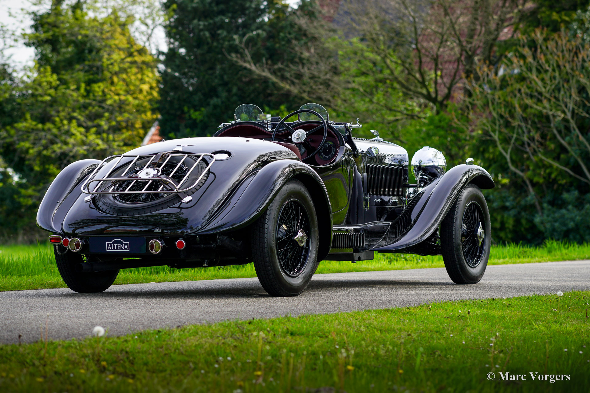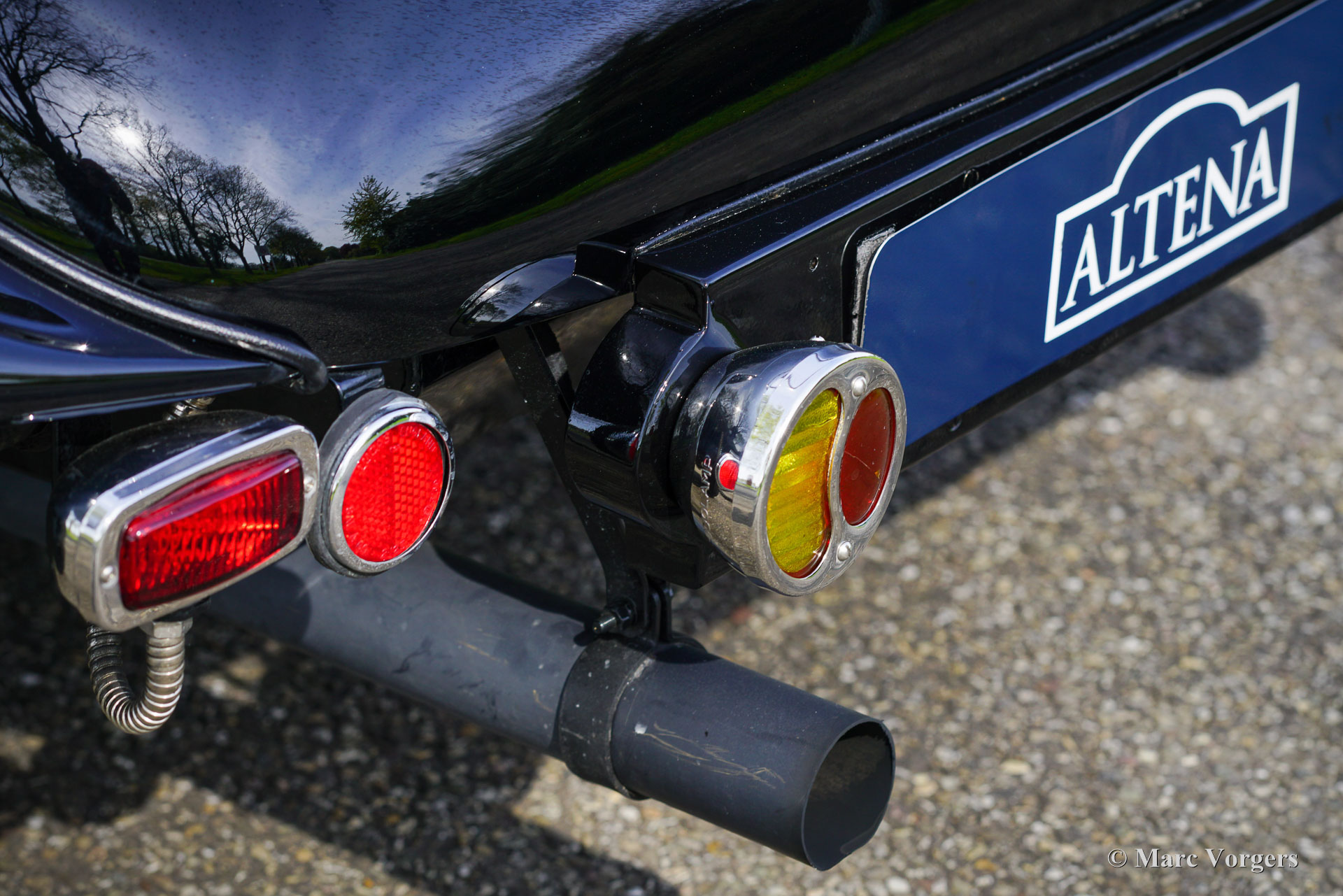 Bentley Alpine Special, gebouwd door Racing Green Engineering in het jaar 2013, chassisjaar 1951. Kleur zwart gecombineerd met een roodlederen interieur en rood wollen tapijt. Zwarte mohair soft-top en hood-cover. Deze prachtige Bentley Alpine Special is tot in de perfectie gebouwd door het gerenommeerde bedrijf Racing Green Engineering in het Verenigd Koninkrijk. De gloednieuwe speciale ‘Alpine’ carrosserie is gecombineerd met een volledig gerestaureerd en gereviseerd Bentley Mk VI-chassis uit 1951. Alle mechanica zoals de versnellingsbak, achteras, remmen, ophanging etc. zijn gereviseerd en of vernieuwd. De zescilinder-lijnmotor is vervangen door een indrukwekkende Bentley B81 6,5 Liter achtcilinder lijnmotor voorzien van vier S.U.-carburateurs! Sinds de voltooiing van de bouw heeft de auto 13.000 kilometer gereden. Deze schitterende en opvallende Bentley verkeert in perfecte staat; als nieuw! De auto rijdt indrukwekkend. De remmen, de volledig gesynchroniseerde versnellingsbak met vier versnellingen en de besturing zijn zeer eenvoudig te bedienen. Deze magnifieke Bentley Alpine is een zeer indrukwekkende machine, hij ziet er geweldig uit, hij rijdt comfortabel, de motor is zeer krachtig en de hoge rijpositie is een genot! De automobiel is voorzien van gelakte 21-inch spaakwielen met Excelsior 6.00 x 21 banden en een chromen bagagerek. De auto heeft een Europese registratie, de auto kan in elk Europees land worden geïmporteerd en geregistreerd. Alle papieren en documentatie zijn bij de auto aanwezig. Deze fantastische Bentley is klaar voor elk avontuur of historisch evenement in de handen van een nieuwe eigenaar. Altena Classic Service is officieel ‘Racing Green Engineering’ servicepartner. Wij bieden al het advies, de ondersteuning en de service die u nodig heeft met betrekking tot uw klassieke Bentley.