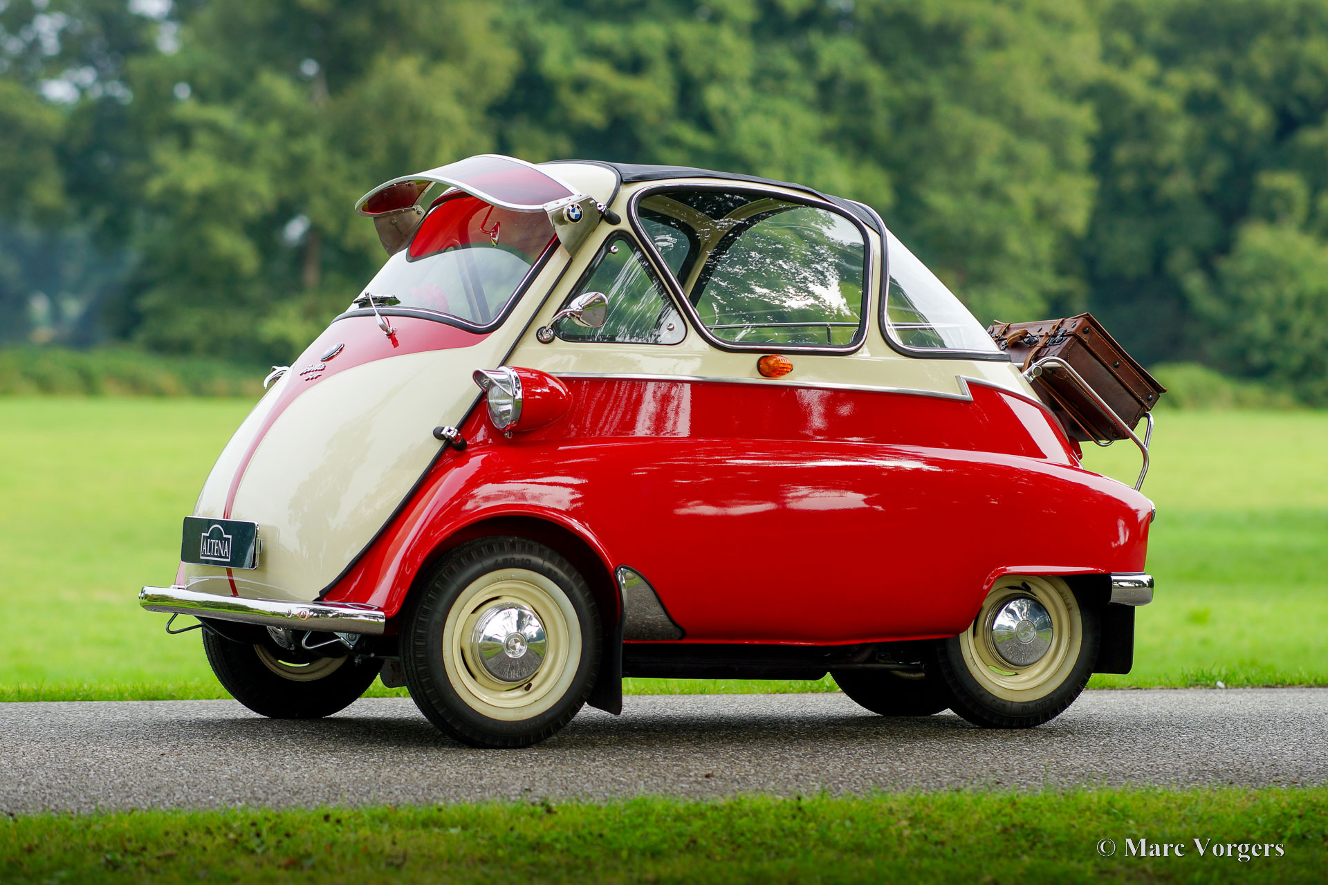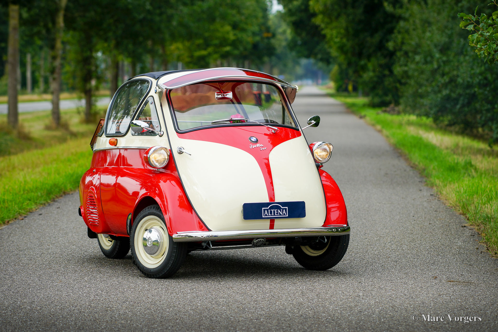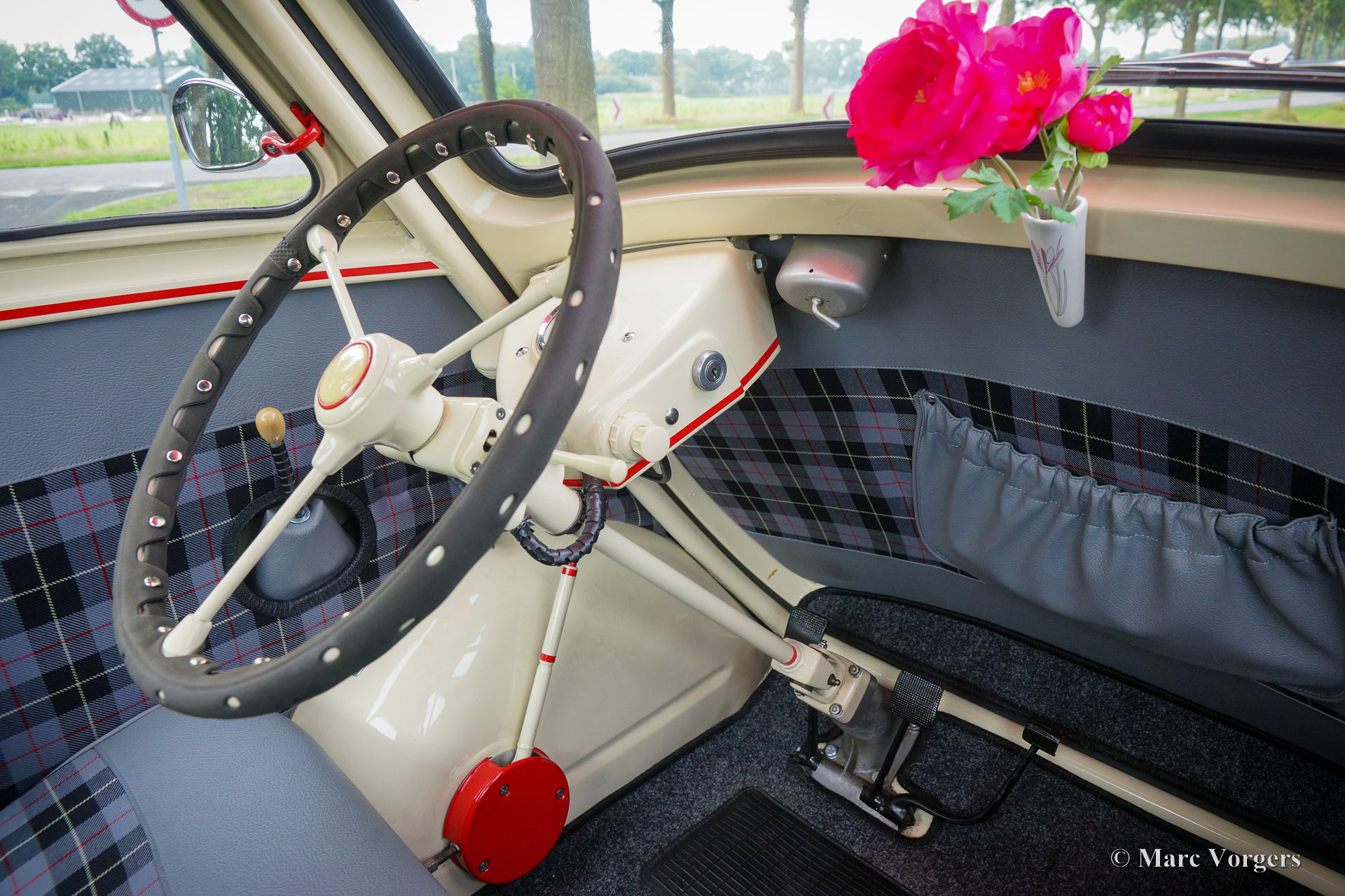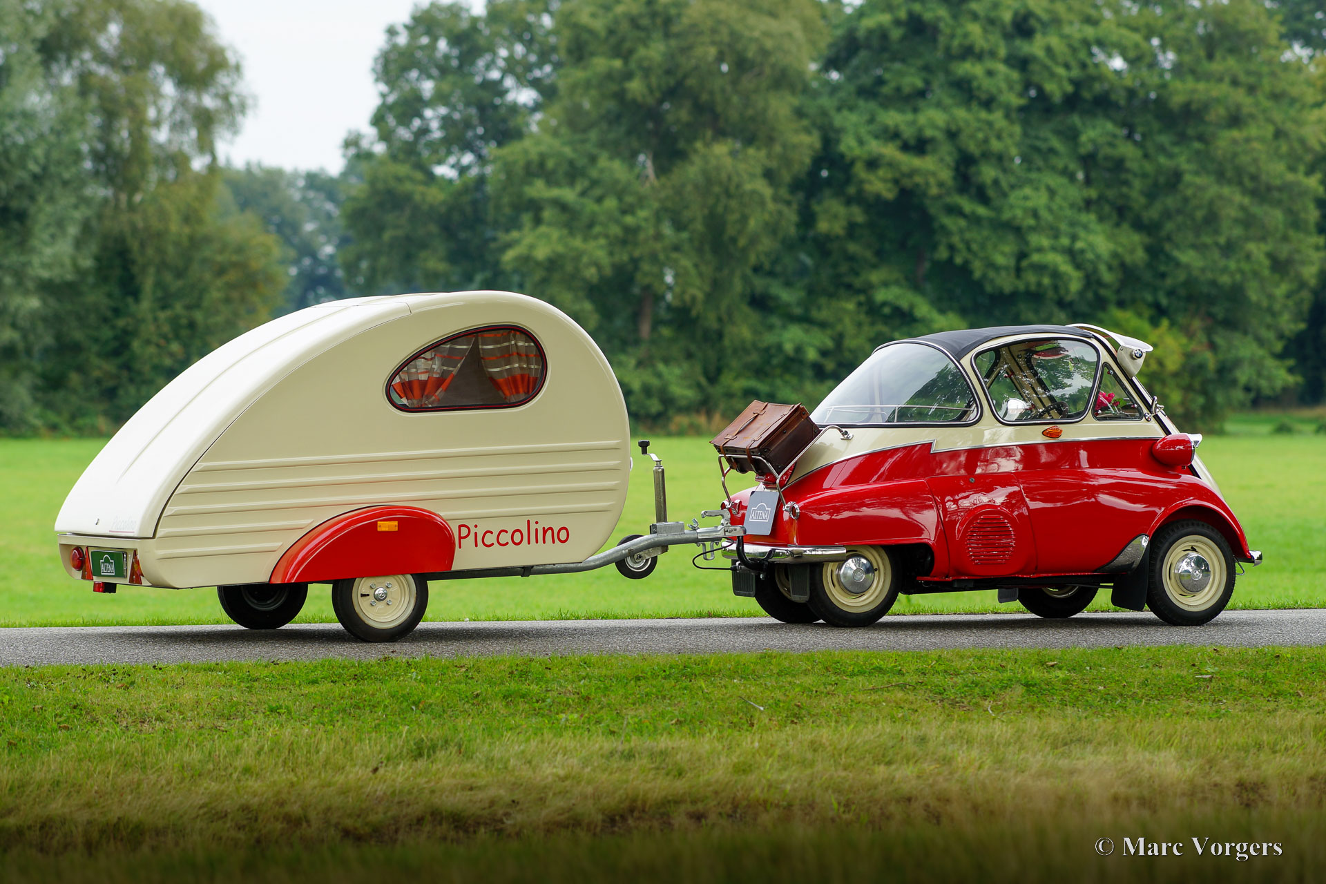 BMW Isetta 300, jaar 1957. Kleur rood met crème, gecombineerd met een grijs vinyl/stoffen interieur met een rood/crème ruitpatroon en grijs tapijt. Deze fantastische BMW Isetta 300 komt is afkomstig uit een verzameling. Deze fraaie ‘bubble car’ is recentelijk uitgebreid gerestaureerd door een gespecialiseerd bedrijf. De auto heeft 600 kilometer gereden sinds de restauratie is voltooid. De auto verkeert in een prachtige topstaat! Deze geweldige BMW Isetta is voorzien van 300 cc ééncilinder viertaktmotor en een handgeschakelde versnellingsbak. De auto toont alle originele details en enkele interessante accessoires uit de periode zoals de zonneklep, het chromen bagagerek en de spatlappen. Het betreden van deze kleine ‘bubble car’ via de voordeur is een interessante ervaring die daar niet stopt. Na het sluiten van de deur wordt men ingekapseld in de gezellige bubbel met open dak. De bedieningselementen aan de linkerkant zijn eenvoudig te bedienen en deze Isetta 300 is erg leuk om mee te rijden! Deze prachtige BMW Isetta 300 wordt compleet geleverd met de originele instructies, een leren koffer en een Piccolino mini caravan! De caravan verkeert in een splinternieuwe staat en is voorzien van een bed voor twee personen. Een unieke combinatie!