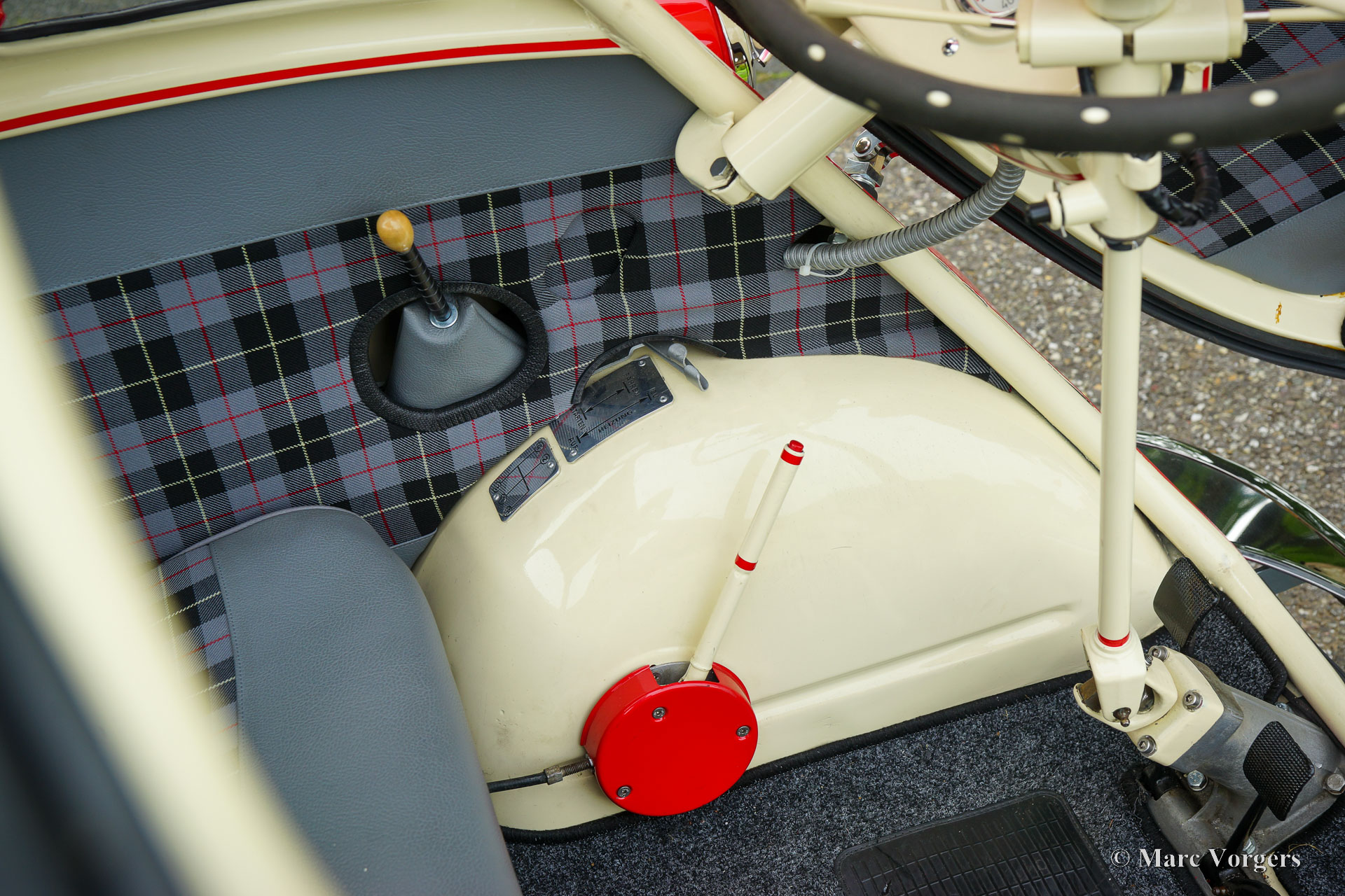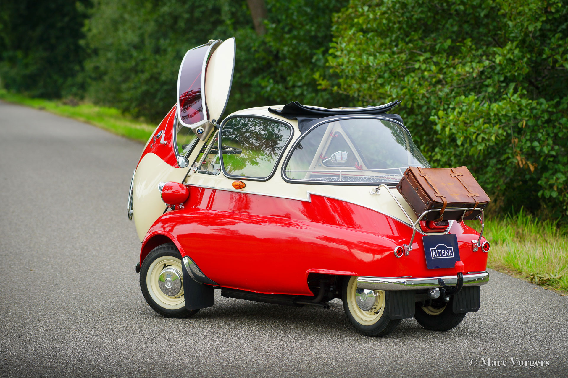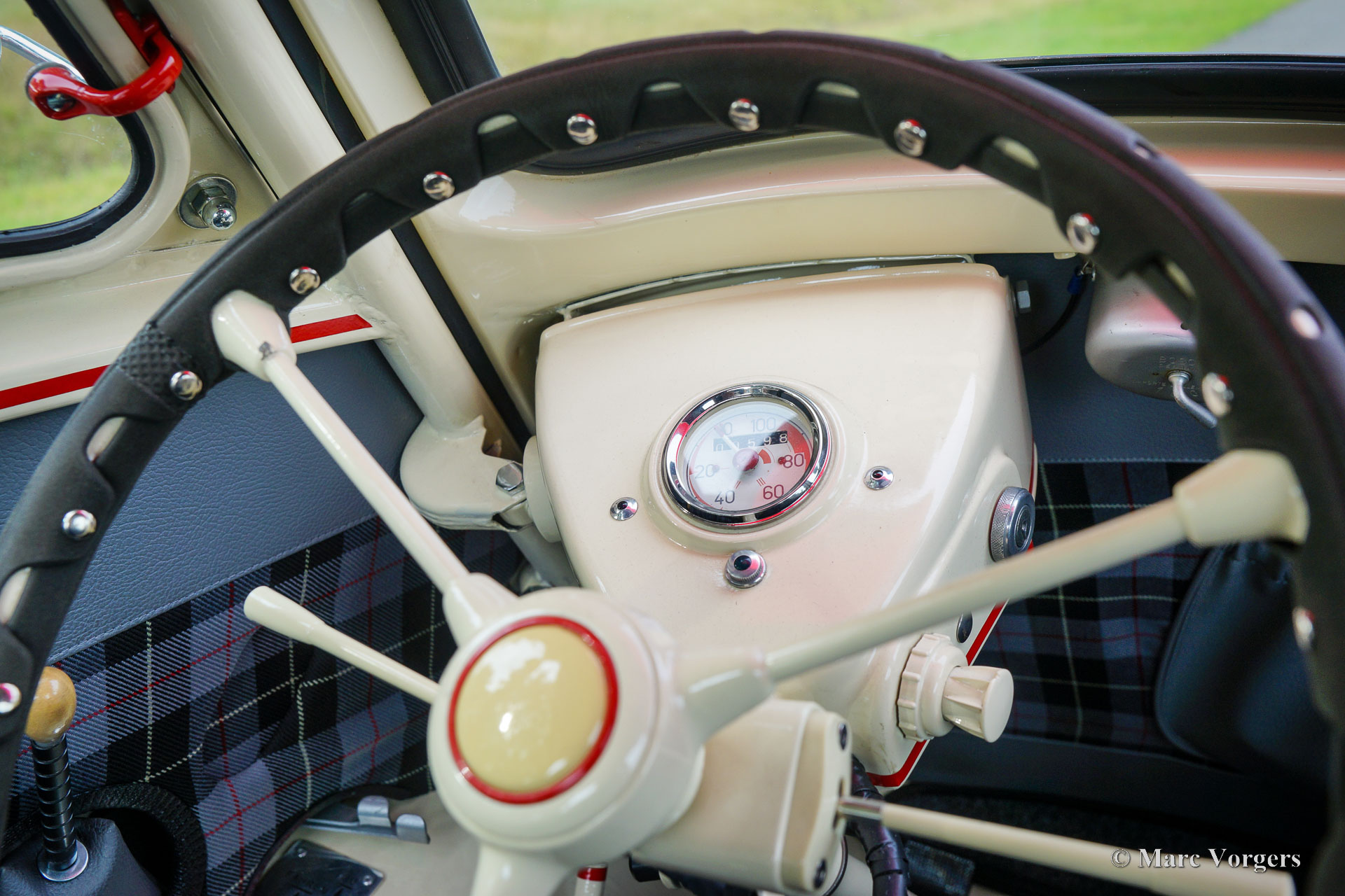 BMW Isetta 300, jaar 1957. Kleur rood met crème, gecombineerd met een grijs vinyl/stoffen interieur met een rood/crème ruitpatroon en grijs tapijt. Deze fantastische BMW Isetta 300 komt is afkomstig uit een verzameling. Deze fraaie ‘bubble car’ is recentelijk uitgebreid gerestaureerd door een gespecialiseerd bedrijf. De auto heeft 600 kilometer gereden sinds de restauratie is voltooid. De auto verkeert in een prachtige topstaat! Deze geweldige BMW Isetta is voorzien van 300 cc ééncilinder viertaktmotor en een handgeschakelde versnellingsbak. De auto toont alle originele details en enkele interessante accessoires uit de periode zoals de zonneklep, het chromen bagagerek en de spatlappen. Het betreden van deze kleine ‘bubble car’ via de voordeur is een interessante ervaring die daar niet stopt. Na het sluiten van de deur wordt men ingekapseld in de gezellige bubbel met open dak. De bedieningselementen aan de linkerkant zijn eenvoudig te bedienen en deze Isetta 300 is erg leuk om mee te rijden! Deze prachtige BMW Isetta 300 wordt compleet geleverd met de originele instructies, een leren koffer en een Piccolino mini caravan! De caravan verkeert in een splinternieuwe staat en is voorzien van een bed voor twee personen. Een unieke combinatie!
