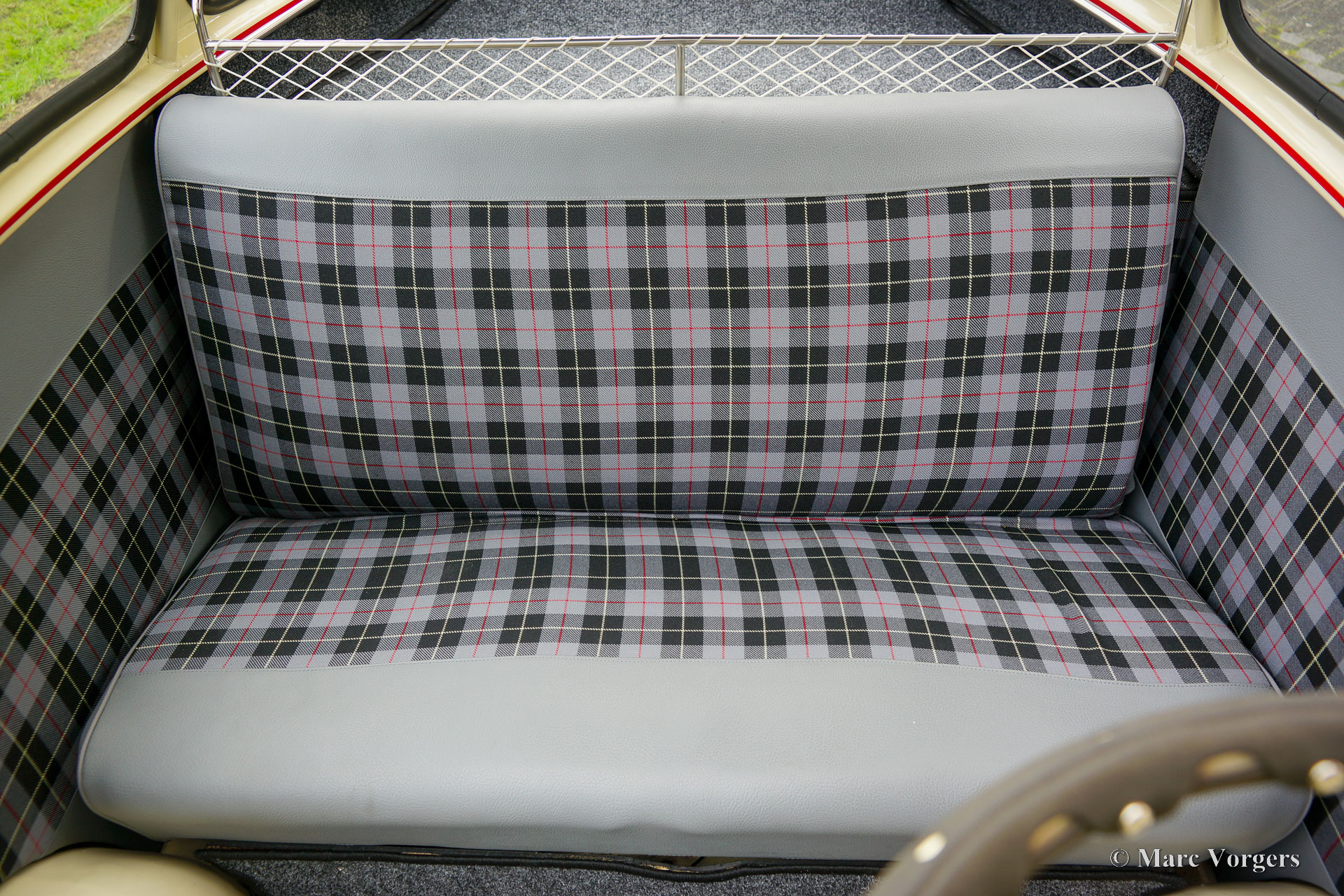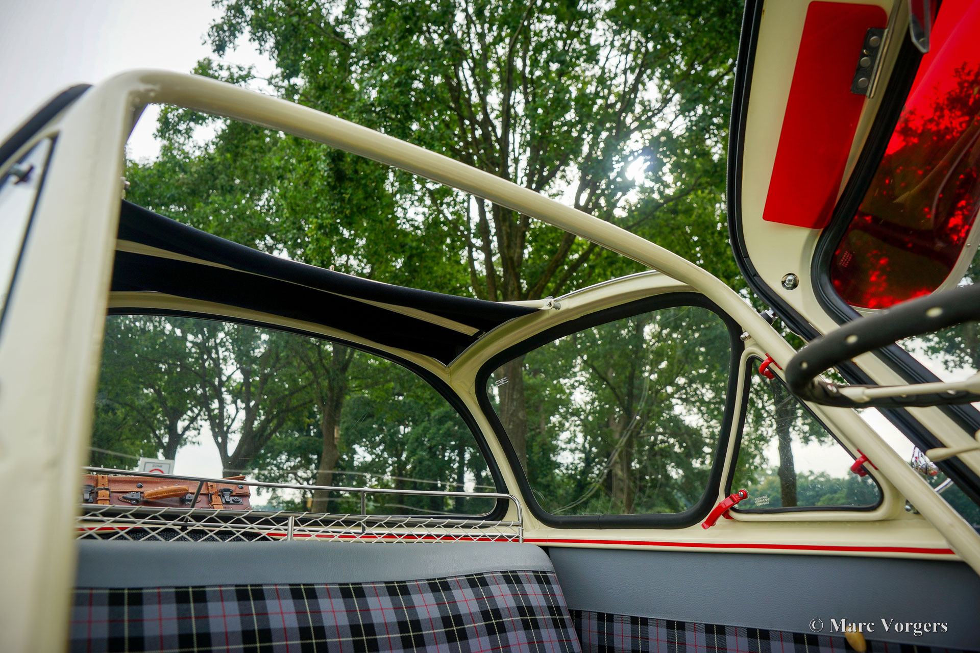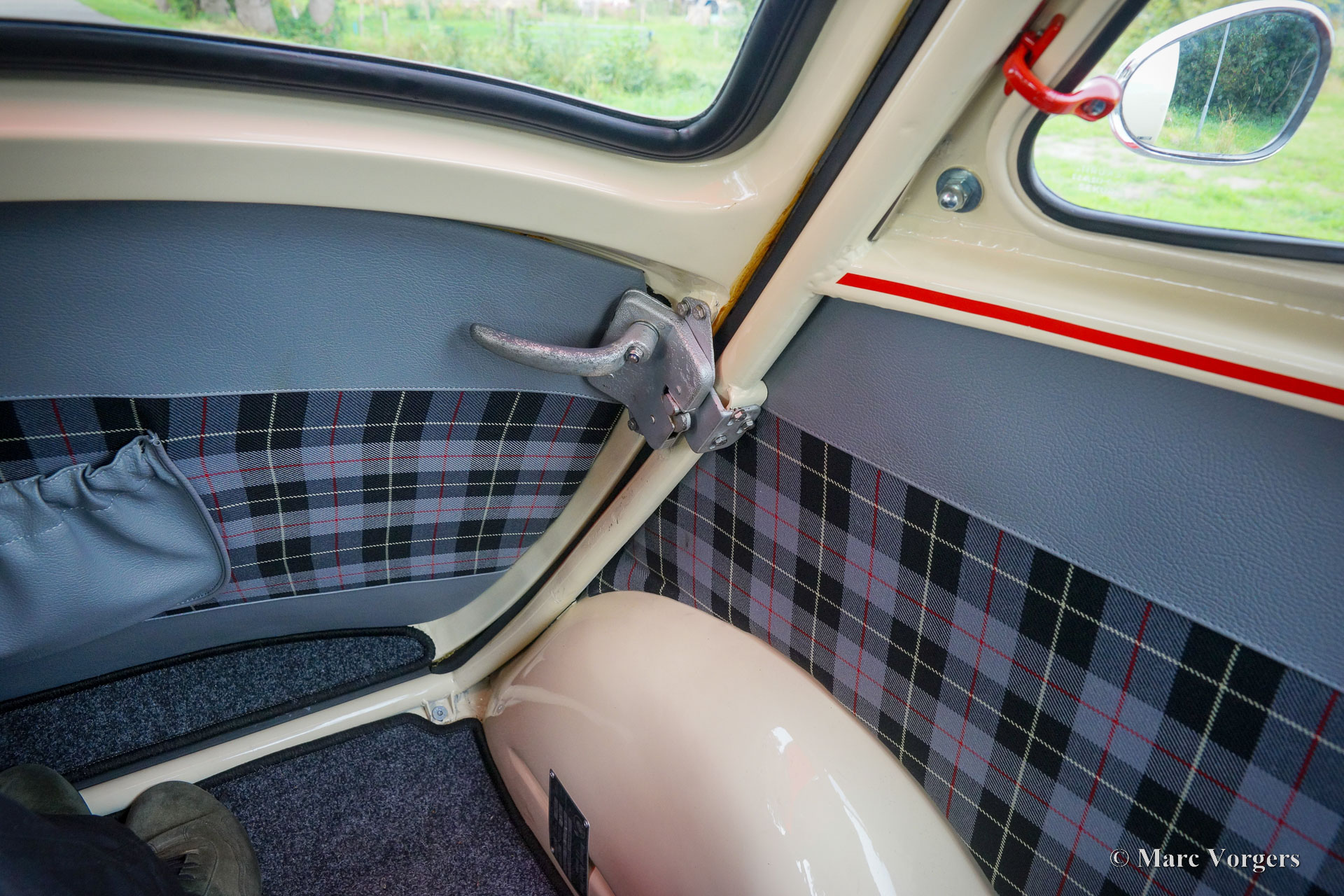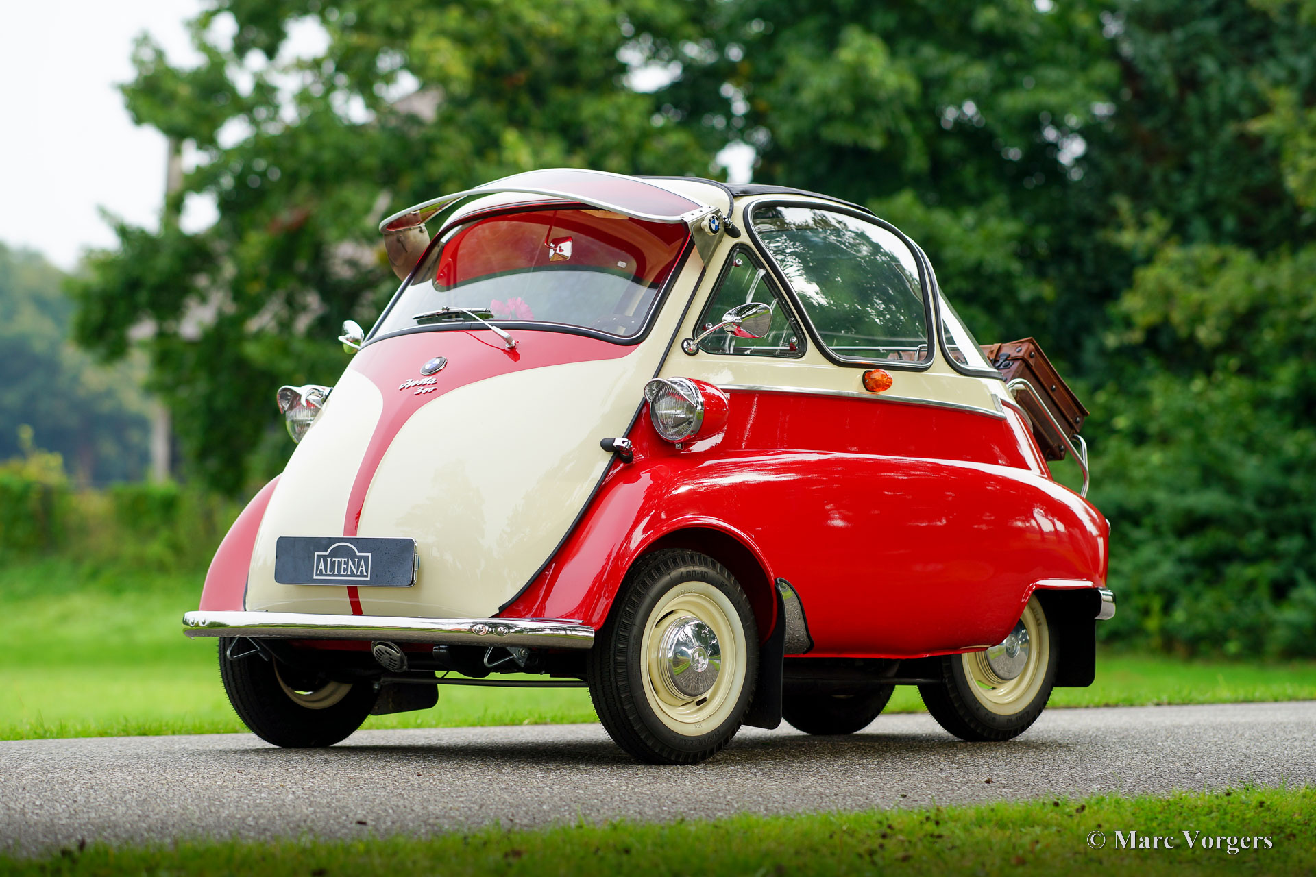 BMW Isetta 300, jaar 1957. Kleur rood met crème, gecombineerd met een grijs vinyl/stoffen interieur met een rood/crème ruitpatroon en grijs tapijt. Deze fantastische BMW Isetta 300 komt is afkomstig uit een verzameling. Deze fraaie ‘bubble car’ is recentelijk uitgebreid gerestaureerd door een gespecialiseerd bedrijf. De auto heeft 600 kilometer gereden sinds de restauratie is voltooid. De auto verkeert in een prachtige topstaat! Deze geweldige BMW Isetta is voorzien van 300 cc ééncilinder viertaktmotor en een handgeschakelde versnellingsbak. De auto toont alle originele details en enkele interessante accessoires uit de periode zoals de zonneklep, het chromen bagagerek en de spatlappen. Het betreden van deze kleine ‘bubble car’ via de voordeur is een interessante ervaring die daar niet stopt. Na het sluiten van de deur wordt men ingekapseld in de gezellige bubbel met open dak. De bedieningselementen aan de linkerkant zijn eenvoudig te bedienen en deze Isetta 300 is erg leuk om mee te rijden! Deze prachtige BMW Isetta 300 wordt compleet geleverd met de originele instructies, een leren koffer en een Piccolino mini caravan! De caravan verkeert in een splinternieuwe staat en is voorzien van een bed voor twee personen. Een unieke combinatie!
