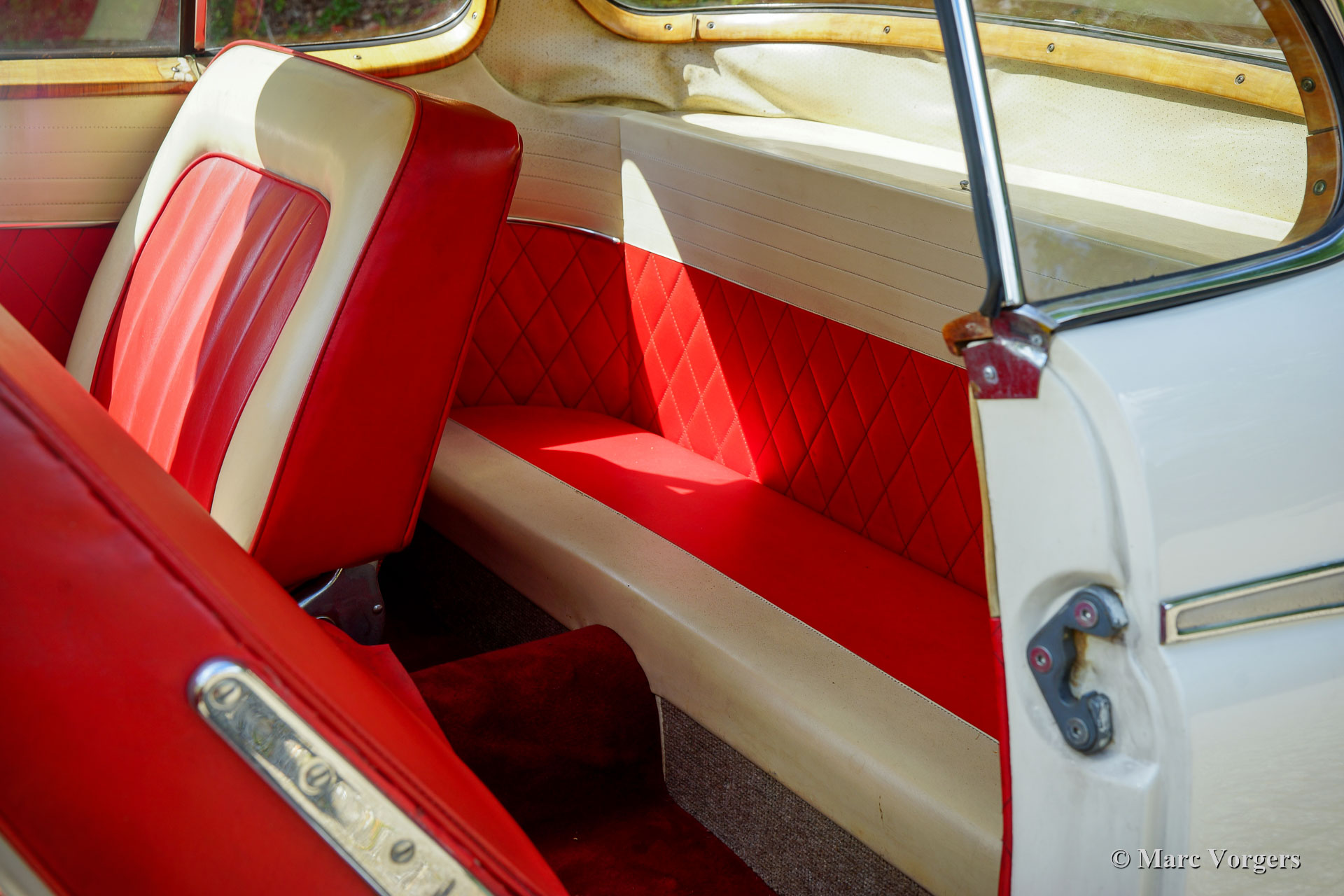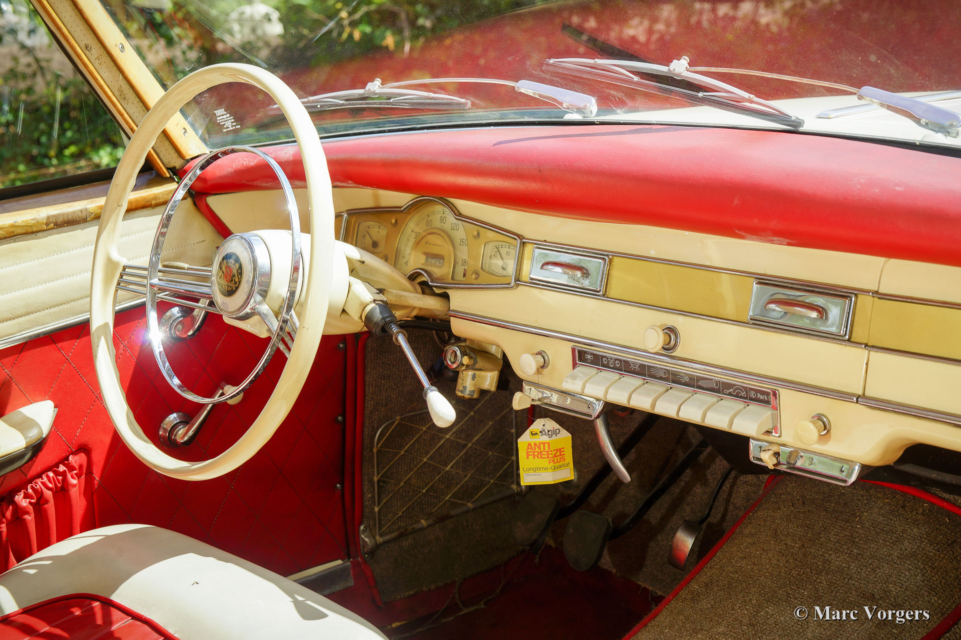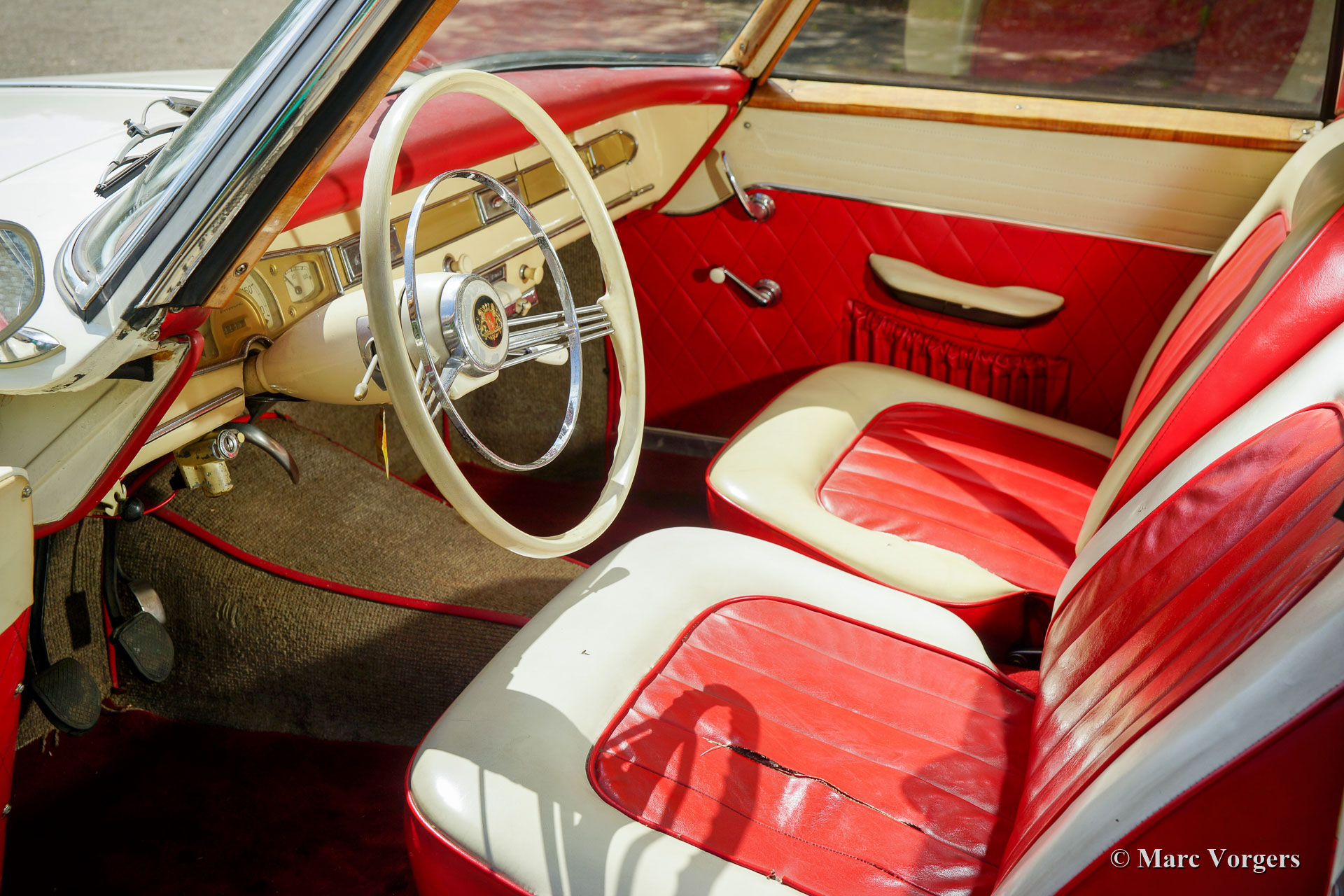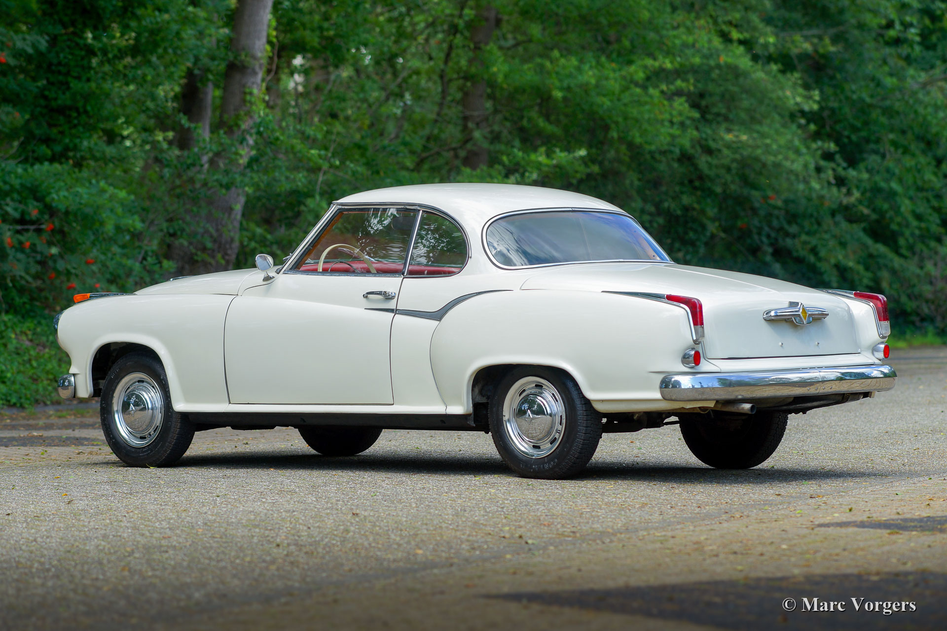 Borgward Isabella Coupé, jaar 1958. Kleur crème wit gecombineerd met een crème wit/ rood interieur en grijs tapijt. Deze prachtige Borgward Isabella Coupé werd nieuw verkocht in Duitsland waar de auto nog altijd geregistreerd is. Deze prachtige Isabella Coupé verkeert in een super originele staat! De auto is in het verleden alleen netjes opnieuw gespoten, verder is alles volledig origineel. De auto toont alle originele details en uiteraard op sommige plaatsen sporen van gebruik en leeftijd. De interieurvloerbedekking, matten en de kofferbekleding hebben betere tijden gekend en de bestuurdersstoel heeft wat nieuwe stiksels nodig. Een nieuwe eigenaar kan zich deze auto eigen maken met minimale verbeteringen. De carrosserie is volledig gaaf en de mechanische onderdelen zijn in goede staat en functioneren zoals het hoort. De auto is een genot om in te rijden! Deze super originele Borgward Isabella wordt geleverd met Duitse papieren zodat deze in elk land wereldwijd geïmporteerd en op kenteken gezet kan worden.