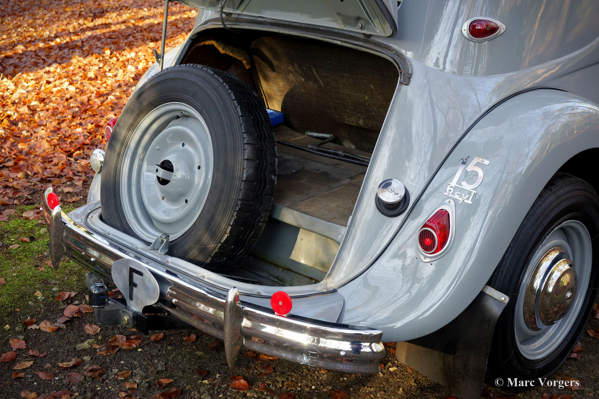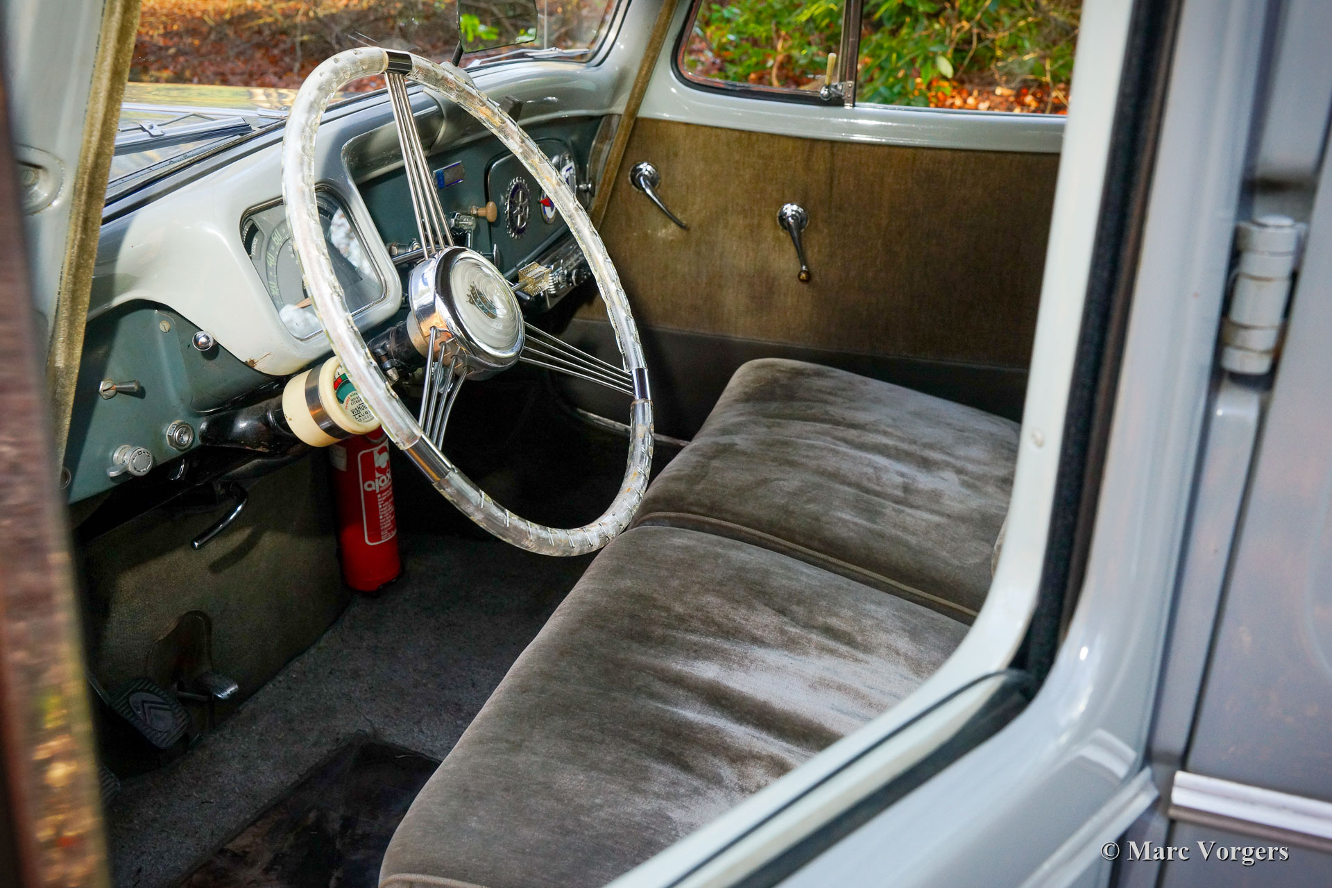 Citroën ‘Traction Avant’ 15-Six Berline, jar 1954. Kleur grijs gecombineerd met een donkergrijs velours interieur. Deze fantastische en relatief zeldzame Citroën ‘Traction Avant’ 15-SIX Berline werd nieuw verkocht in Frankrijk. De eerste eigenaar was dhr. Mandel, de burgemeester van Evreux. In juni 1969 werd de auto in Nederland geregistreerd. Sinds het jaar 2001 wordt de auto gekoesterd door de laatste en huidige eigenaar. Deze prachtige Citroën 15 SIX verkeert in goede en zeer originele staat. De auto rijdt en stuurt heerlijk. De auto beschikt over een aantal speciale accessoires zoals een Quillery-stuurwiel en een lichtknop. Deze luxe accessoires zijn deels vervaardigd uit transparant plastic. Ook gemonteerd zijn aluminium carrosserieversieringen van Robri. Verder is deze geweldige Citroën uitgerust met speciale Claxons op de voorbumper, ‘cricks’ onder de auto, een blauwe zonneklep, een radiatorafdekking en extra meters voor watertemperatuur en oliedruk. Deze Citroën ‘Traction Avant’ 15-SIX Berline is een echte tijdcapsule, een fantastisch exemplaar voor de echte liefhebber!