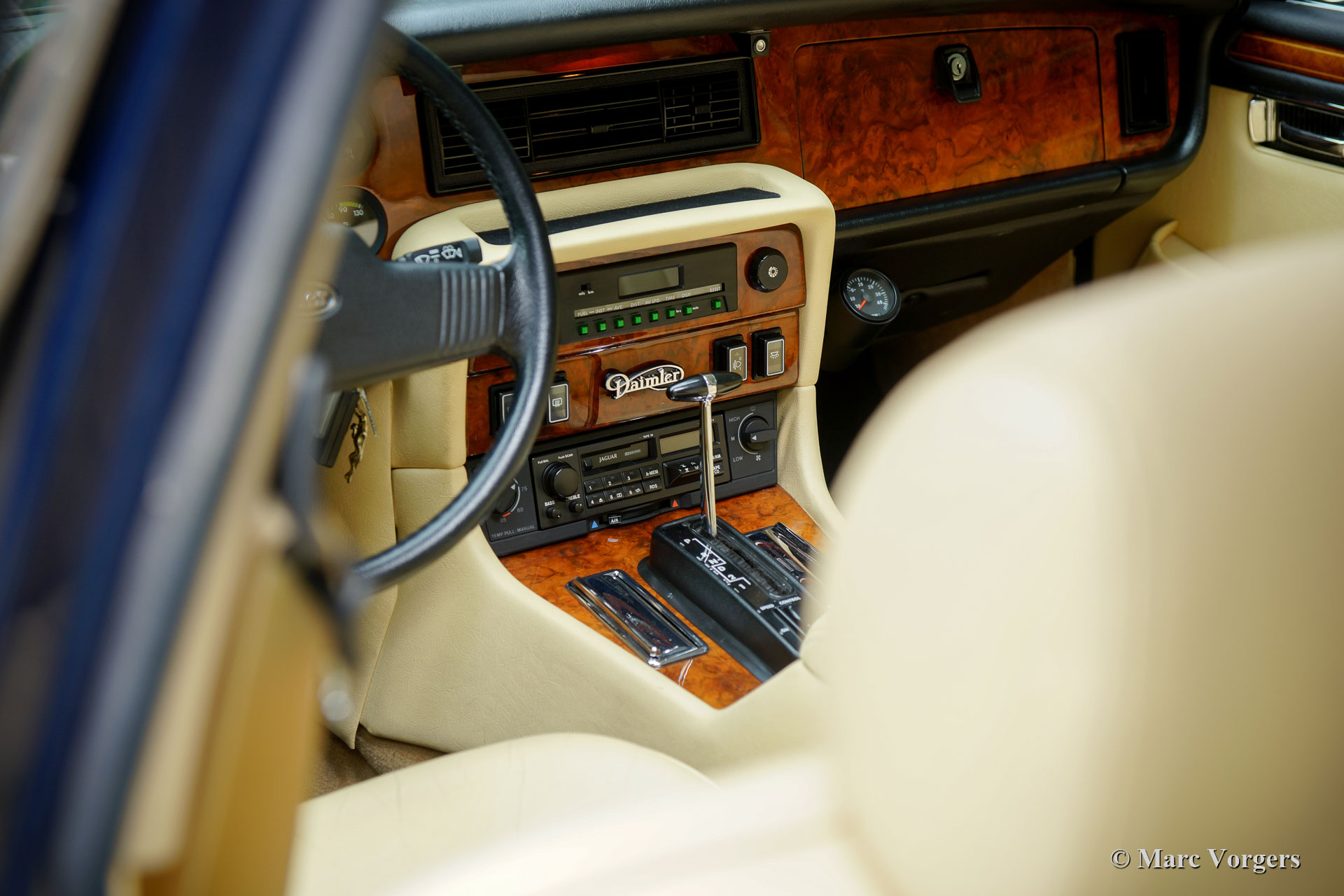 Daimler Double Six, jaar 1992. Kleur donkerblauw gecombineerd met een beige leren interieur. Deze fantastische Long Wheelbase (LWB) Daimler Double Six was in vroegere jaren het eigendom van de Nederlandse komiek en zanger Henk Elsink. De auto verkeert in excellente originele conditie en de auto rijdt geweldig; als nieuw! Dit is niet verrassend, aangezien de auto slechts 68.500 kilometer heeft gereden sinds deze de Jaguar fabriekspoort heeft verlaten. Deze fijne Daimler Double Six is onderhouden door de bekende Nederlandse Jaguar-specialist Kolvenbach.