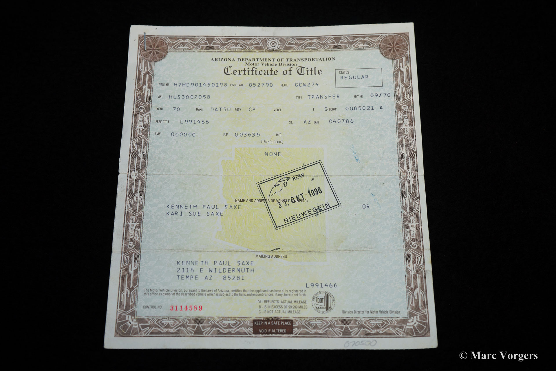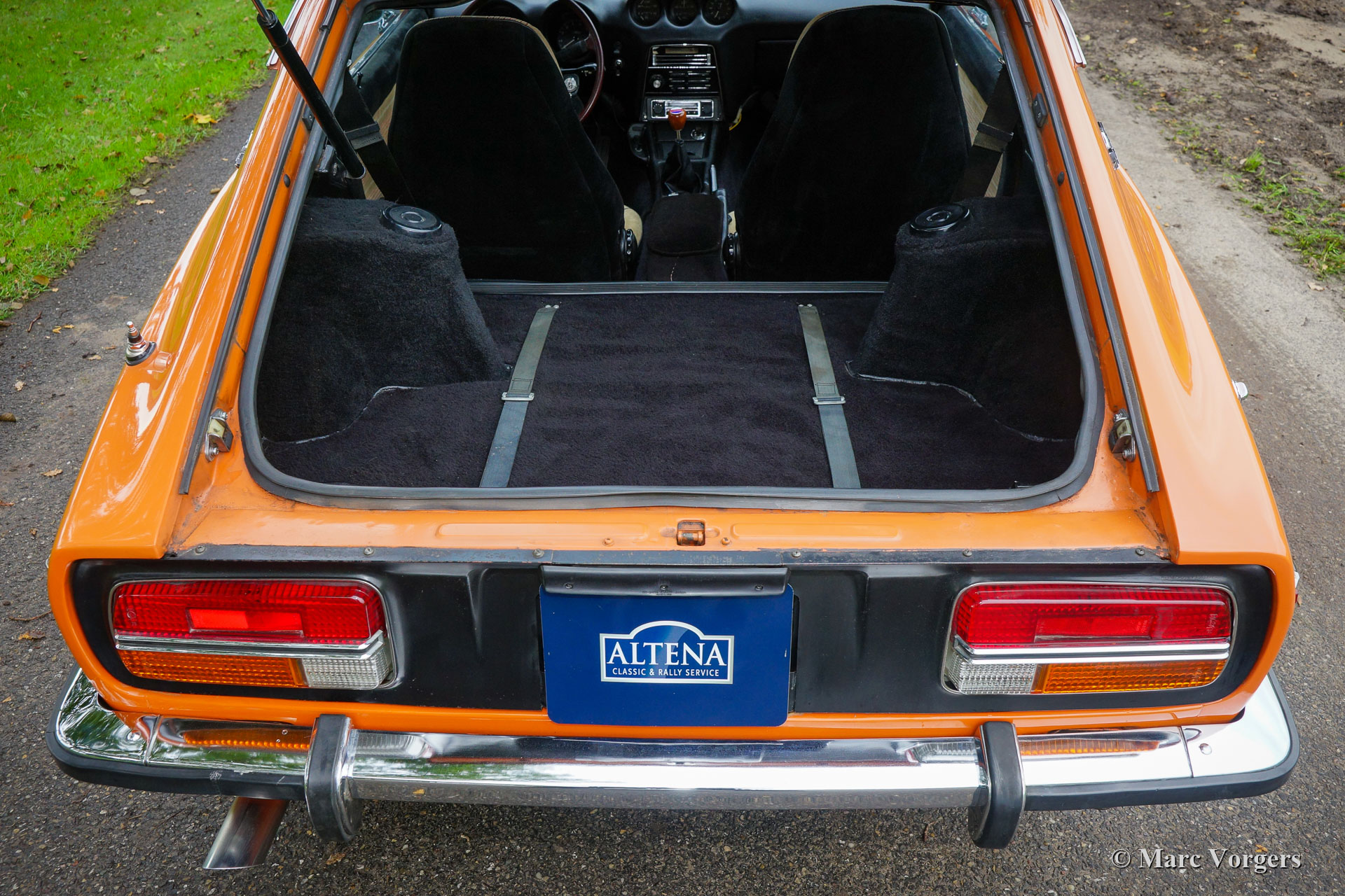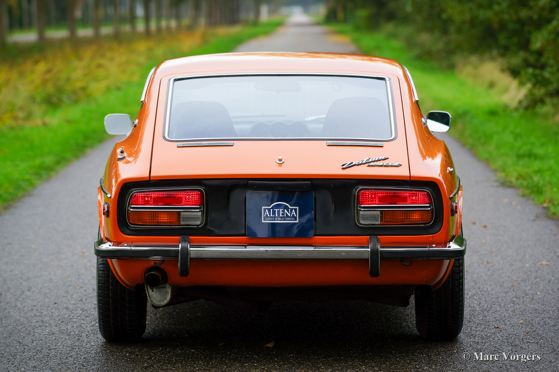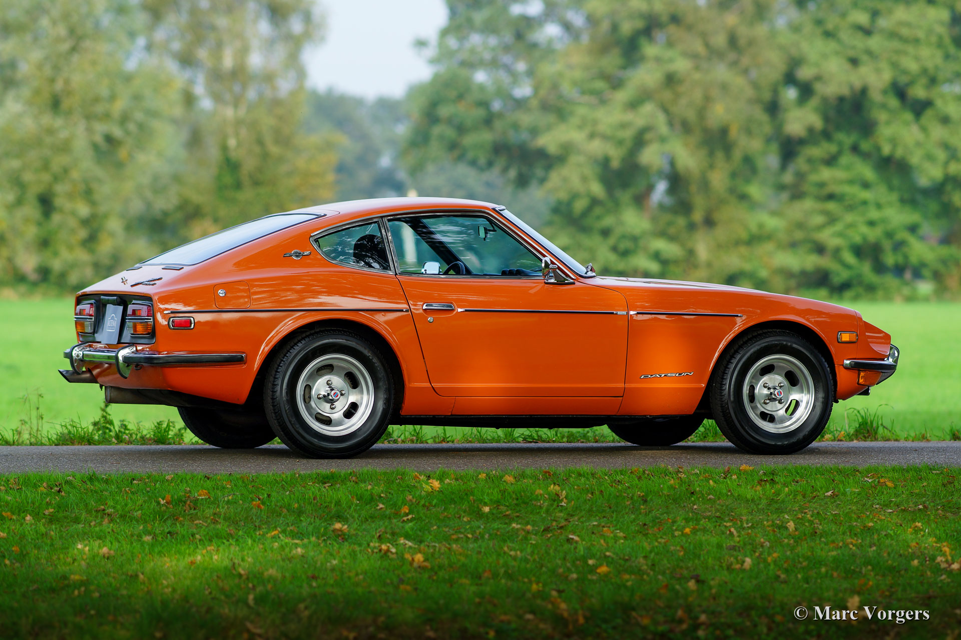 Datsun 240 Z, jaar 1970. Kleur oranje met een beige/ zwart stof/ kunstleer interieur. Deze geweldige Datsun 240 Z is een zeer vroeg exemplaar; productienummer 2058. De auto werd nieuw verkocht in Arizona (USA), de originele Amerikaanse ‘title’ van Arizona is aanwezig. Van 1970 tot 1996 kende de auto slechts twee eigenaren in Arizona. In 1996 werd de Datsun geëxporteerd naar Nederland, waar de auto tot op heden (23 jaar) werd gekoesterd door één en dezelfde eigenaar! Deze prachtige Datsun 240 Z verkeert in een excellente en super originele staat! De auto werd nooit volledig gerestaureerd. De motor werd in het verleden gereviseerd, de auto kreeg in het verleden perfecte nieuwe lak, en de stof van de stoelen en de deurpanelen werd professioneel vernieuwd. De originele kleurcodesticker is nog steeds aanwezig (kleurcode 918), evenals alle originele puntlassen! Na aankomst in Nederland werd de 240 Z uitgerust met Europese achterlichten met oranje richtingaanwijzerglaasjes. De auto wordt geleverd met een volledig gedocumenteerde historie, ook de factuur van de motorrevisie is aanwezig. De 240 Z is uitgerust met 14-inch Wolfrace-lichtmetalen wielen en in de kofferruimte vindt u de originele gereedschapset en krik in nieuwstaat! Dit is een prachtige, zeer vroege Datsun 240 Z in uitstekende en super originele conditie!