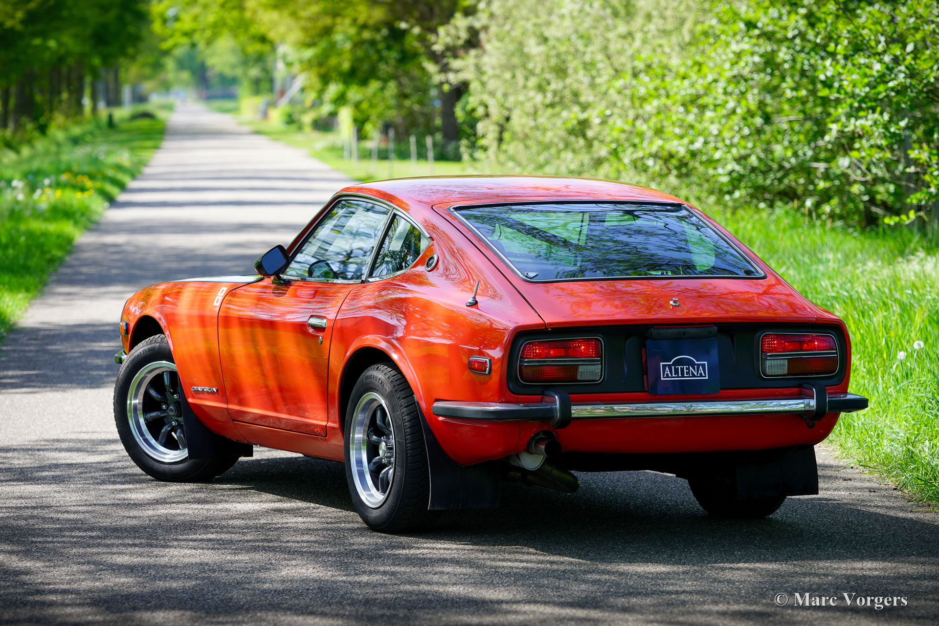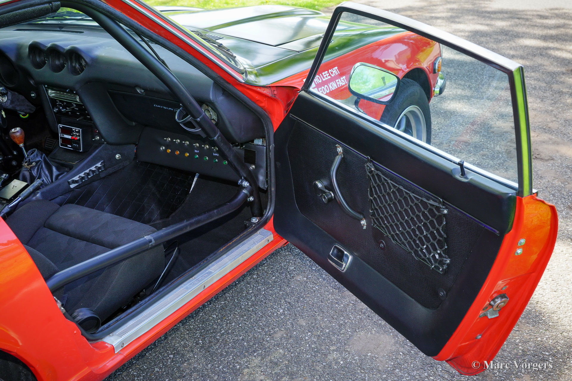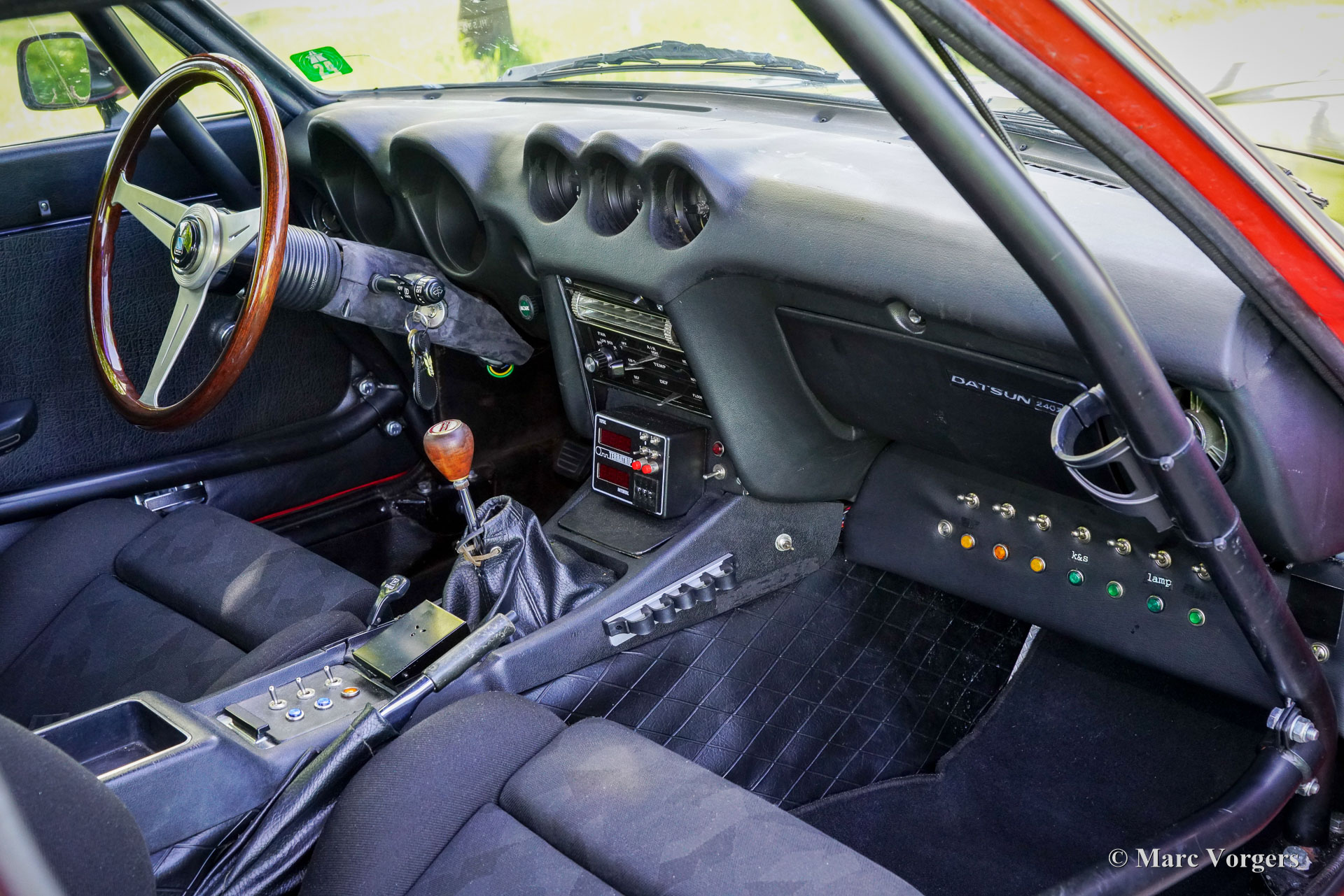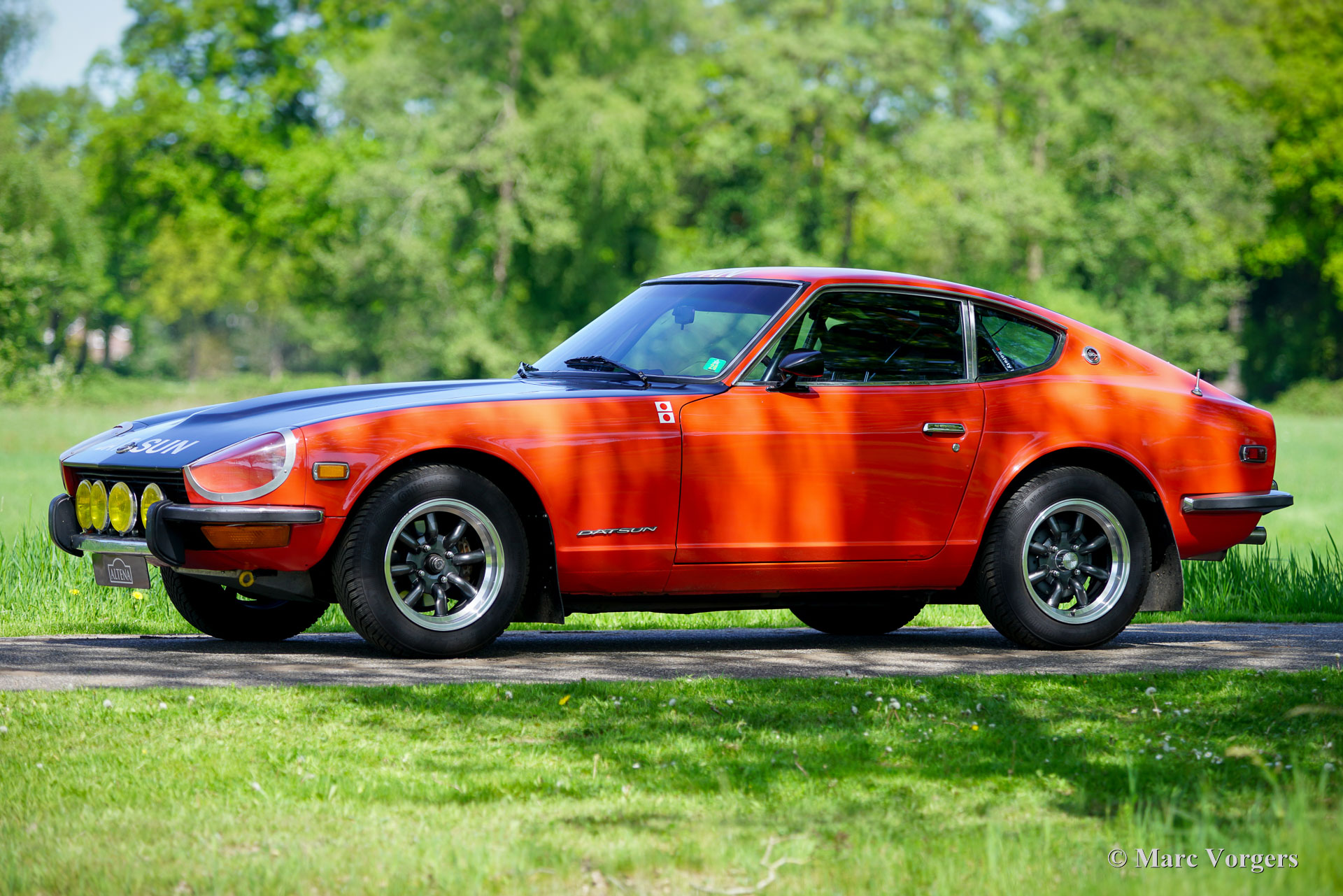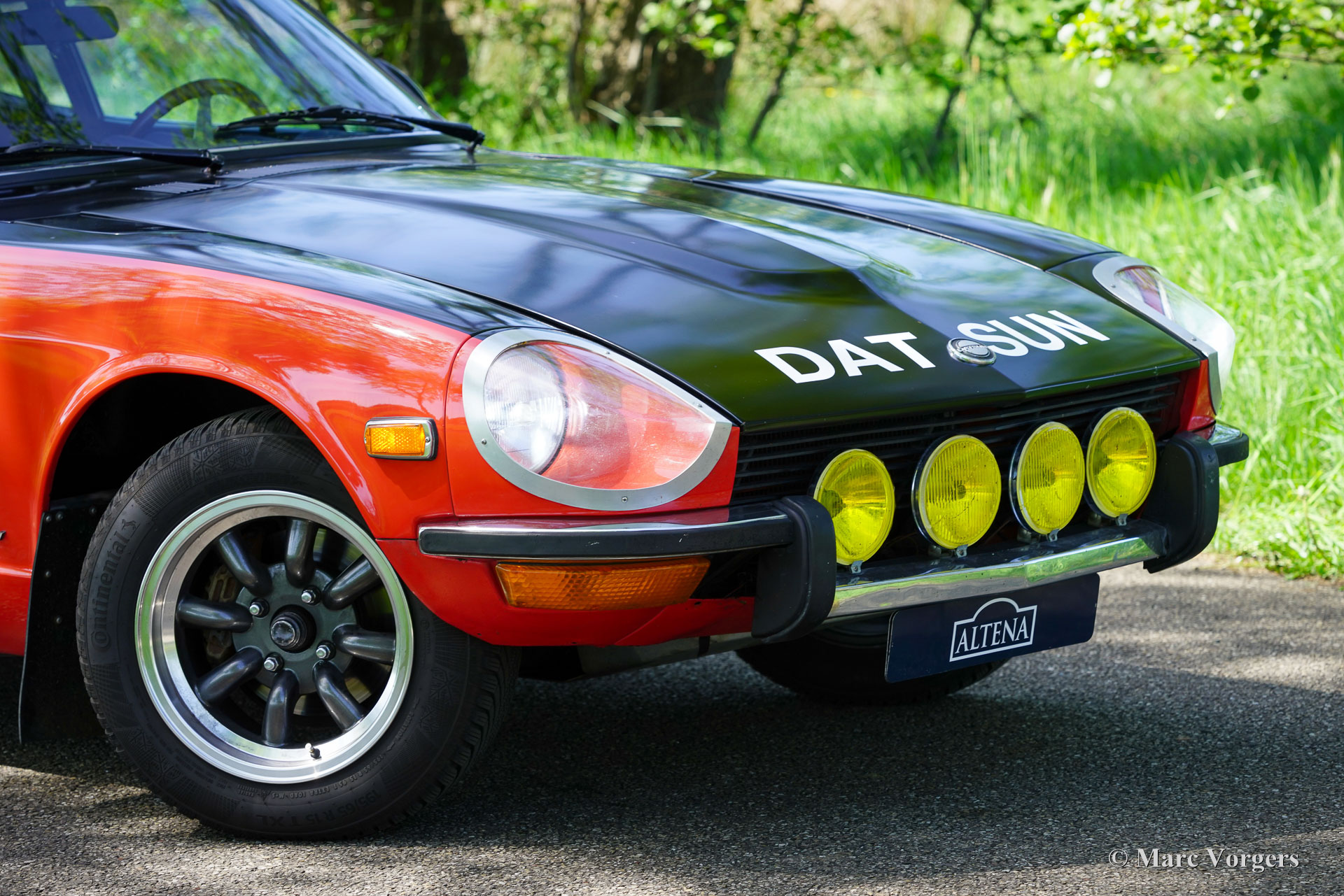 Datsun 240Z rallyauto, jaar 1973. Exterieurkleur oranjerood met een zijdeglans zwarte (anti-reflecterende) motorkap gecombineerd met een zwart rally-interieur. Zwarte Recaro kuipstoelen, zwarte hemelbekleding en zwart tapijt. Deze fantastische Datsun 240Z is perfect geprepareerd voor historische rally-evenementen. De auto voelt solide aan en rijdt, stuurt en voelt super sportief aan! De stoelen bieden voldoende steun en comfort voor lange ritten. De auto werd nieuw verkocht in Californië (Verenigde Staten) en in 2010 geïmporteerd naar Nederland. Vervolgens is de auto uitgebreid rally-geprepareerd door Nederlandse specialisten, waaronder Altena Classic & Rally Service. De auto is uitgevoerd in de Datsun Safari rallylook van 1971. De auto is nu voorzien van een Datsun 280Z-motor met 160 pk en 230 Nm koppel. De kracht wordt via een 5-versnellingsbak en een sperdifferentieel naar de achterwielen overgebracht. Het interieur is perfect geprepareerd en de stoelen bieden voldoende ruimte voor lange mensen. Een volledige rol kooi en elektrische vierpuntsgordels houden de passagiers in elke situatie veilig. Deze fantastische Datsun 240Z rijdt en klinkt perfect en de auto is door de jaren heen uitstekend onderhouden. Deze rallyauto verkeert in een zeer goede tot uitstekende staat met enkele gebruikssporen. Alleen aan de onderrand van het bestuurdersportier is wat corrosie onder de lak te zien. De bouw en preparatie van de auto hebben ongeveer € 80.000 gekost; alle facturen zijn aanwezig en geven een perfect overzicht van de uitgevoerde werkzaamheden. Een lijst met modificaties en opties vindt u hieronder. Een fantastische machine!