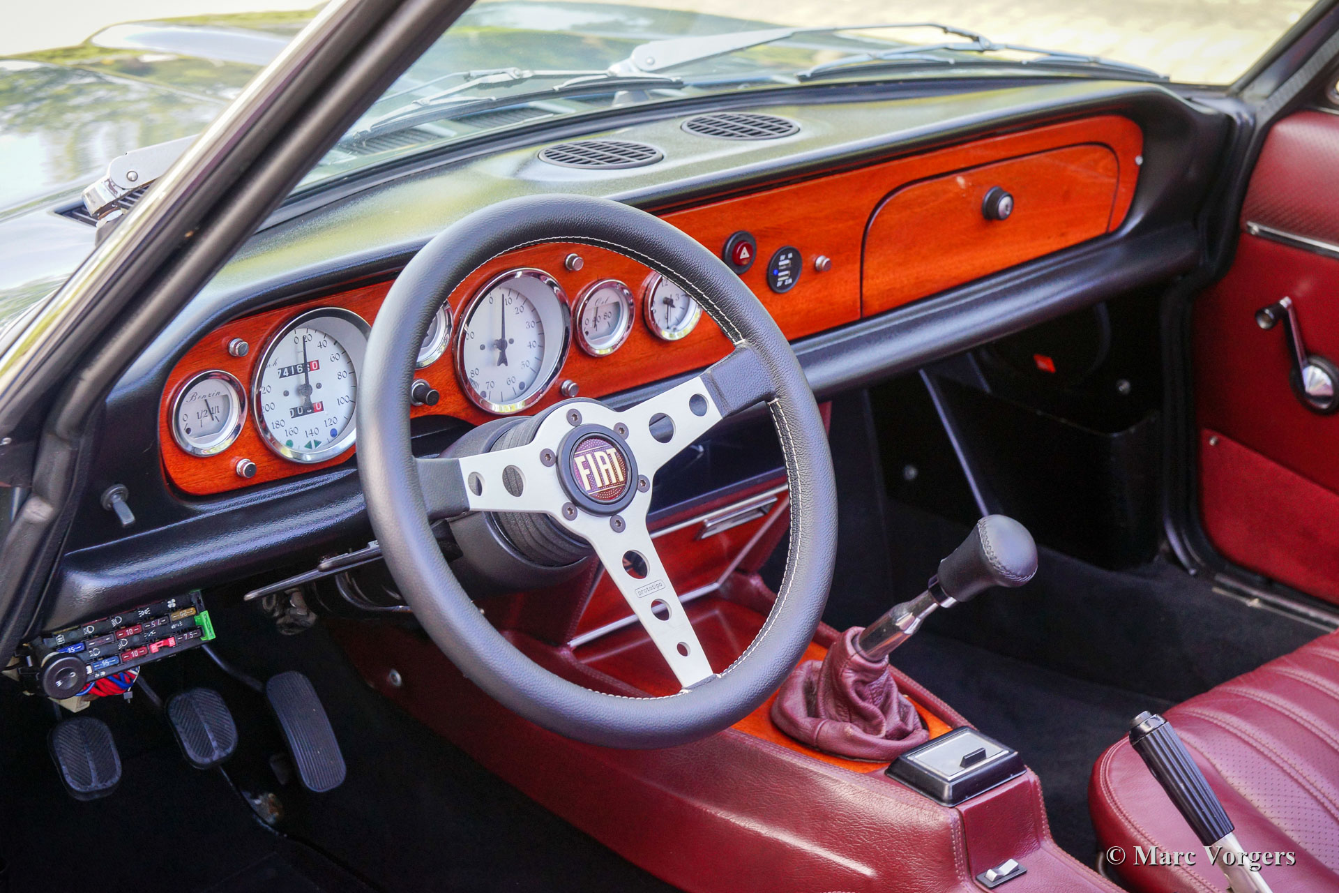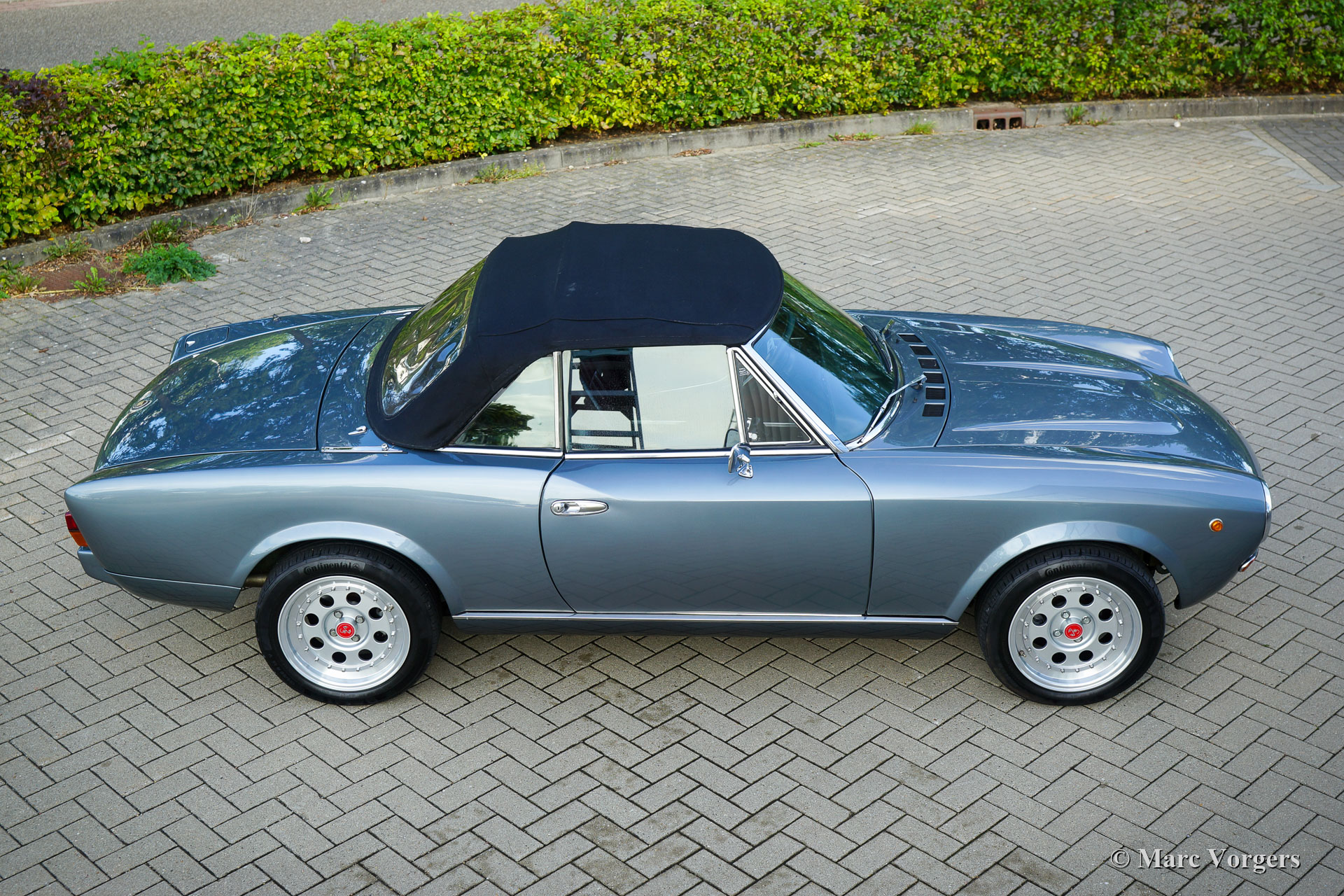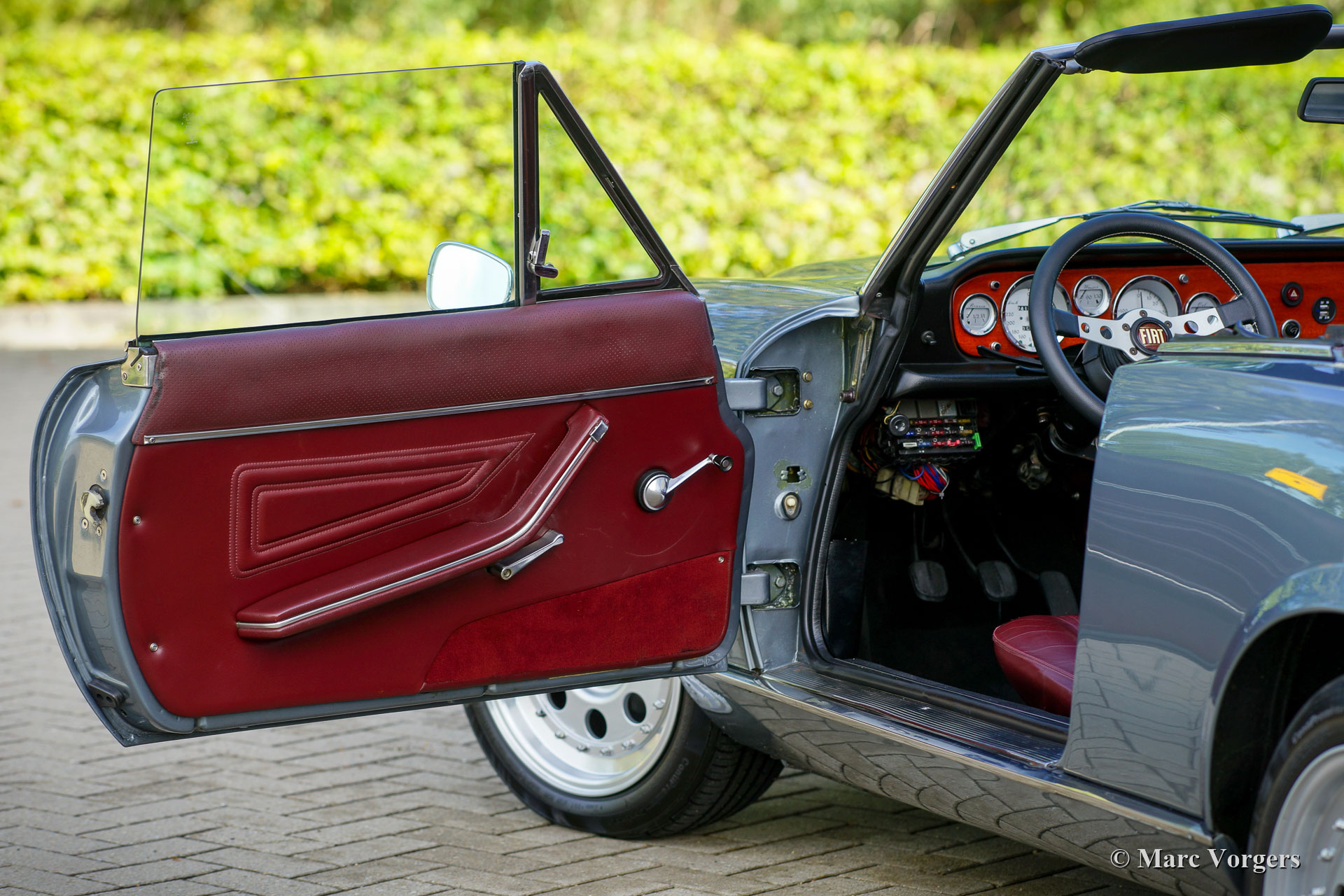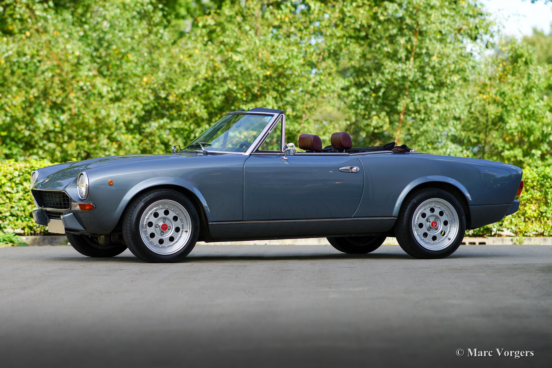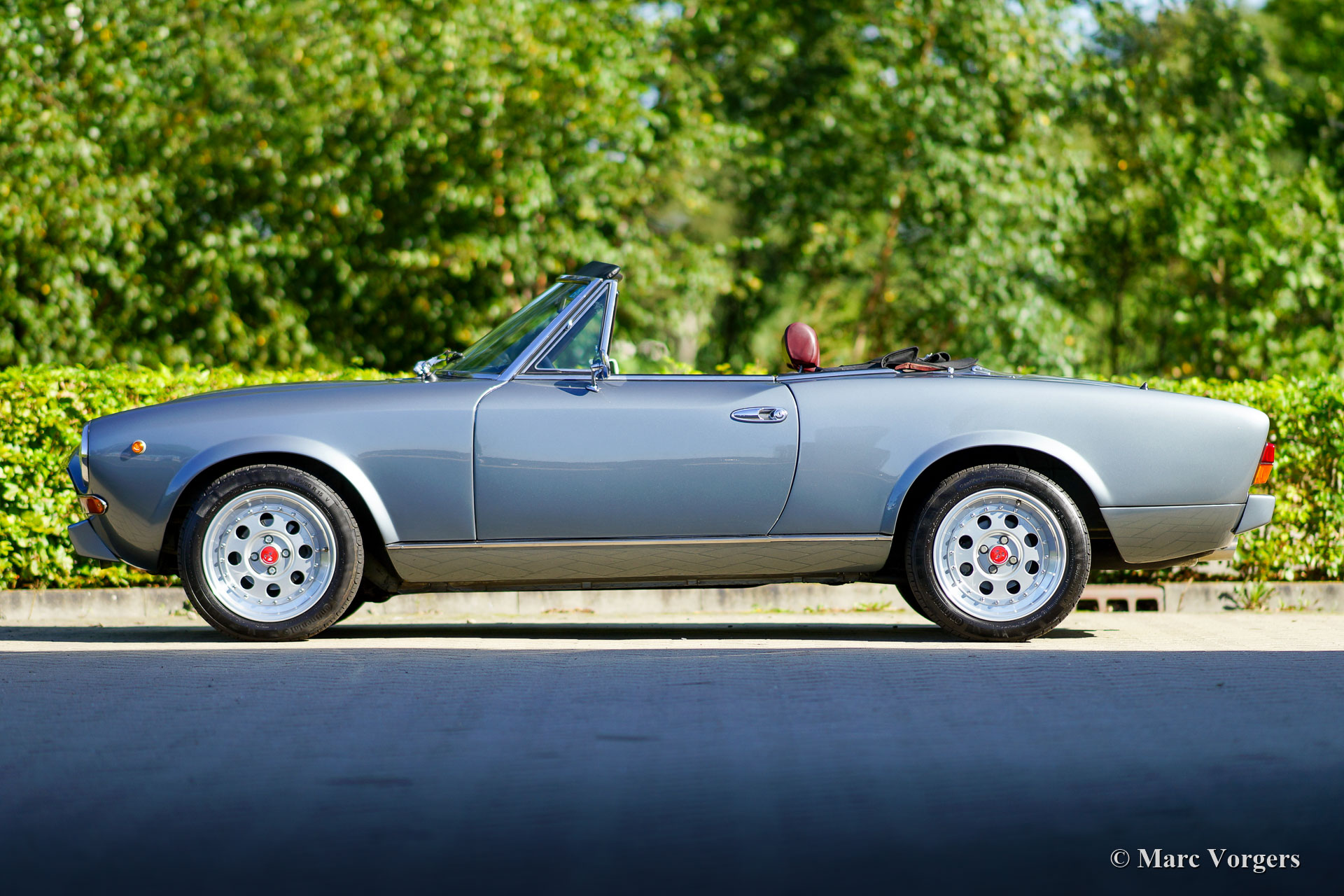 Fiat 124 Spider 2000 (CS2), jaar 1980. Kleur grijs metallic gecombineerd met een donkerrood lederen interieur afgewerkt met zwart tapijt. Cabriokap van zwart mohair. Deze schitterende Fiat 124 2000 Spider is in het jaar 2020 naar Nederland geïmporteerd. Begin 2021 is de auto voorzien van prachtige nieuwe lak, zijn de motor en versnellingsbak gereviseerd, zijn de remmen gereviseerd en is de ophanging iets verlaagd. Er zijn nieuwe Weber IDF40 carburateurs gemonteerd, die op een rollenbank zijn afgesteld. Verder zijn de standaard bumpers verwijderd en vervangen door Abarth stijl bumperettes, zijn er nieuwe Abarth wielen gemonteerd met nieuwe Continental 195/50 15 banden en is er een nieuwe RVS uitlaat gemonteerd. Ook is er een nieuw dashboard gemonteerd, is het elektrisch systeem teruggebracht naar de originele specificaties en heeft de carrosserie een Dinitrol anti-corrosiebehandeling gekregen. Er is recent veel geld geïnvesteerd om deze fantastische Fiat 124 2000 Spider naar topconditie te brengen! Alles is up-to-date en de auto kan met volle teugen worden genoten door een nieuwe eigenaar. De auto rijdt, stuurt en klinkt geweldig! De teller staat momenteel op 74.166 kilometer. De auto wordt compleet geleverd met facturen waarin alle uitgevoerde werkzaamheden en gemonteerde onderdelen beschreven zijn. Een rollenbank test document is ook aanwezig. Voor deze auto is het gebruik van de kleine Nederlandse kentekenplaat model 18.2 toegestaan. Dit is een fantastische Fiat 124 Spider 2000 in topconditie!