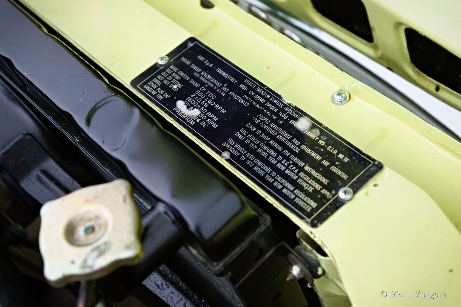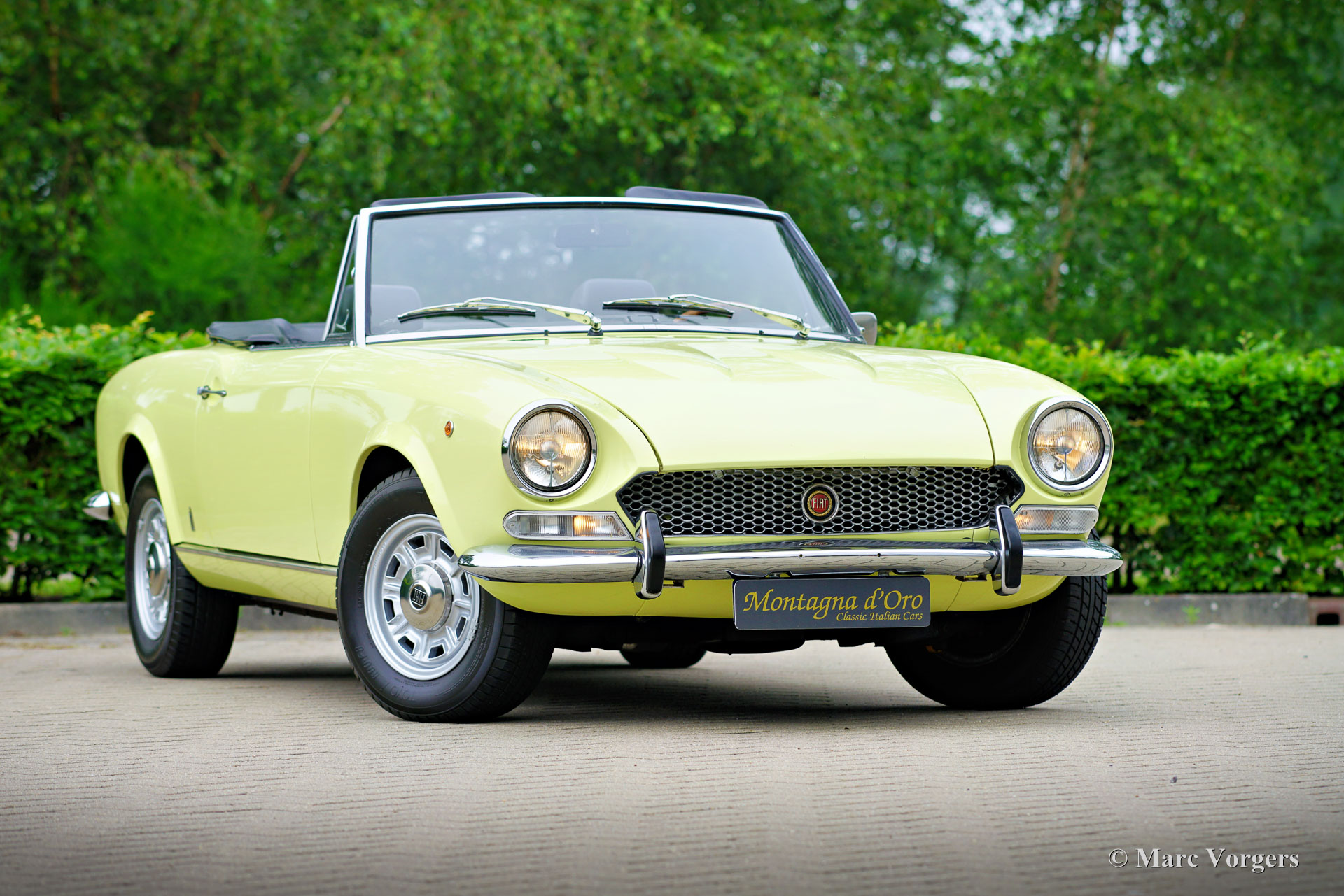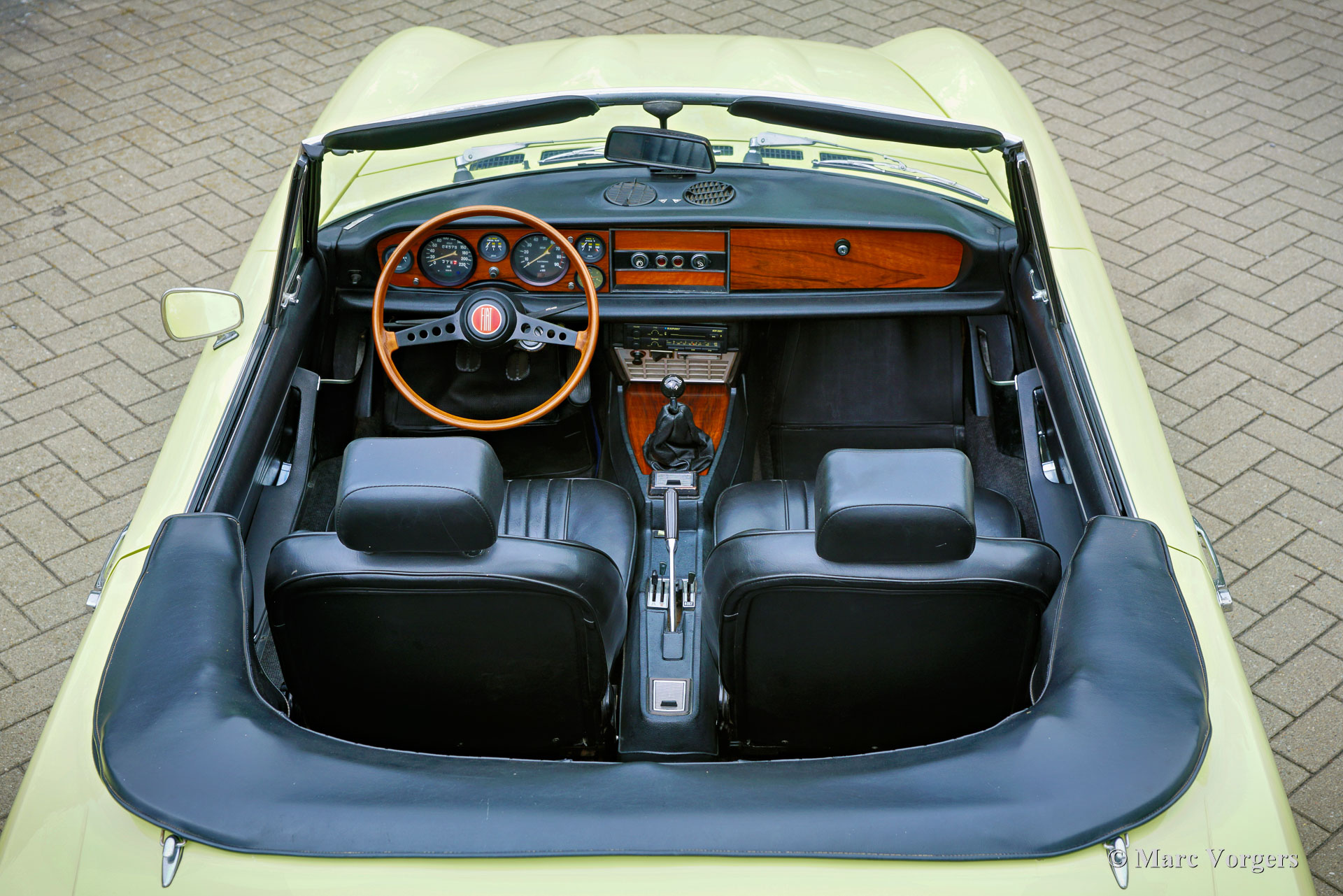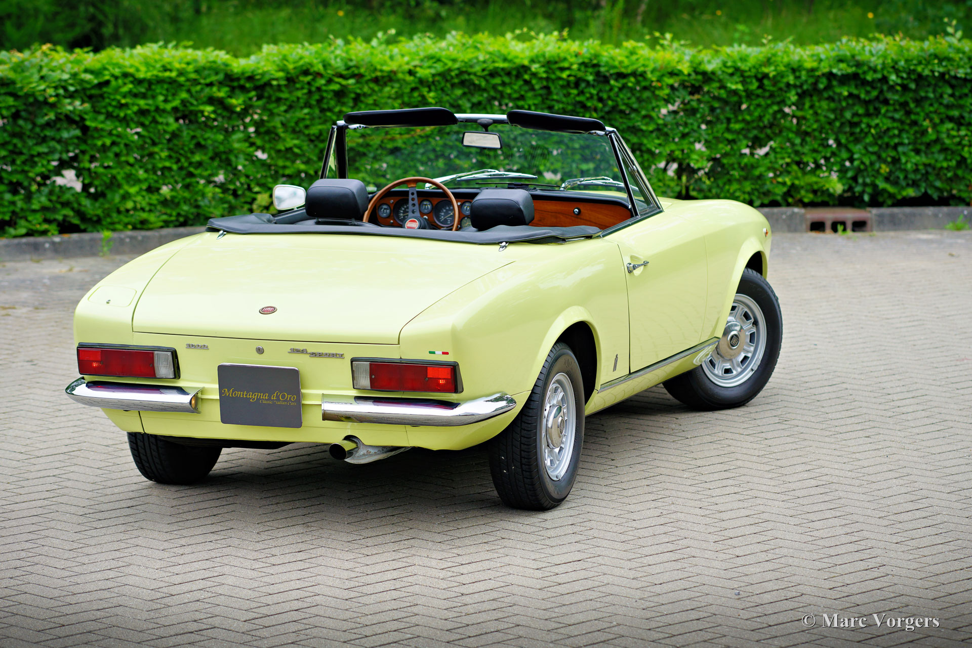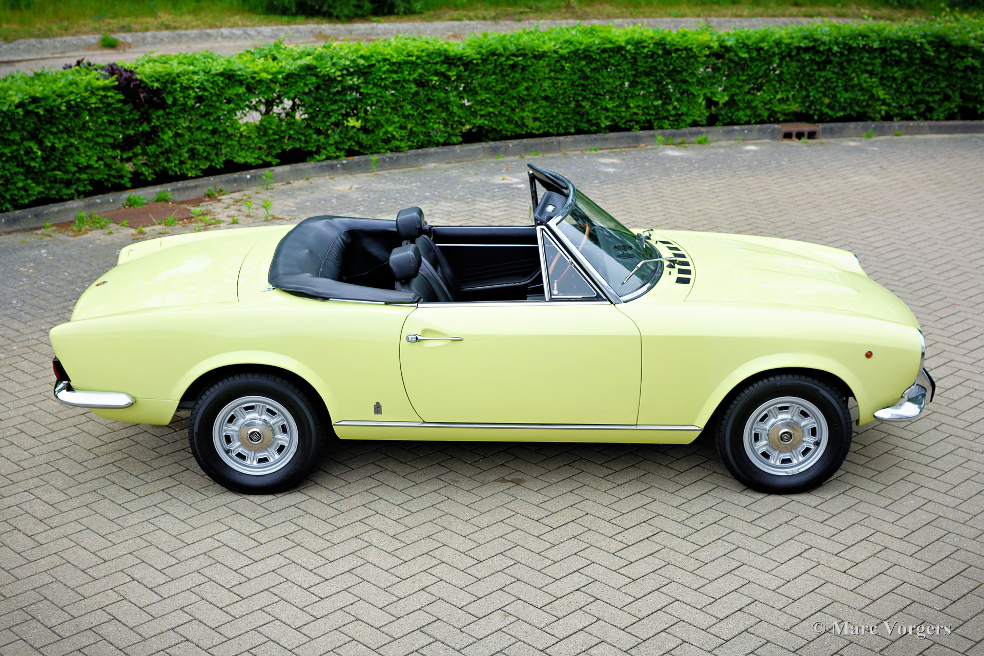 Fiat 124 Sport Spider 1600 (BS1), 1972. Kleur geel (Colorado Yellow 241) gecombineerd met een zwart kunstleren interieur afgewerkt met antraciet tapijt. Zwart mohair soft-top en een zwart vinyl afdekhoes. Deze prachtige Fiat 124 Sport Spider is nieuw verkocht in de USA en in juni 1993 in Nederland geïmporteerd. De volledige Amerikaanse historie inclusief servicefacturen is aanwezig tot 1992. Na aankomst in Nederland is de Fiat omgebouwd naar Europese specificaties met onder andere de montage van chromen bumpers, Europese koplampunits en een snelheidsmeter/teller in km/u in plaats van mijlen. Rekeningen van de ombouw en wat ander werk bedragen samen 17.000 Nederlandse guldens (€ 15.500 vandaag via geïndexeerde berekening). Latere onderhoudsfacturen zijn ook aanwezig, zelden hebben wij een auto zo goed gedocumenteerd gezien! Deze Fiat 124 Sport Spider verkeert in een zeer goede tot excellente staat en de auto rijdt perfect. De auto beschikt over een 1592 cc viercilindermotor met dubbele bovenliggende nokkenassen en een vermogen van 108 DIN pk. Met een vijfversnellingsbak, een gewicht van net geen 1.000 kg en een topsnelheid van 185 km/u zal de Fiat 124 Sport Spider zich comfortabel in het moderne verkeer mengen. De fantastisch uitziende carrosserie is getekend door Pininfarina. Het interieur toont de overgang naar de jaren zeventig met een van de laatste met hout gefineerde dashboards en sportieve “blacked out” chromen sierdelen (randen van de klokken/ meters en het middendeel van het stuur in matzwart) om hinderlijke schitteringen en verblinding door (zon)licht tegen te gaan. Dit was een nieuw inzicht overgenomen van rally- en raceauto’s dat toen in de mode raakte. Deze prachtige Fiat 124 Sport Spider is in deze kleuren beeldschoon en de fraaie originele lichtmetalen velgen maken het plaatje helemaal af!