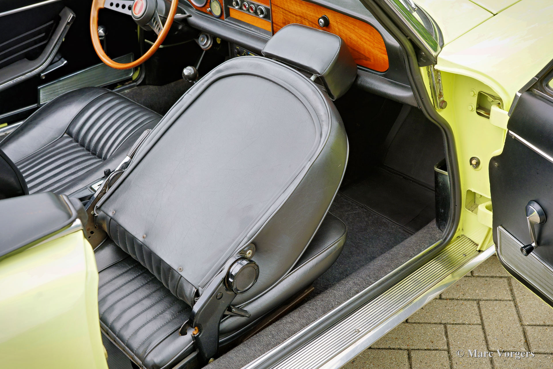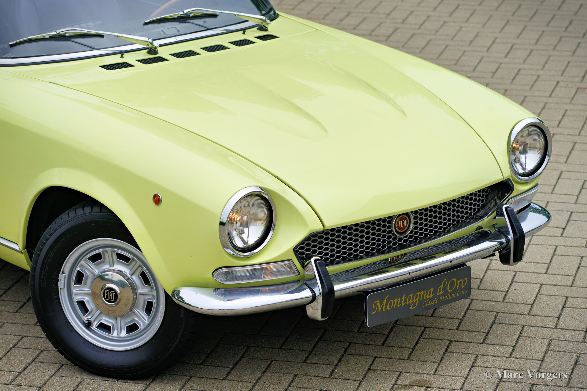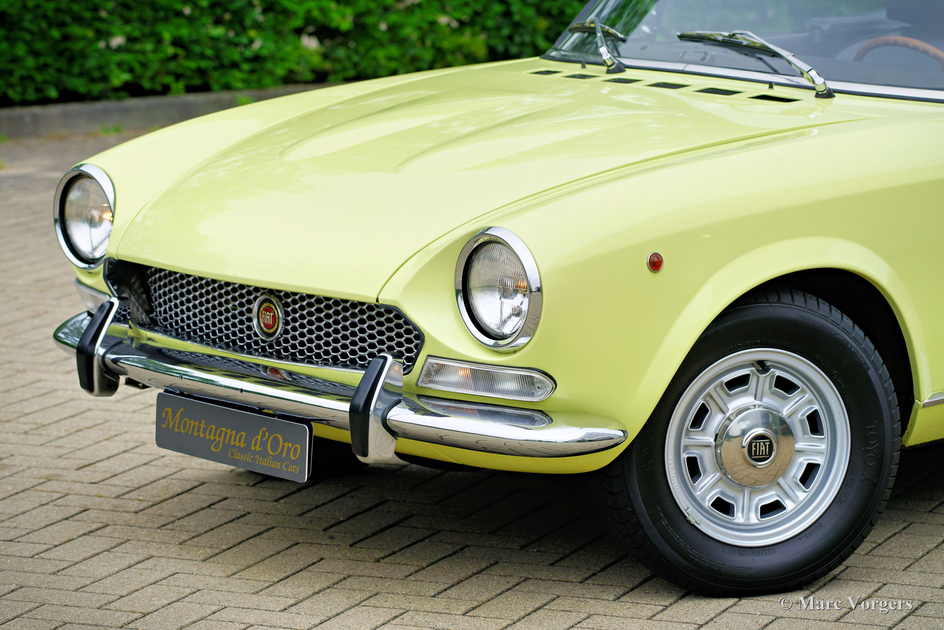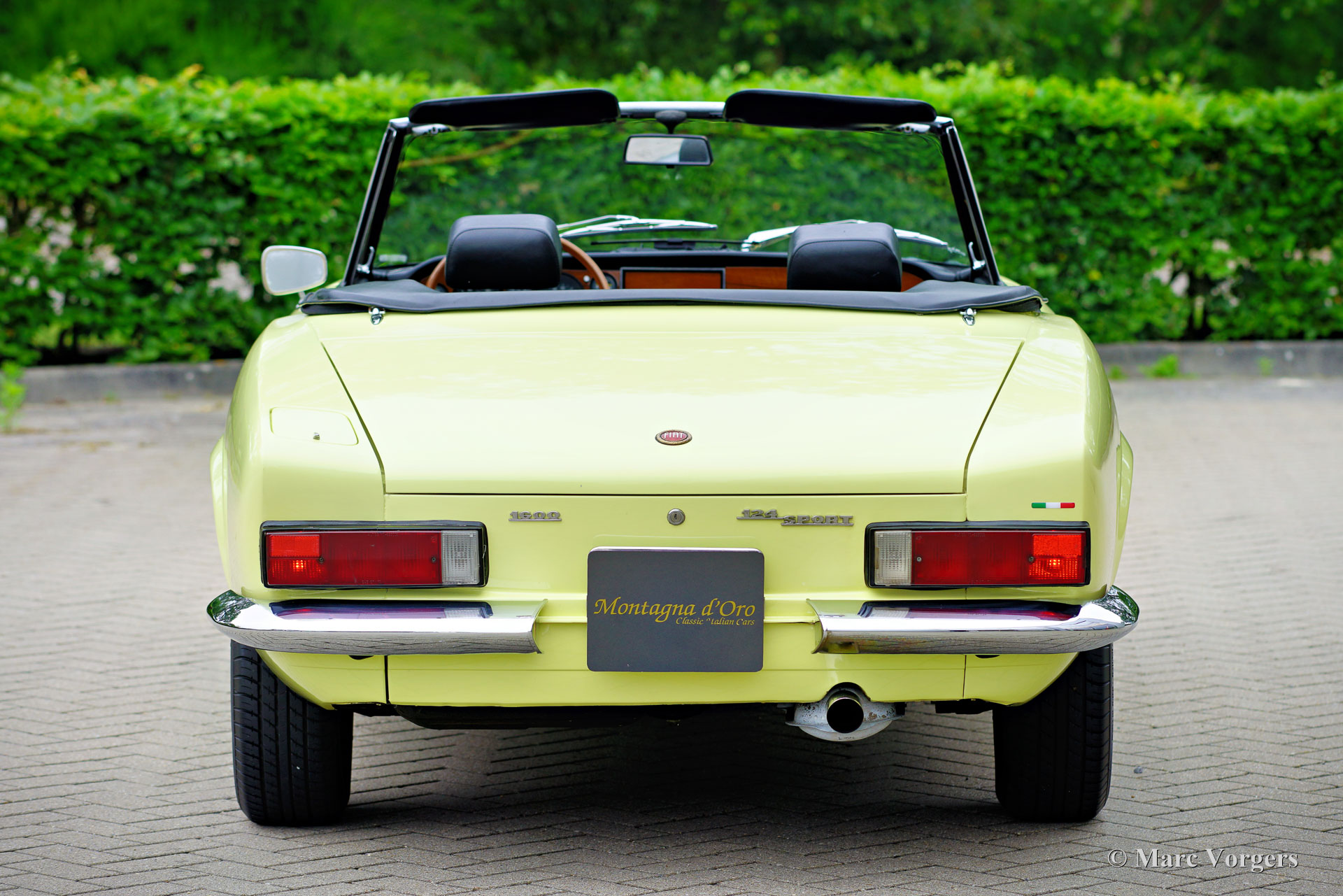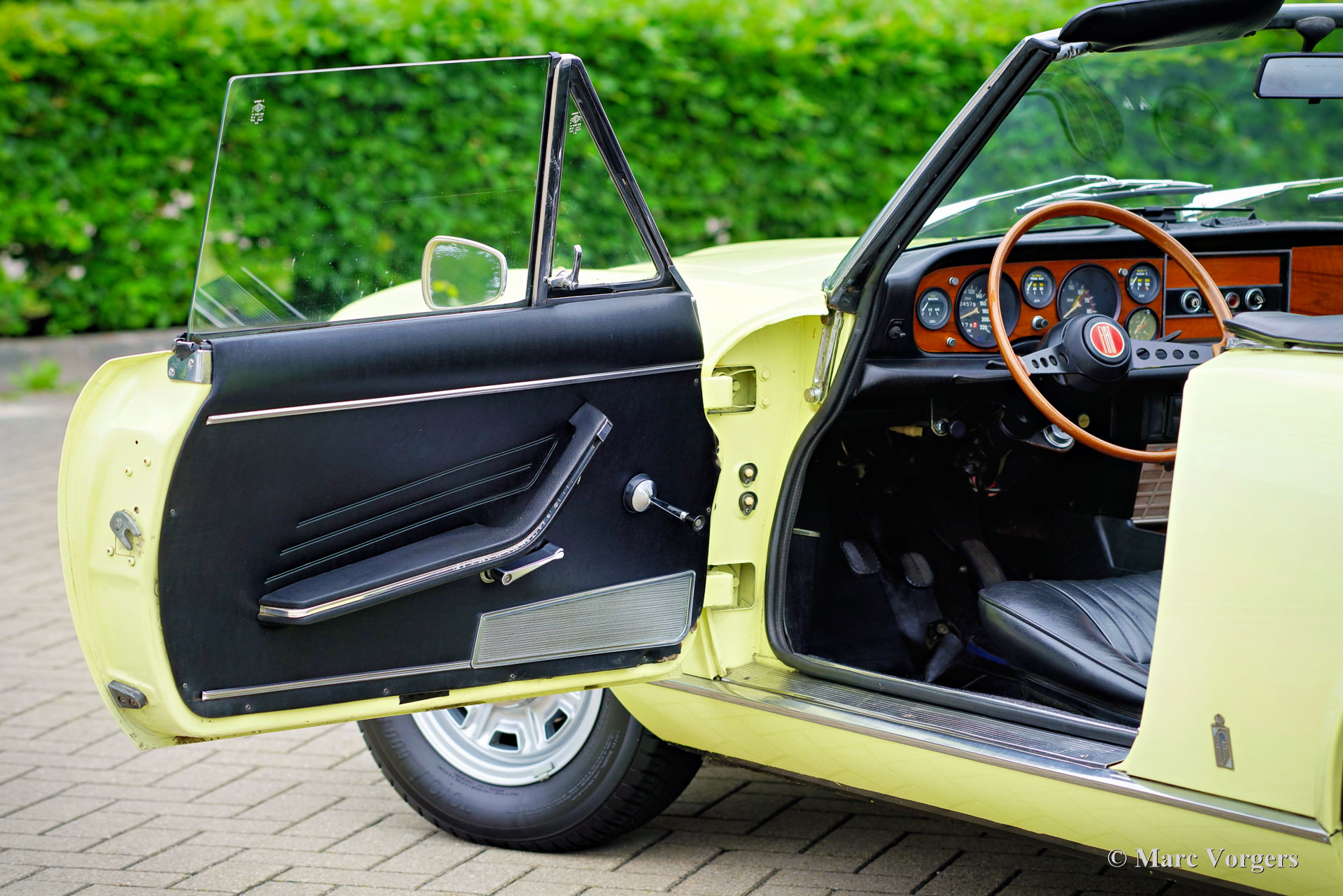 Fiat 124 Sport Spider 1600 (BS1), 1972. Kleur geel (Colorado Yellow 241) gecombineerd met een zwart kunstleren interieur afgewerkt met antraciet tapijt. Zwart mohair soft-top en een zwart vinyl afdekhoes. Deze prachtige Fiat 124 Sport Spider is nieuw verkocht in de USA en in juni 1993 in Nederland geïmporteerd. De volledige Amerikaanse historie inclusief servicefacturen is aanwezig tot 1992. Na aankomst in Nederland is de Fiat omgebouwd naar Europese specificaties met onder andere de montage van chromen bumpers, Europese koplampunits en een snelheidsmeter/teller in km/u in plaats van mijlen. Rekeningen van de ombouw en wat ander werk bedragen samen 17.000 Nederlandse guldens (€ 15.500 vandaag via geïndexeerde berekening). Latere onderhoudsfacturen zijn ook aanwezig, zelden hebben wij een auto zo goed gedocumenteerd gezien! Deze Fiat 124 Sport Spider verkeert in een zeer goede tot excellente staat en de auto rijdt perfect. De auto beschikt over een 1592 cc viercilindermotor met dubbele bovenliggende nokkenassen en een vermogen van 108 DIN pk. Met een vijfversnellingsbak, een gewicht van net geen 1.000 kg en een topsnelheid van 185 km/u zal de Fiat 124 Sport Spider zich comfortabel in het moderne verkeer mengen. De fantastisch uitziende carrosserie is getekend door Pininfarina. Het interieur toont de overgang naar de jaren zeventig met een van de laatste met hout gefineerde dashboards en sportieve “blacked out” chromen sierdelen (randen van de klokken/ meters en het middendeel van het stuur in matzwart) om hinderlijke schitteringen en verblinding door (zon)licht tegen te gaan. Dit was een nieuw inzicht overgenomen van rally- en raceauto’s dat toen in de mode raakte. Deze prachtige Fiat 124 Sport Spider is in deze kleuren beeldschoon en de fraaie originele lichtmetalen velgen maken het plaatje helemaal af!